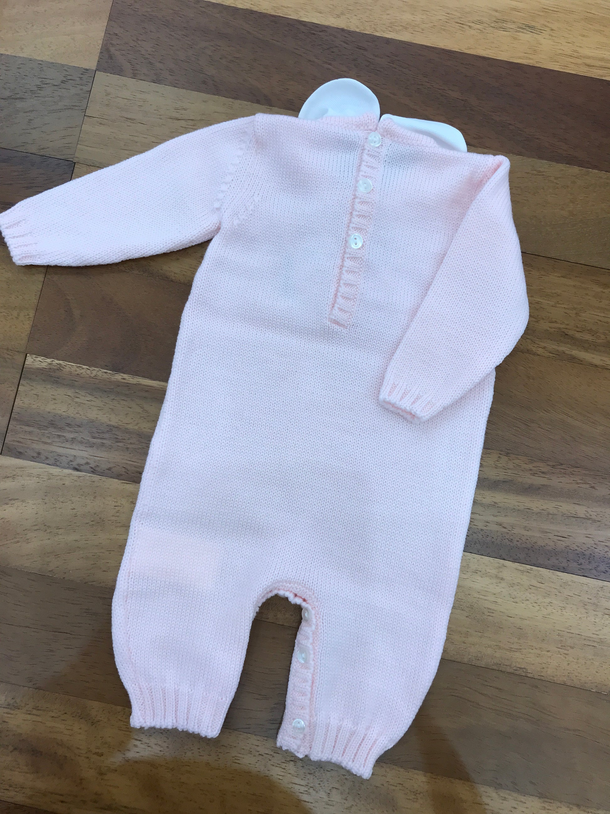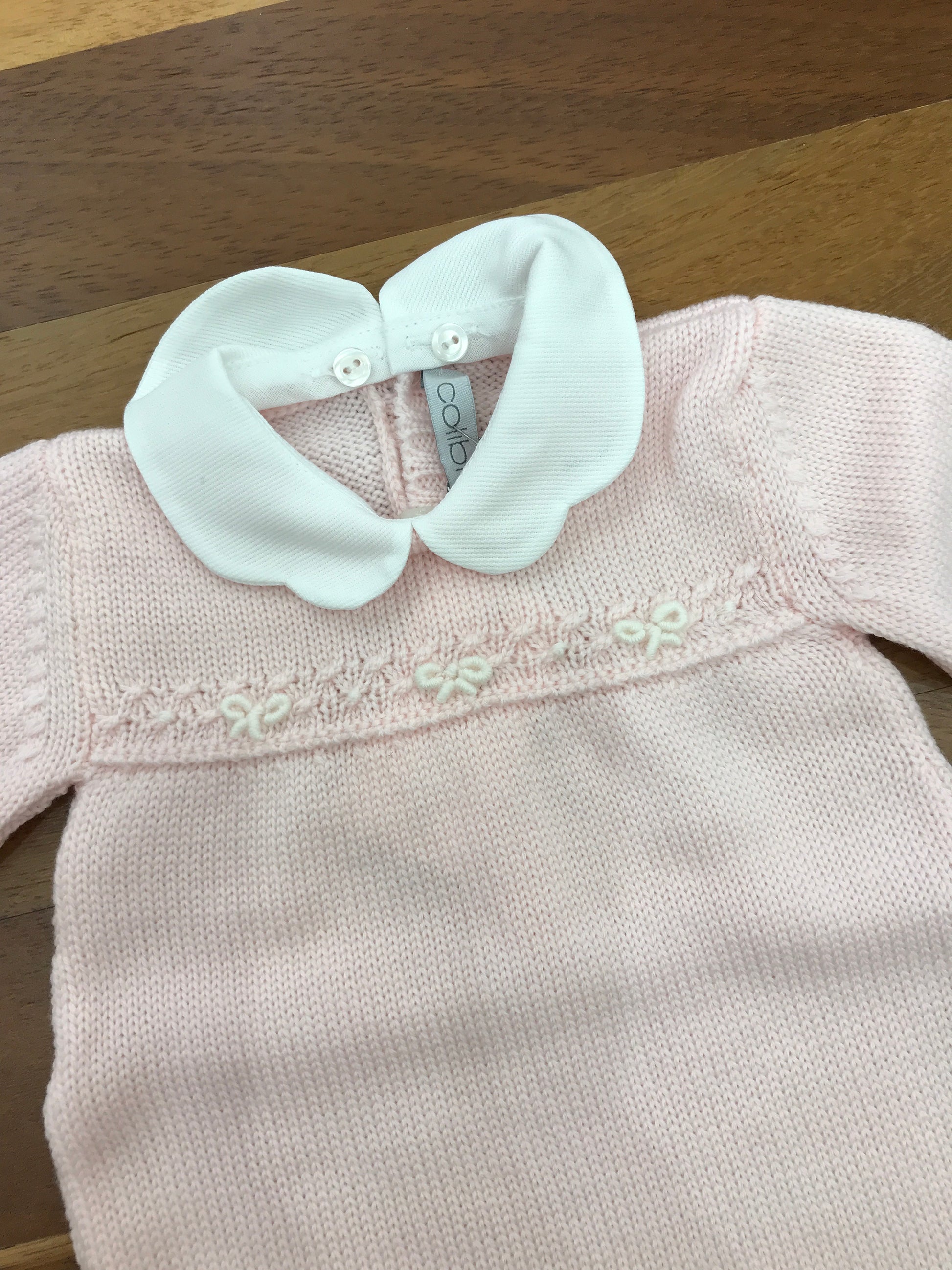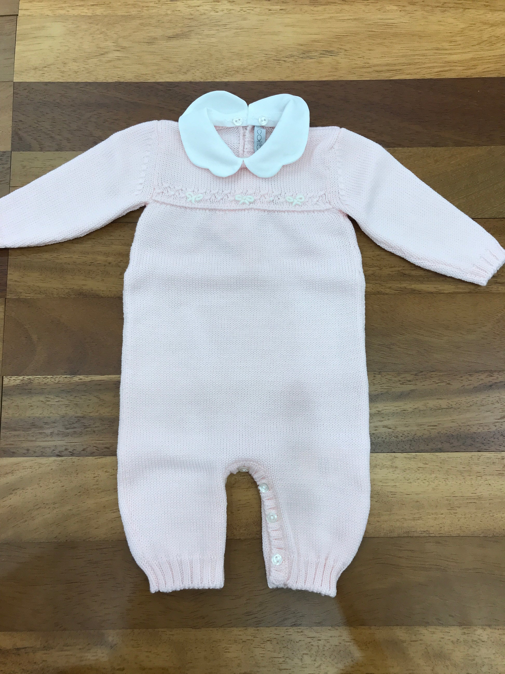 Questa tutina in lana, priva di piedini ma dotata di collo, è arricchita da delicati fiocchetti decorativi sul davanti.
