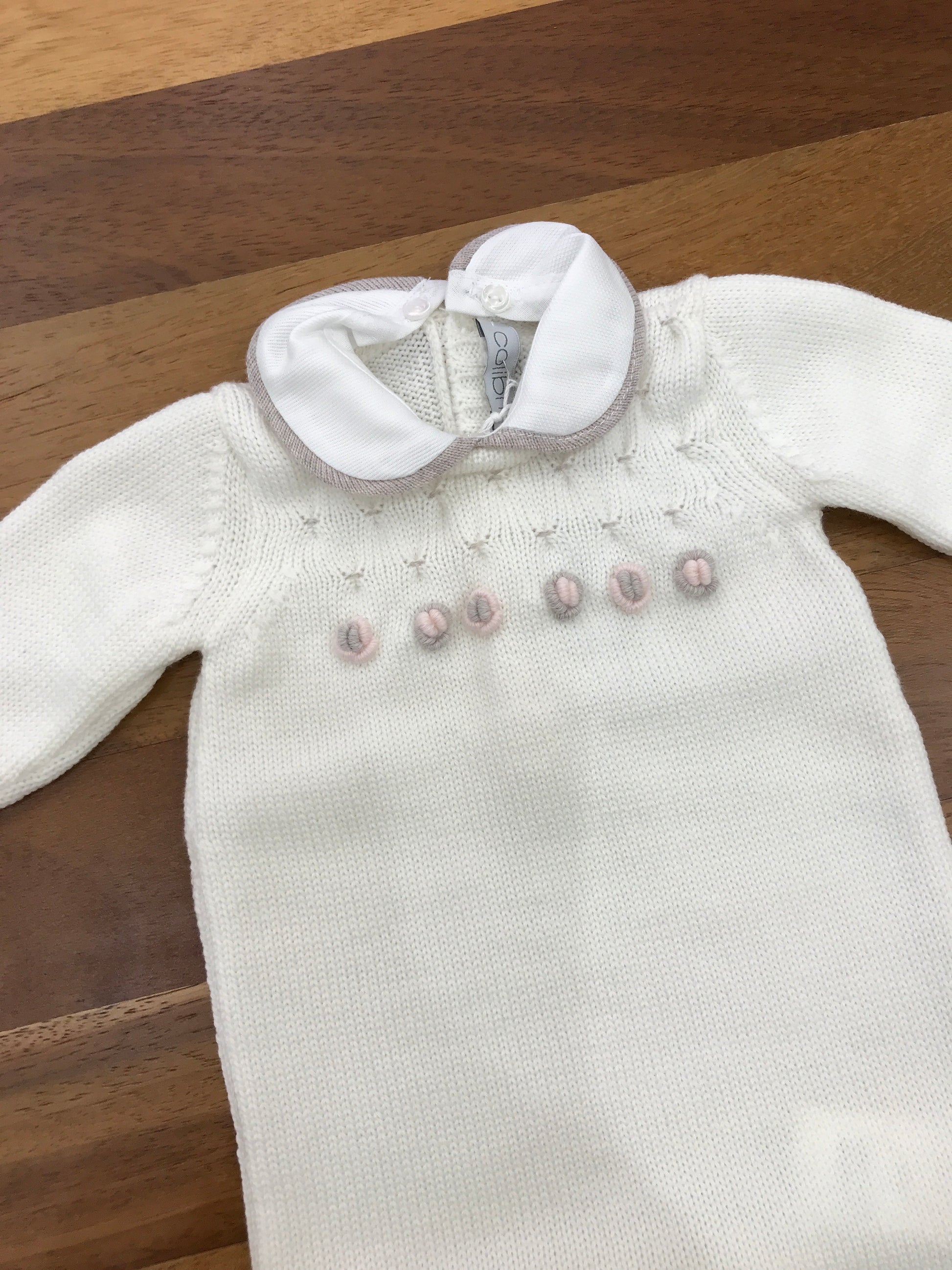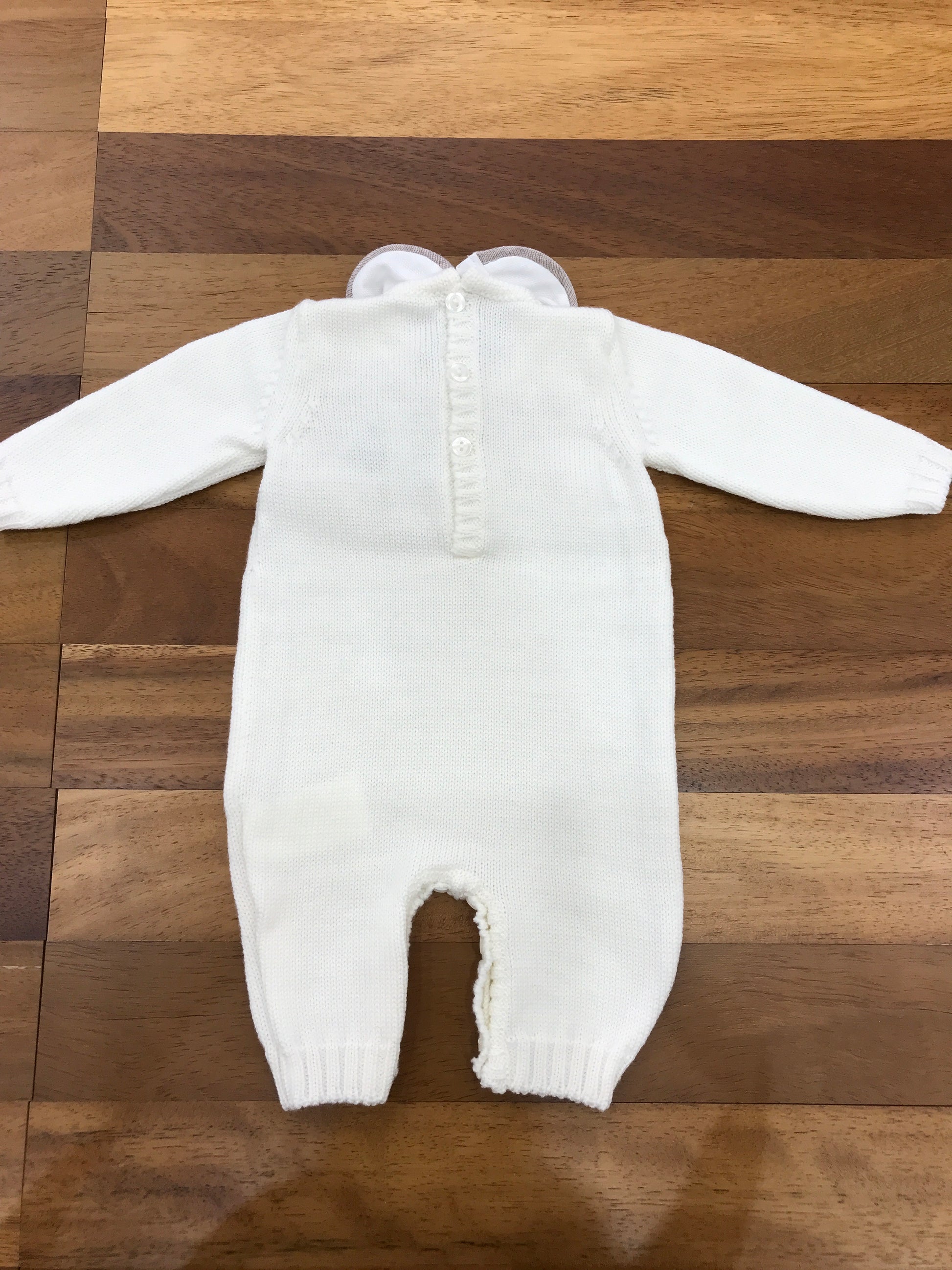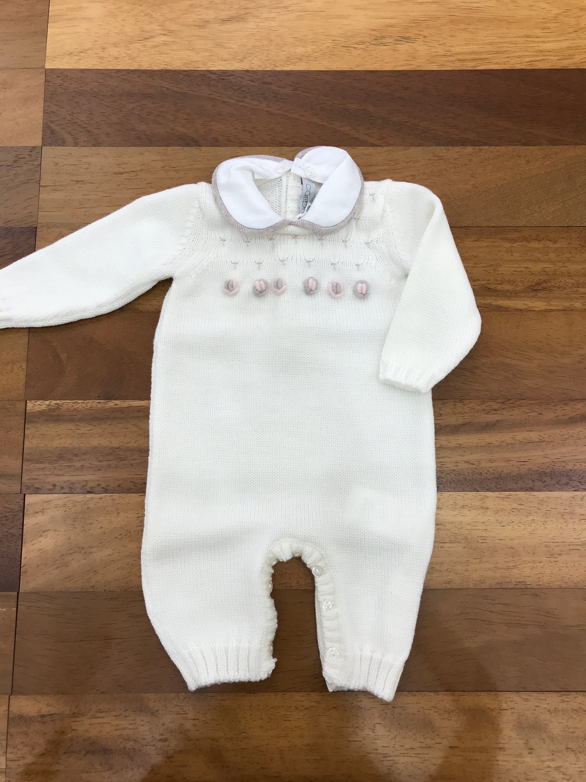 Questa tutina in lana, priva di piedini e dotata di un collo rimovibile, presenta al centro un delicato ricamo floreale accompagnato da un raffinato punto smock.