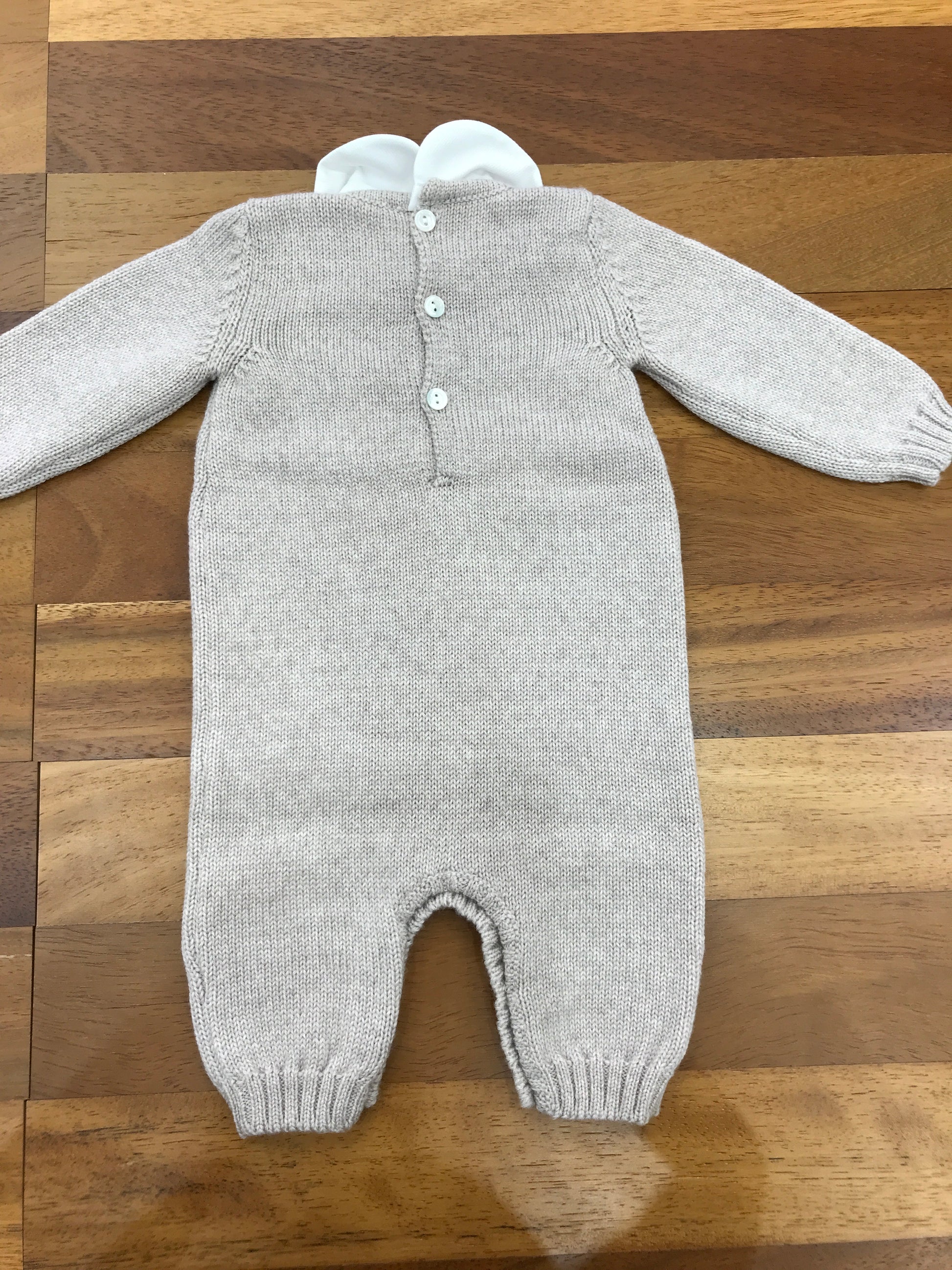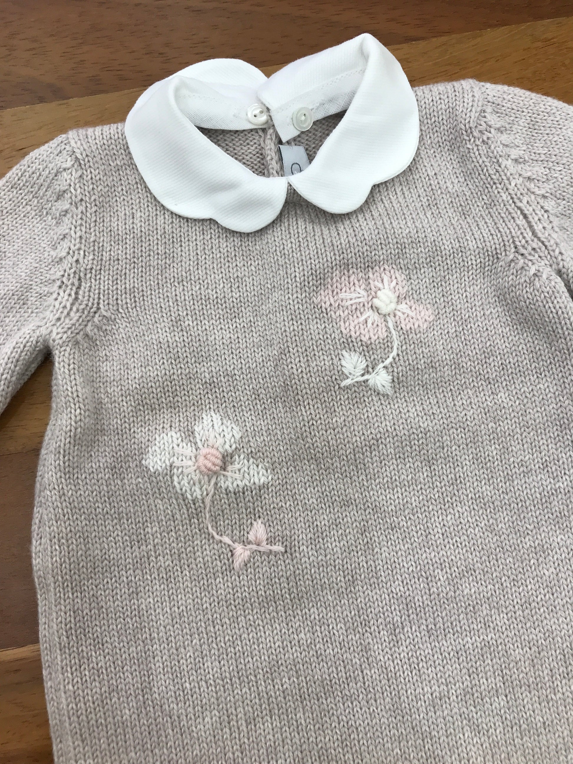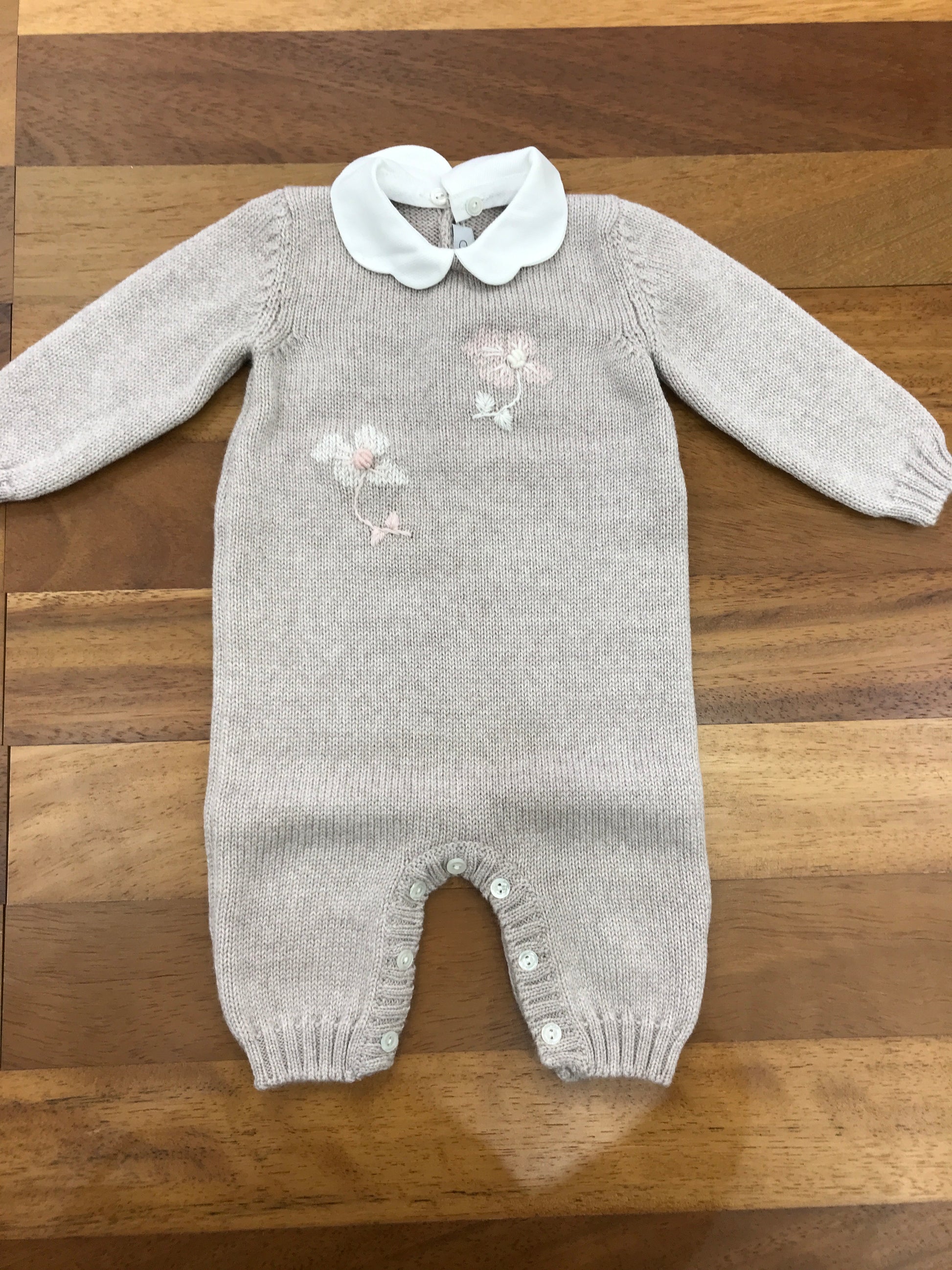 Questa tutina in lana, priva di piedini e dotata di un collo rimovibile, è arricchita da due delicati fiori ricamati sul davanti, unendo comfort e dettagli raffinati.