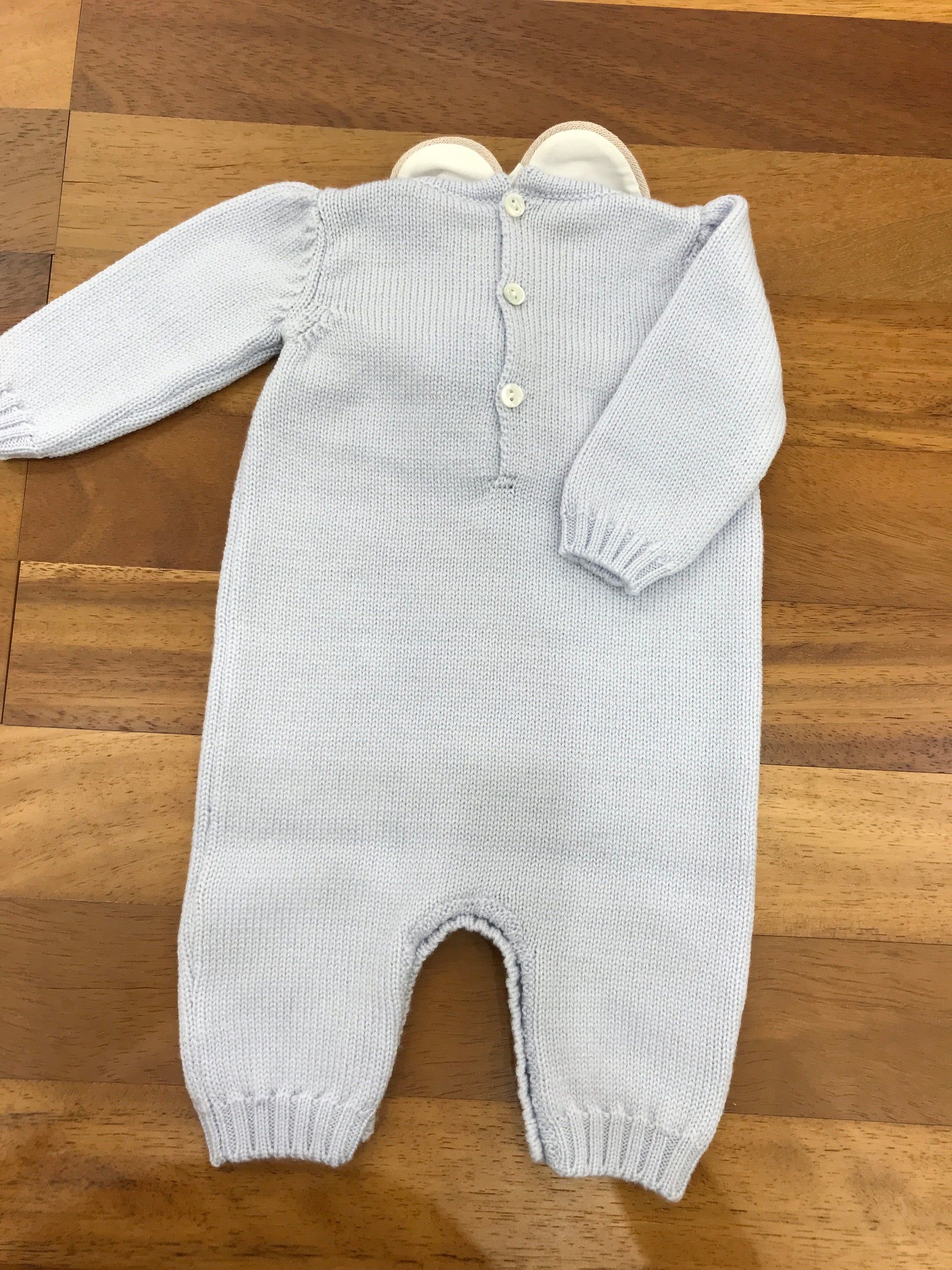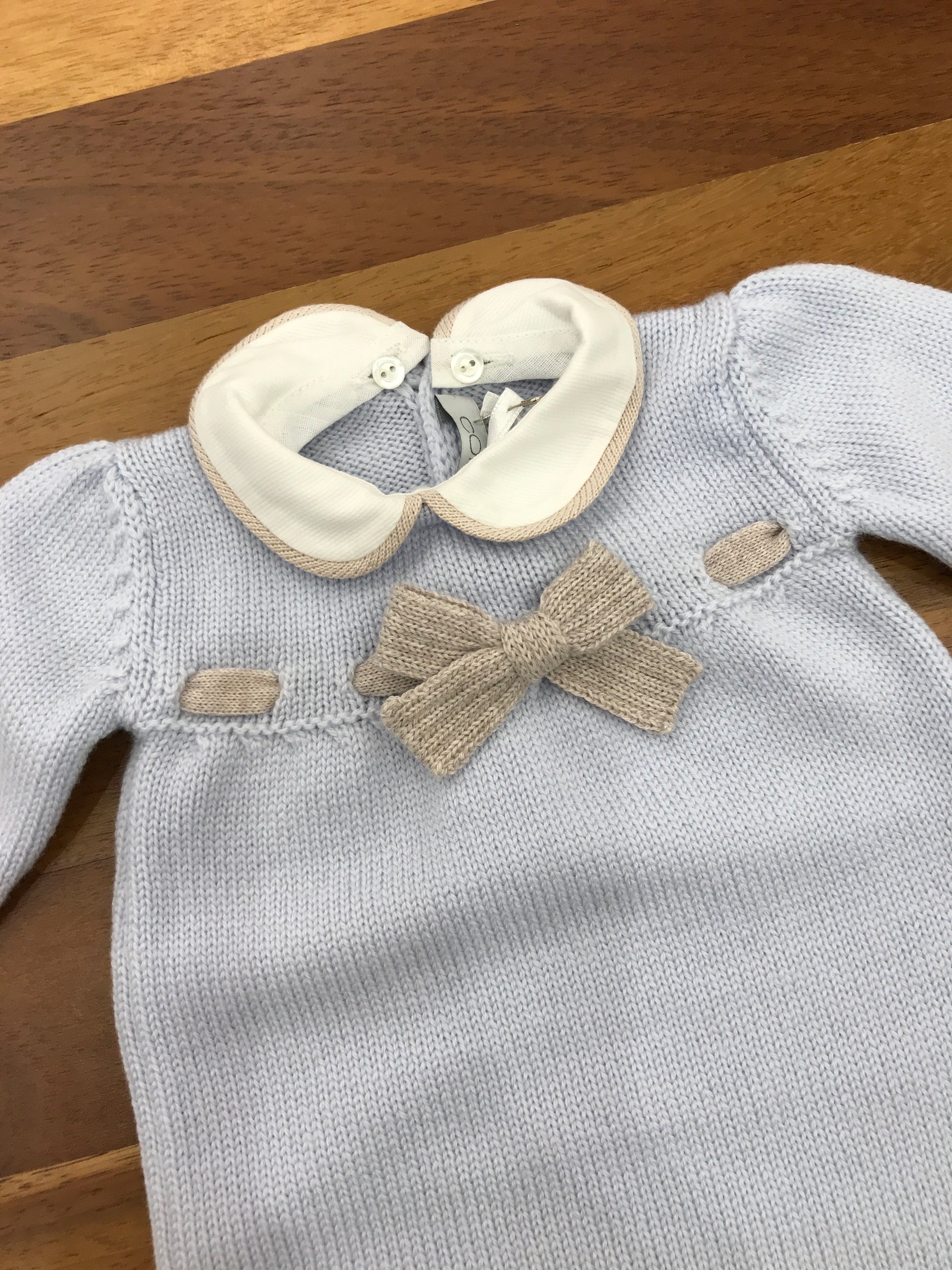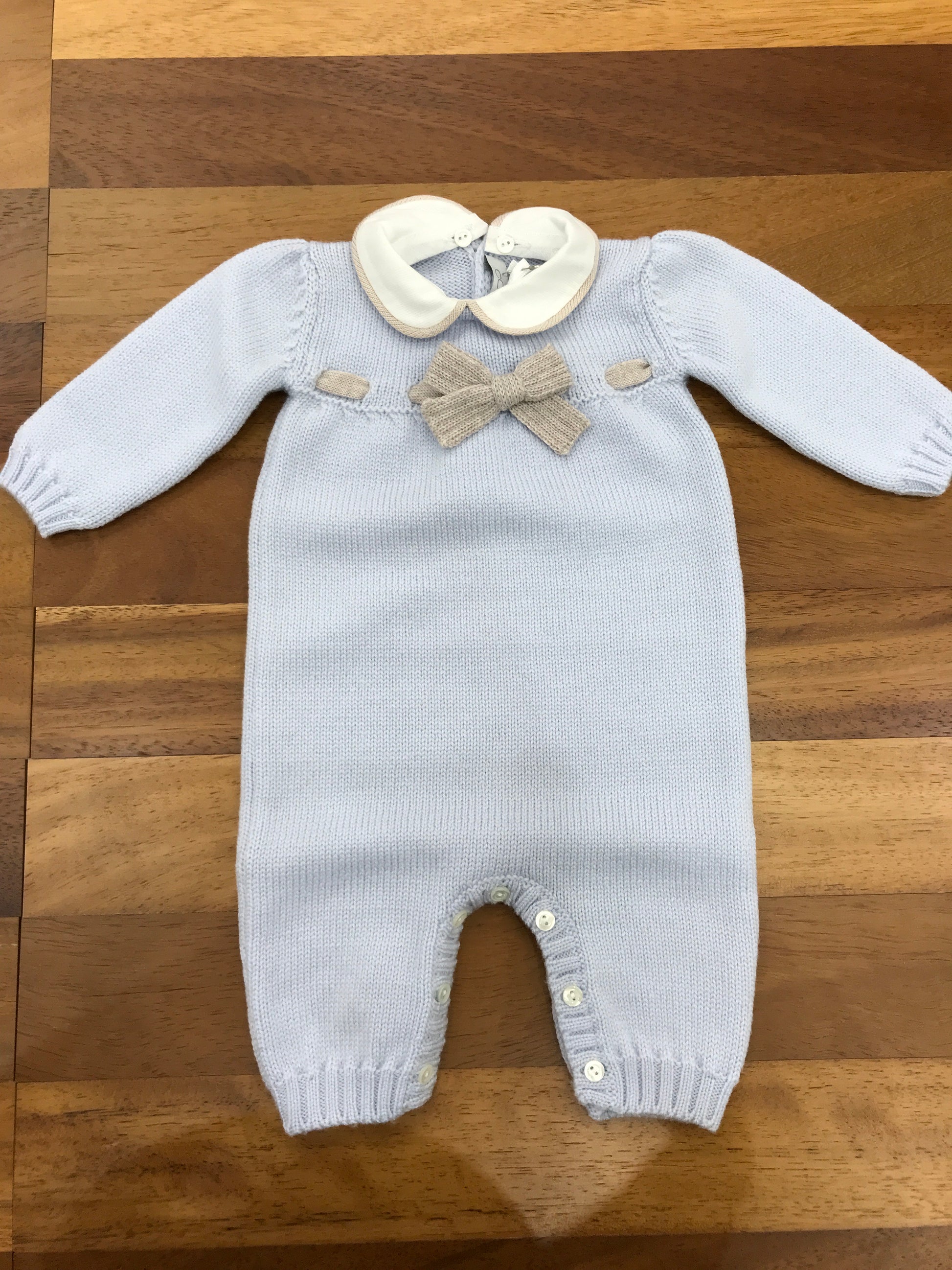 Questa tutina intera è priva di piedini e presenta un collo removibile, arricchita da un fiocco decorativo posizionato al centro.