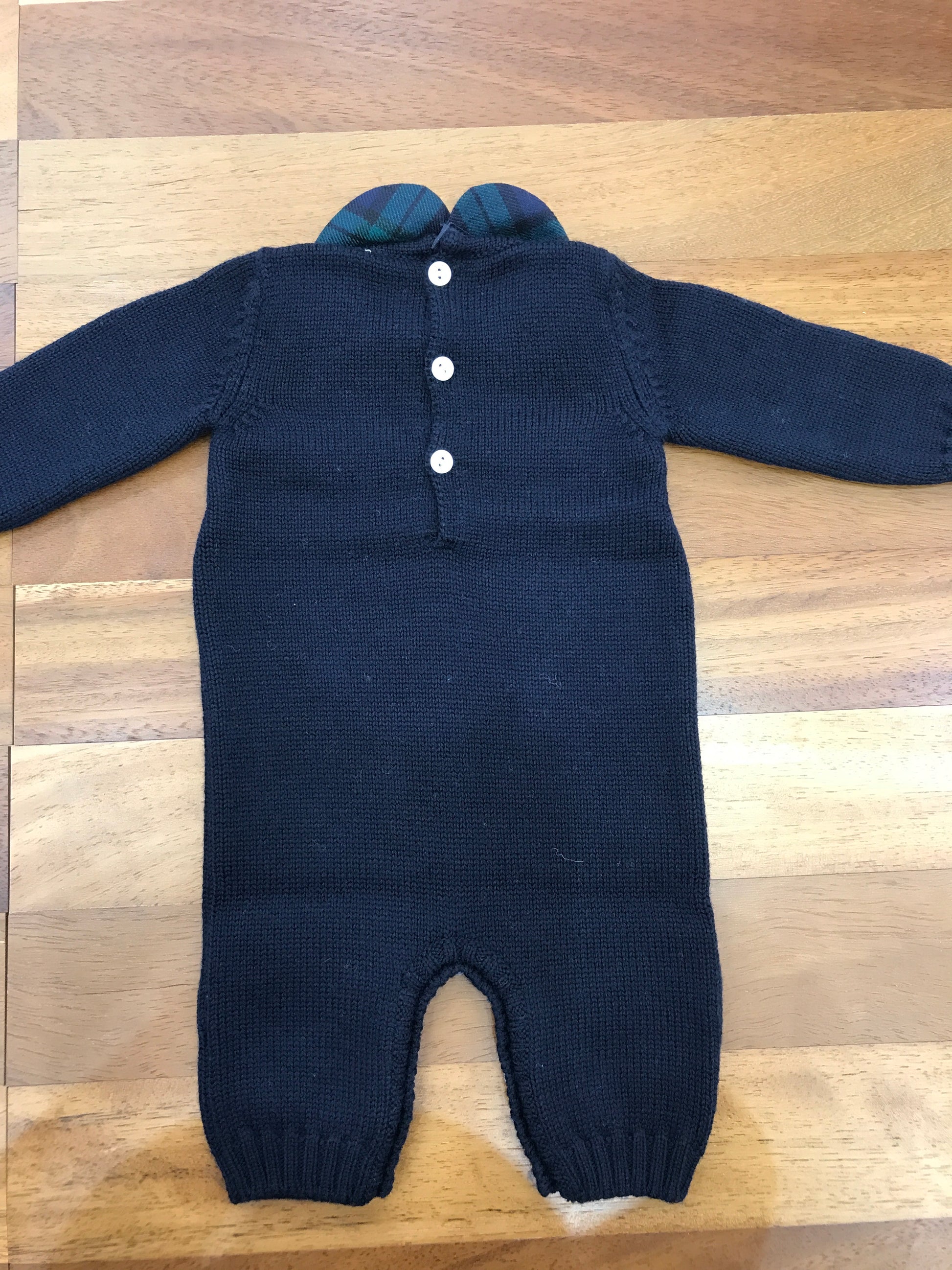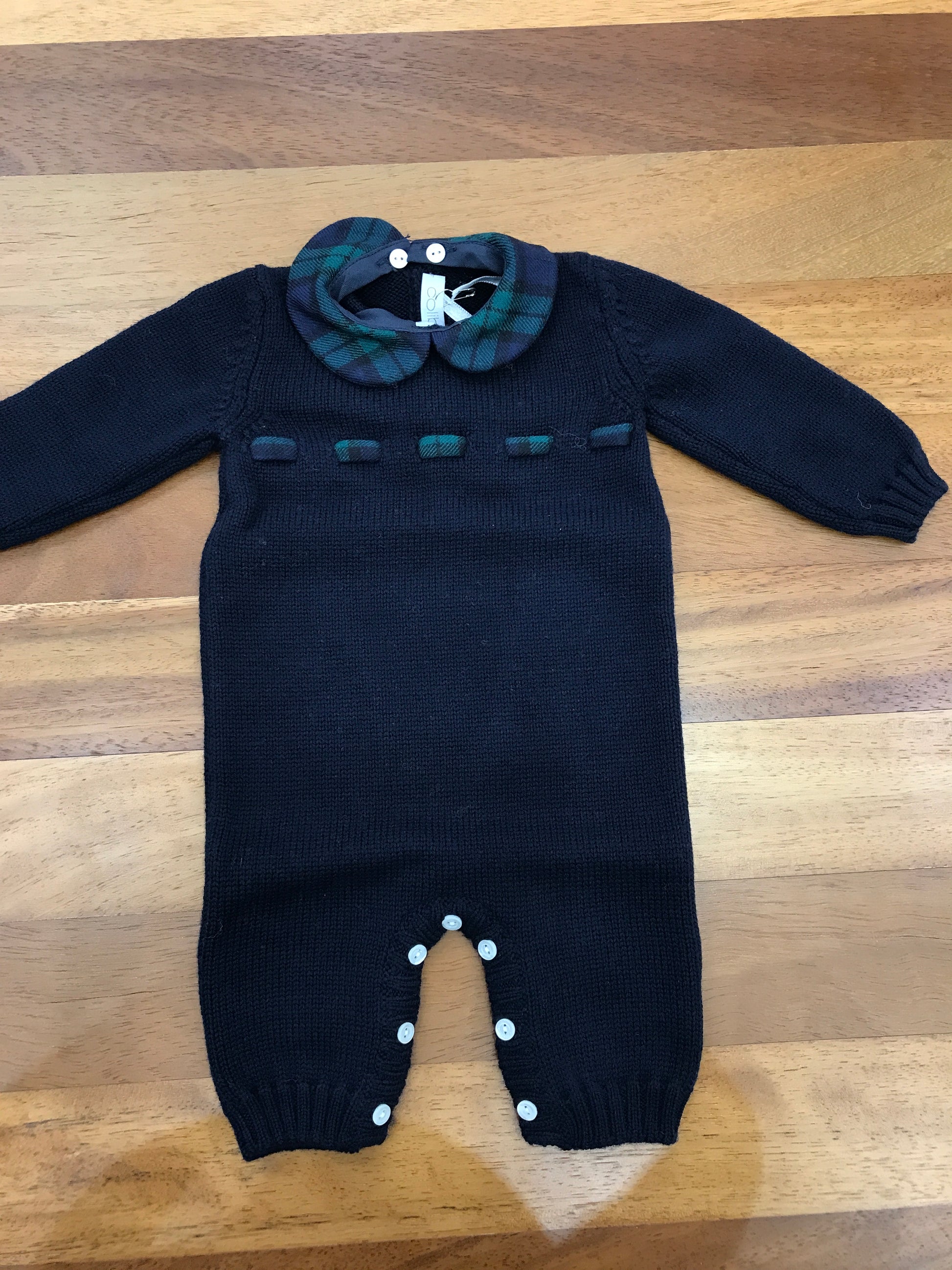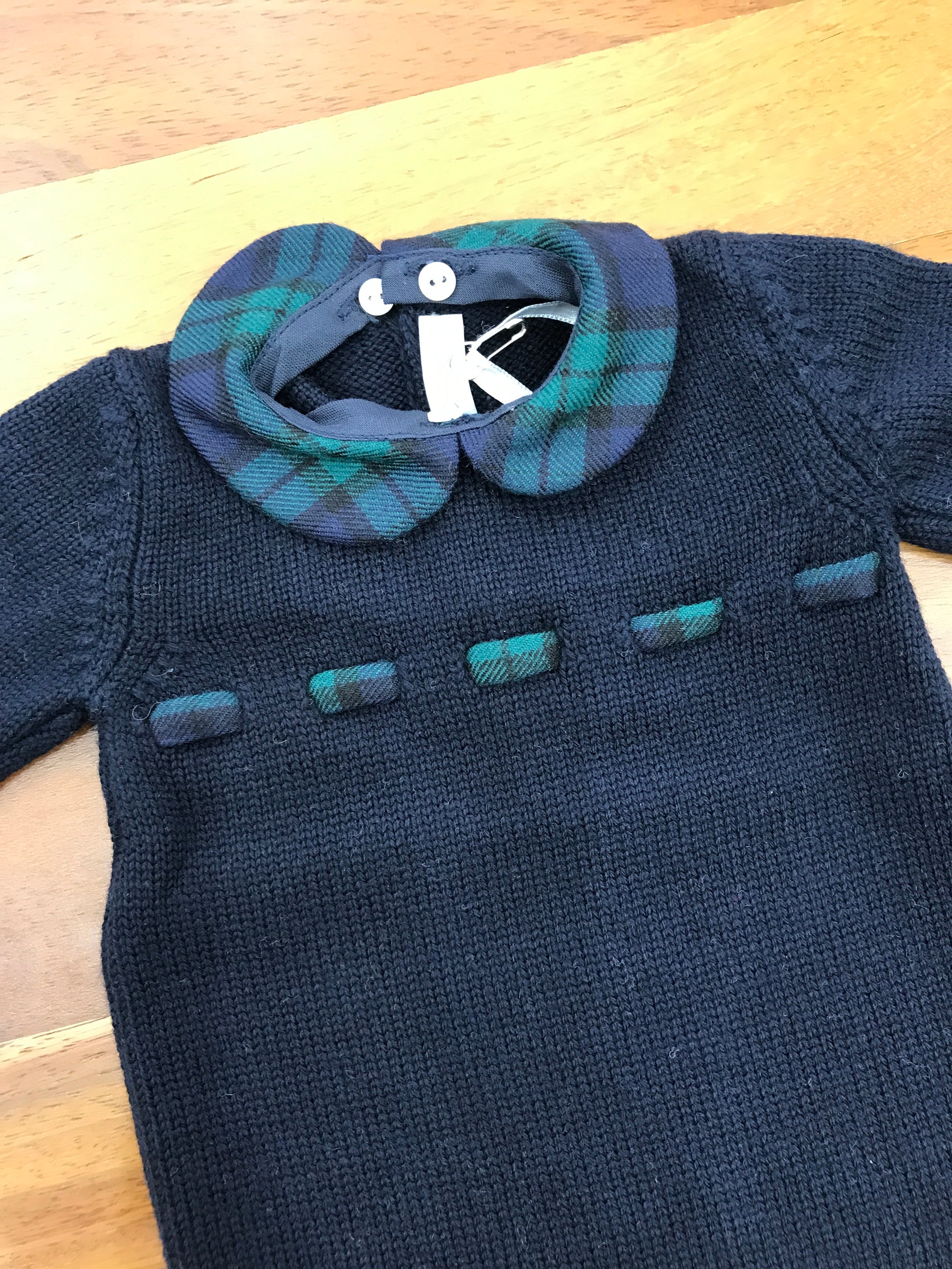 Questa tutina intera in lana presenta un collo removibile, mentre i piedini non sono inclusi. Il collo è rifinito con un motivo scozzese, accompagnato da un piccolo dettaglio decorativo che ne valorizza l’eleganza.