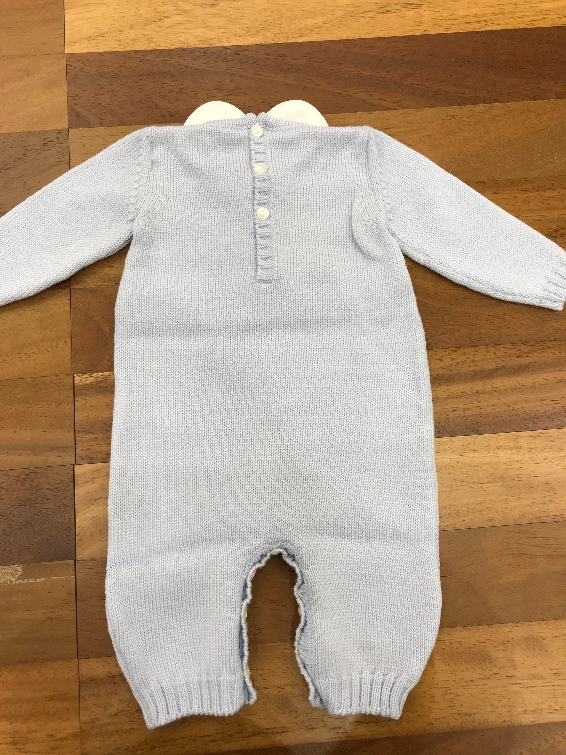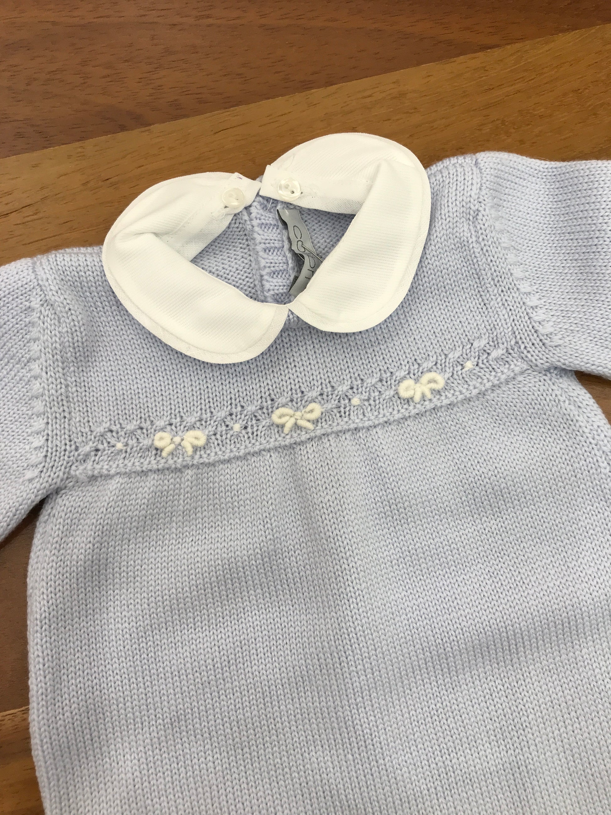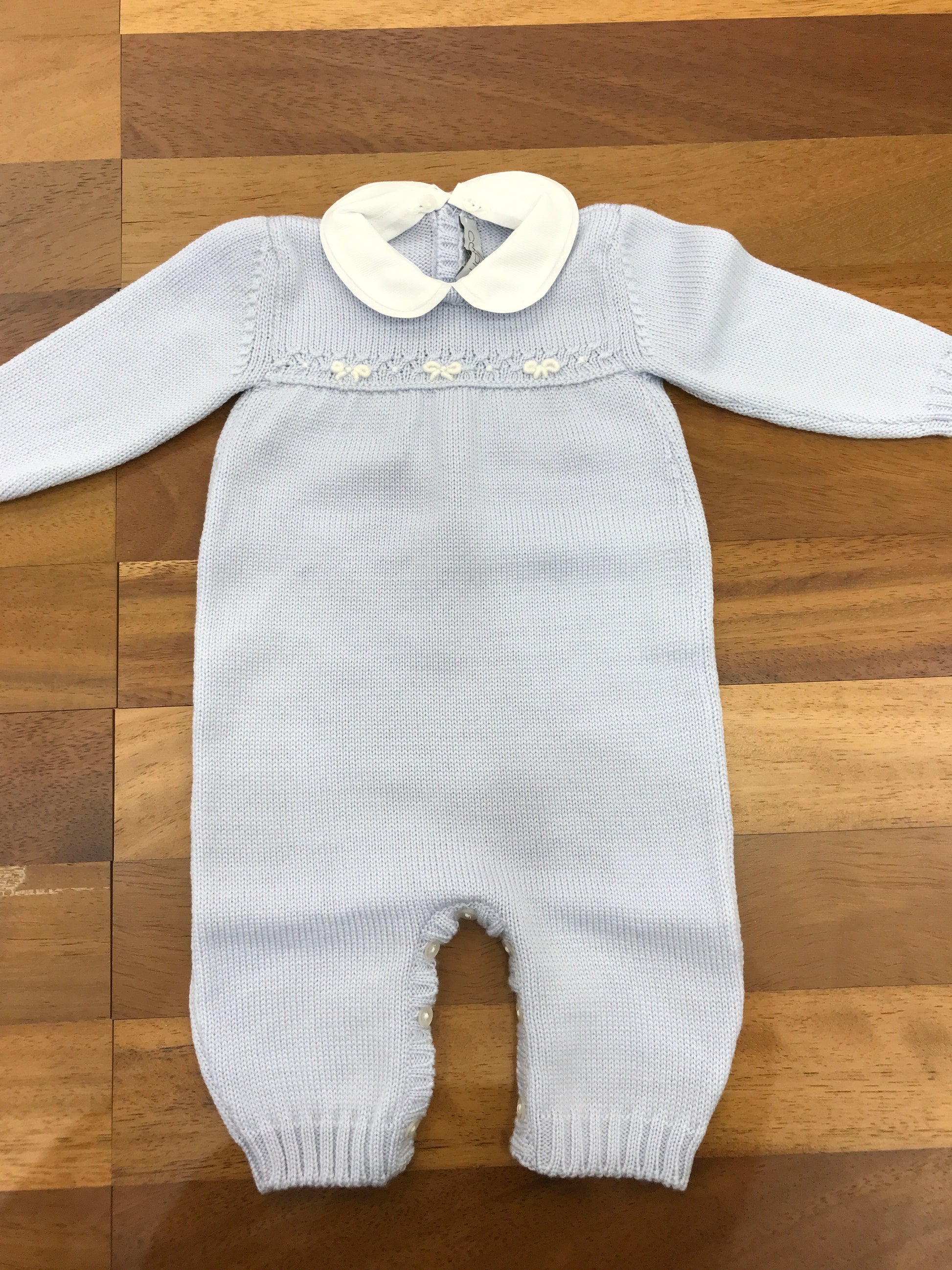 Questa tutina in lana a corpo intero presenta un colletto rimovibile e non include copripiedi. Sul davanti sono ricamati delicati fiocchetti, aggiungendo un tocco raffinato al capo.