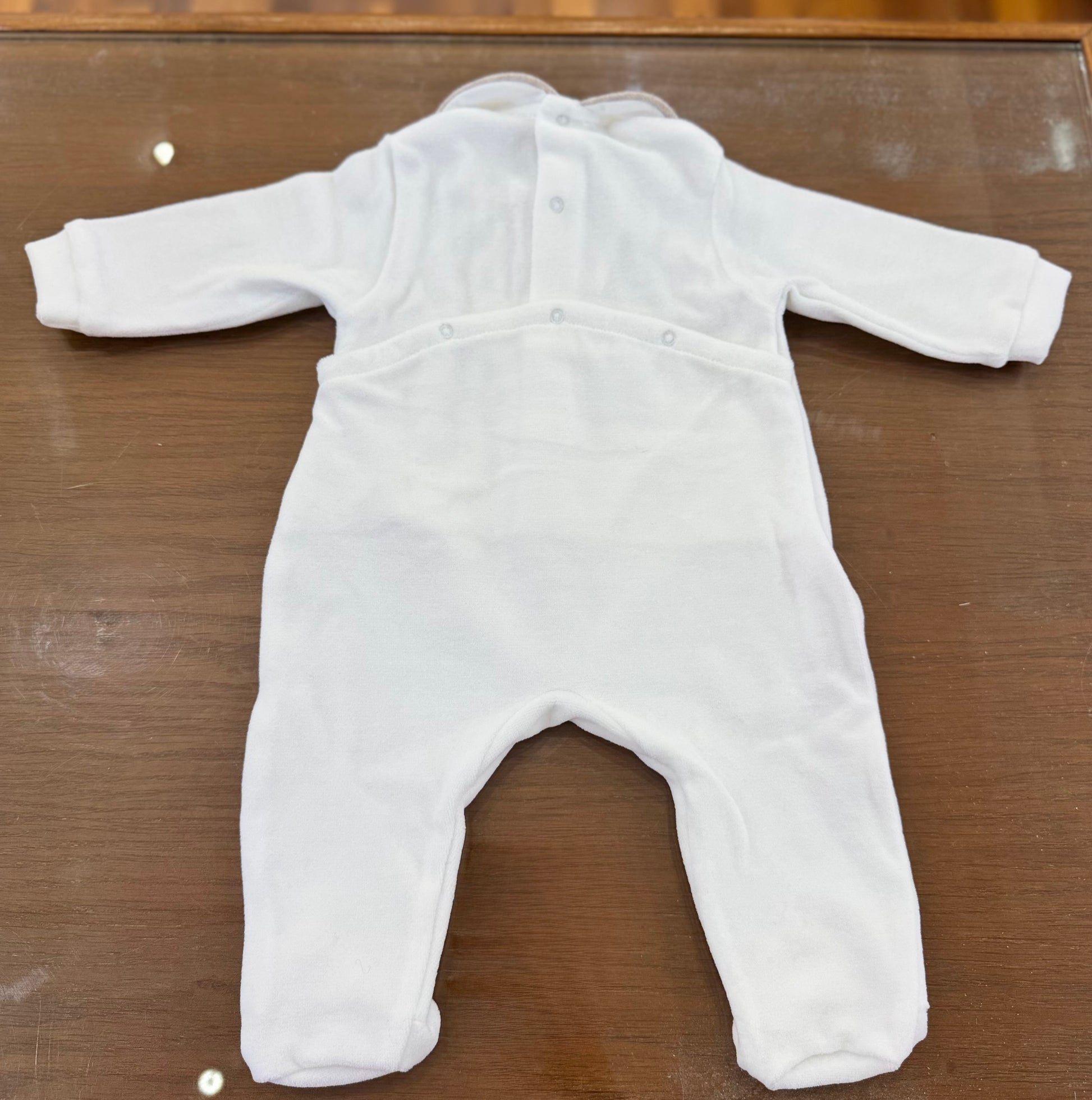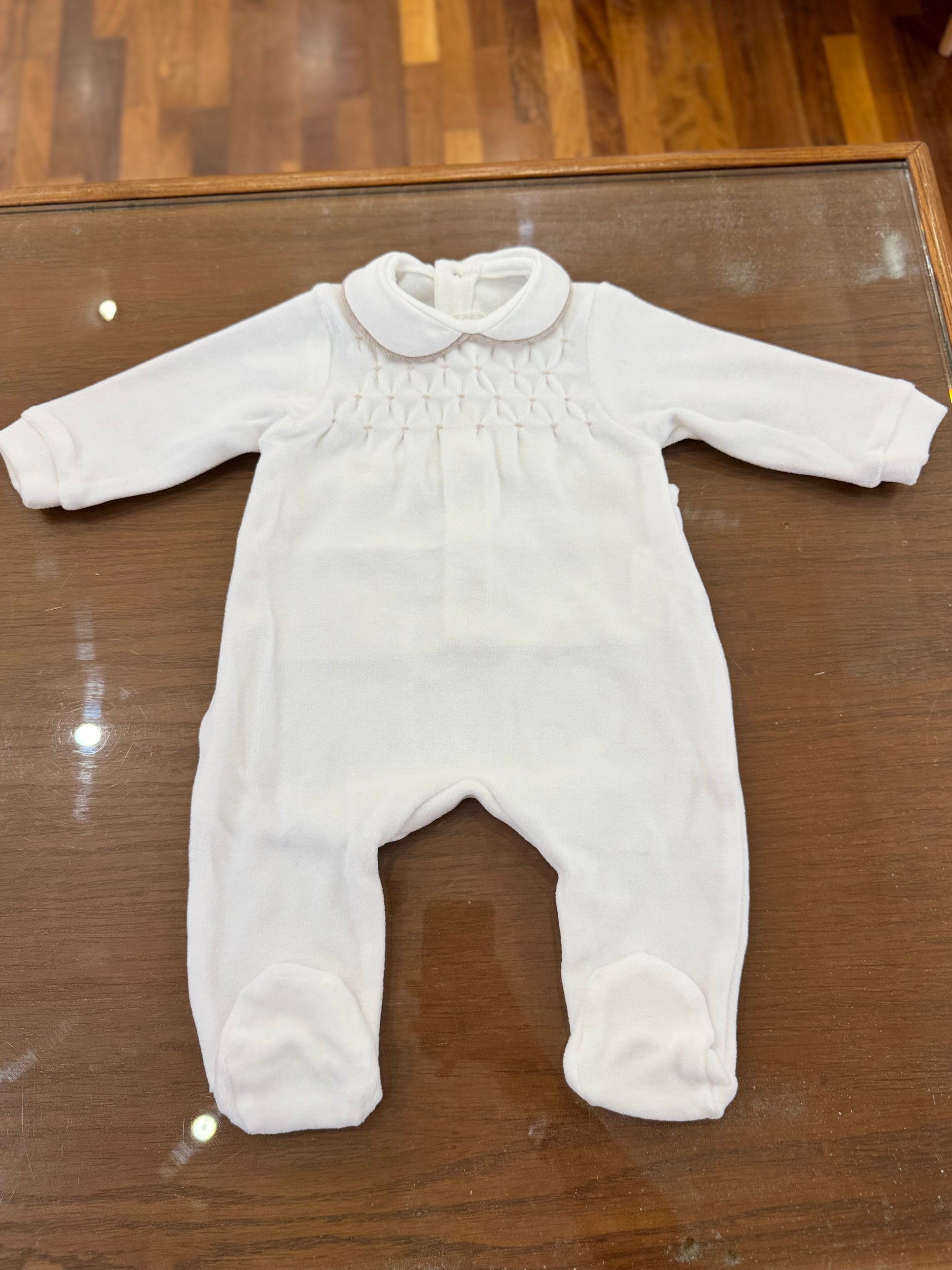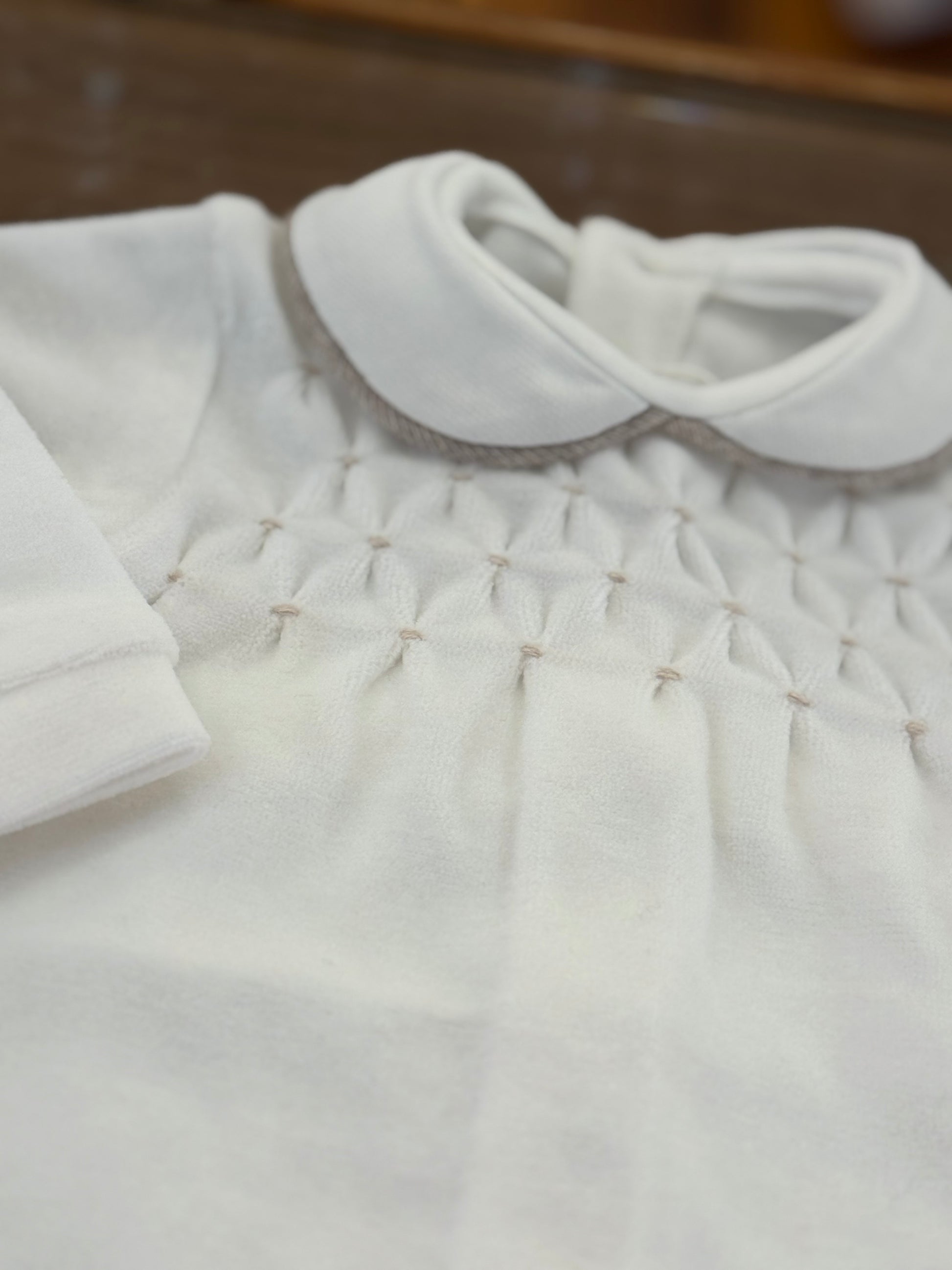 "La nostra tutina Colibrì è perfetta per accogliere il tuo piccolo con il massimo comfort e stile. Realizzata in morbida ciniglia bianca con piedini, presenta un delizioso ricamo a nido d'ape sul corpetto. Ideale per i primi giorni di vita, regalerà al tuo bambino un look elegante e coccoloso."