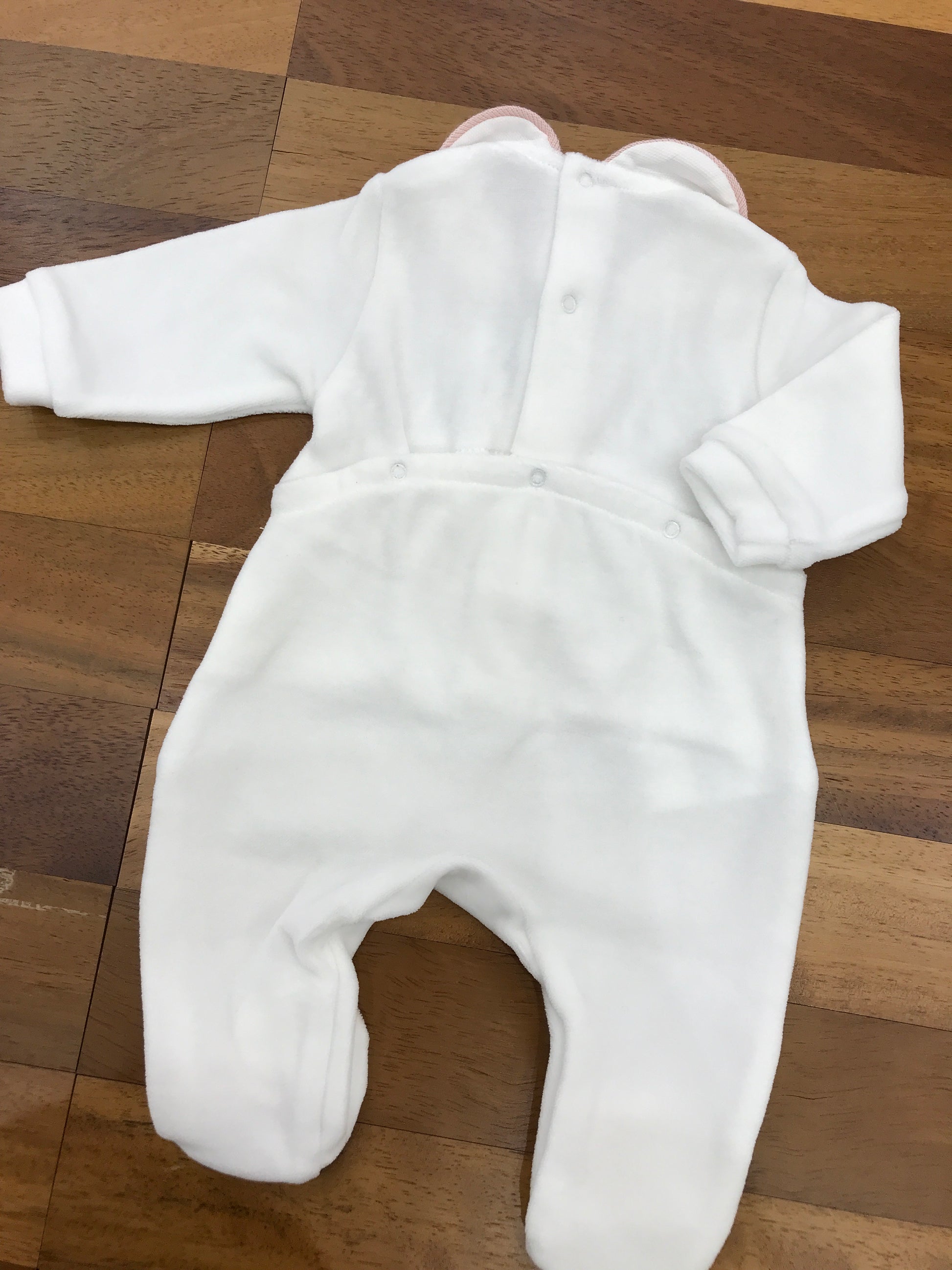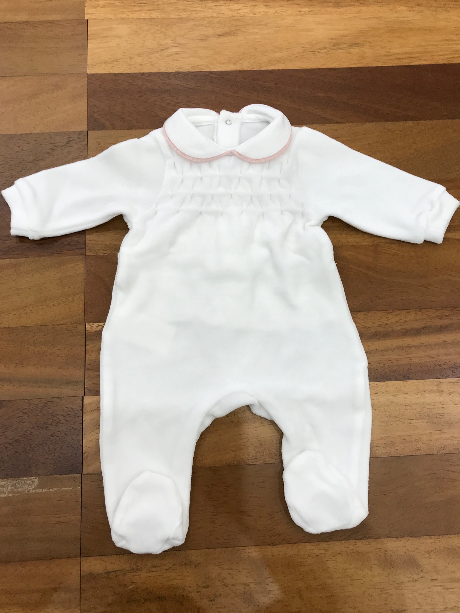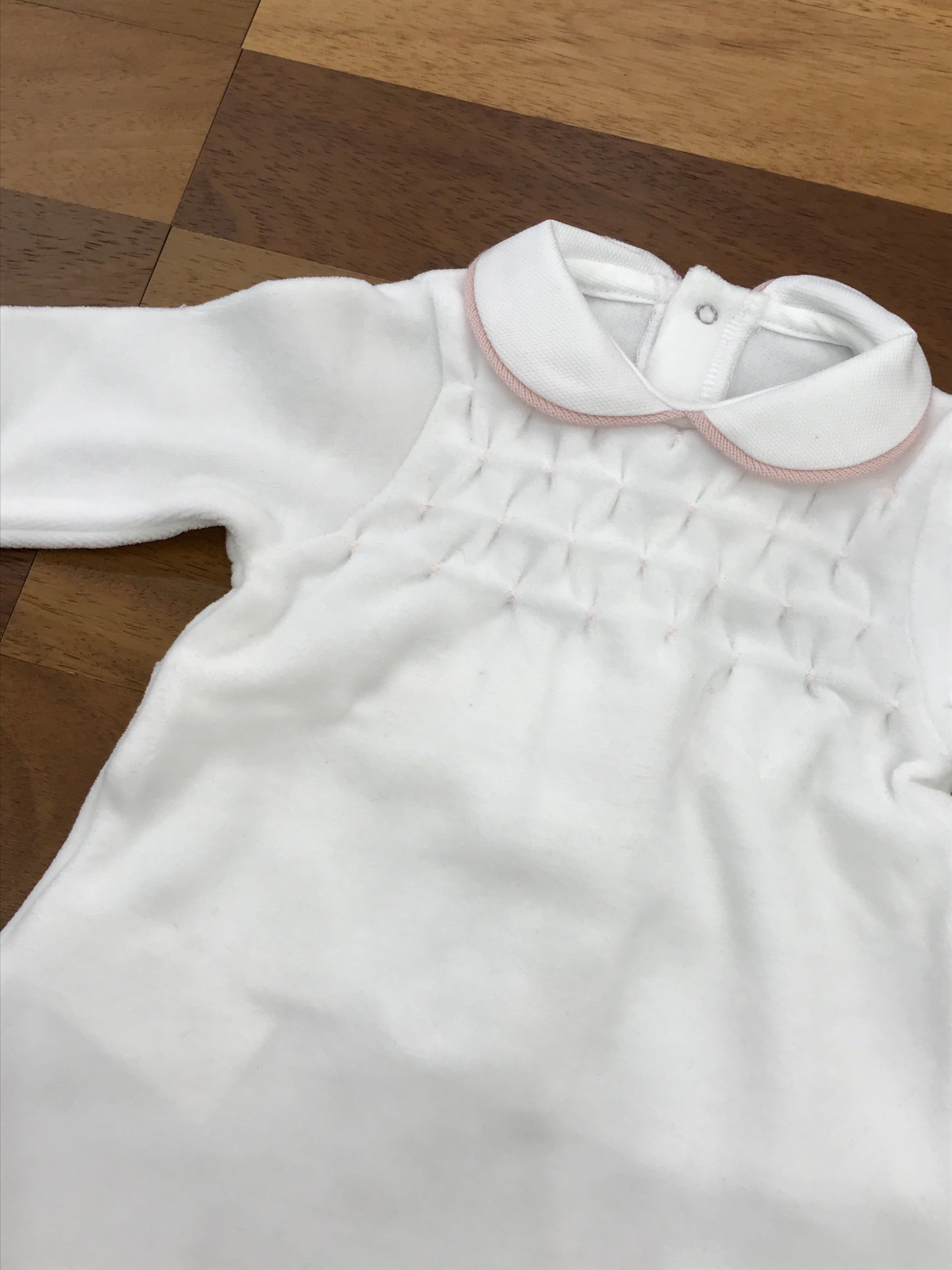 Questa tutina intera in ciniglia è dotata di piedini e colletto, con una raffinata lavorazione a punto smock ricamato sul davanti.