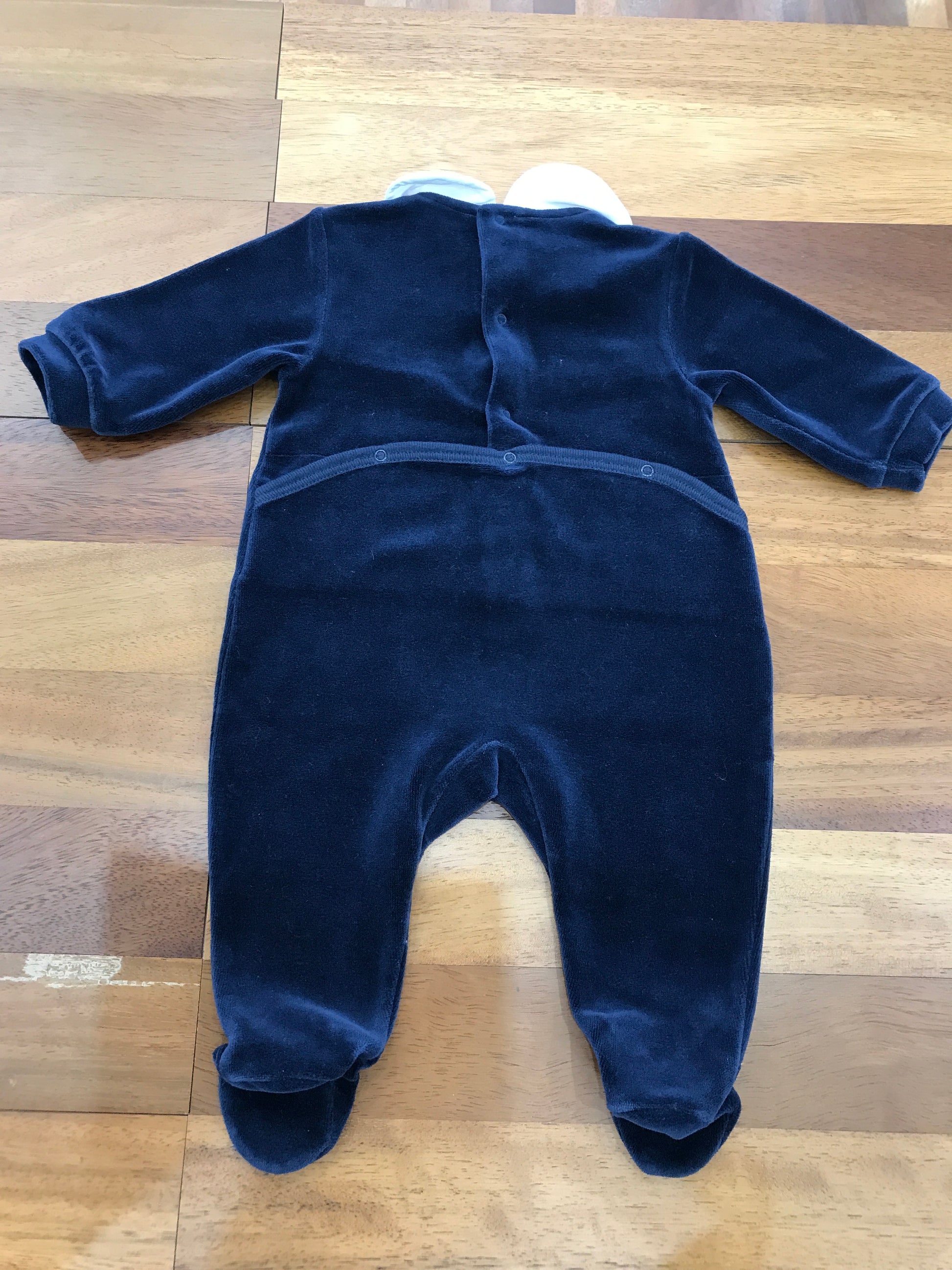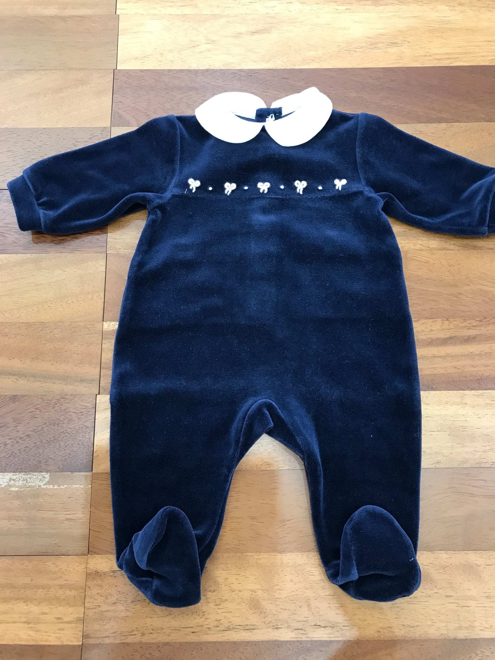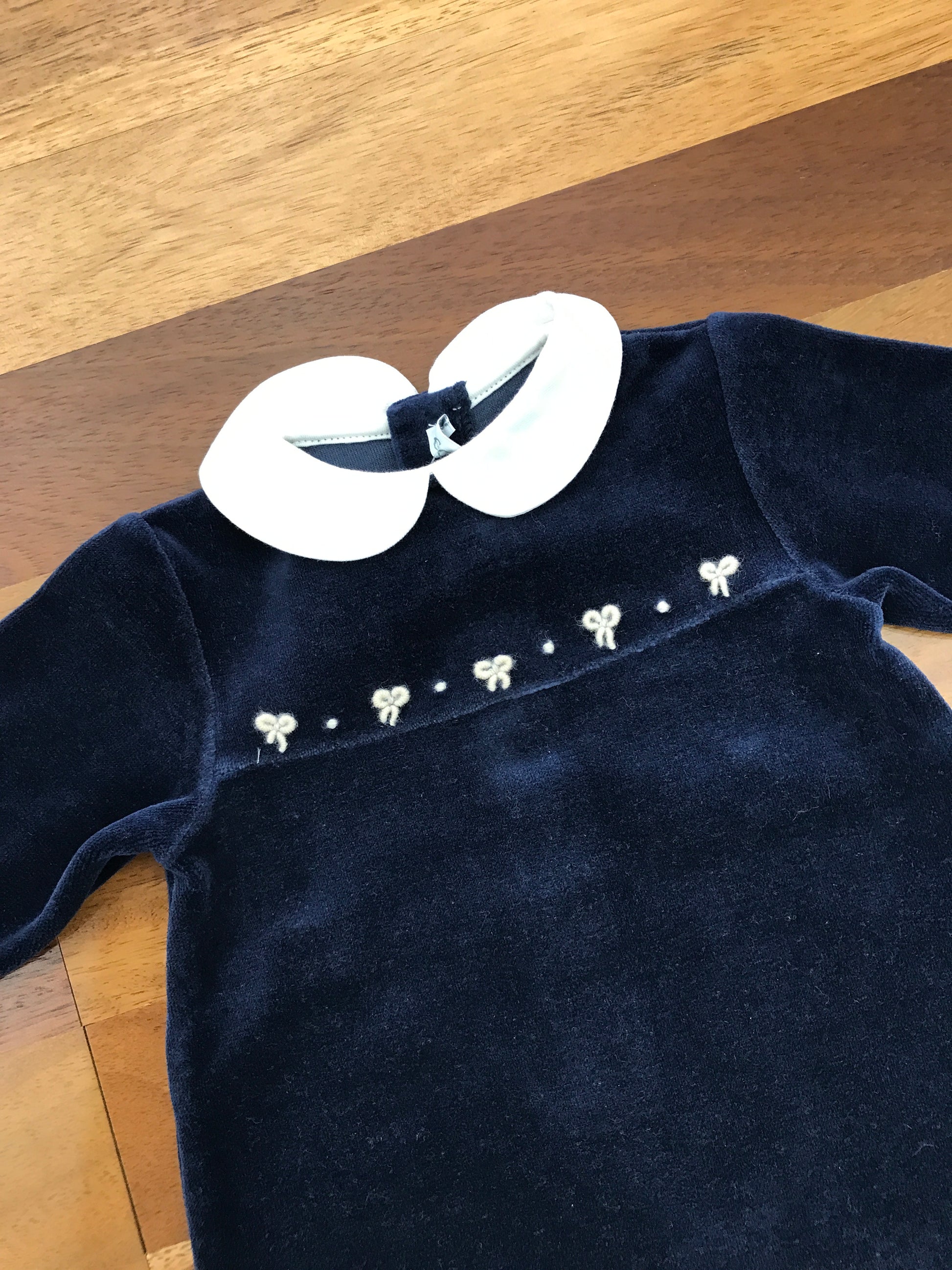 Questa tutina intera in ciniglia è progettata per garantire comfort e calore, dotata di piedini integrati per mantenere i piedini del bambino sempre coperti. Presenta un colletto bianco elegante e raffinato, arricchito da piccoli fiocchetti ricamati in bianco posizionati al centro davanti, che aggiungono un tocco di delicatezza e stile senza rinunciare alla praticità. Ideale per i più piccoli, unisce morbidezza e cura nei dettagli per un capo completo e funzionale.