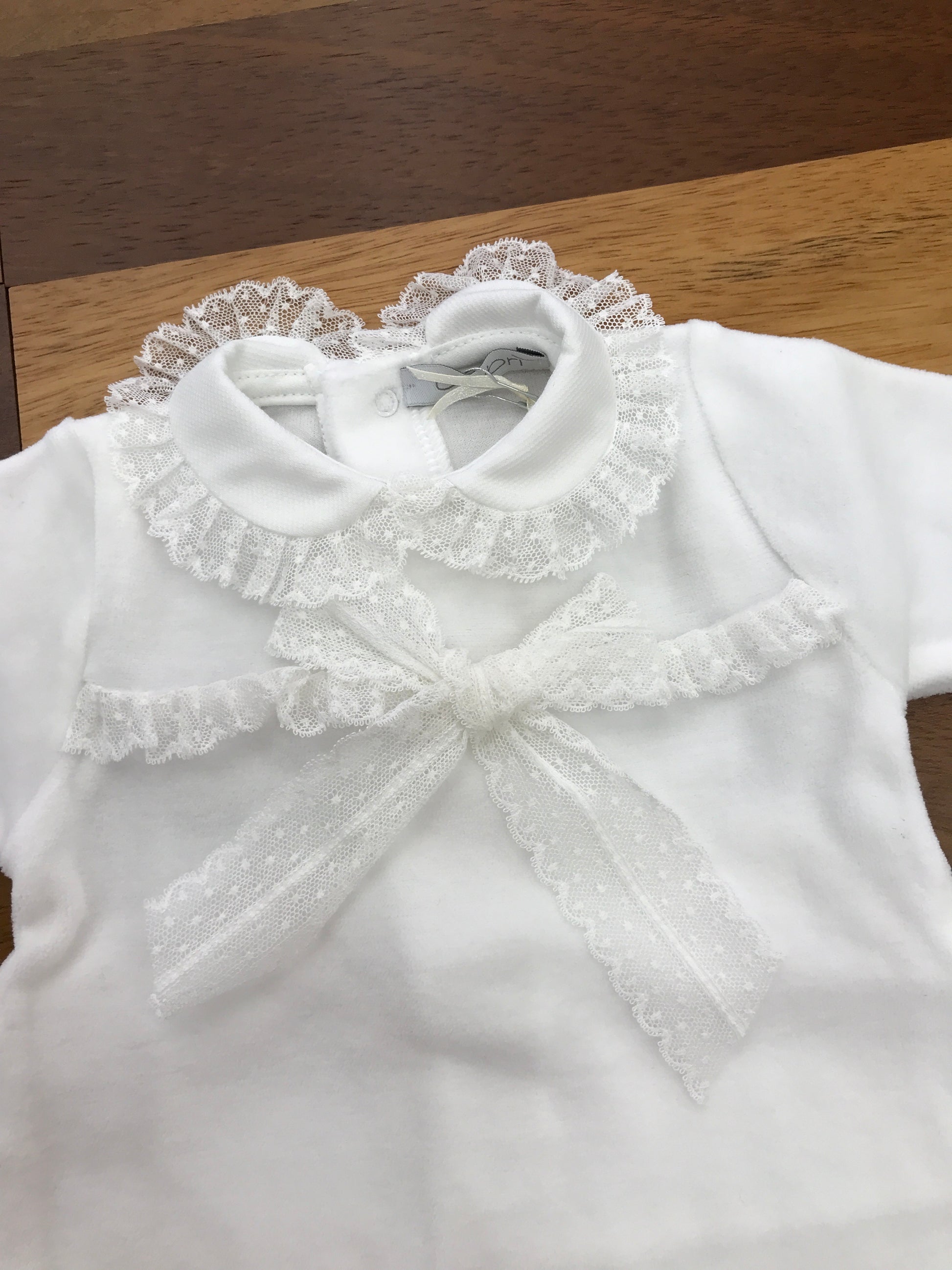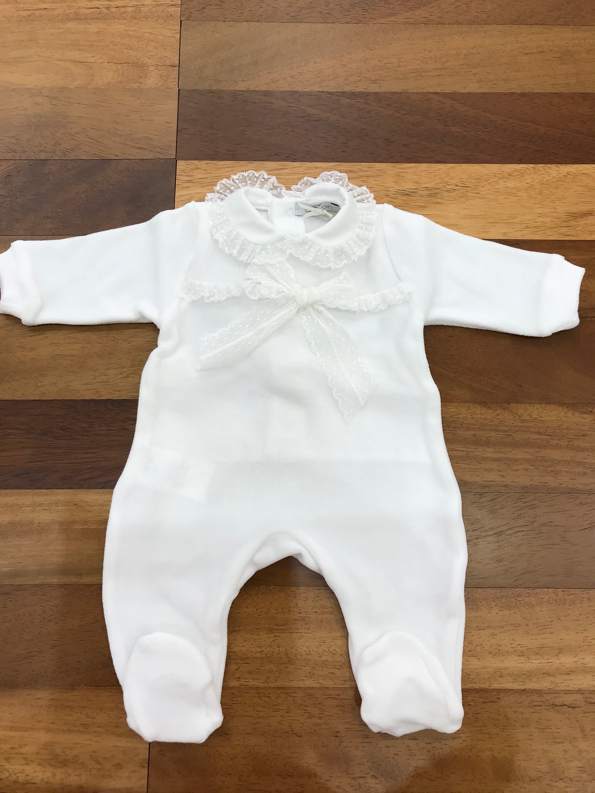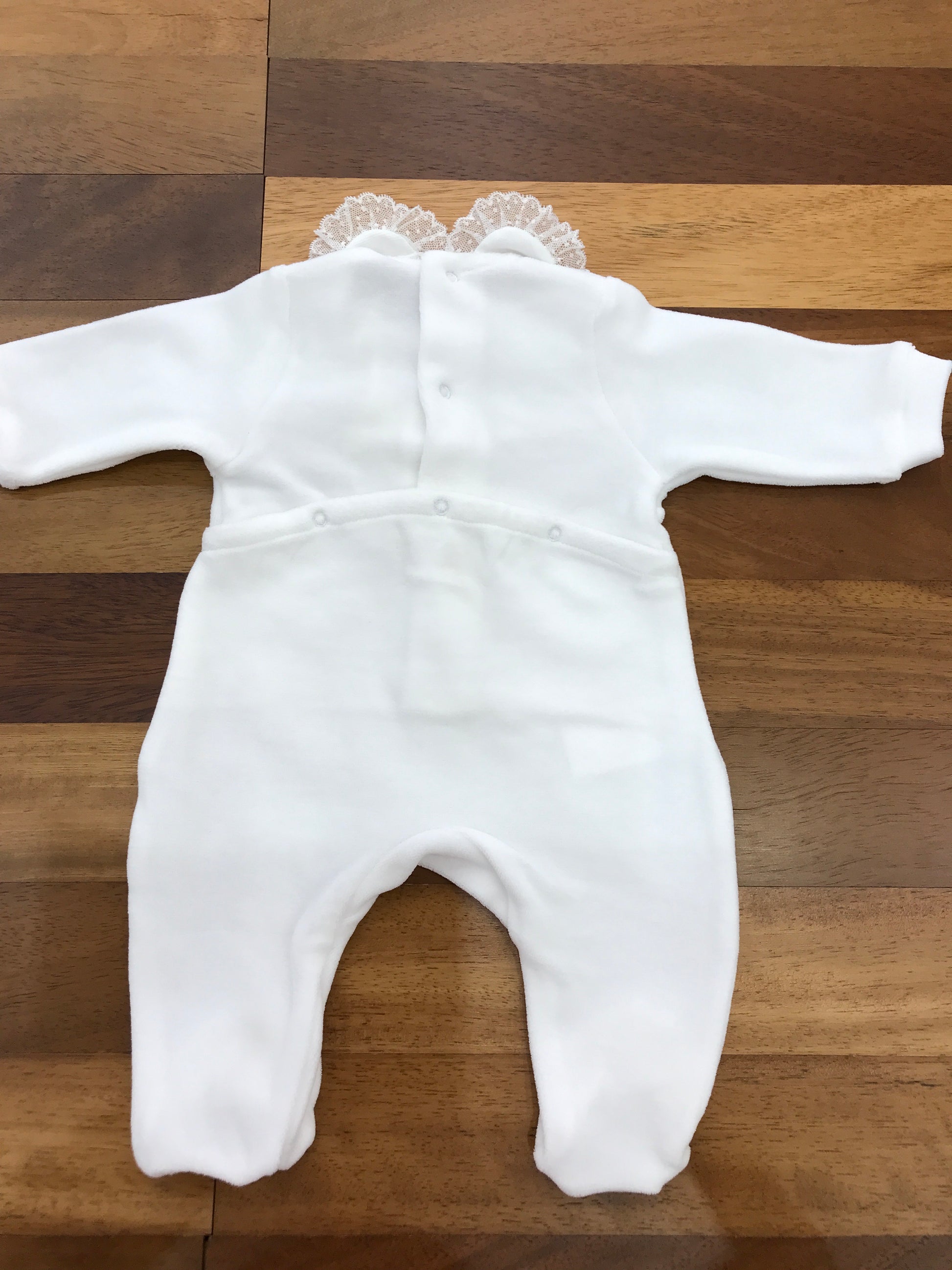 Questa tutina intera in ciniglia è dotata di piedini integrati e un colletto rifinito con delicato merletto. Sul davanti presenta un fiocco decorativo anch’esso impreziosito da merletto, mentre sul retro è chiusa da pratiche chappette per una vestibilità comoda e sicura.