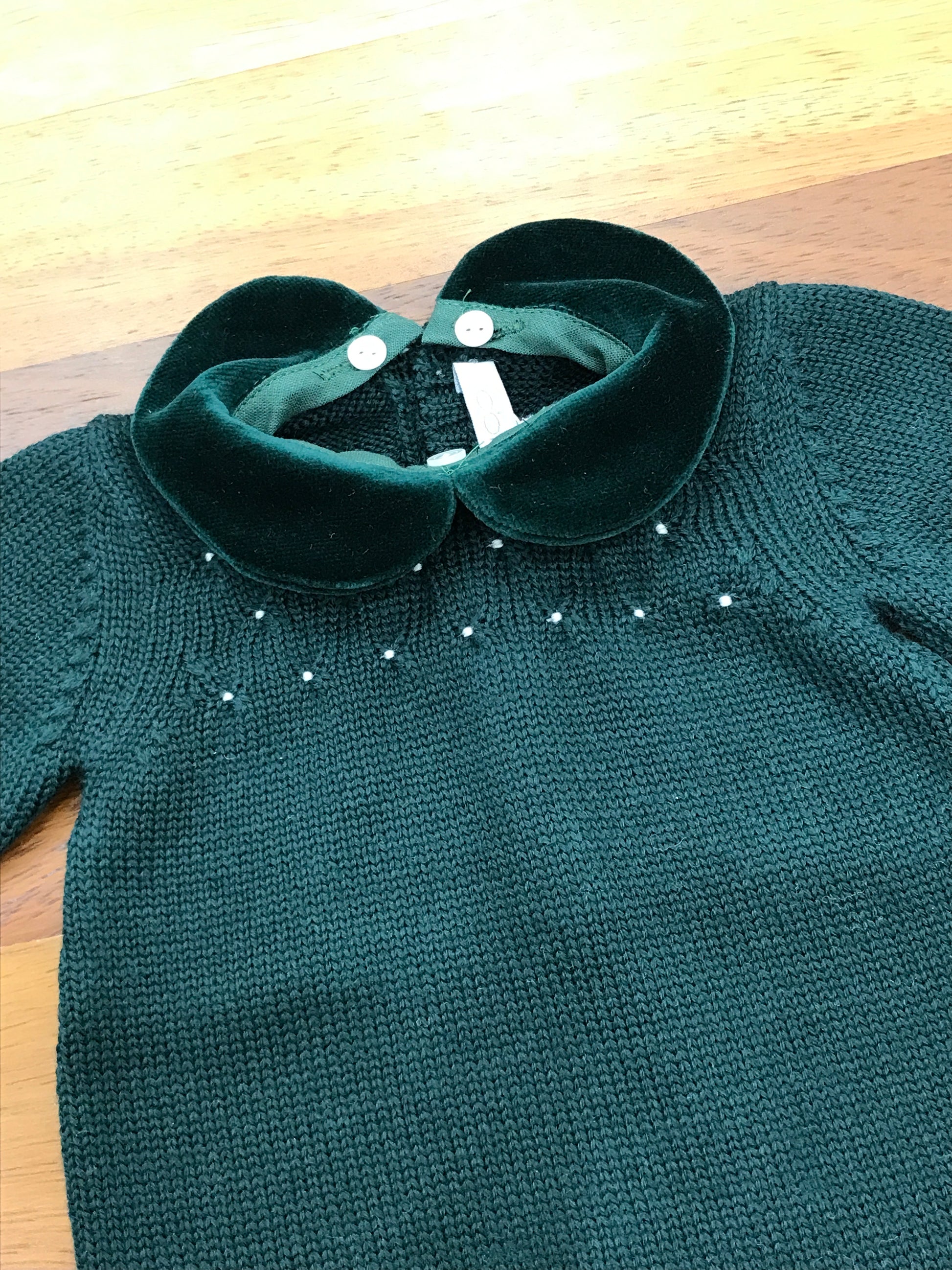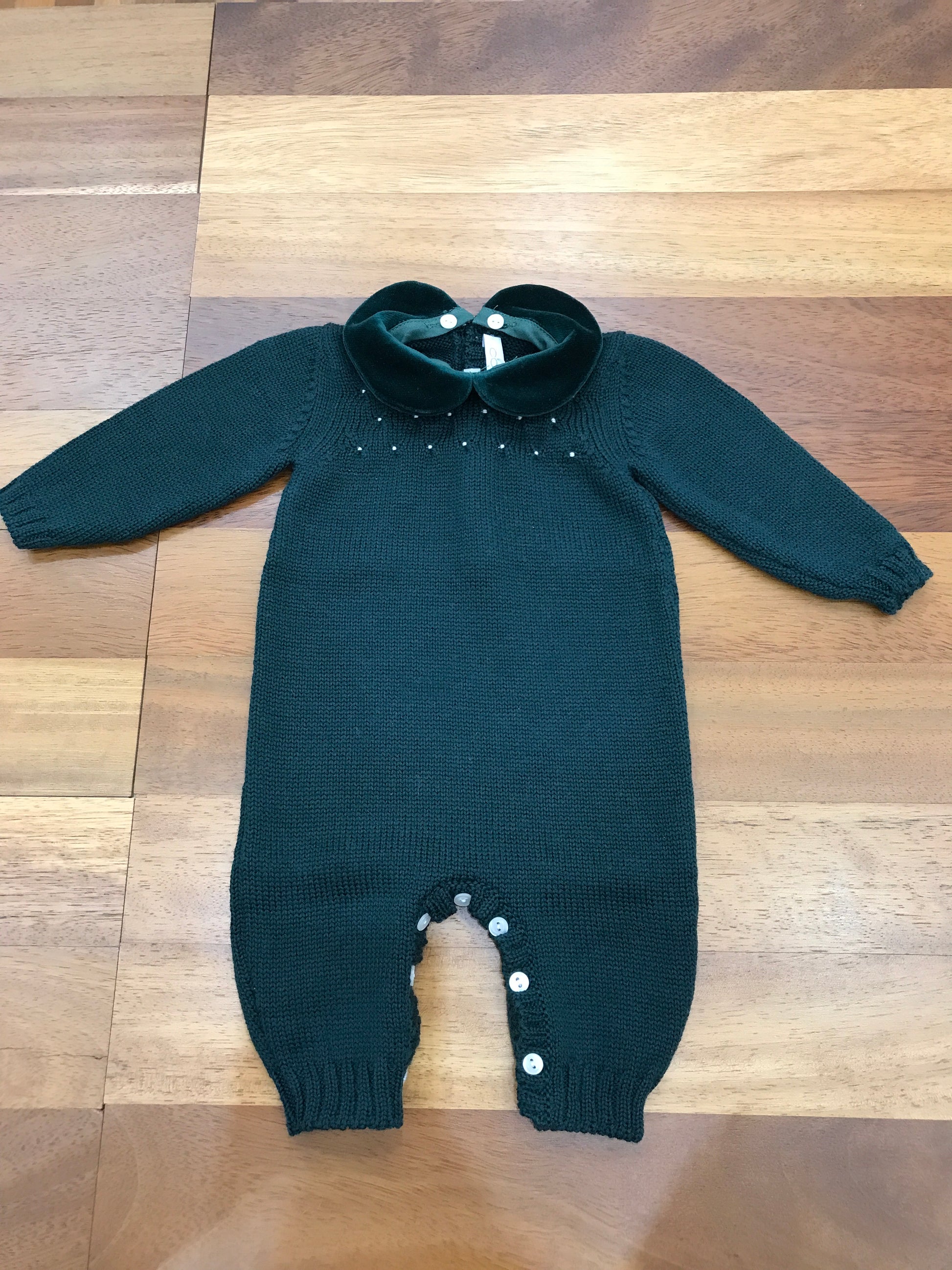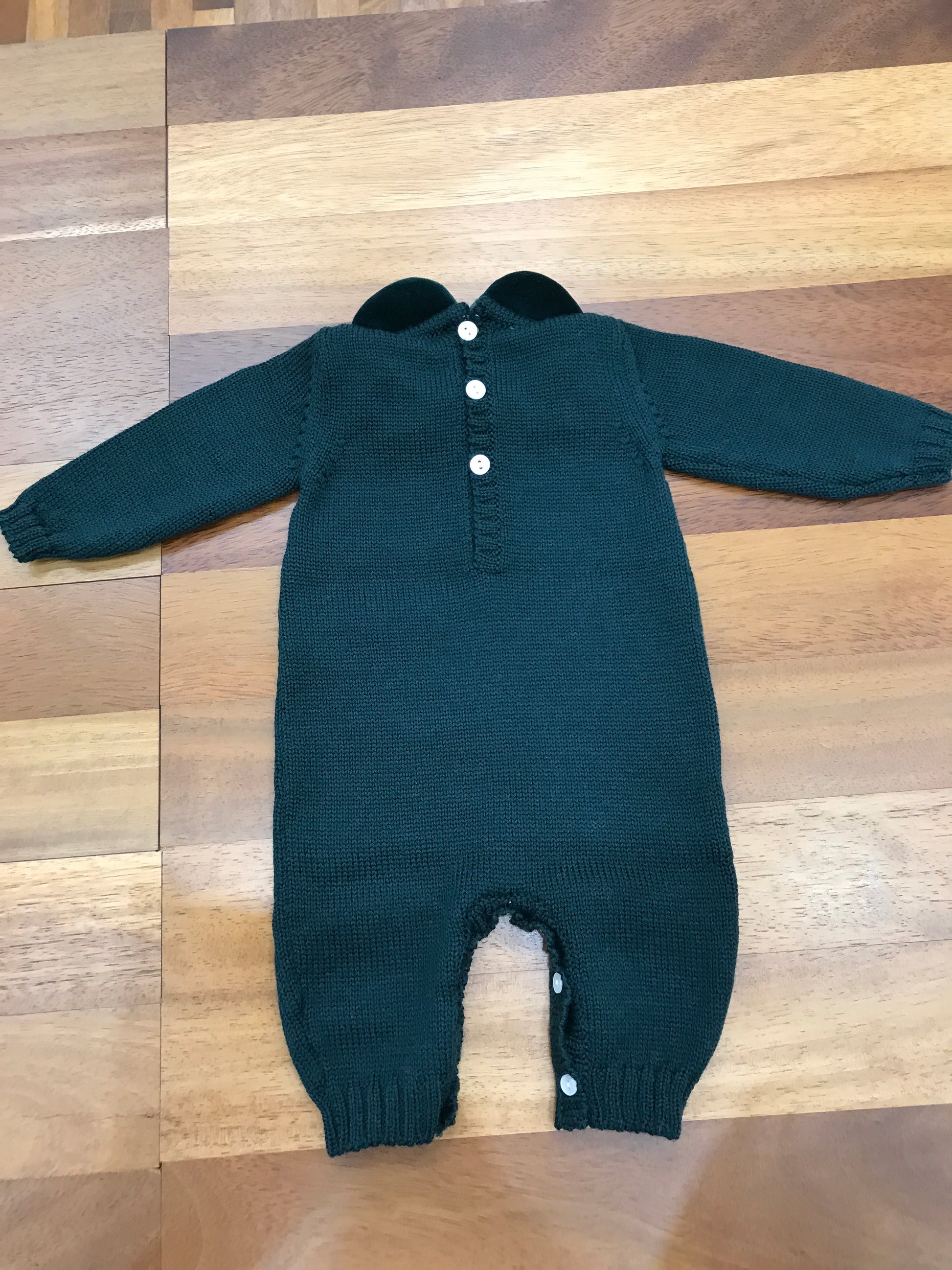 Questa tutina intera è realizzata in morbida lana di alta qualità, priva di piedini per garantire maggiore libertà di movimento. È arricchita da un colletto in velluto, facilmente rimovibile per adattarsi alle diverse esigenze. Sul davanti, un elegante ricamo a punto smock impreziosisce il petto, conferendo un tocco di raffinatezza artigianale. La chiusura è praticamente assicurata da una fila di bottoncini, pensati per facilitare la vestizione e la rimozione del capo in modo semplice e veloce.