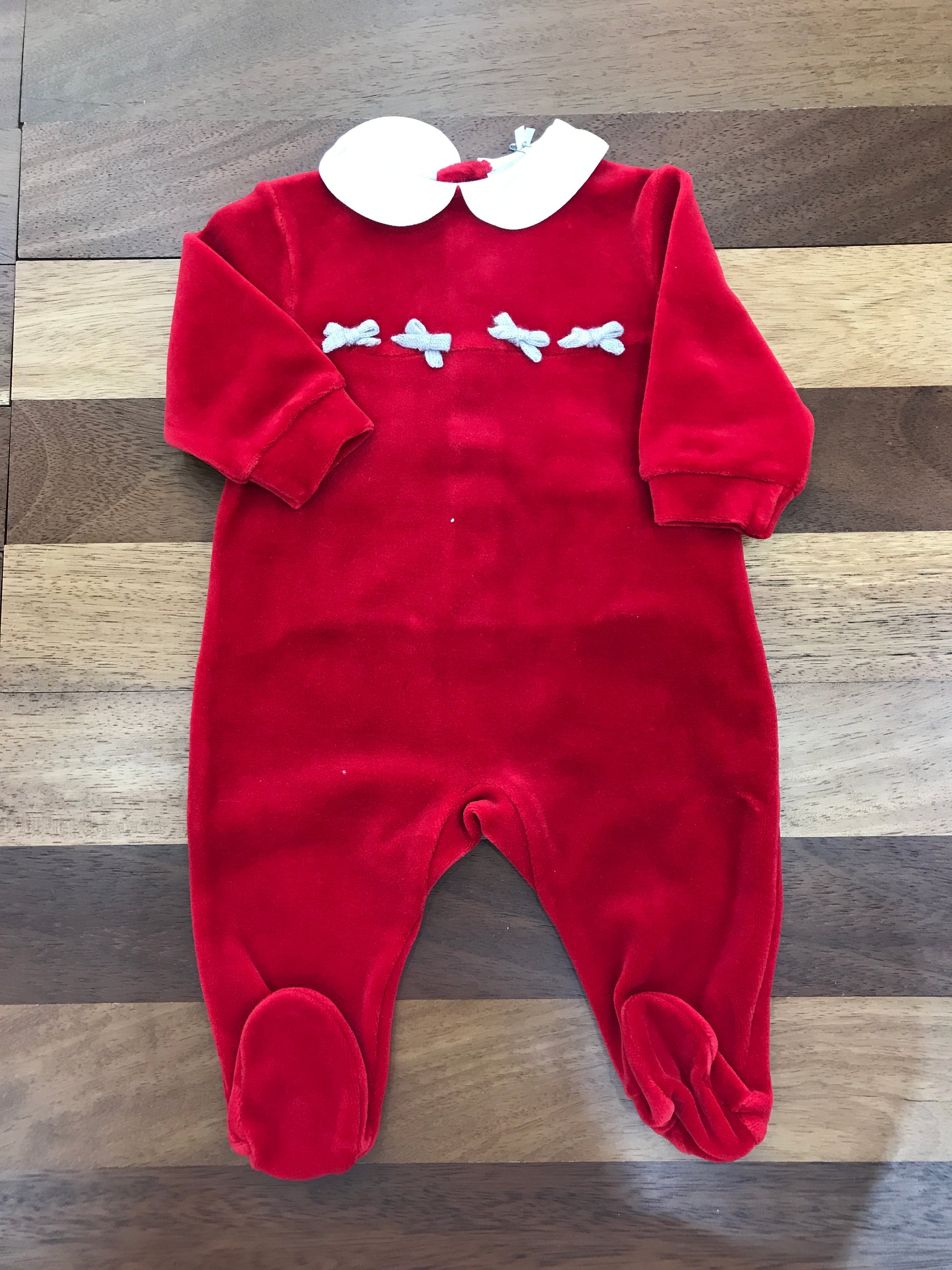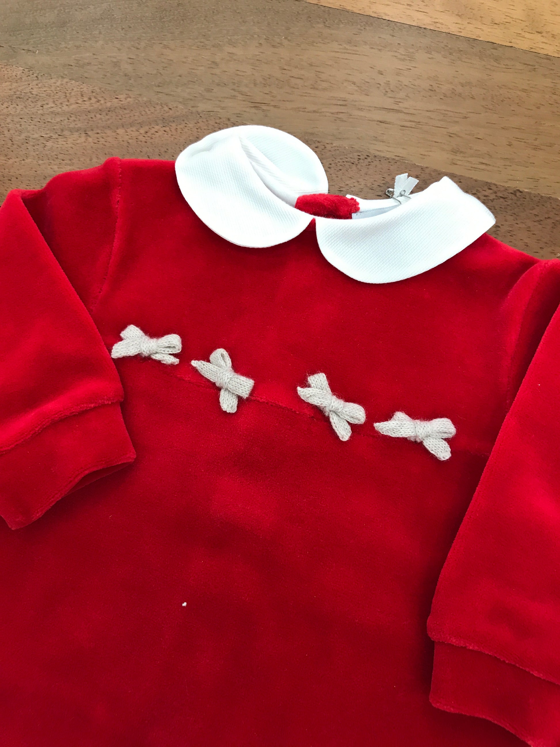 Raffinata tutina intera realizzata in morbida ciniglia, completa di piedini integrati e caratterizzata da un elegante colletto bianco. Quattro delicati fiocchetti in tonalità beige impreziosiscono il centro del capo, conferendogli un tocco di eleganza senza tempo. Un'opzione versatile e sofisticata per il guardaroba della piccola.