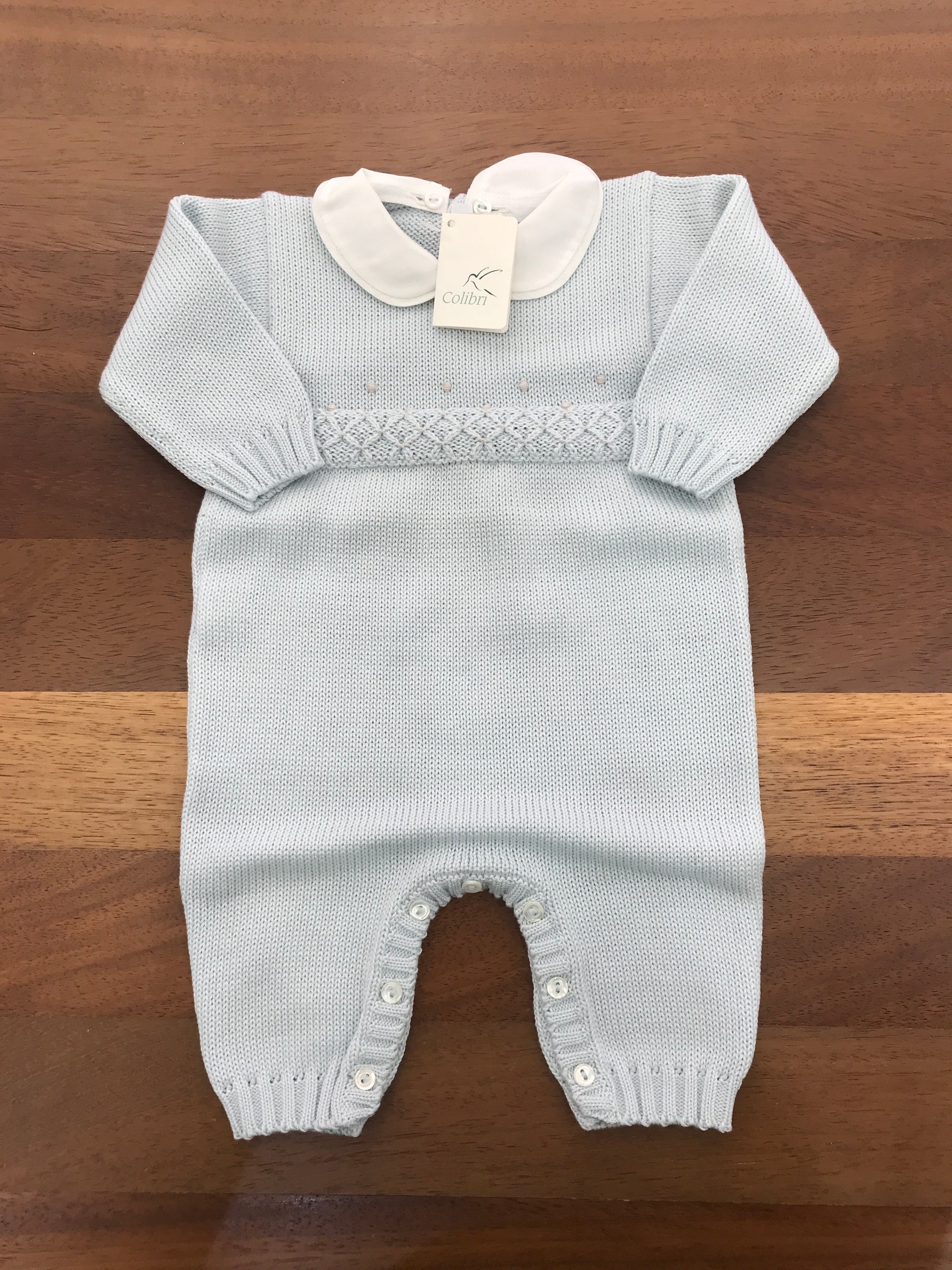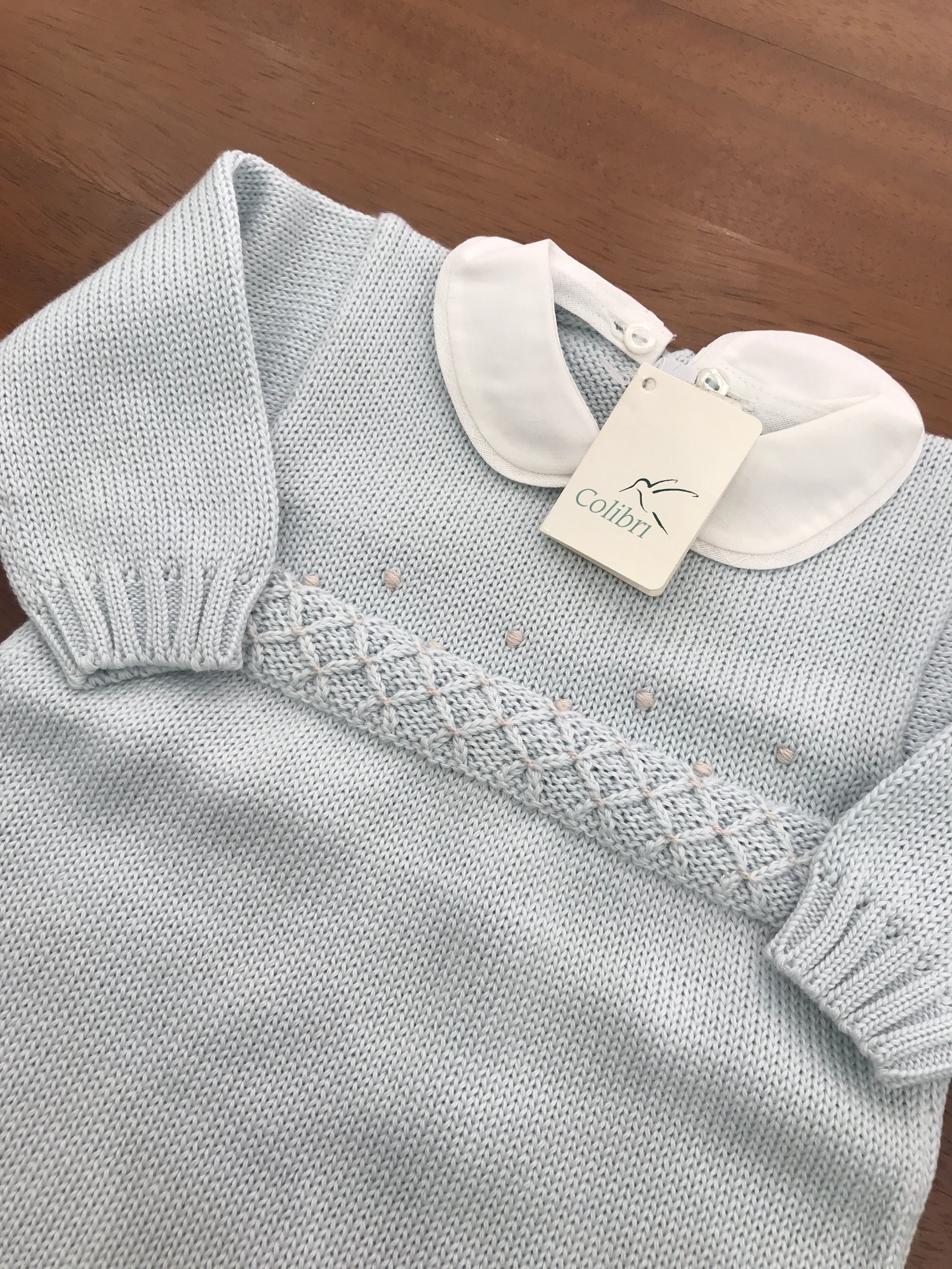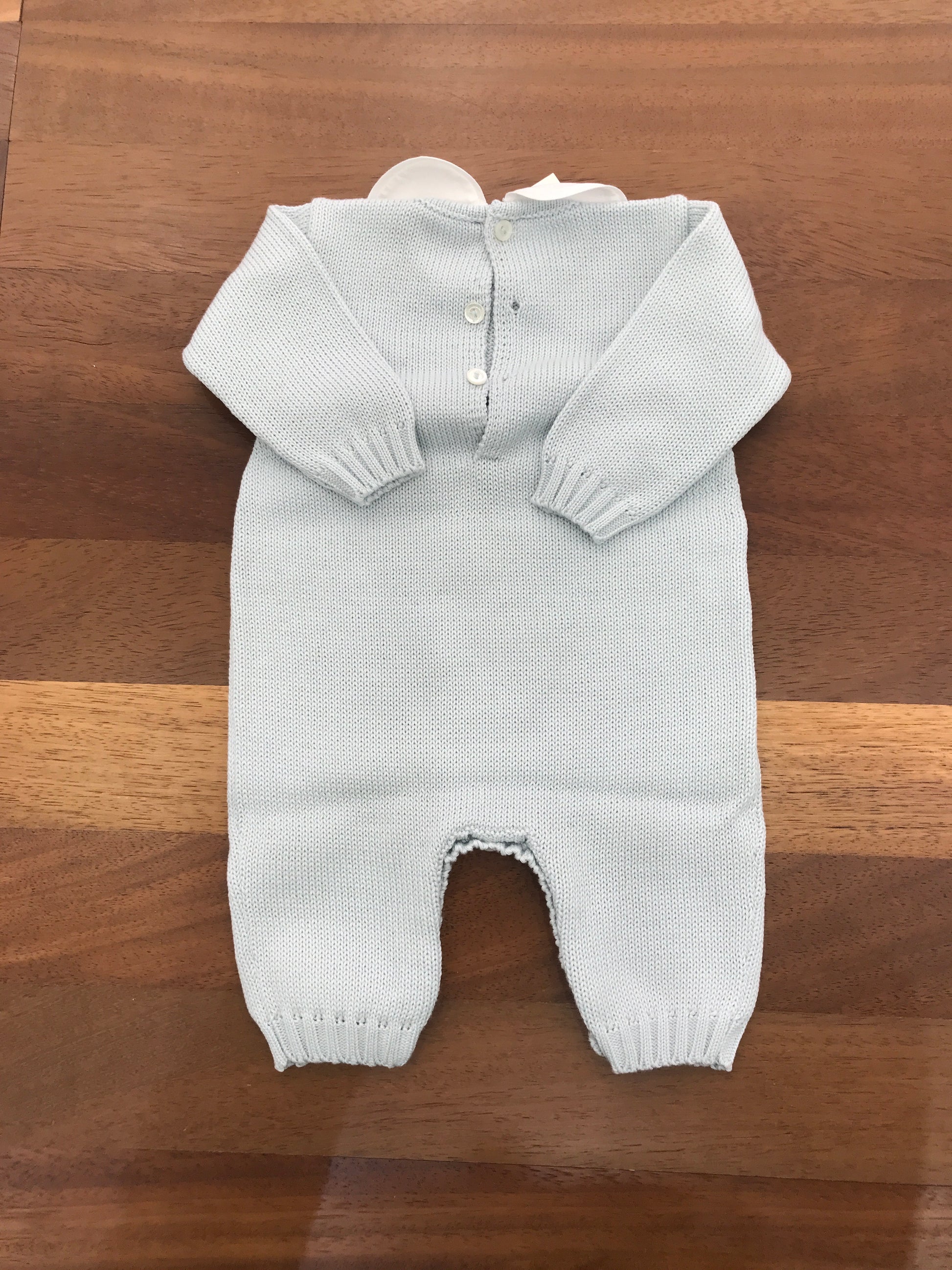Elegante tutina intera realizzata in pregiato filo di cotone dal delicato colore celeste. Caratterizzata da un raffinato colletto bianco staccabile e da una lavorazione centrale eseguita con la tecnica dello smock, che conferisce movimento e texture al capo. Un'opzione sofisticata per occasioni speciali, che unisce comfort e dettagli sartoriali ricercati.
