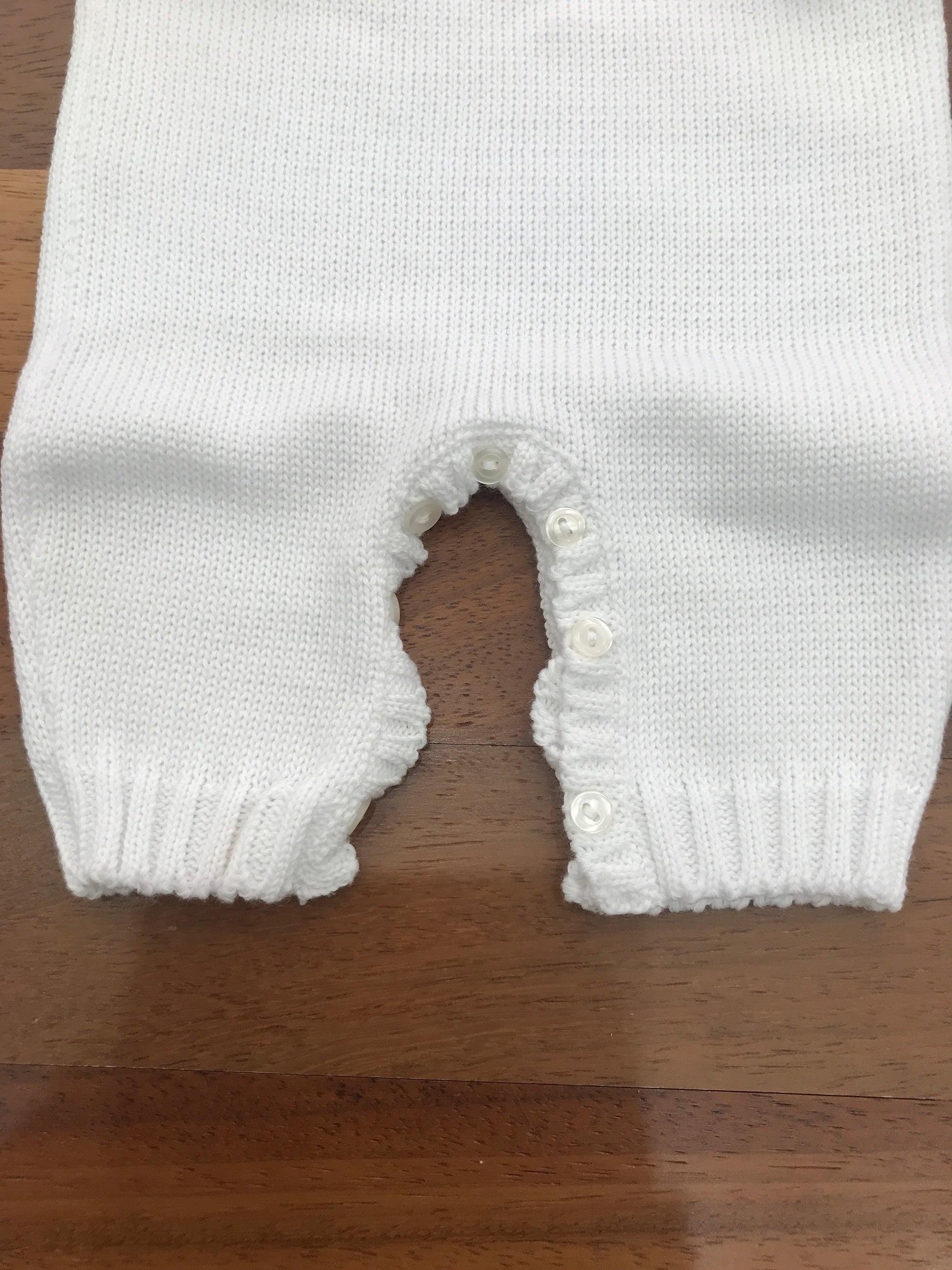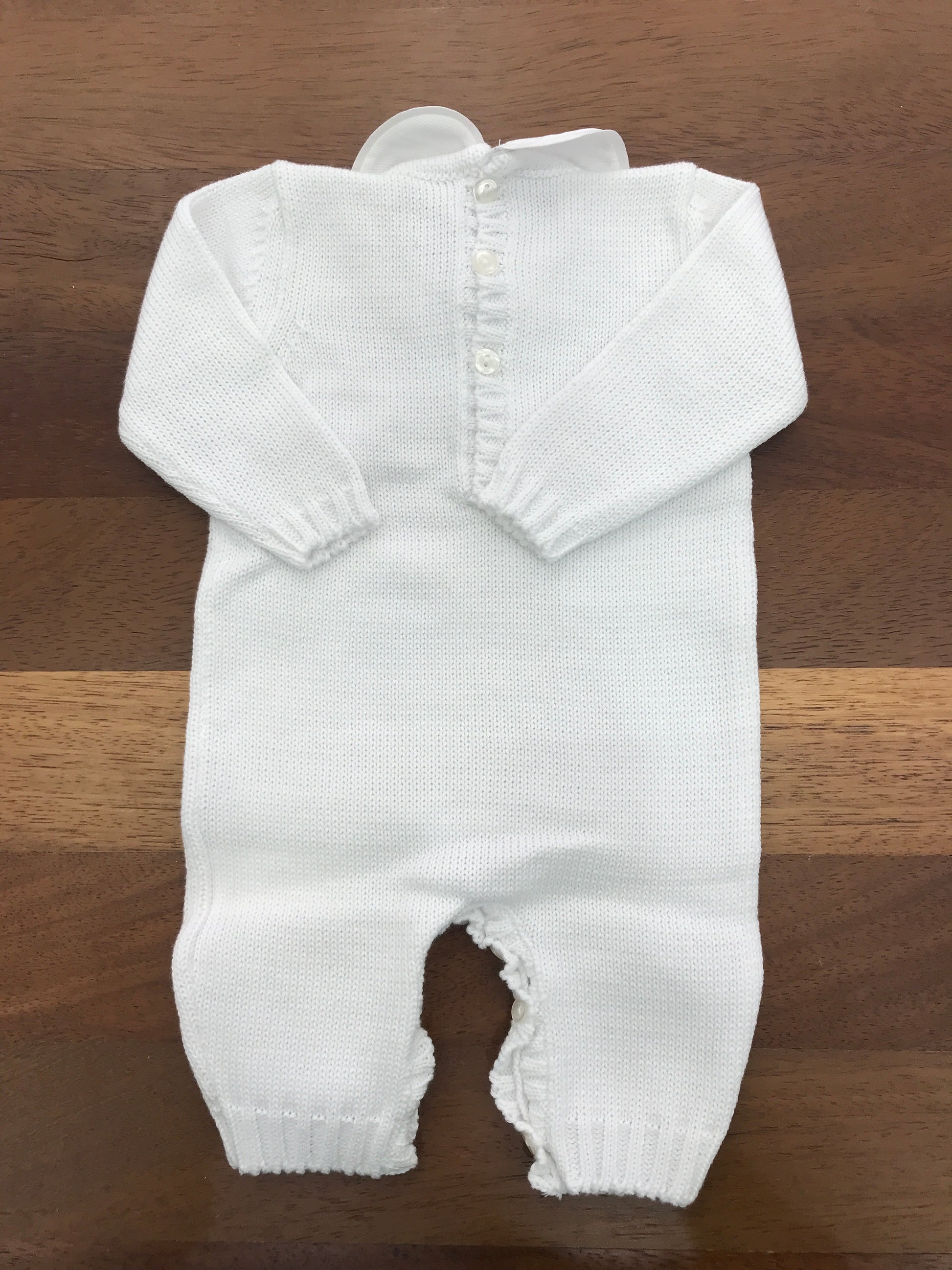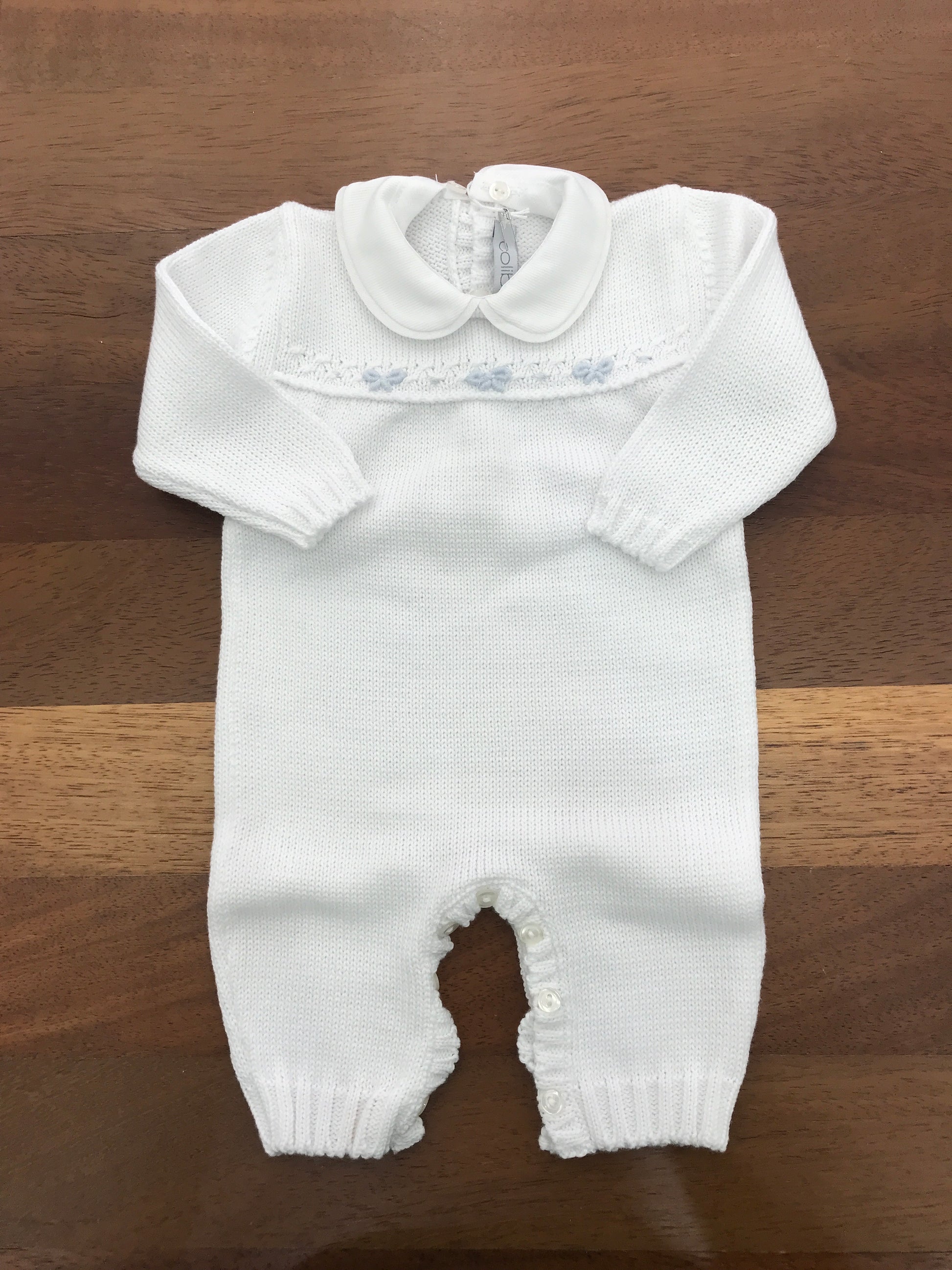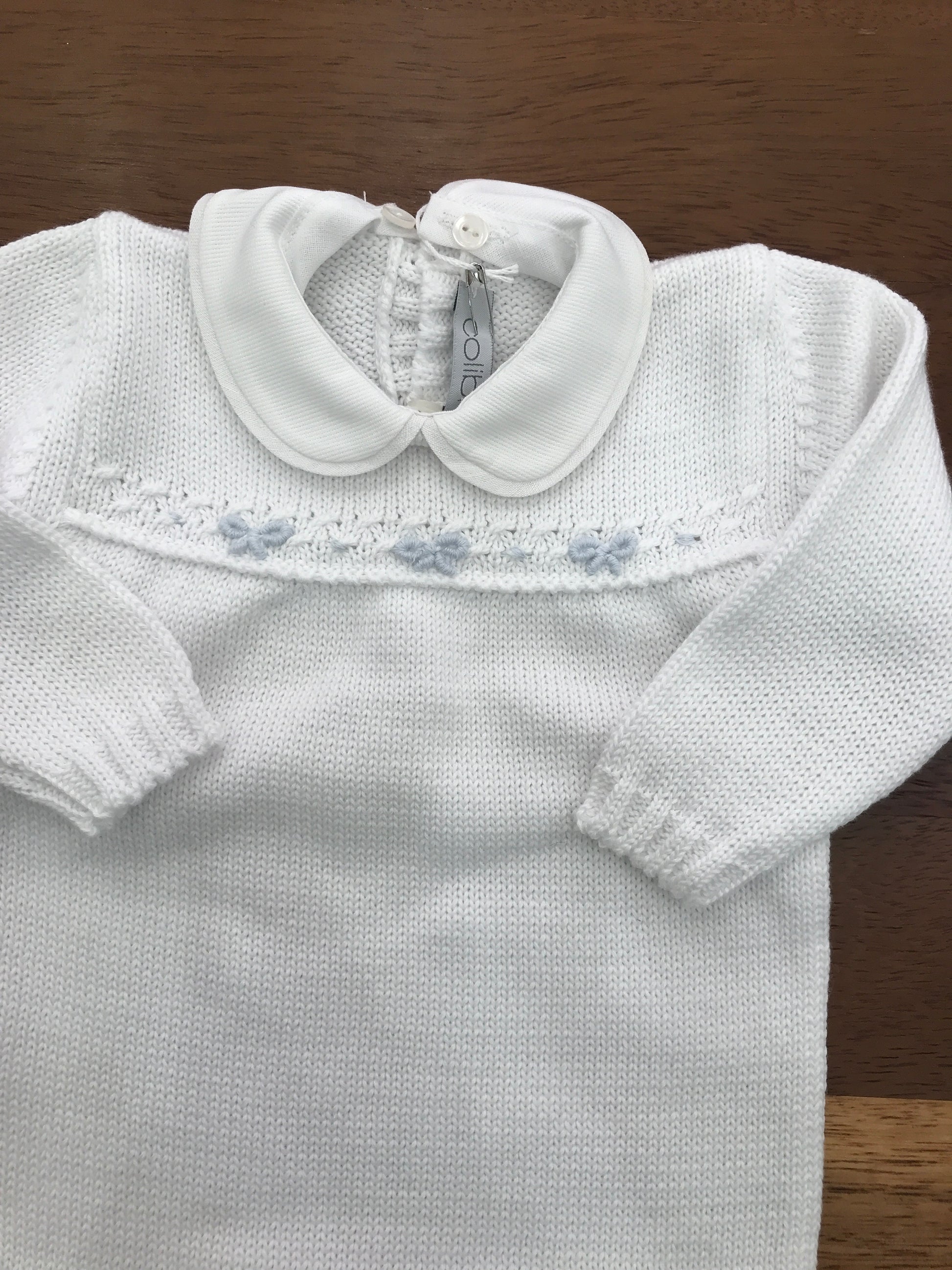 Delicato capo intero realizzato in pregiato filo bianco, impreziosito da una raffinata lavorazione sul petto con fiocchetti azzurri. Dotato di colletto staccabile, offre versatilità stilistica per adattarsi a diverse occasioni. Un'opzione elegante e pratica per il guardaroba infantile.