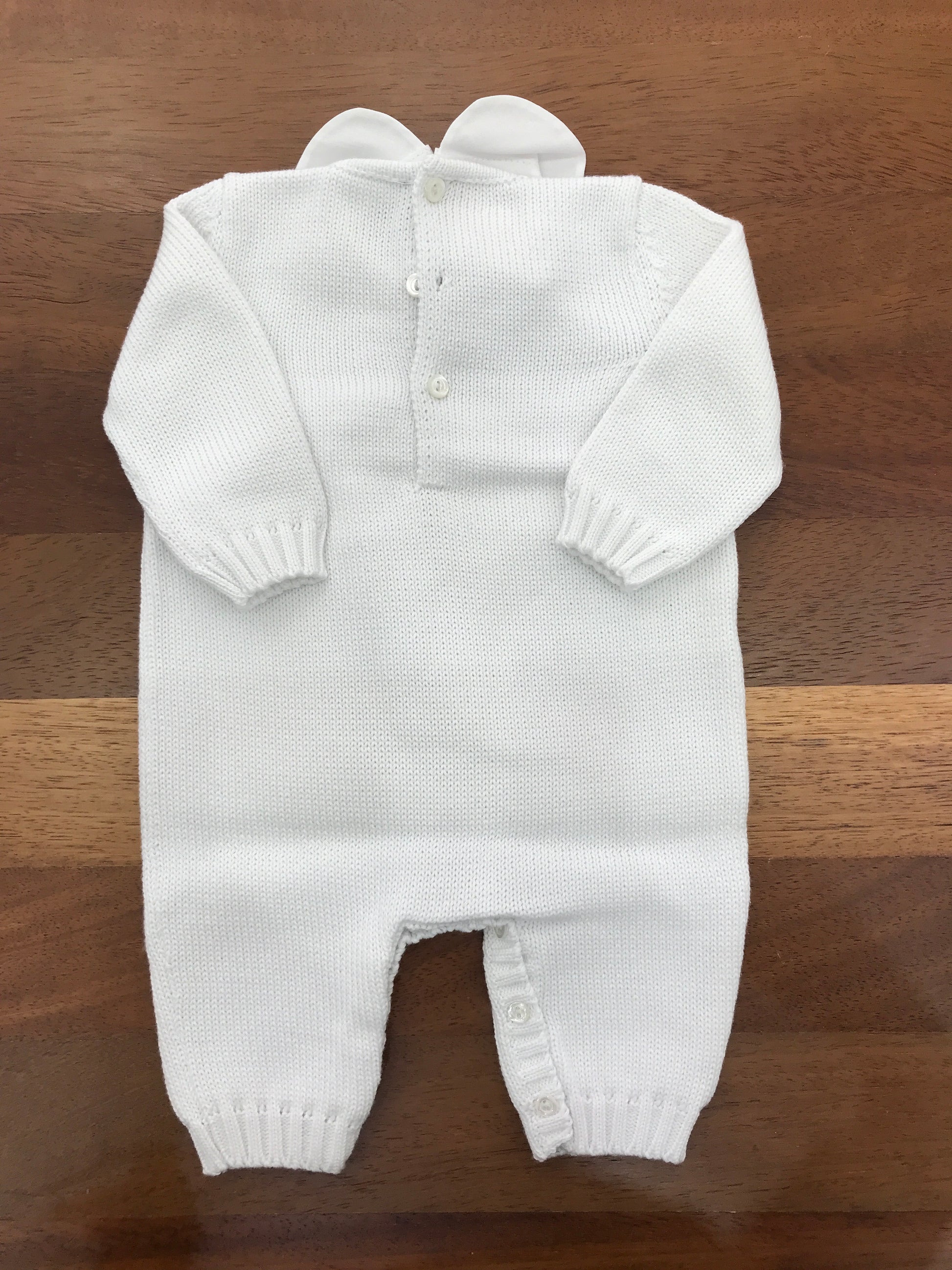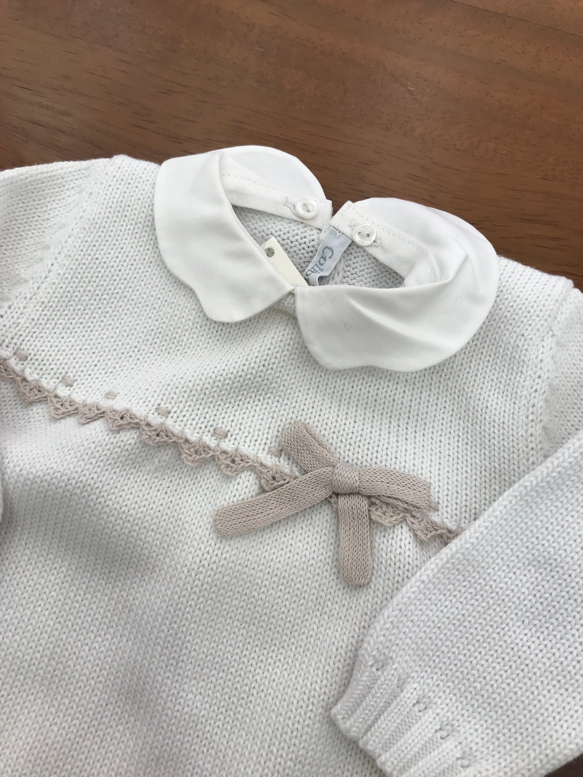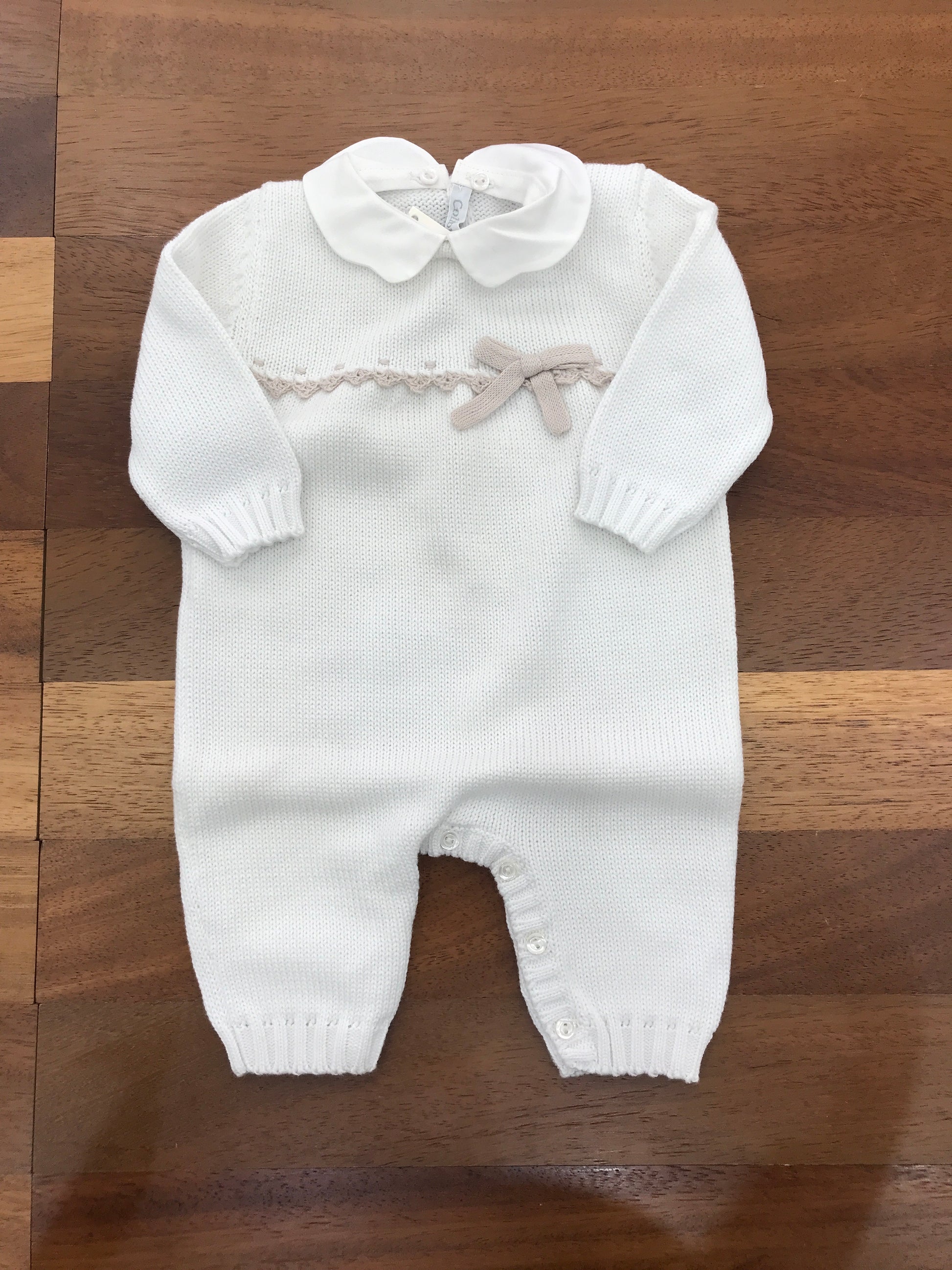Elegante tutina intera realizzata in pregiato filo bianco, caratterizzata da un raffinato dettaglio sul petto con lavorazione in tortora e un delicato fiocchetto coordinato posizionato lateralmente. Un capo che unisce semplicità e ricercatezza, perfetto per occasioni speciali.