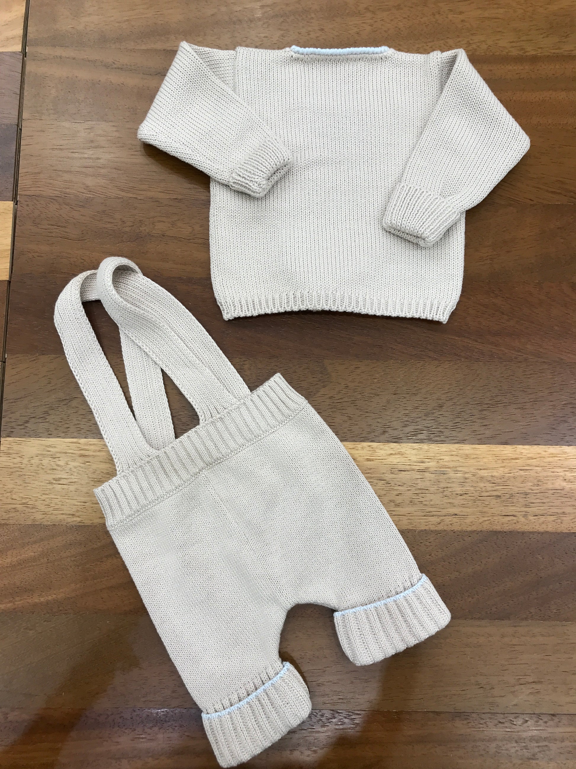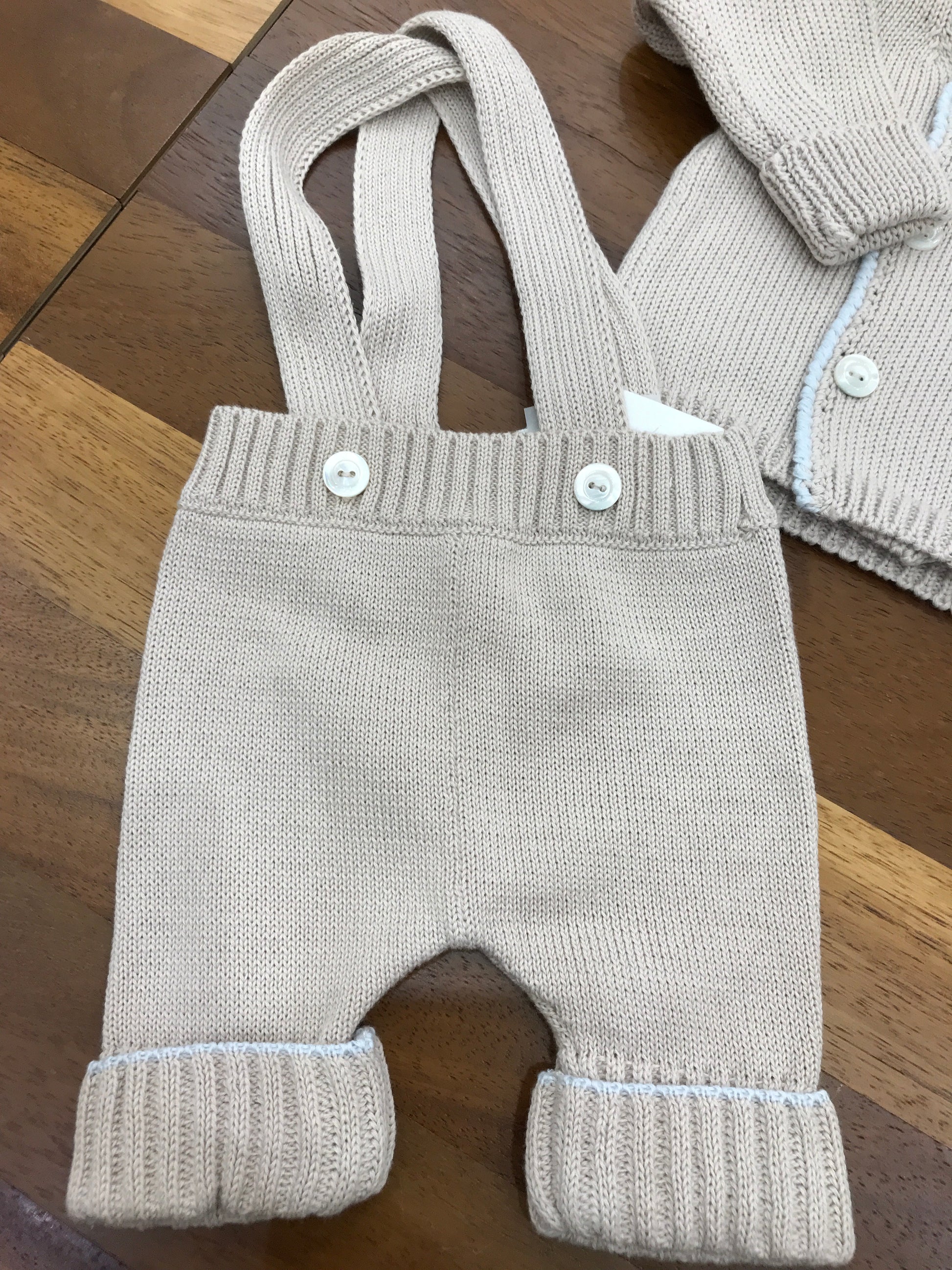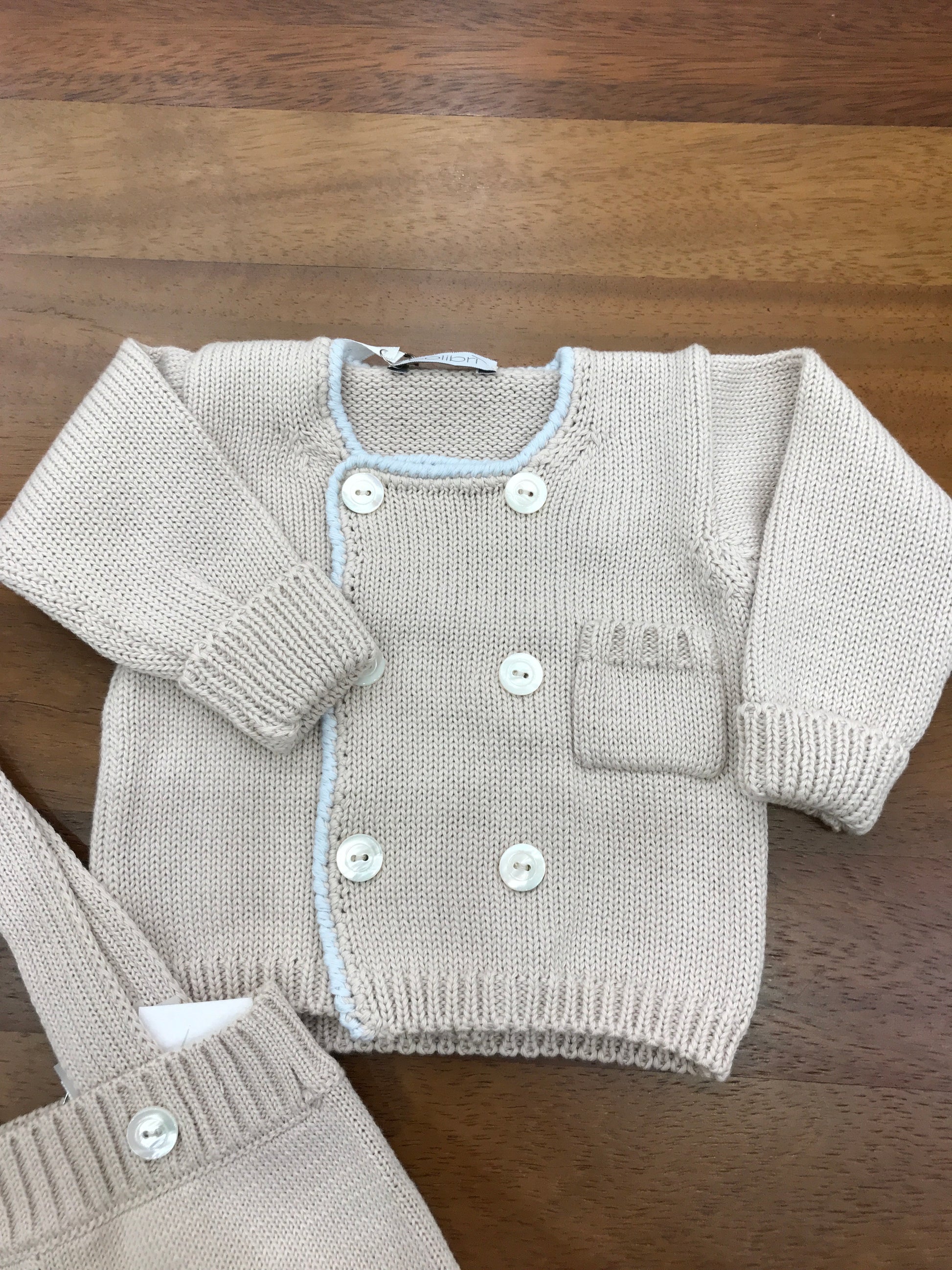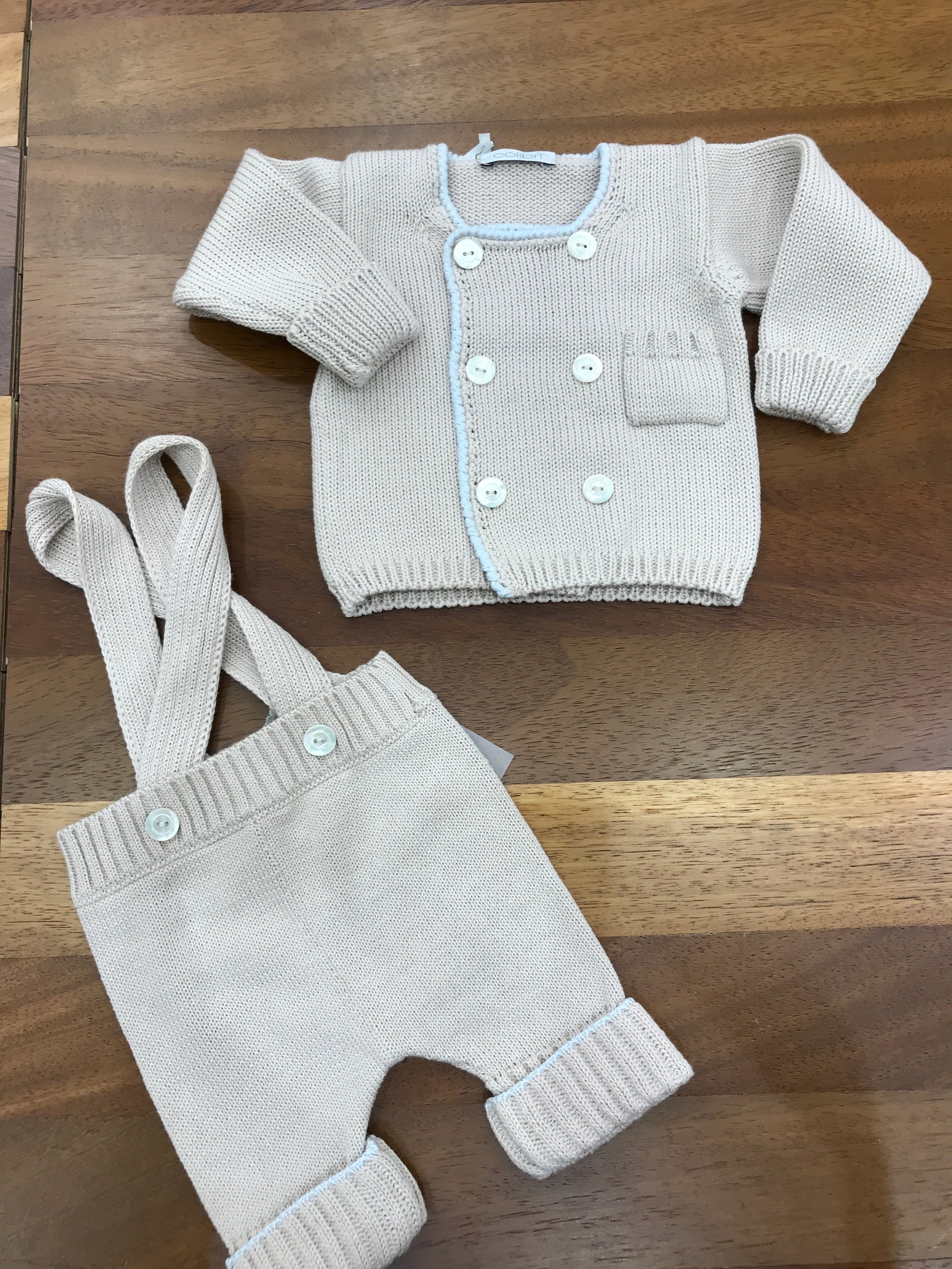 Elegante coordinato bicolore composto da cardigan doppiopetto con bottoni in madreperla e salopette in cotone leggero a gamba corta. Un abbinamento sofisticato che unisce praticità e raffinatezza, perfetto per occasioni speciali e momenti quotidiani con stile.