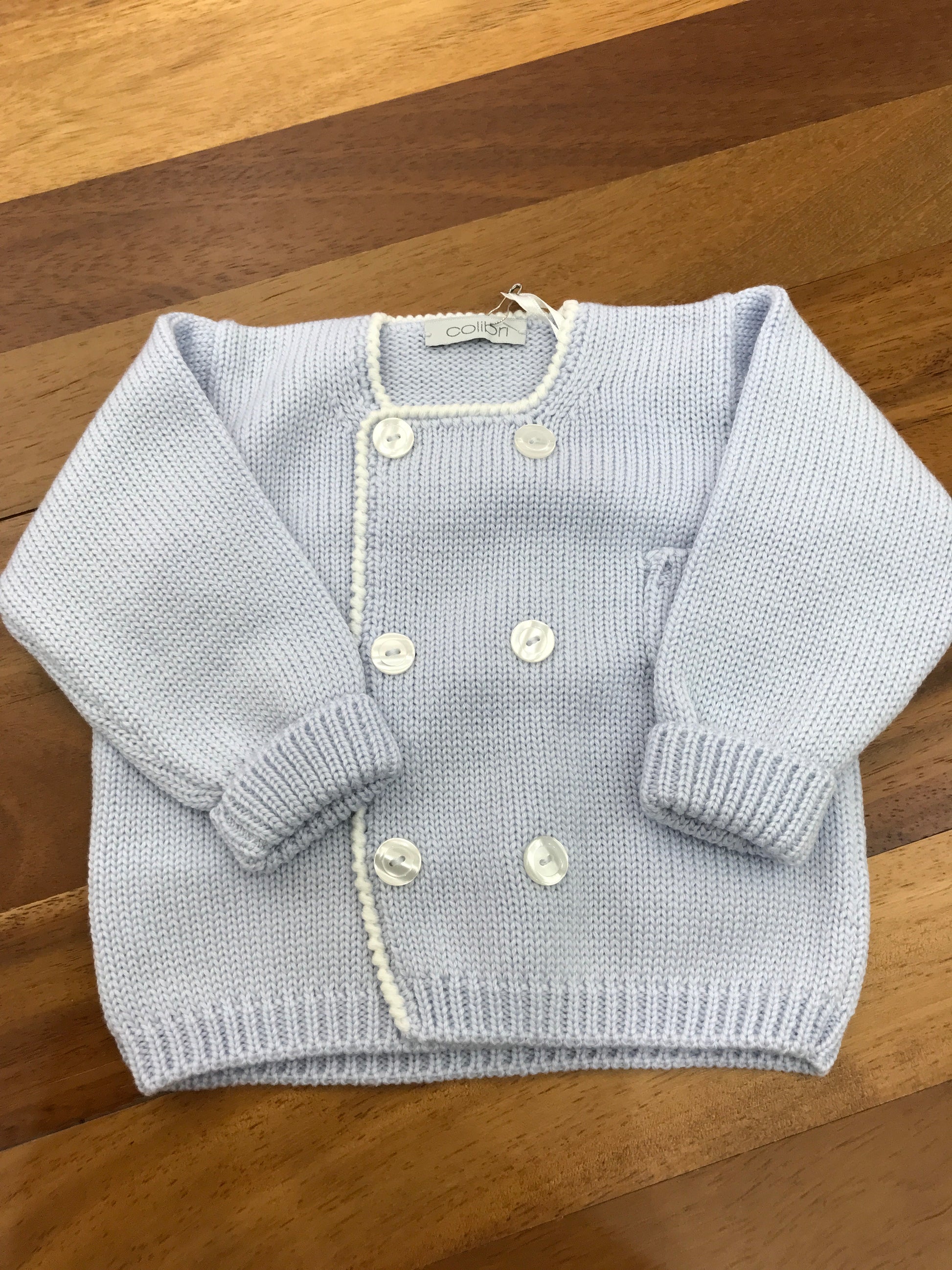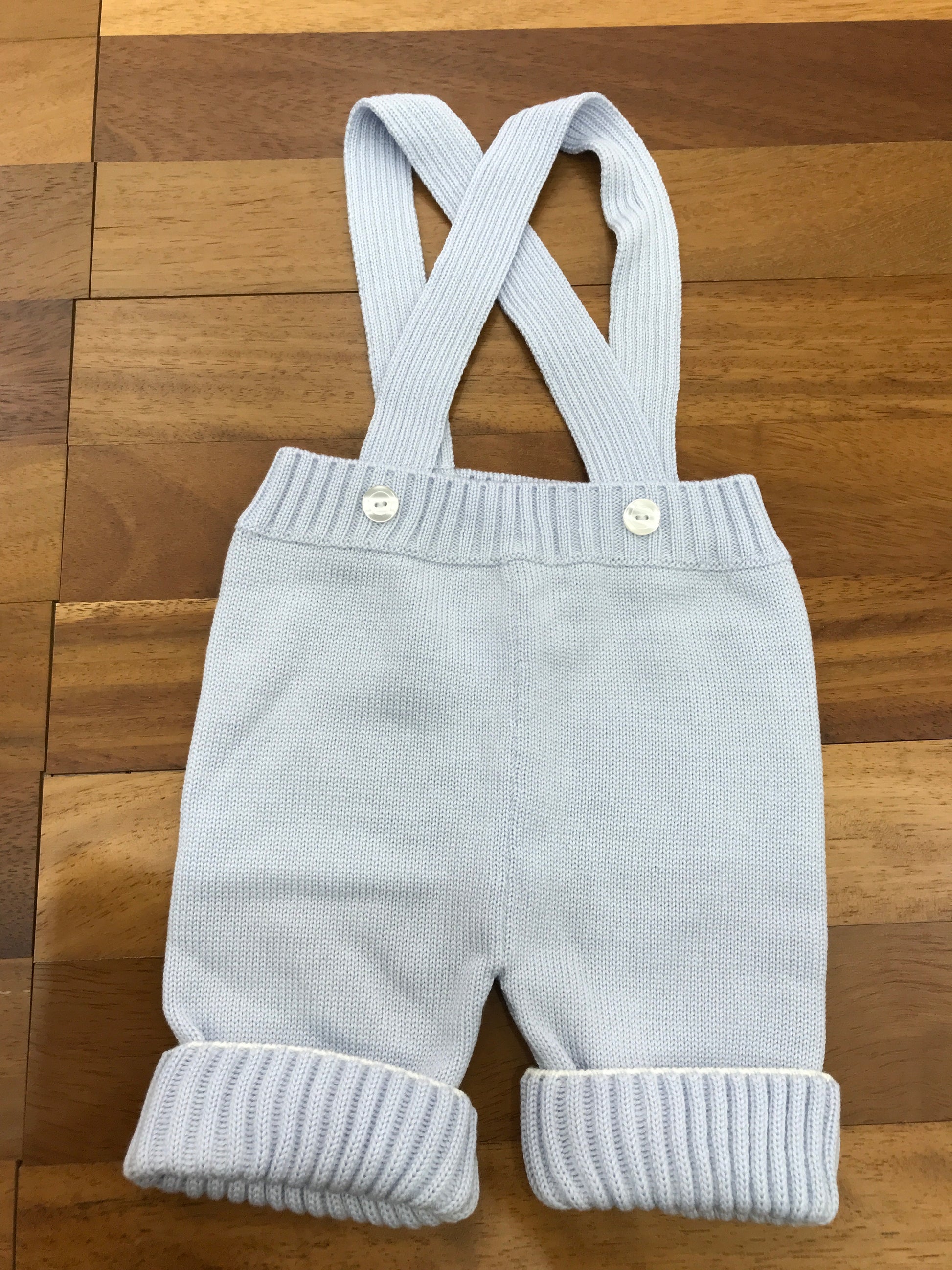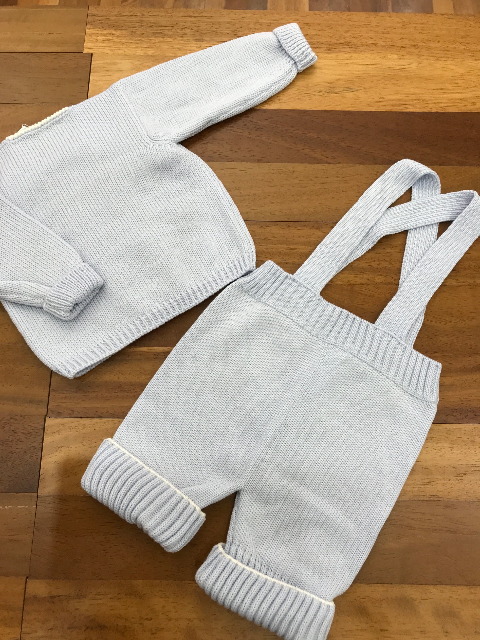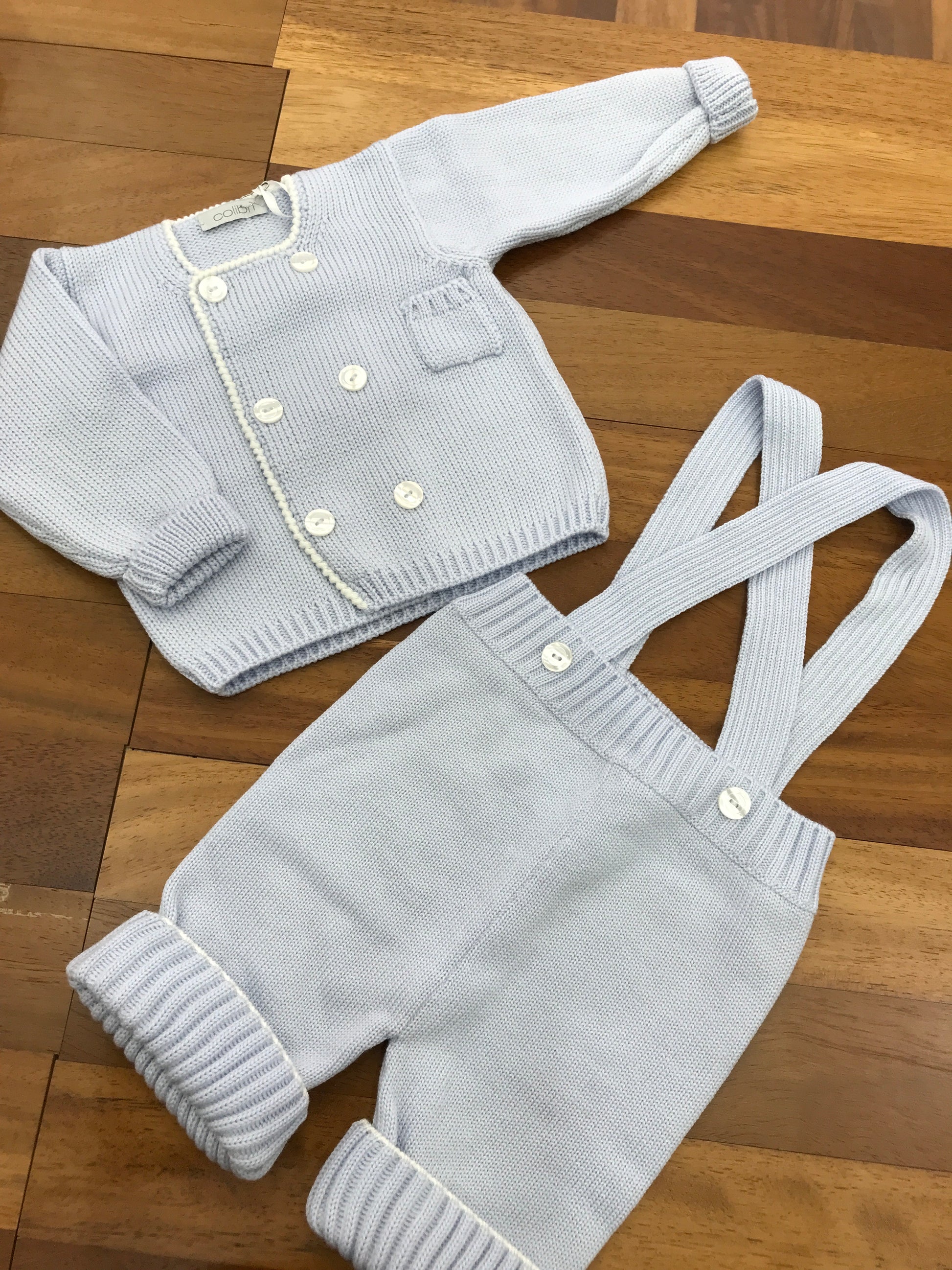 Completo composto da salopette e cardigan in lana, arricchito da una delicata striscia panna ricamata e rifinito con bottoncini.