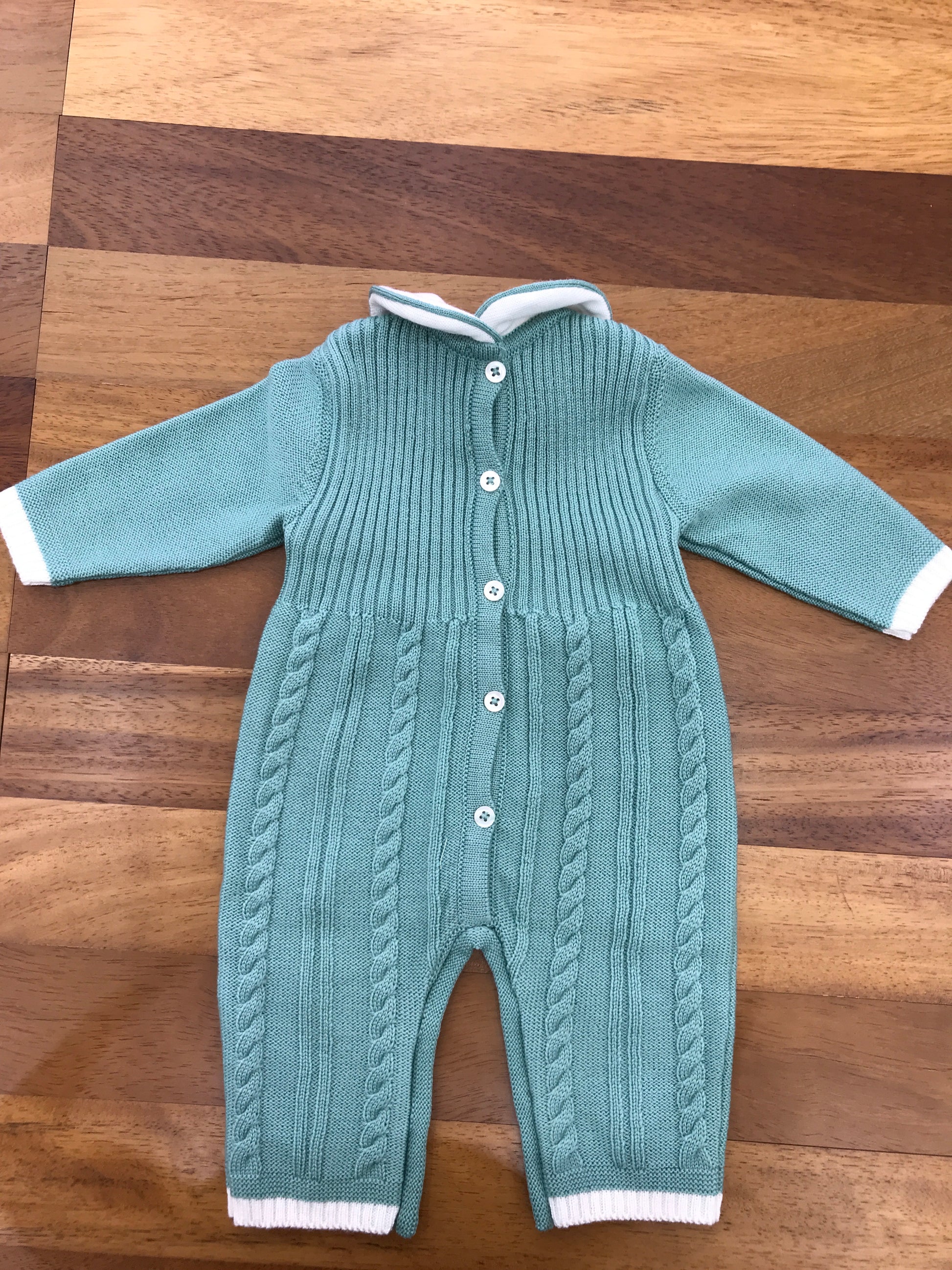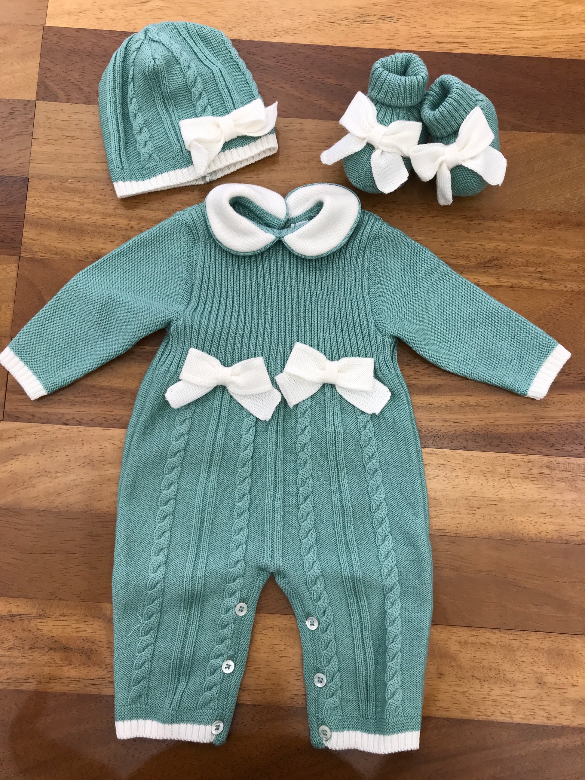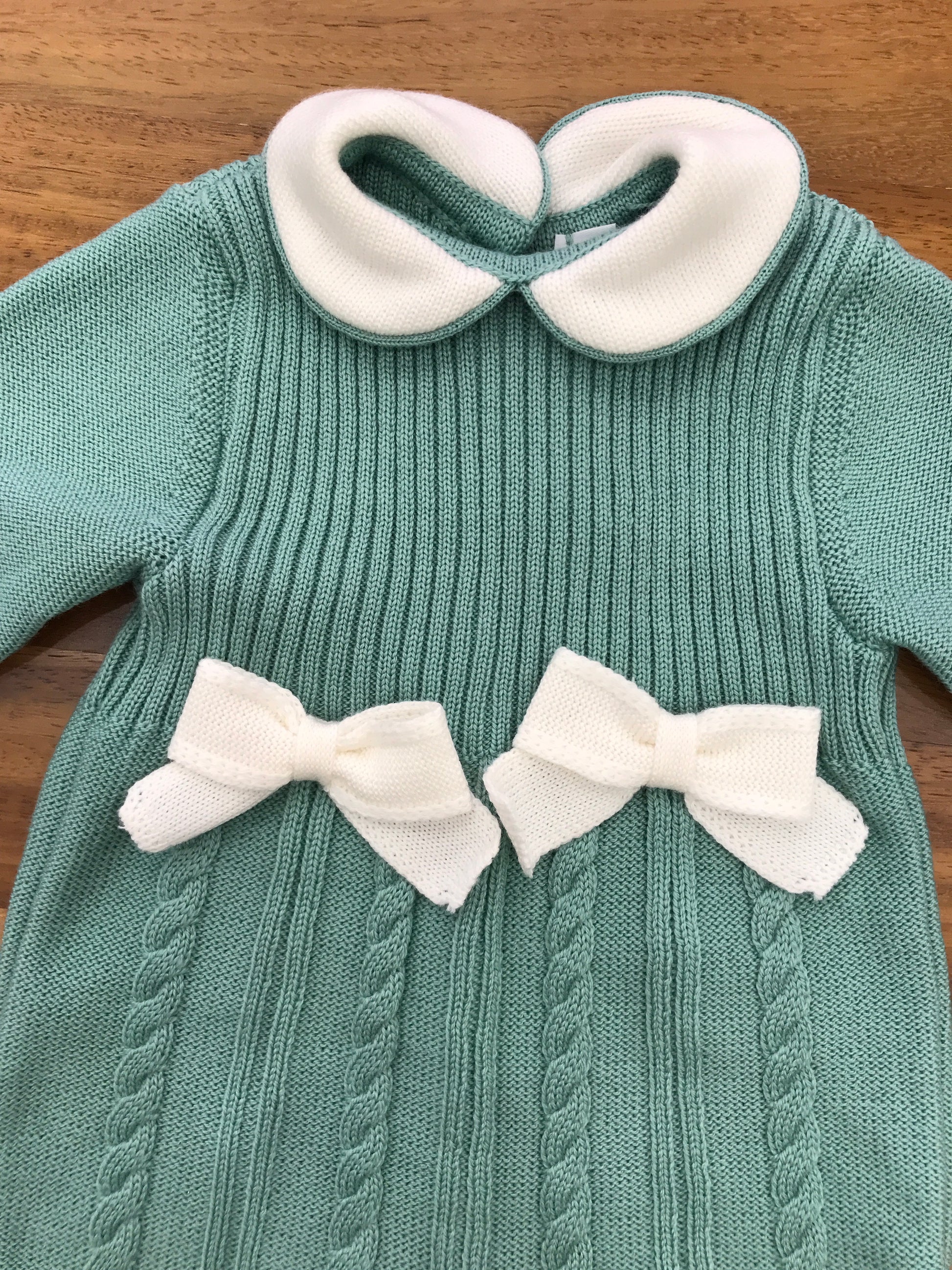 Questa tutina completa presenta una raffinata lavorazione a trecce e un delicato fiocco in lana applicato. Il collo bicolore aggiunge un tocco distintivo, mentre l'assenza di piedini garantisce maggiore versatilità.