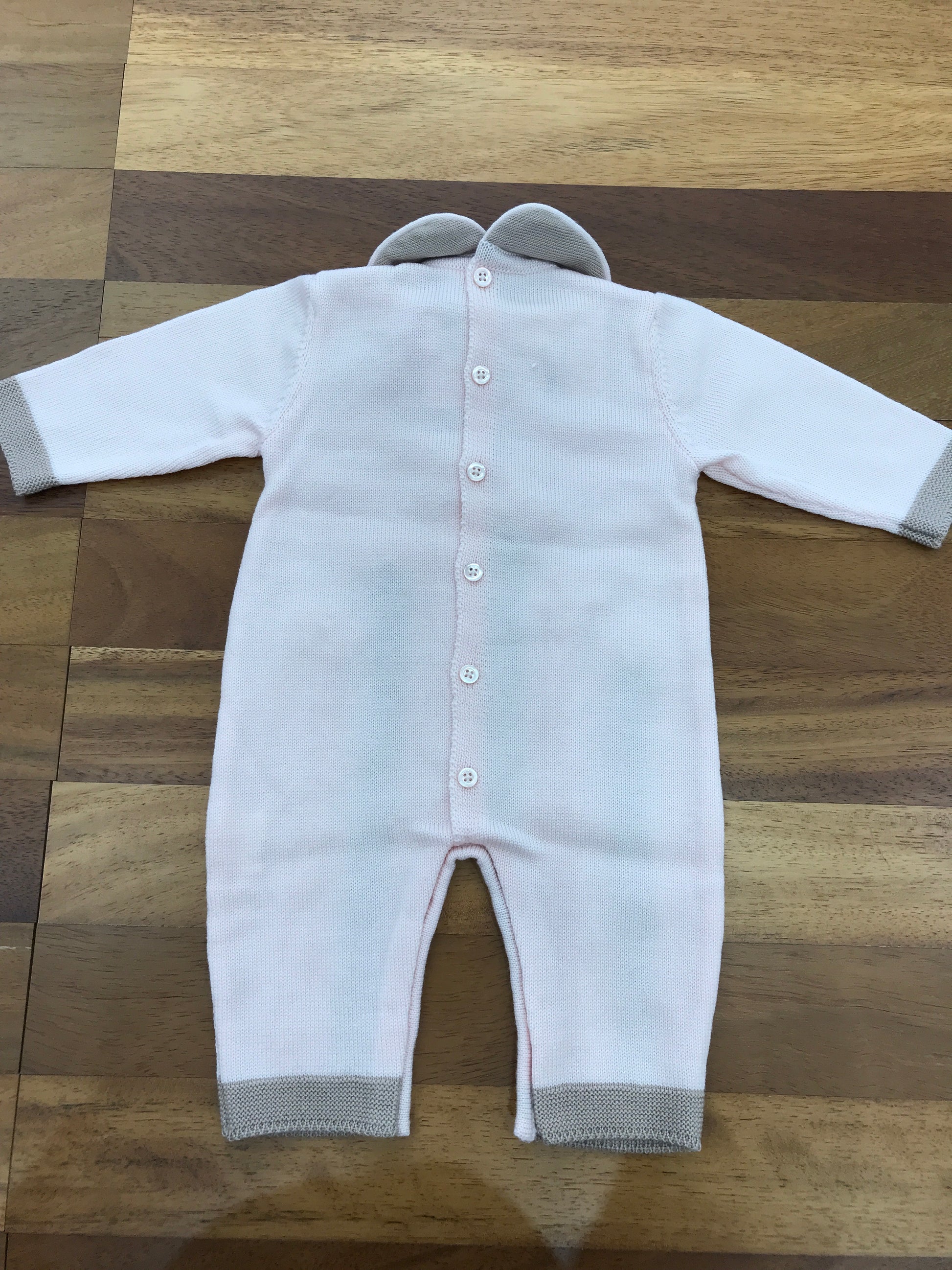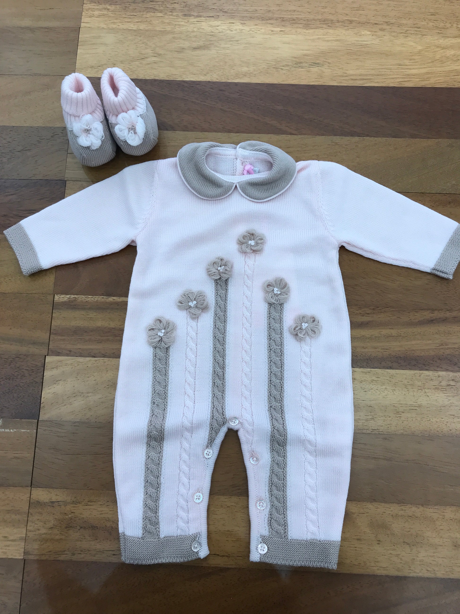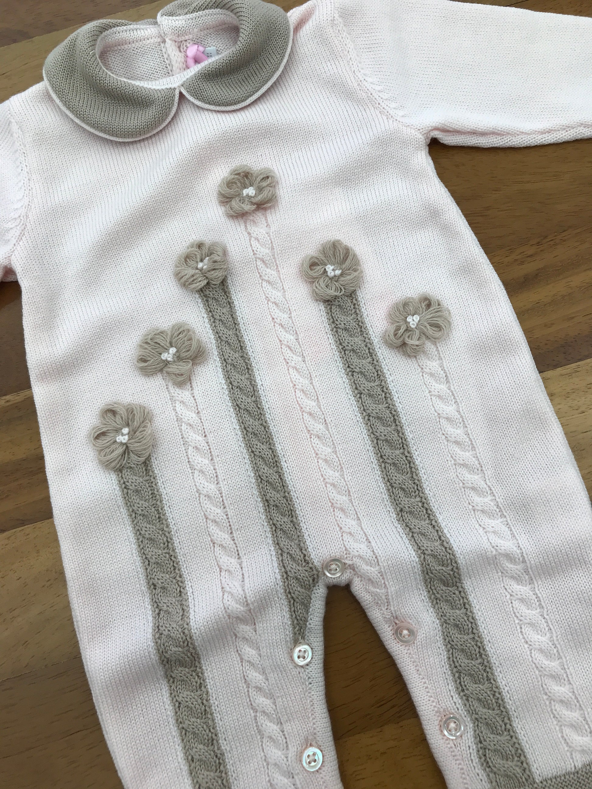 Intera tutina in lana senza piedini, caratterizzata da una lavorazione a trecce sul davanti e decorata con delicati fiorellini ricamati.