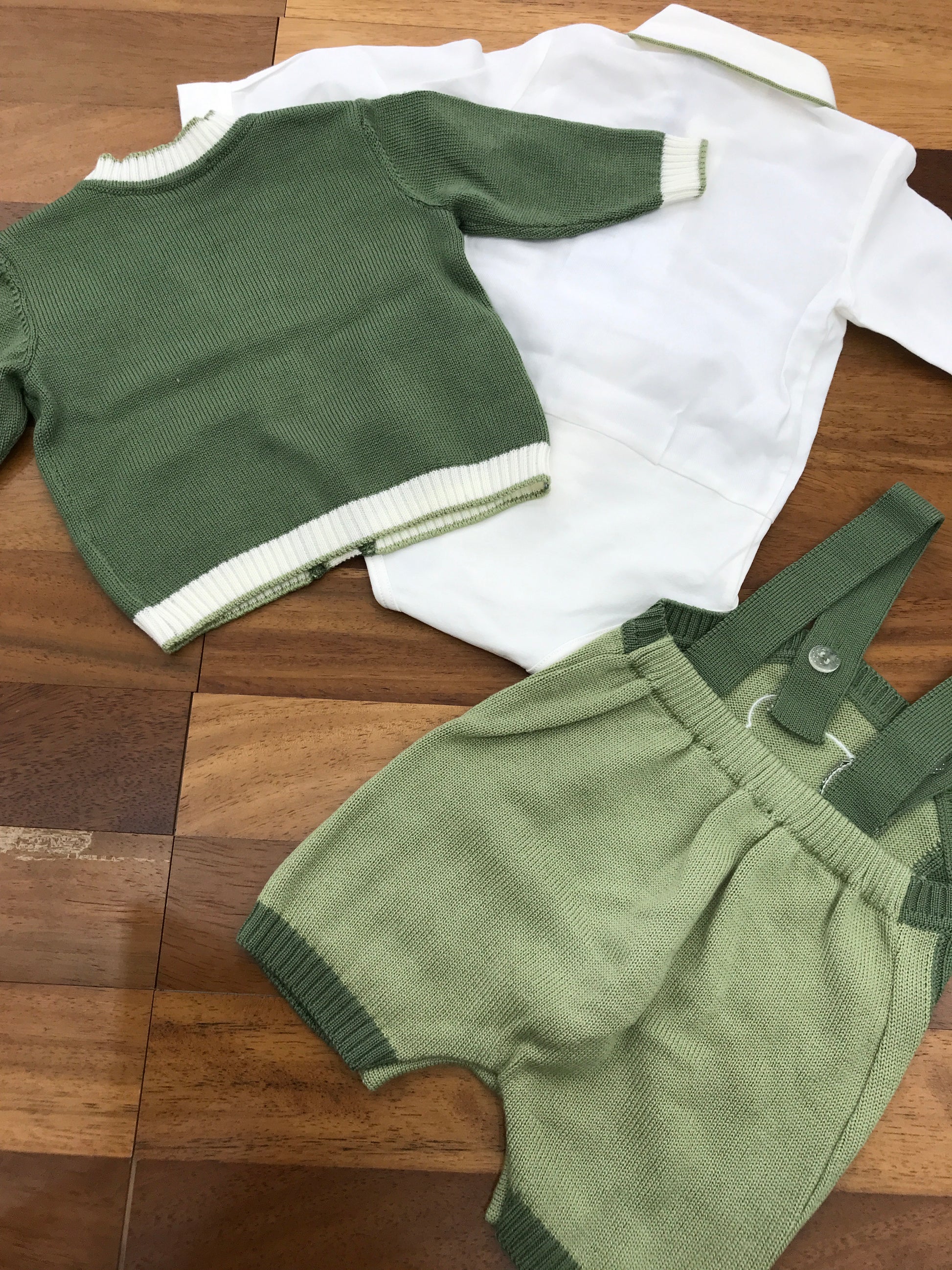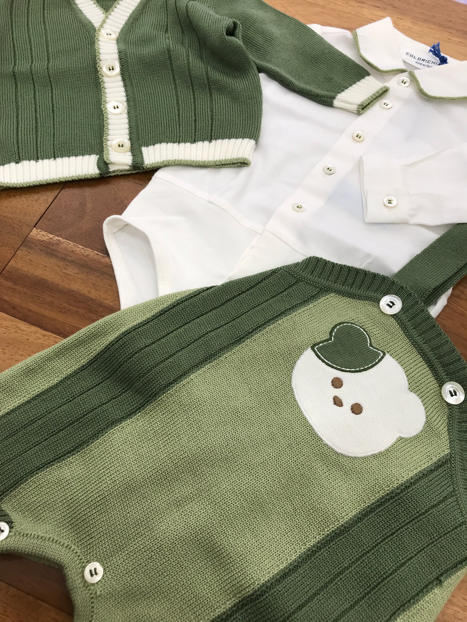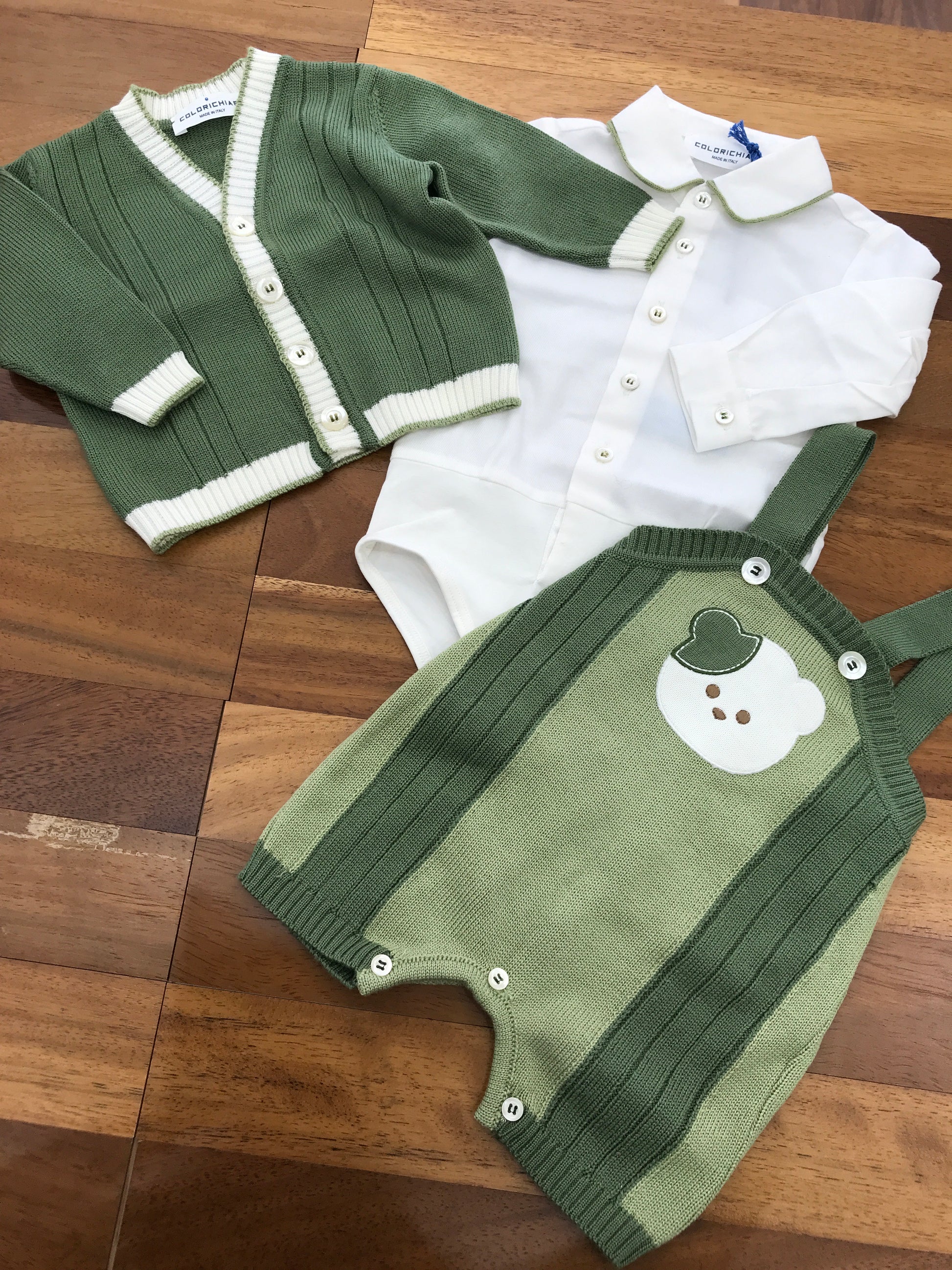 Completo composto da tre pezzi: un body bianco semplice con colletto, una salopette decorata con un orsetto sul davanti in due tonalità di verde, e un cardigan con bottoncini frontali che riprende le stesse sfumature di verde della salopette.