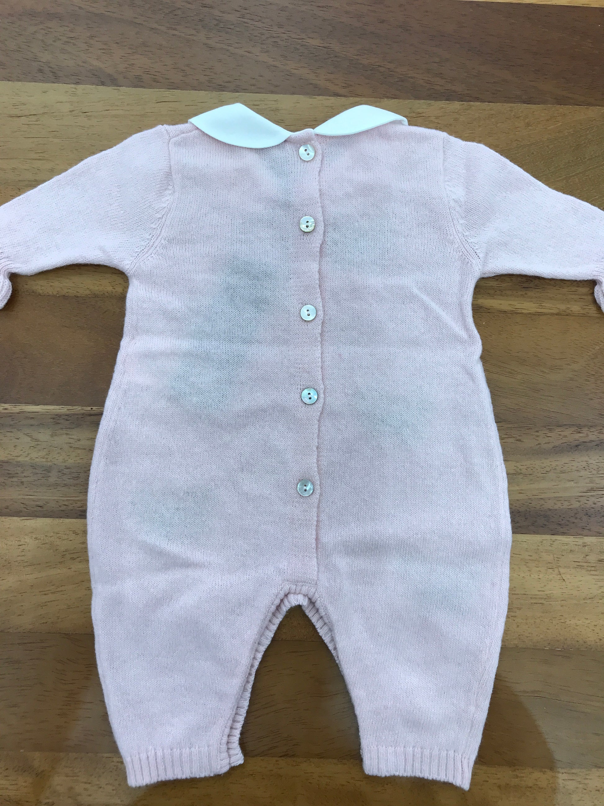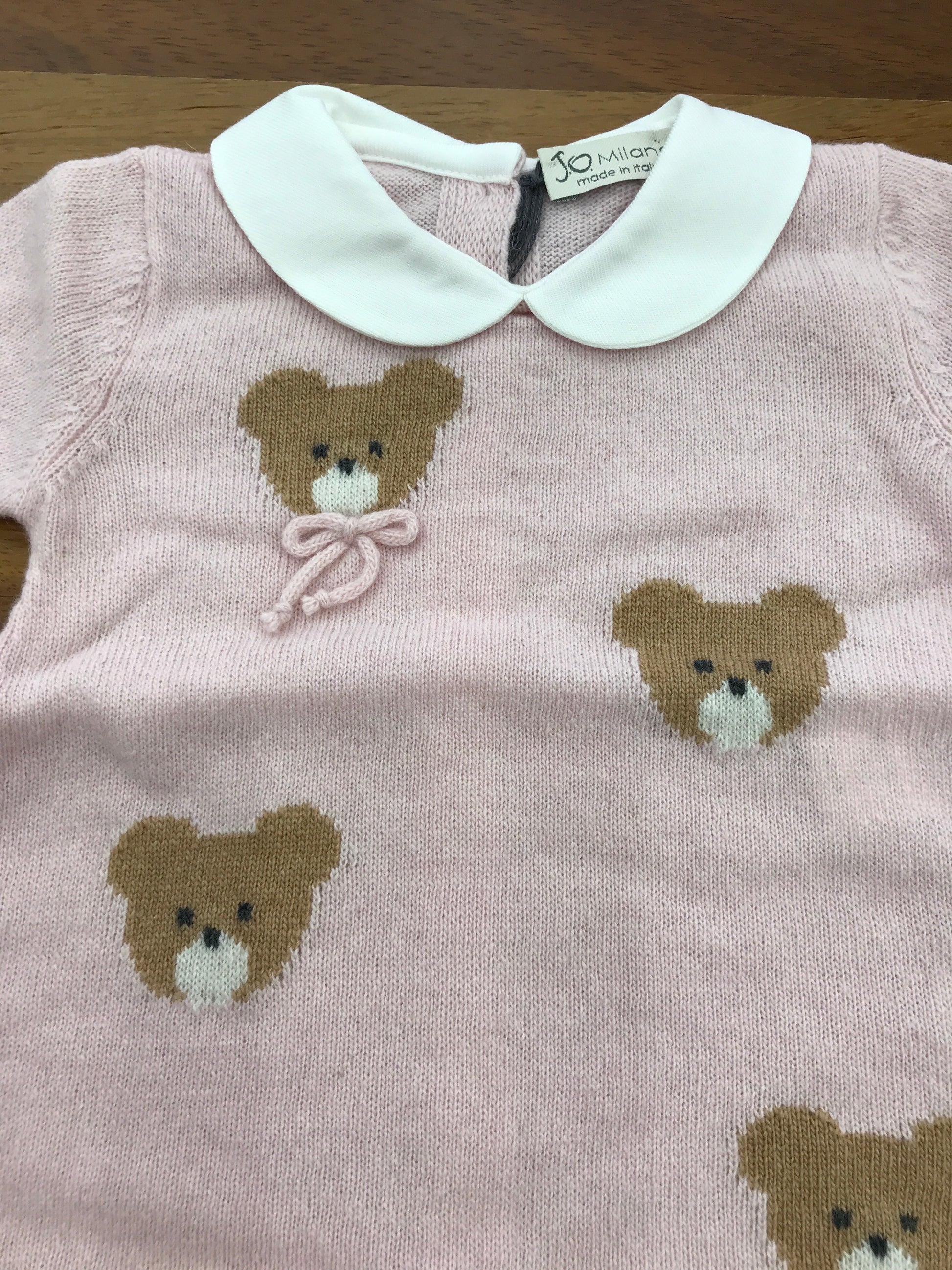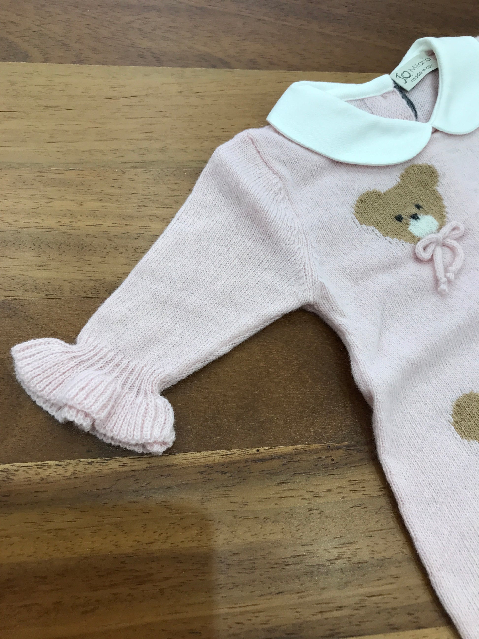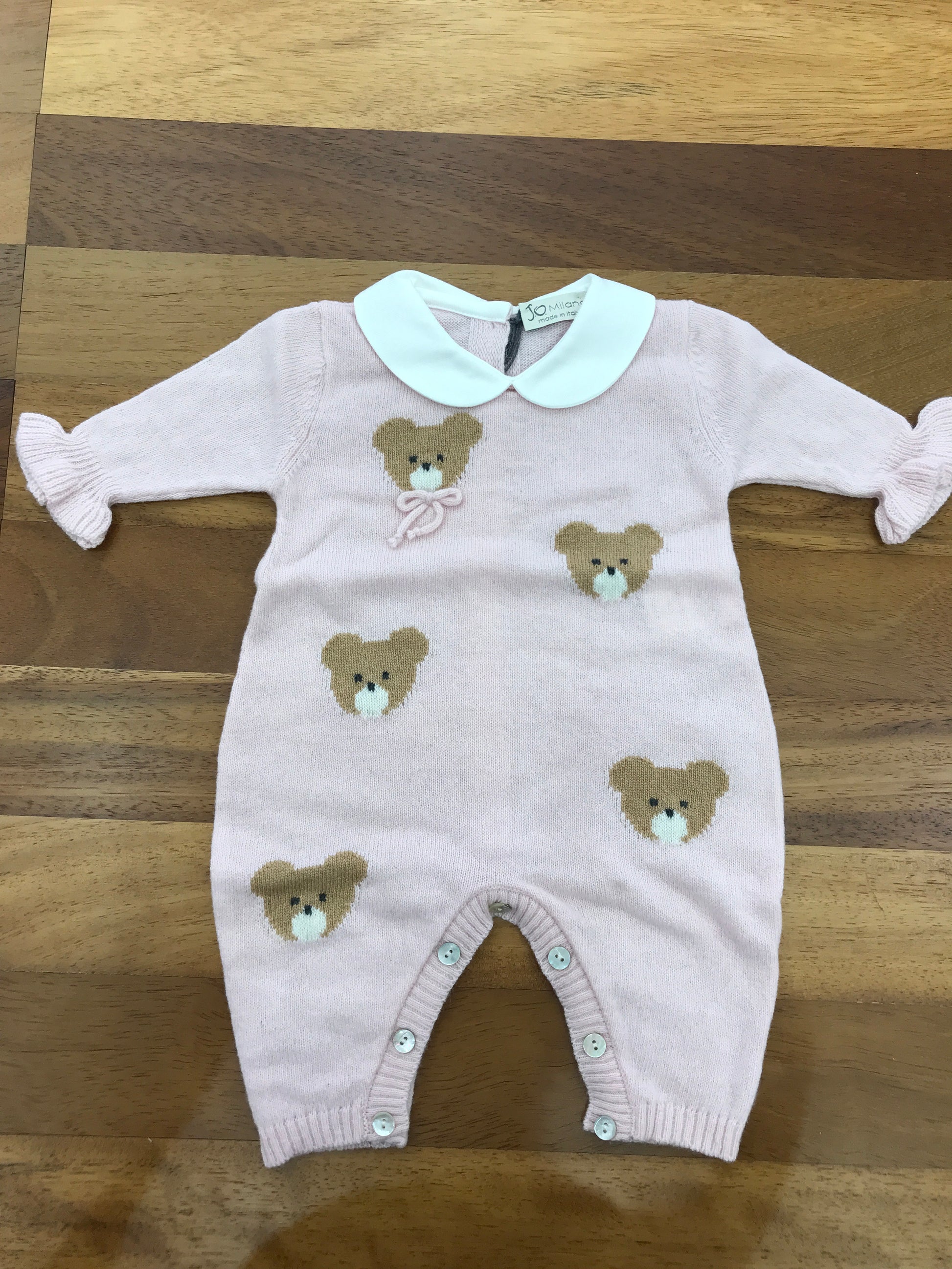 Questa tutina intera senza piedini presenta un collo tondo e sul davanti è decorata con diverse teste di orsetto. Un dettaglio raffinato è la finitura smerlata sulle maniche, che aggiunge un tocco di eleganza al capo.