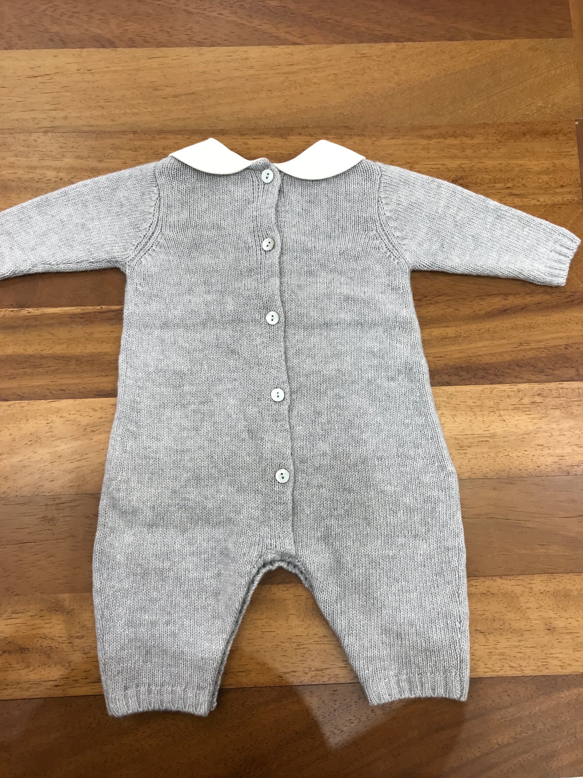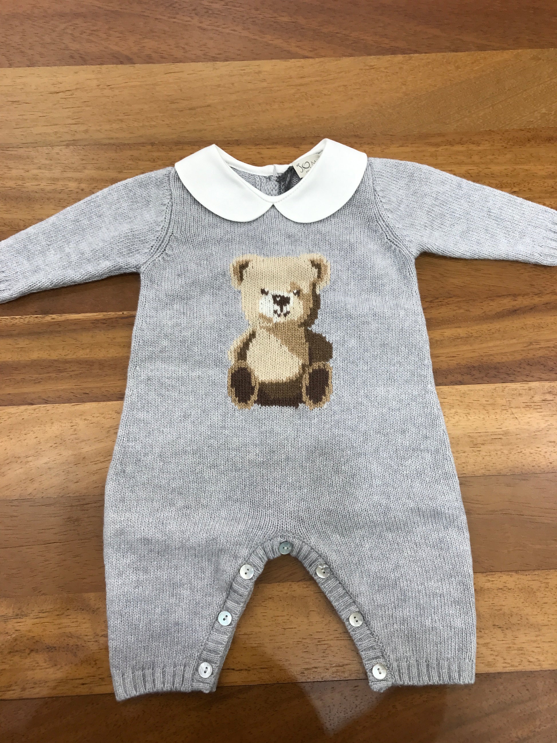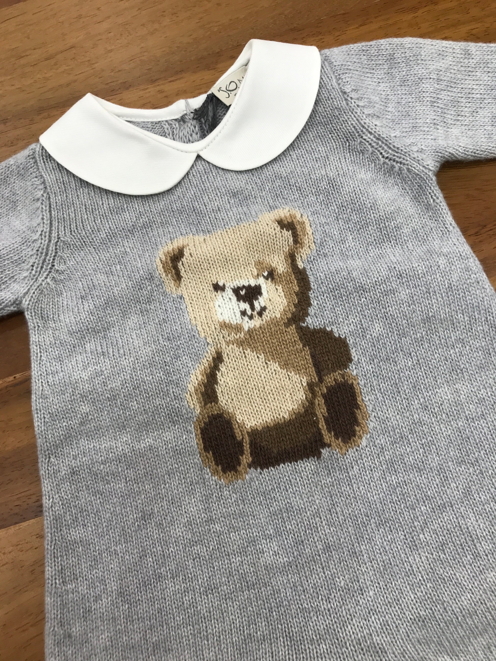 La tutina Jo Milano è realizzata interamente in lana, presenta un colletto elegante ed è priva di piedini. Sul davanti è decorata con un delicato orsacchiotto ricamato, che aggiunge un tocco di dolcezza al capo.