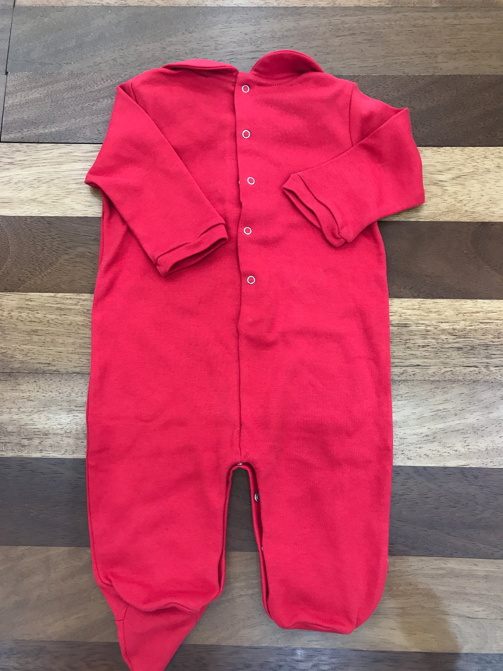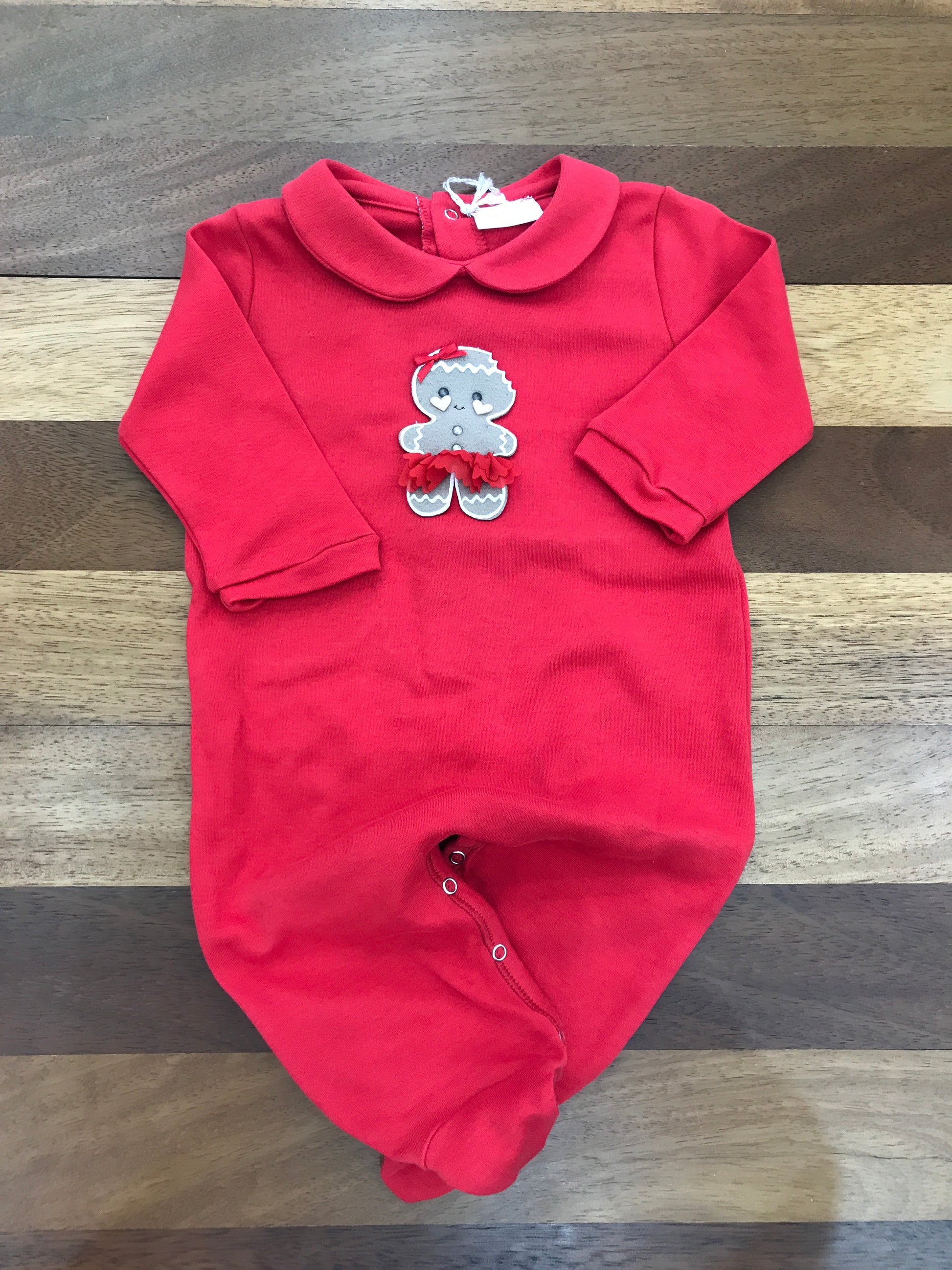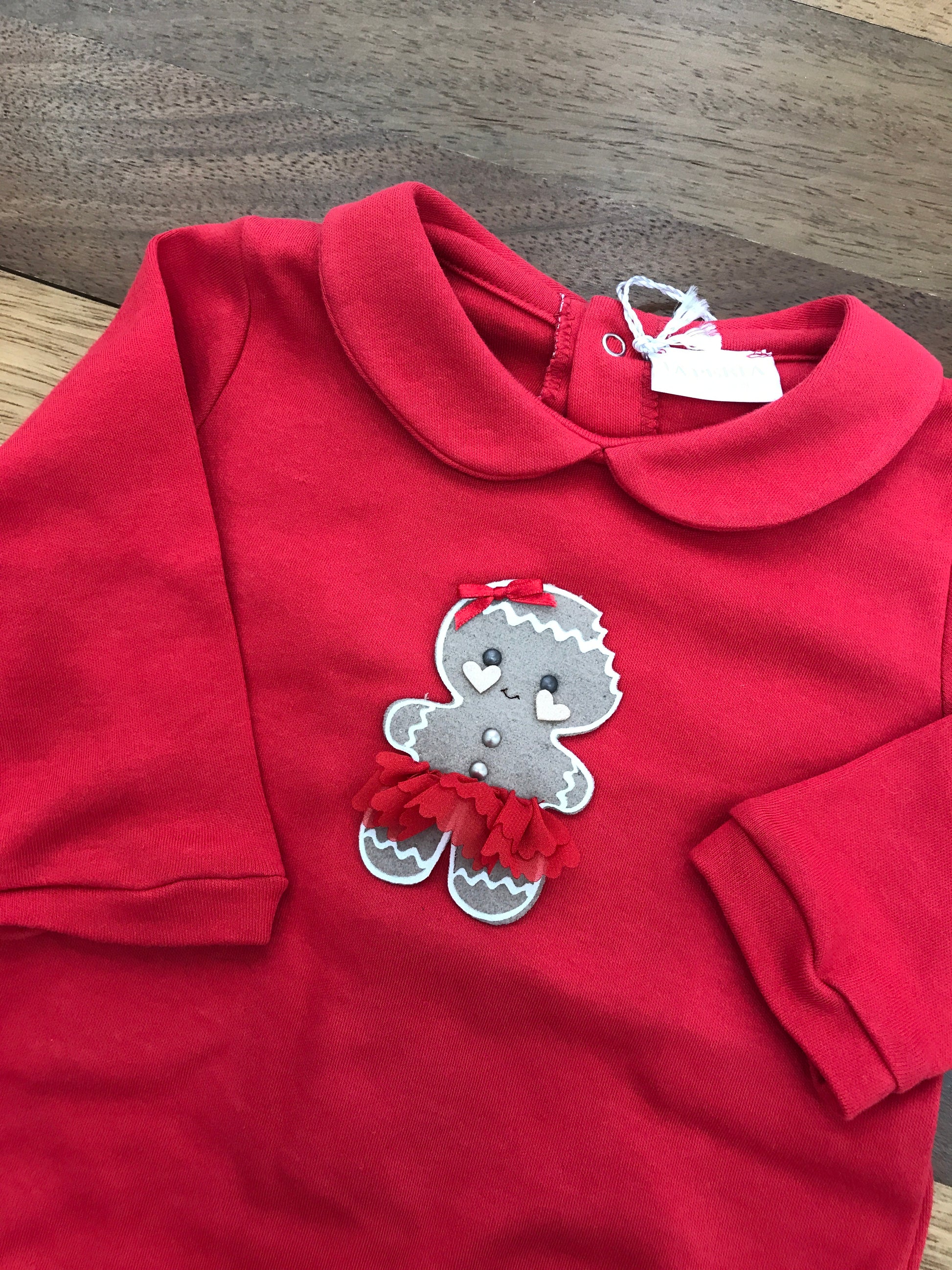 Indumento intero realizzato in cotone caldo e avvolgente, caratterizzato da colletto strutturato e piedini integrati. La chiusura posteriore garantisce praticità nel cambio, mentre il dettaglio decorativo frontale presenta un simpatico orsetto di pan di zenzero abbellito da una piccola gonna. Un capo pensato per il comfort e lo stile durante i mesi più freddi.