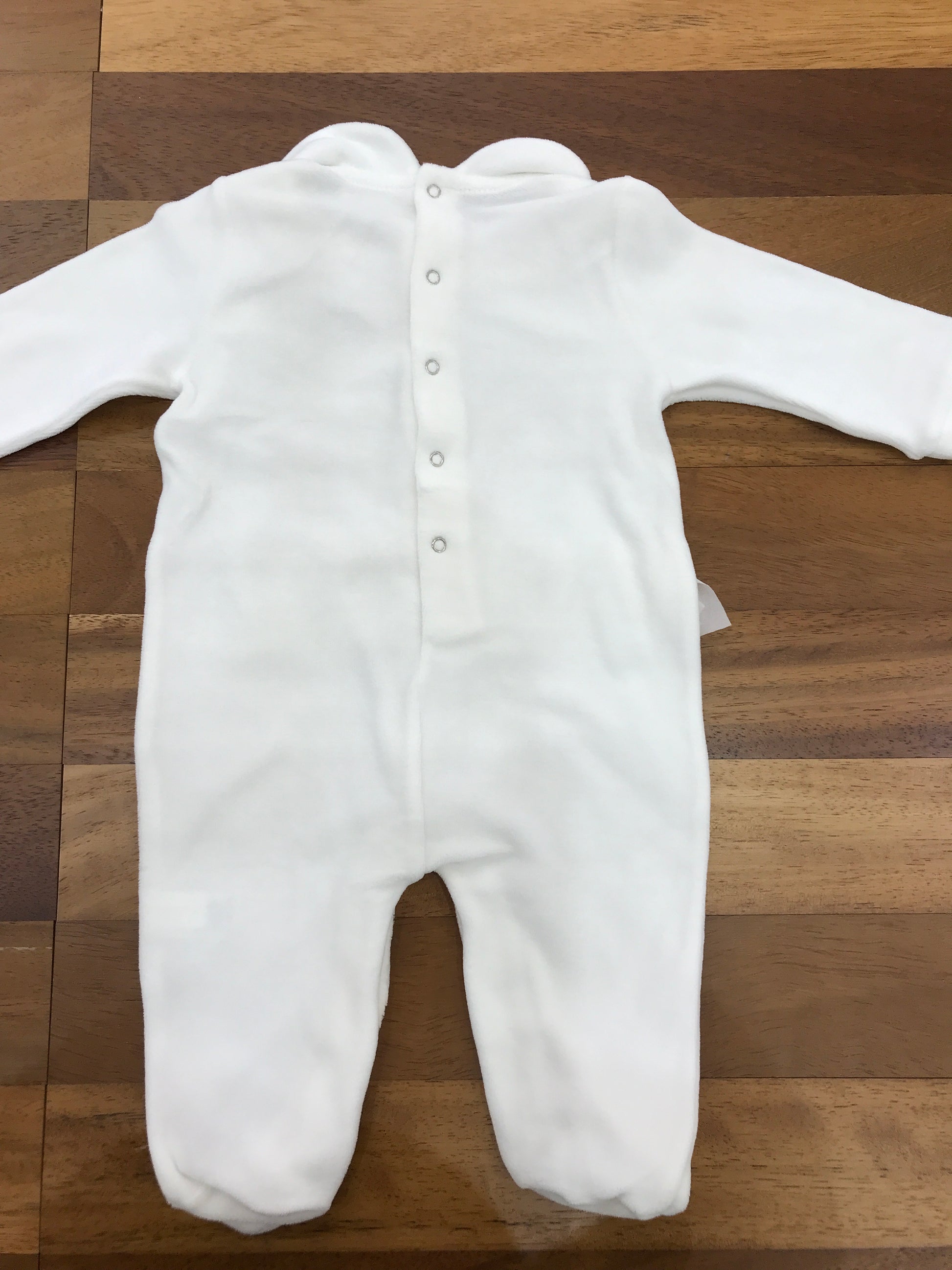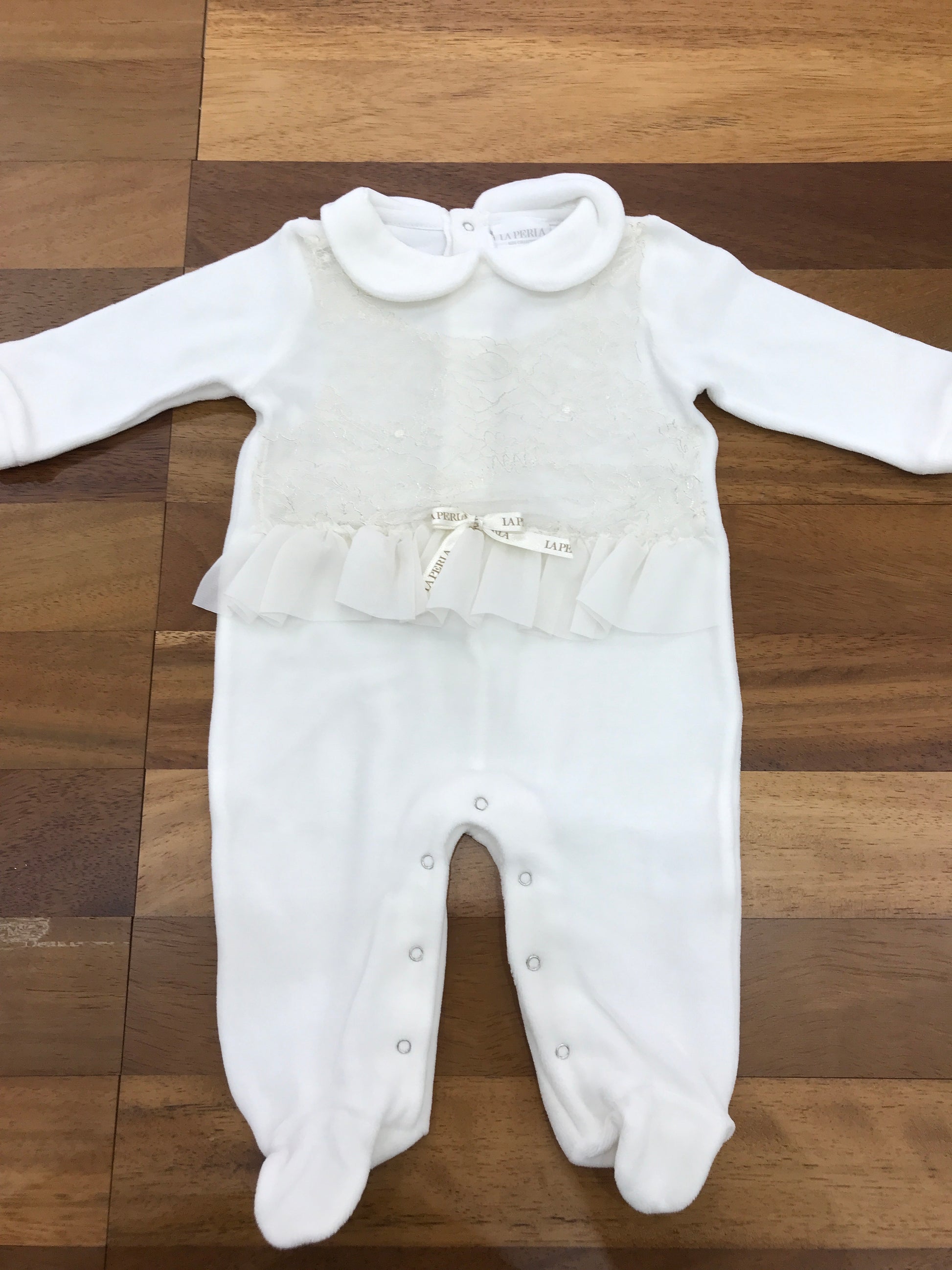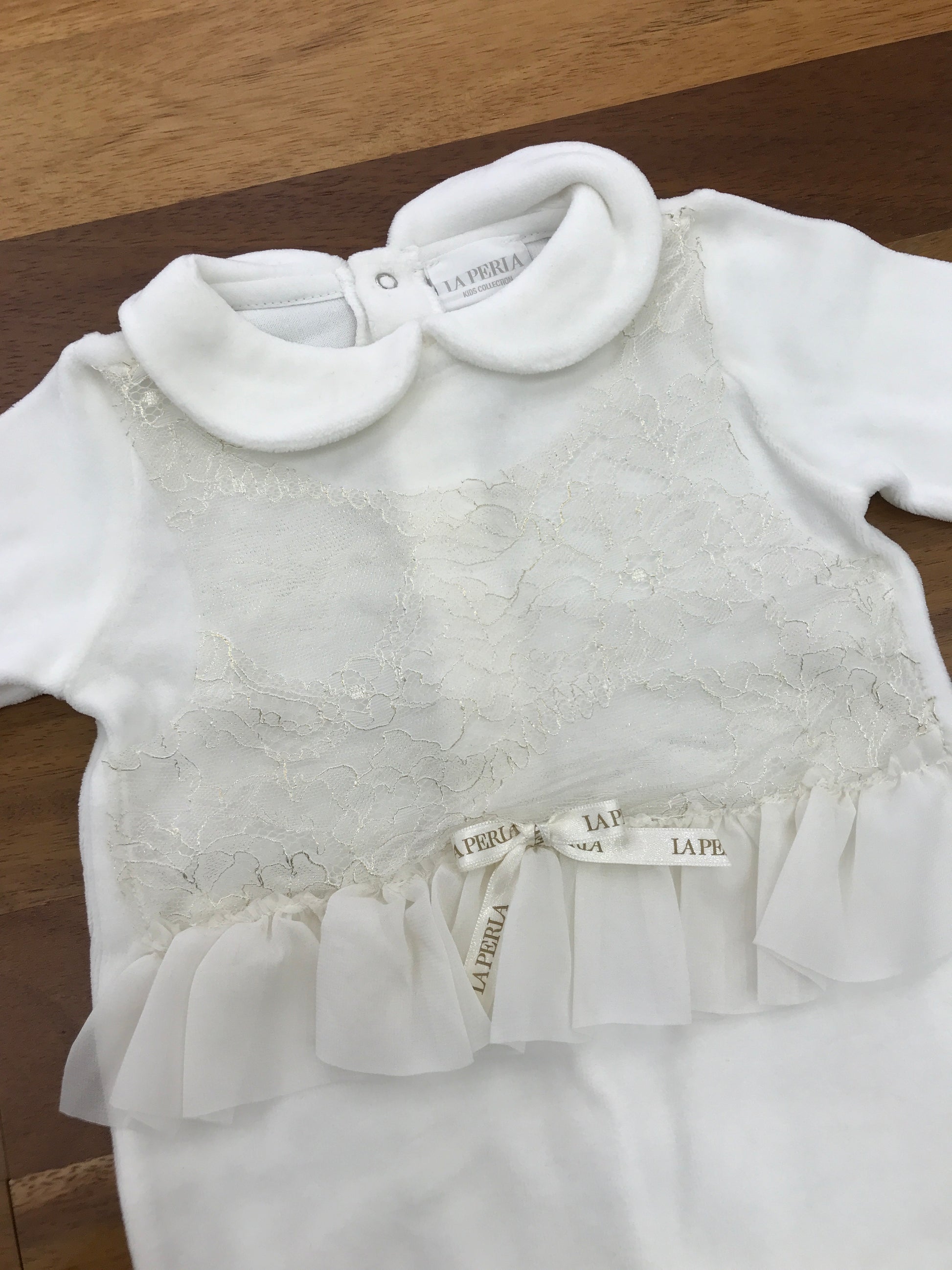 Questa tutina intera in ciniglia è dotata di piedini integrati e un elegante colletto, garantendo comfort e stile. La chiusura frontale con bottoncini facilita la vestizione. Sul davanti, un delicato velo ricamato con intricati ghirigori aggiunge un tocco raffinato, mentre un morbido volant nella parte inferiore completa il design con un dettaglio femminile e sofisticato.