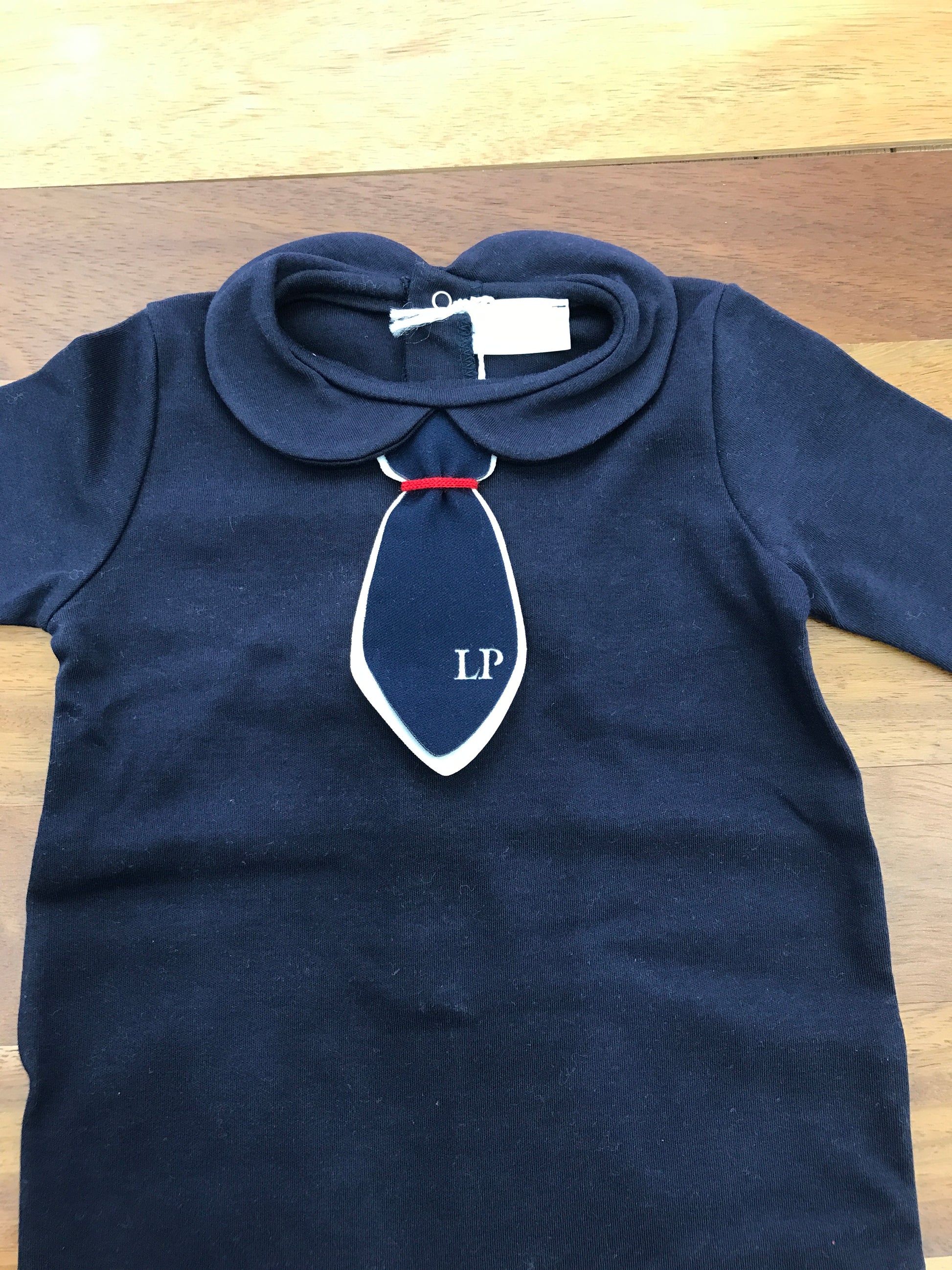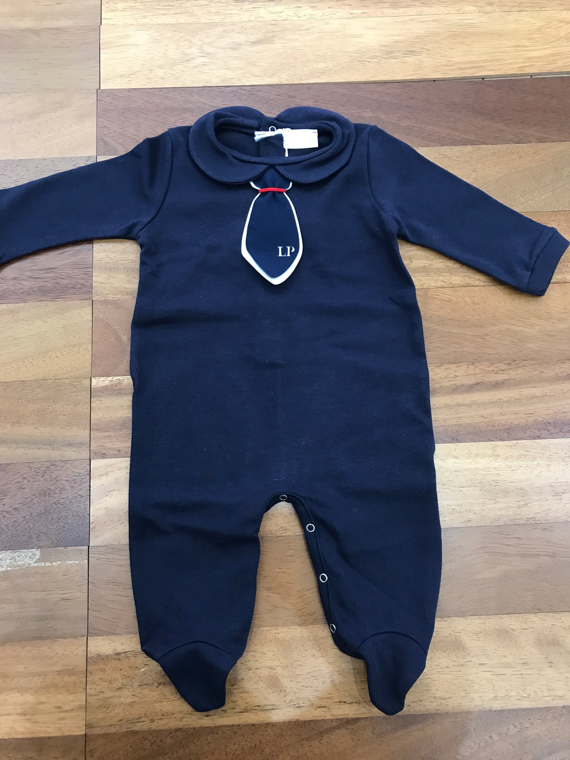 Questa tutina completa in cotone caldo è dotata di piedini coprenti e un colletto elegante. Sul davanti presenta una decorazione che richiama lo stile di una cravatta, un dettaglio raffinato per un capo confortevole e pratico.