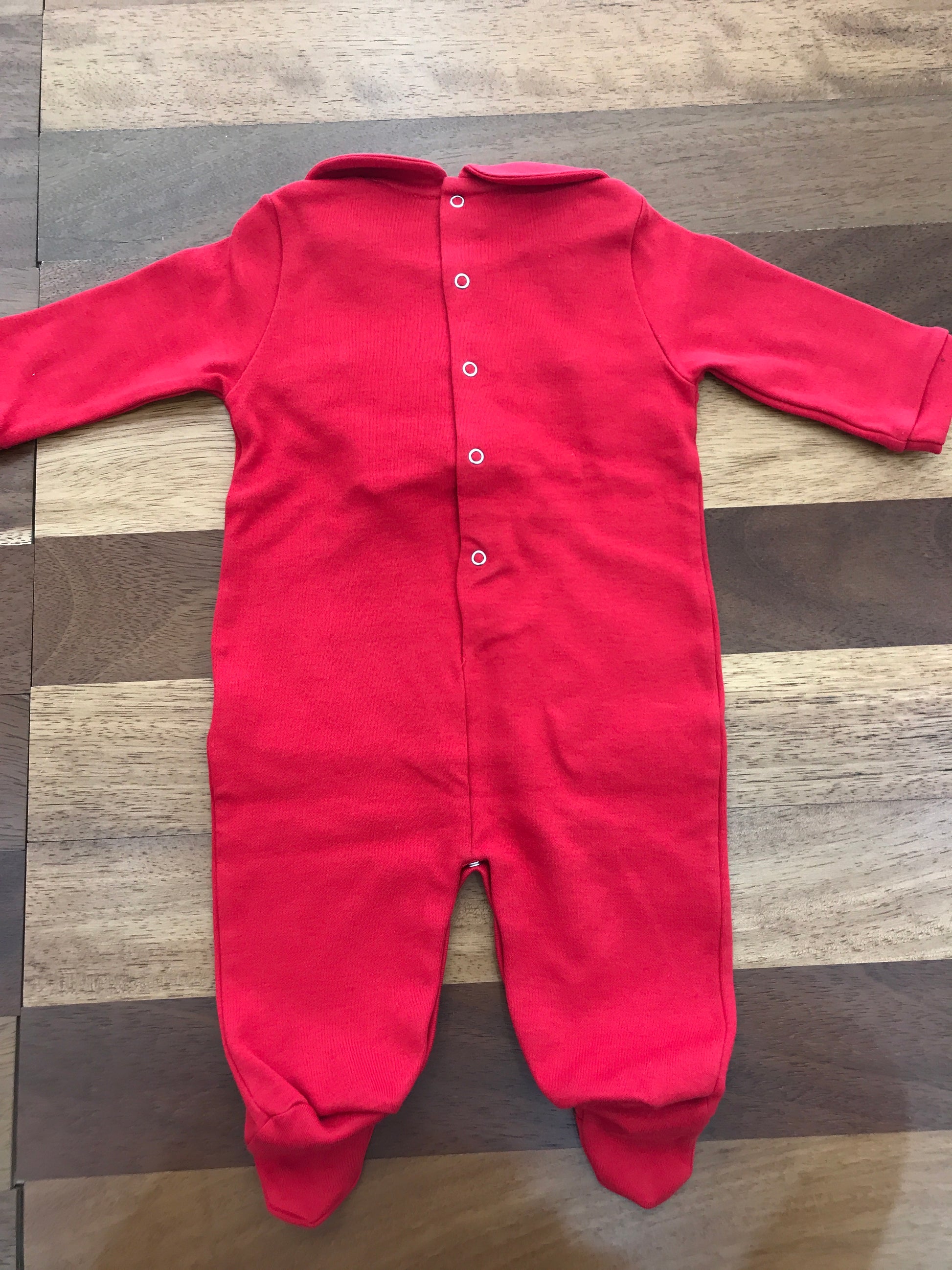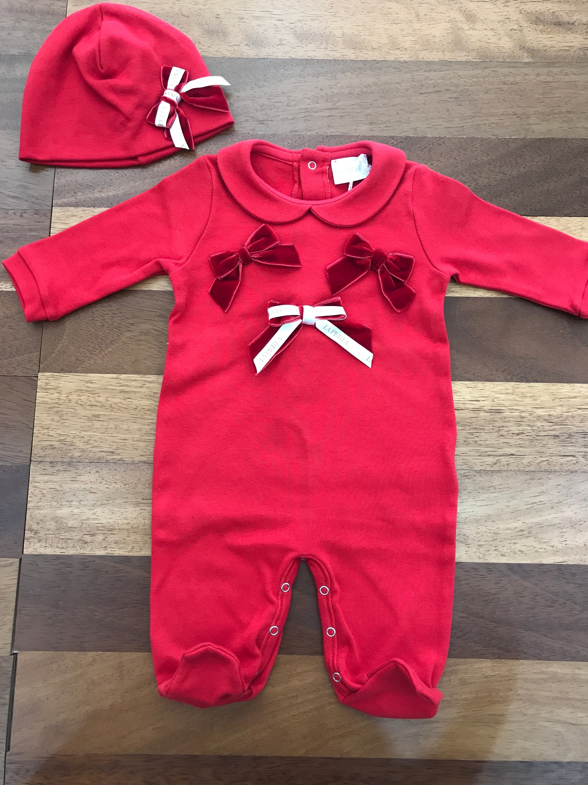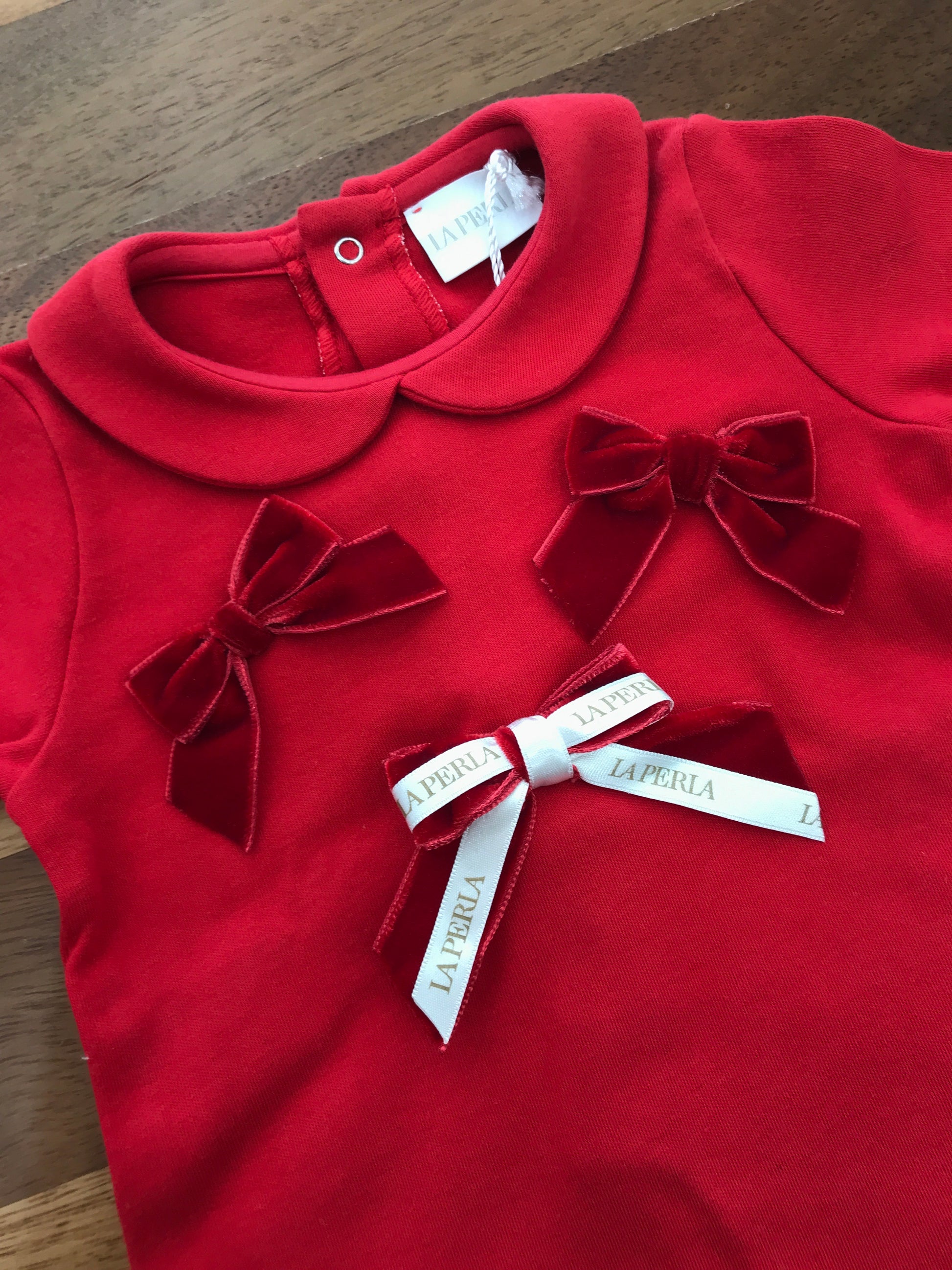 Elegante tutina intera realizzata in cotone caldo, disponibile nella tonalità rosso intenso. Caratterizzata da piedini integrati e colletto strutturato, la capo presenta tre delicati fiocchetti in velluto posizionati al centro del petto. Uno di questi fiocchetti sfoggia un doppio nodo, con il logo del brand ricamato su uno dei due elementi. Un capo raffinato che unisce comfort e dettagli ricercati per i più piccoli.