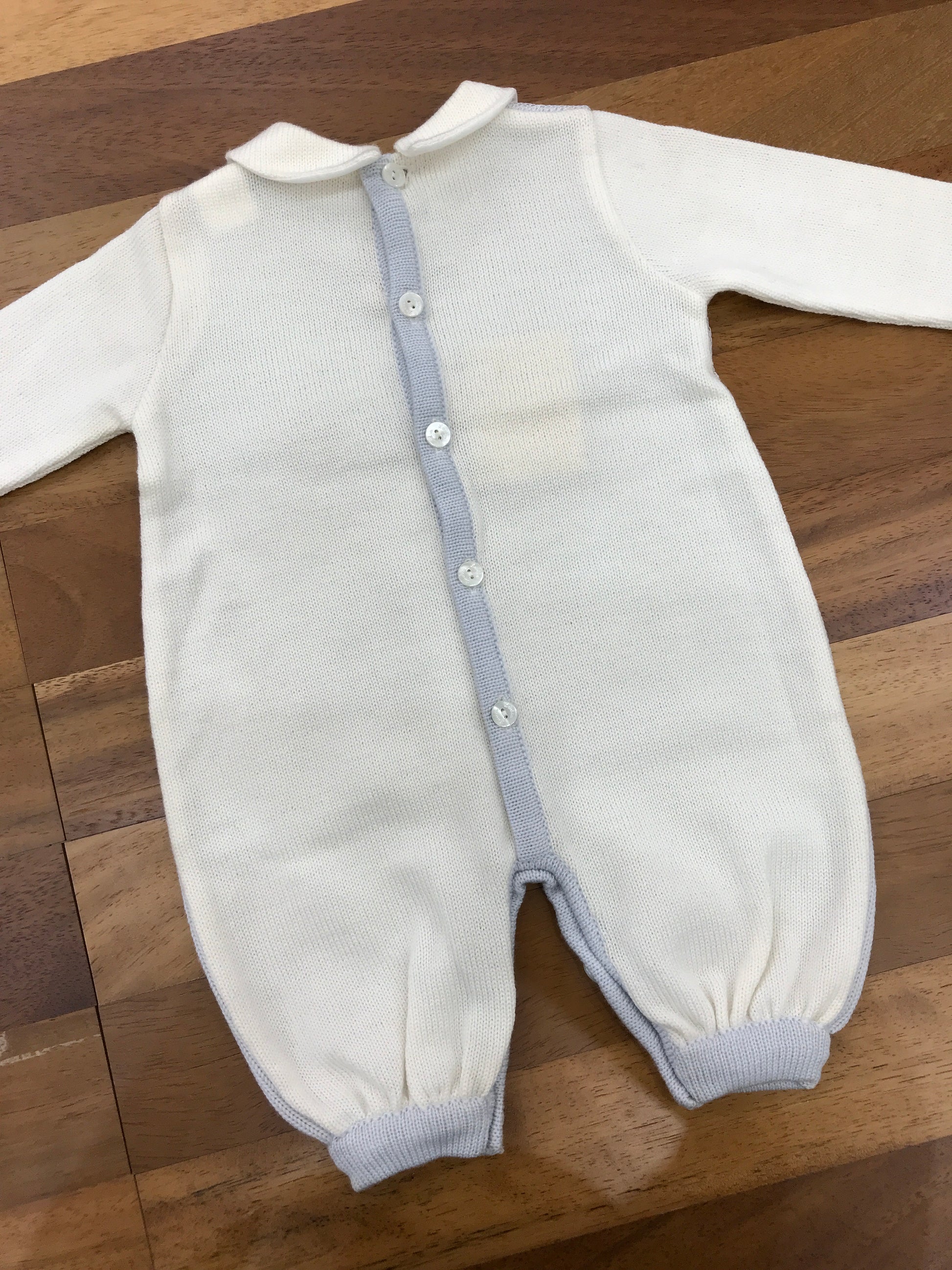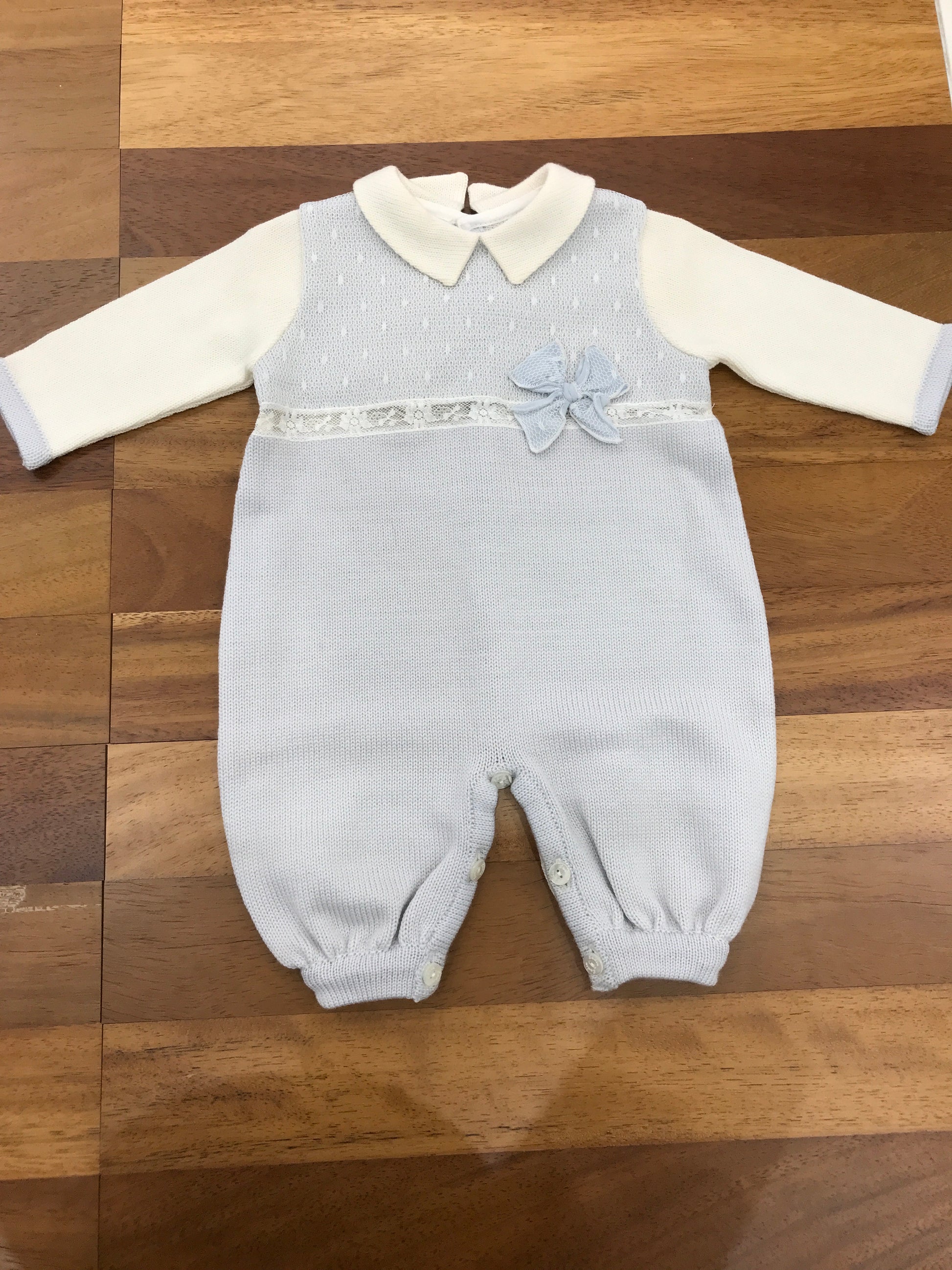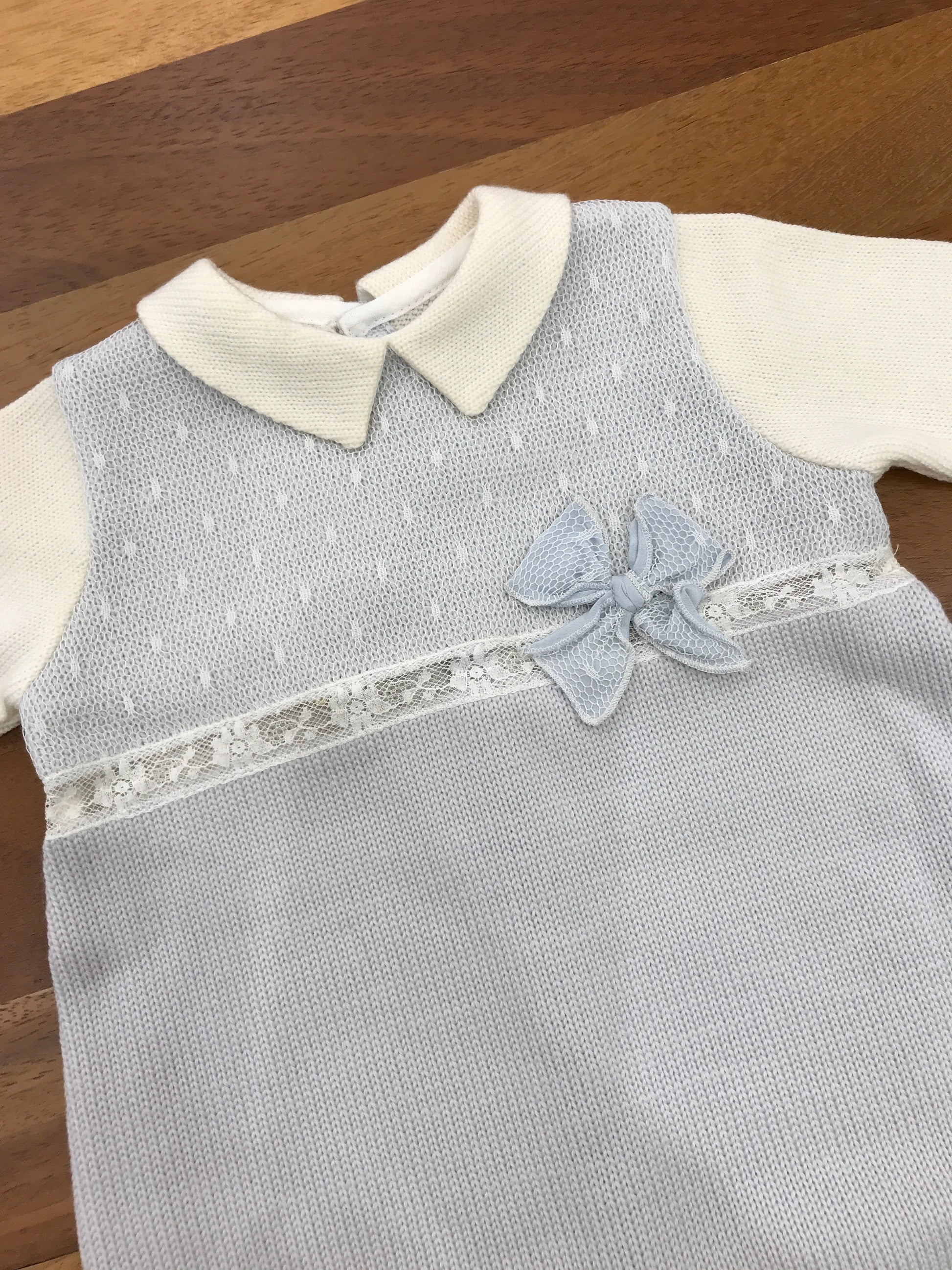 Questa tutina in lana, priva di piedini ma dotata di collo, presenta un inserto centrale in pizzo ricamato e un fiocco decorativo con merletto posizionato sul lato centrale.