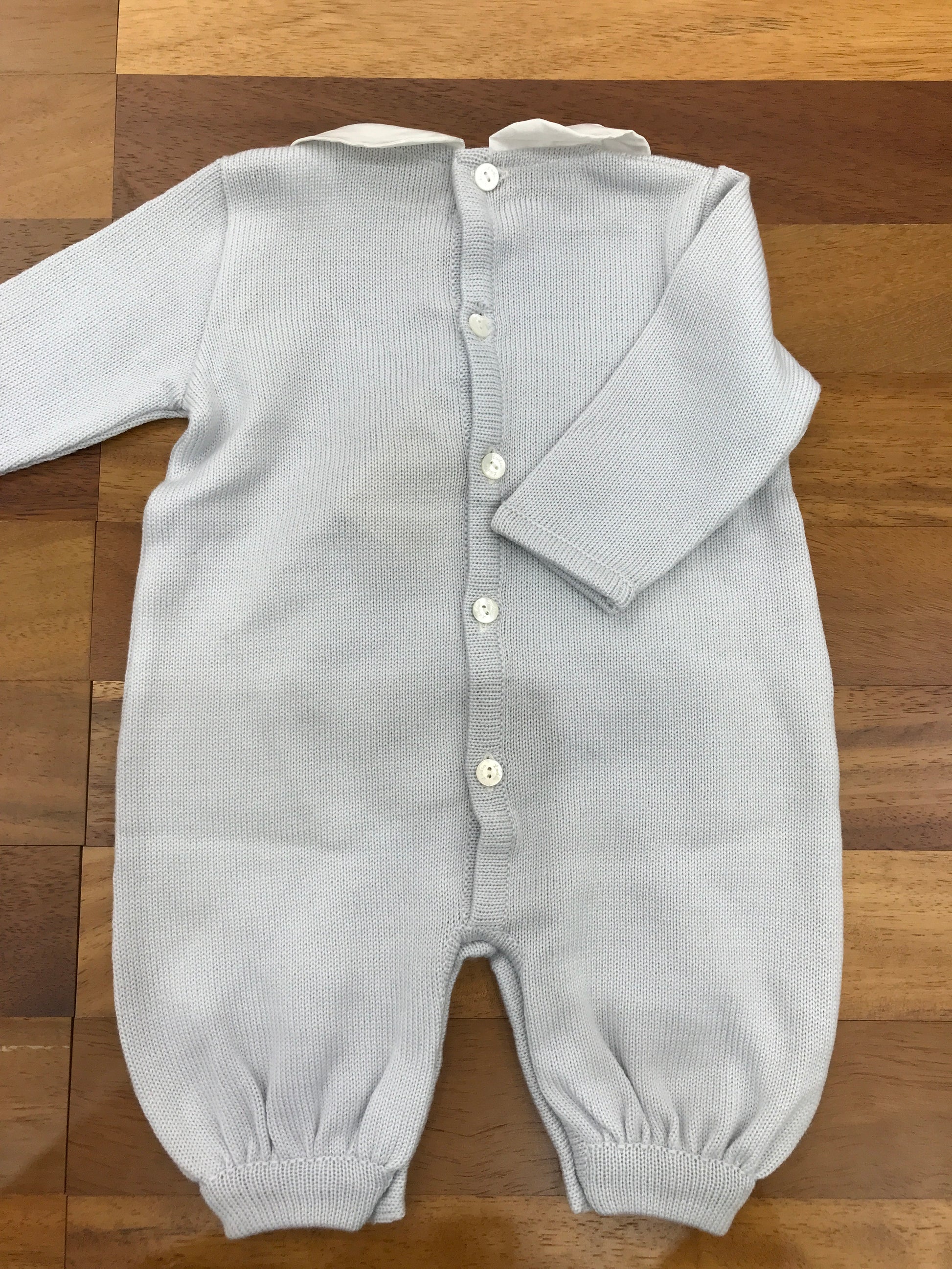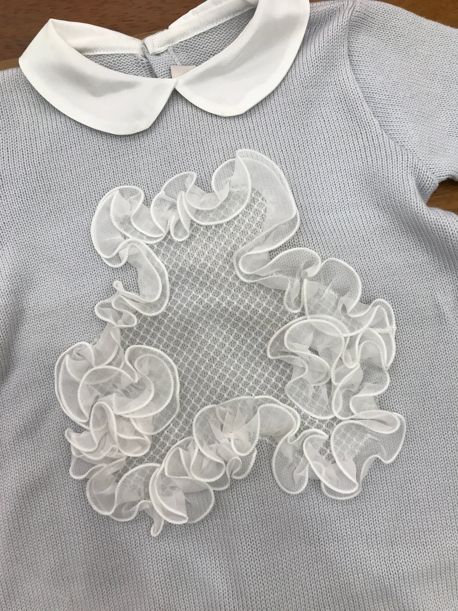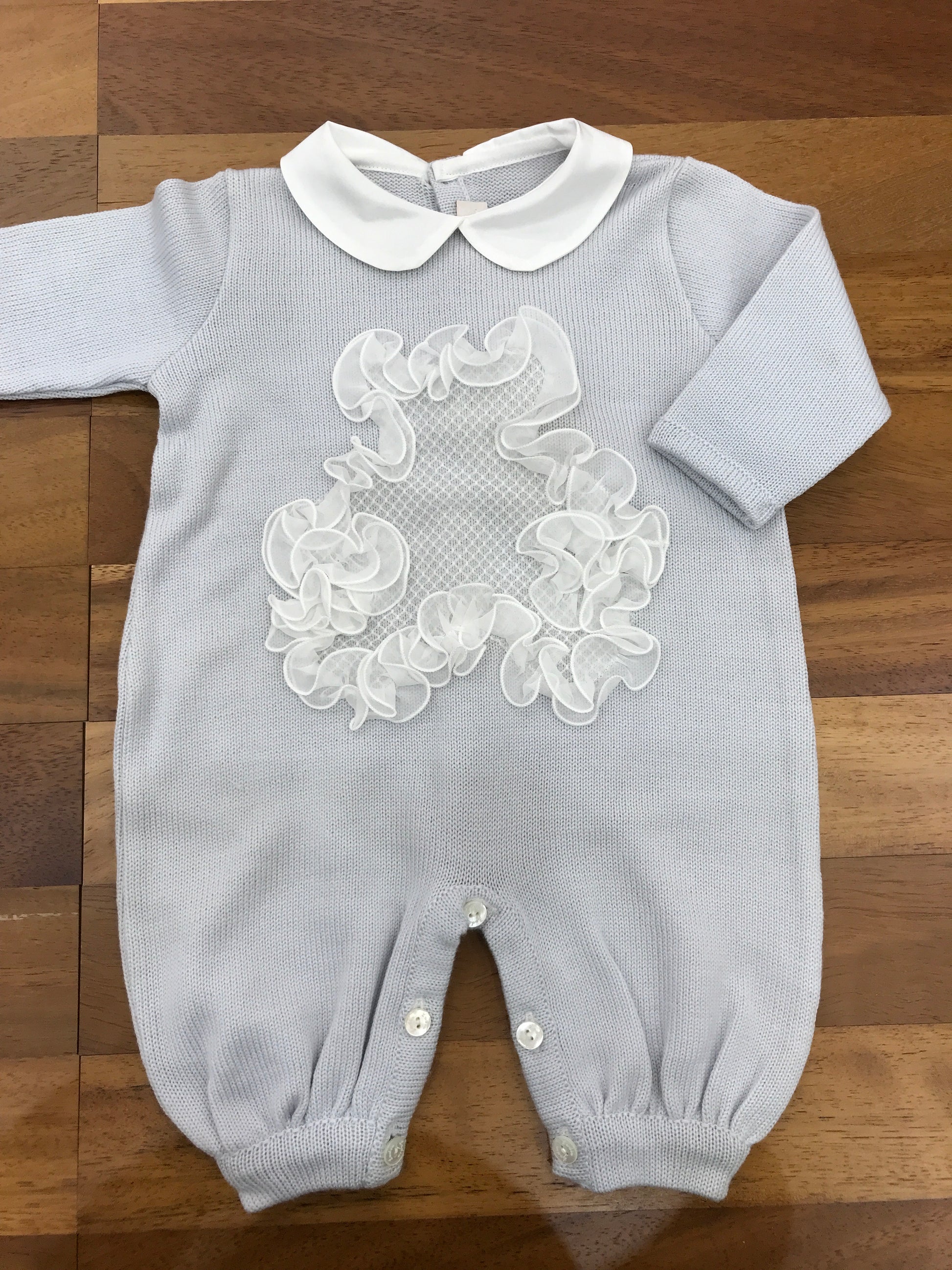 Questa tutina intera in lana, priva di piedini ma dotata di collo, presenta un ricamo a forma di orsetto accompagnato da eleganti ruches.