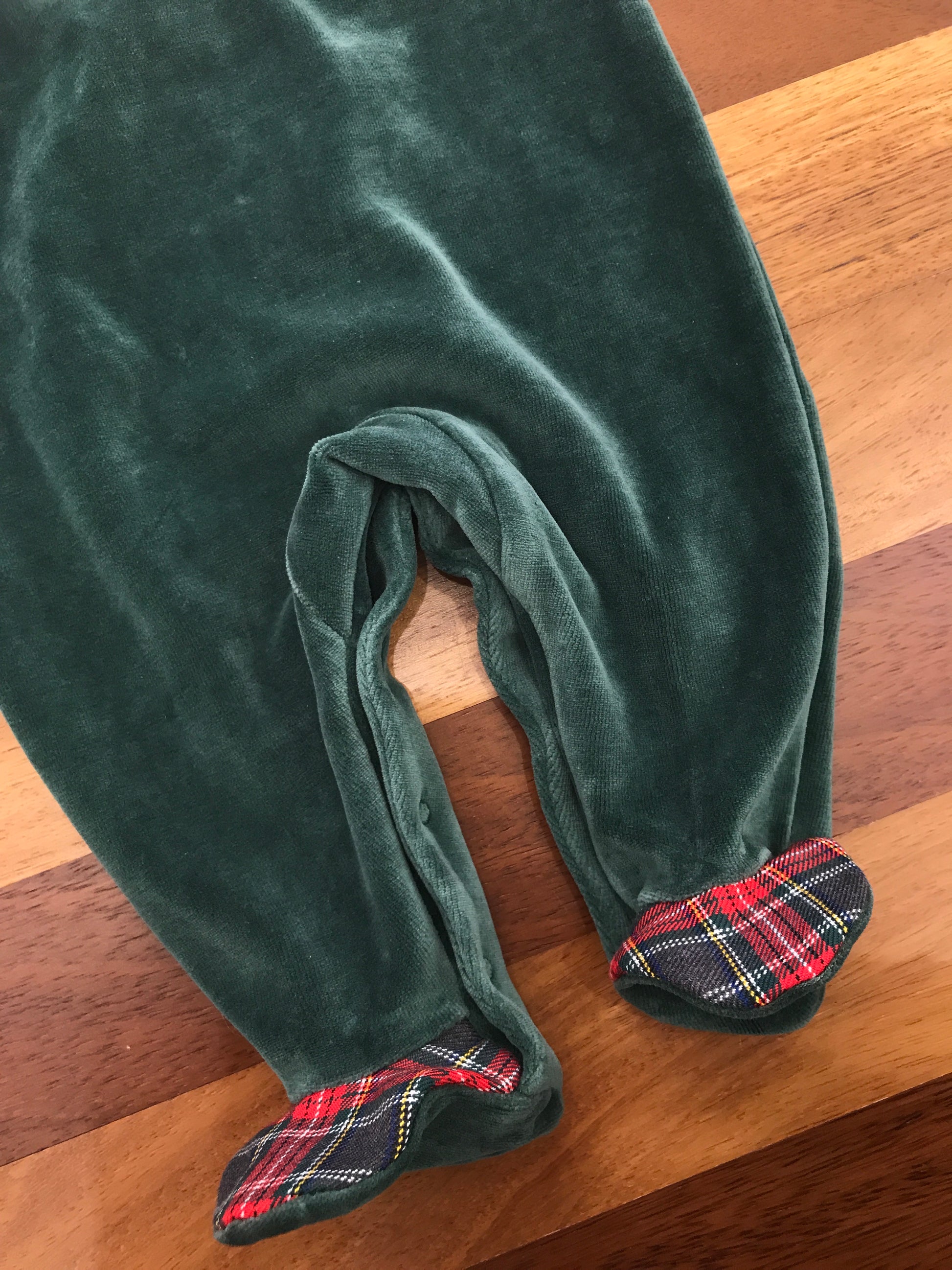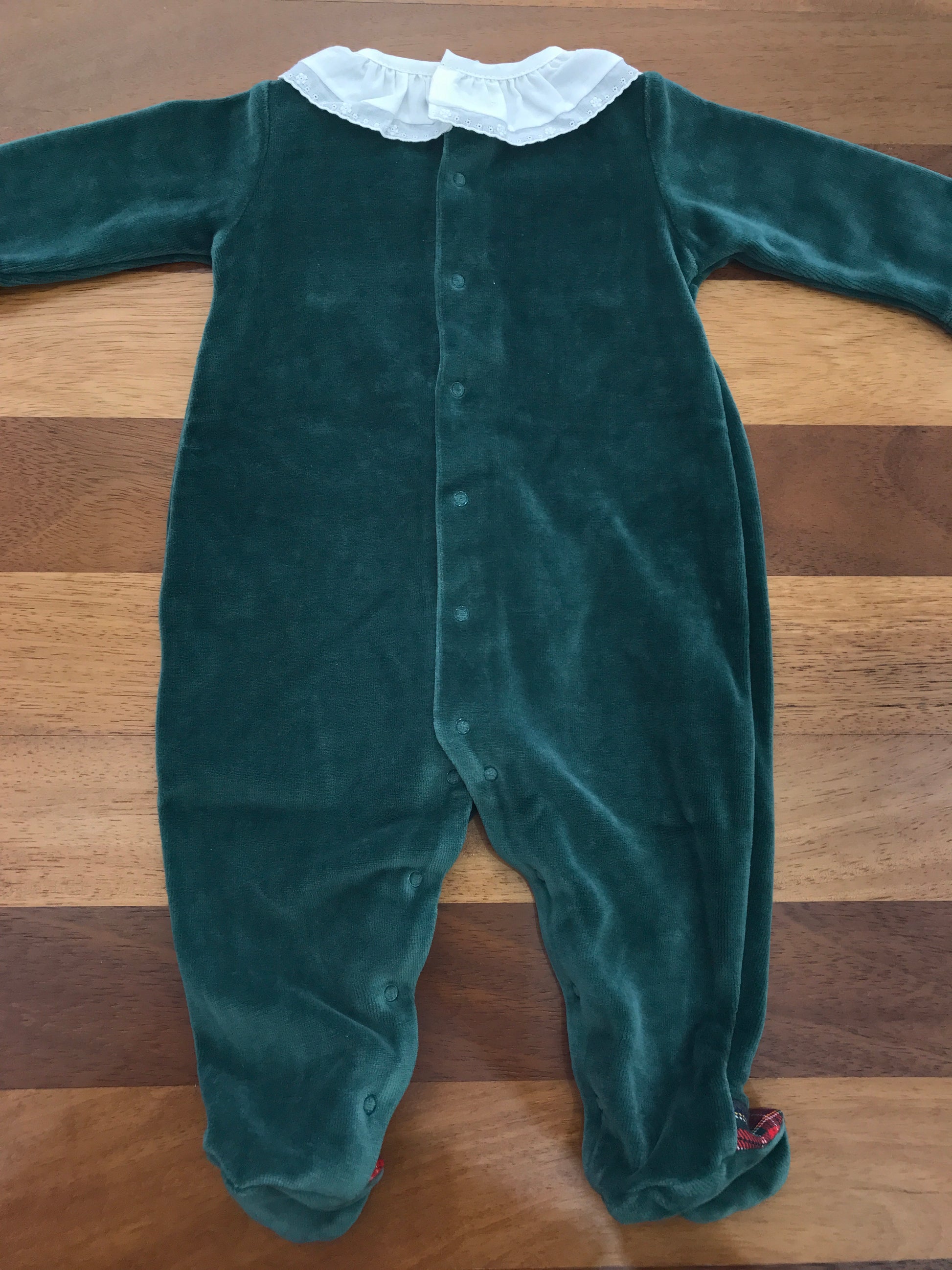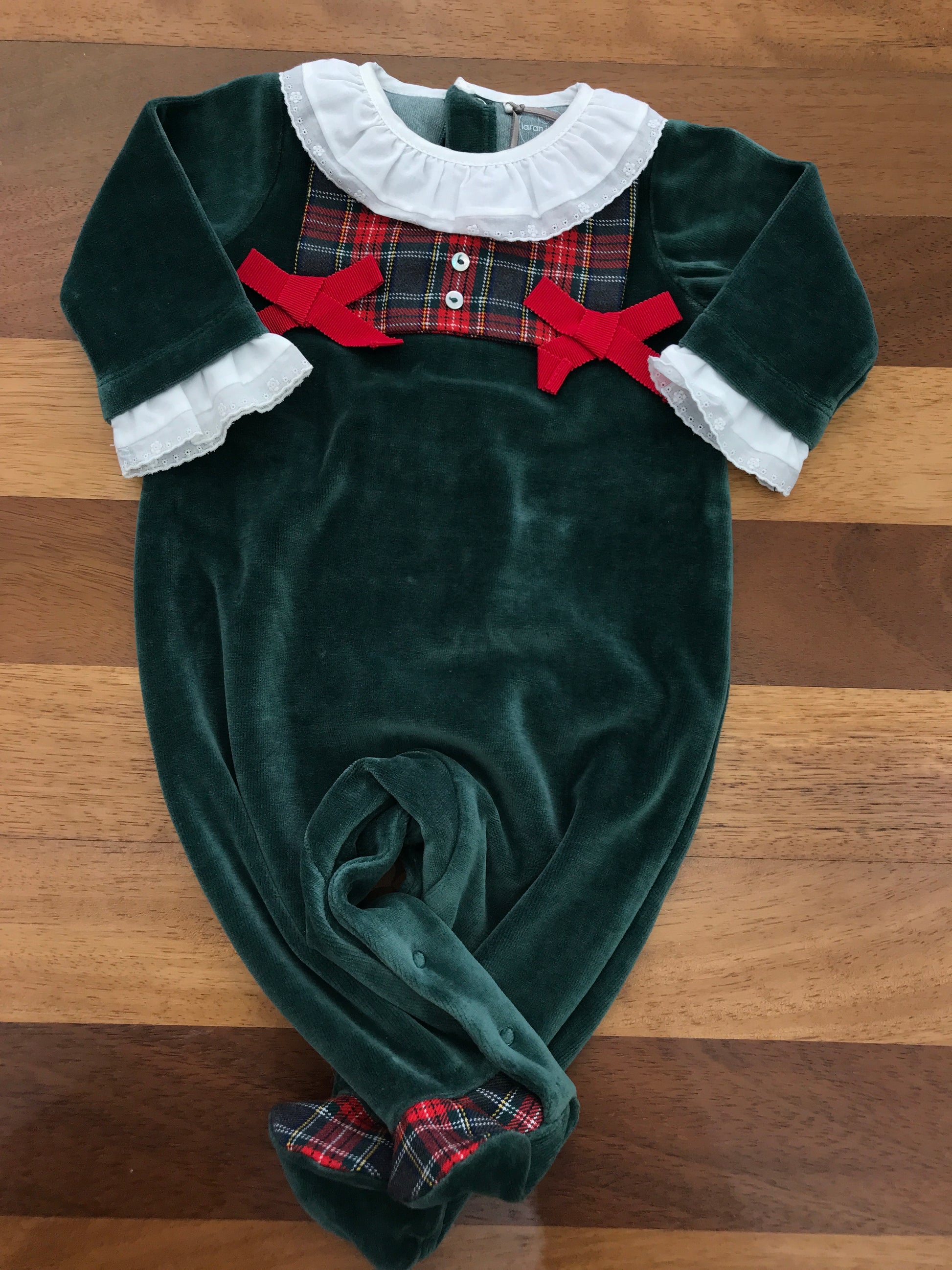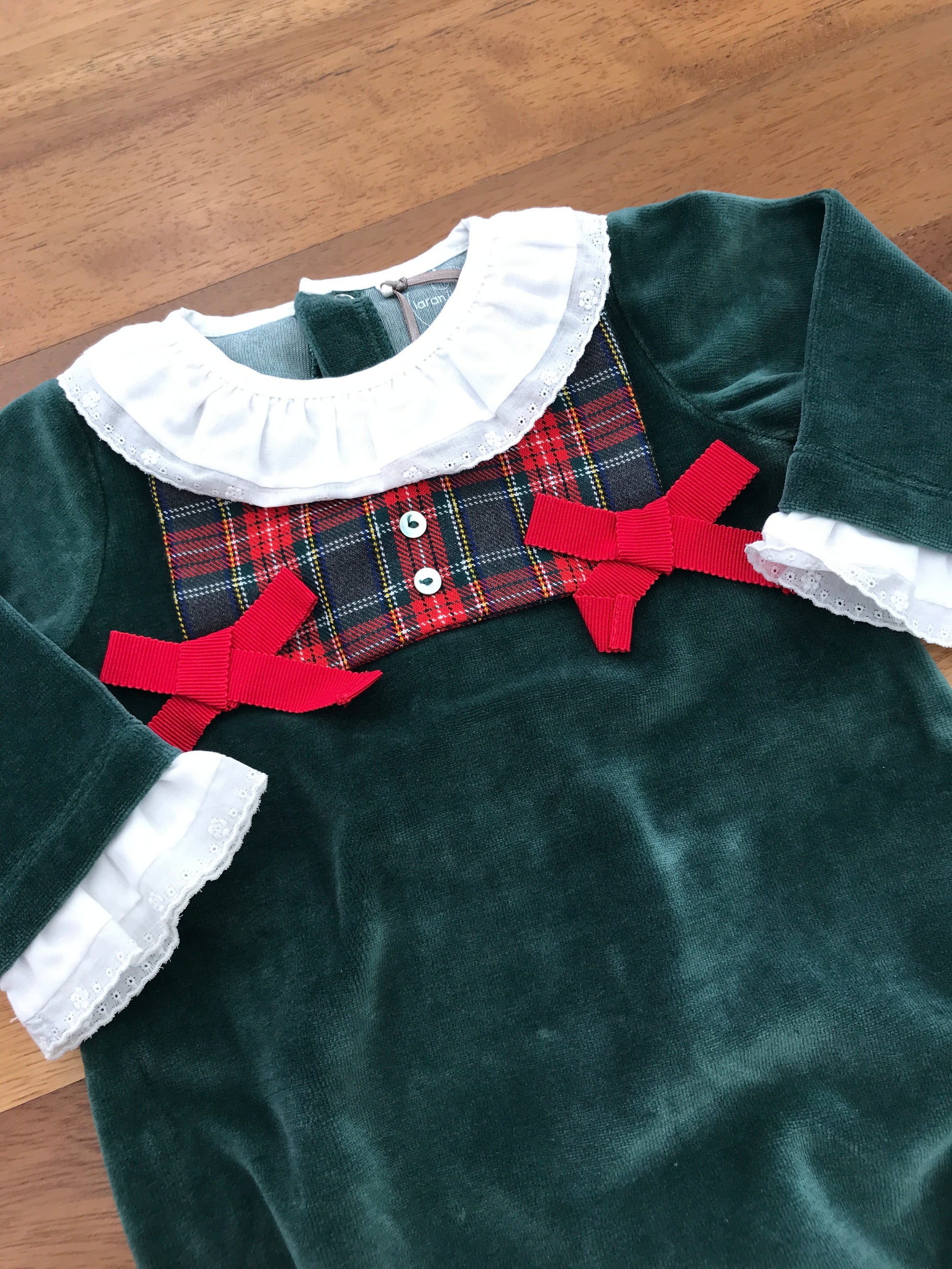 Elegante tutina intera realizzata in morbida ciniglia verde scuro, arricchita da dettagli scozzesi sui piedini. Caratterizzata da un raffinato colletto bianco con volant e arricciature che si ripetono alle maniche, completata da un finto bavettone a quadri scozzesi ornato da delicati fiocchetti. Un capo sofisticato che unisce comfort e stile classico per le piccole.