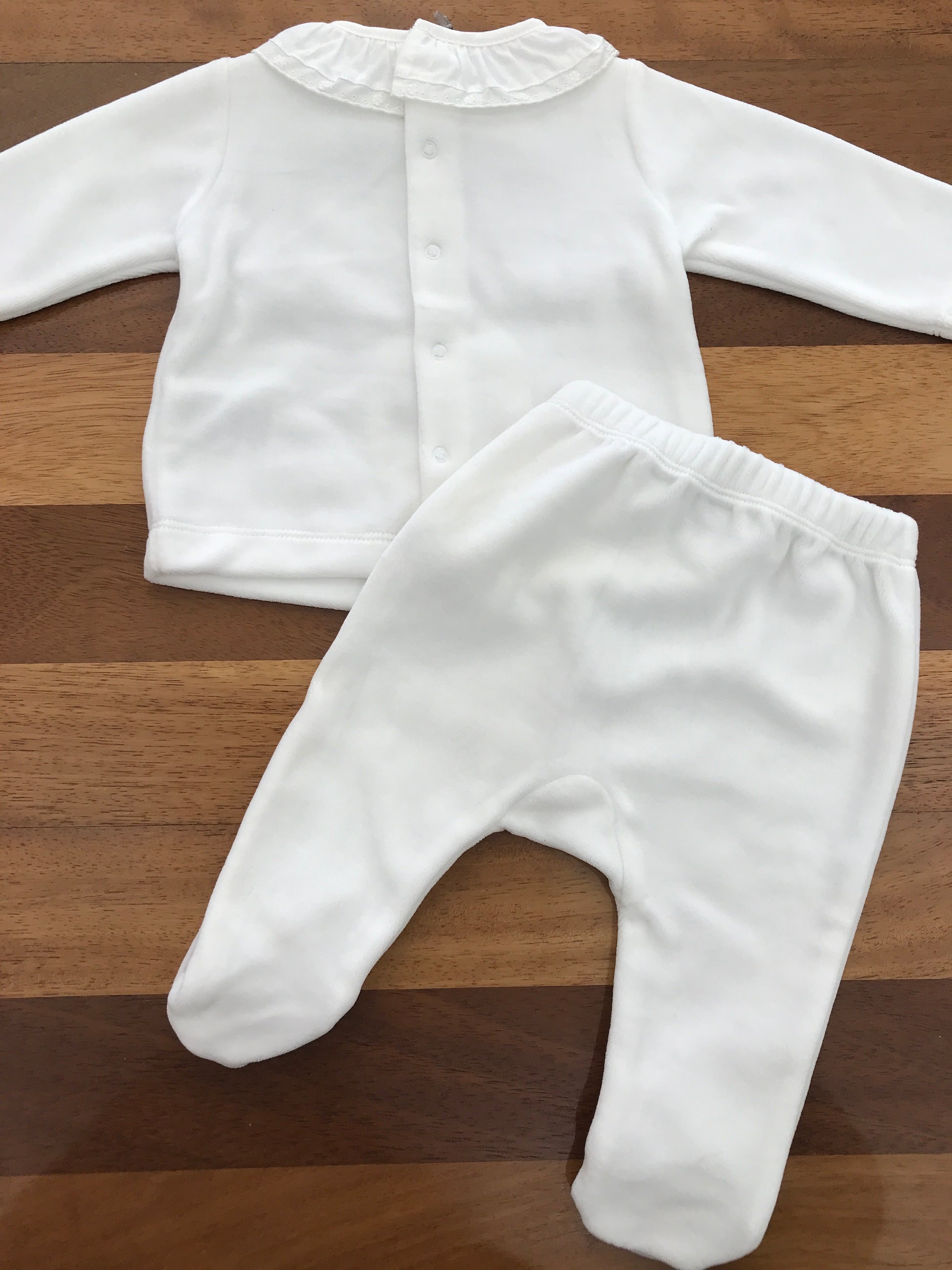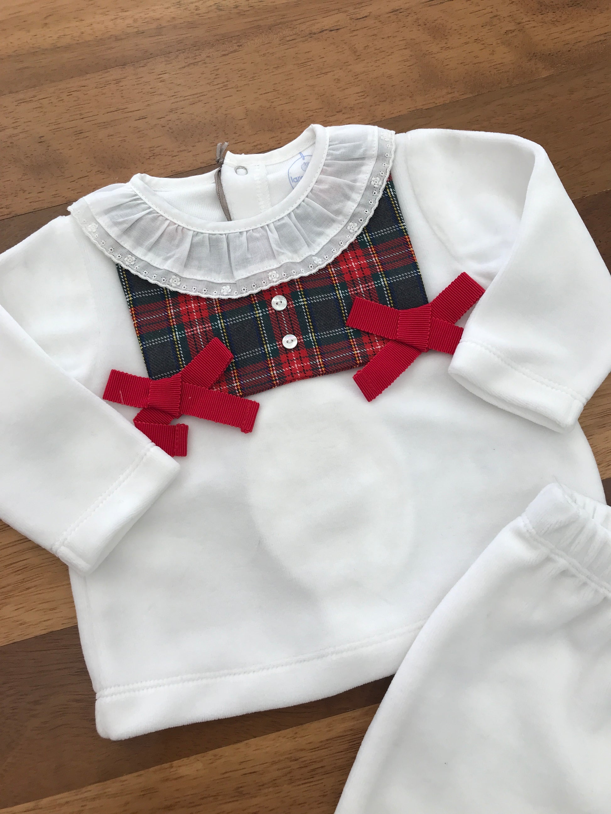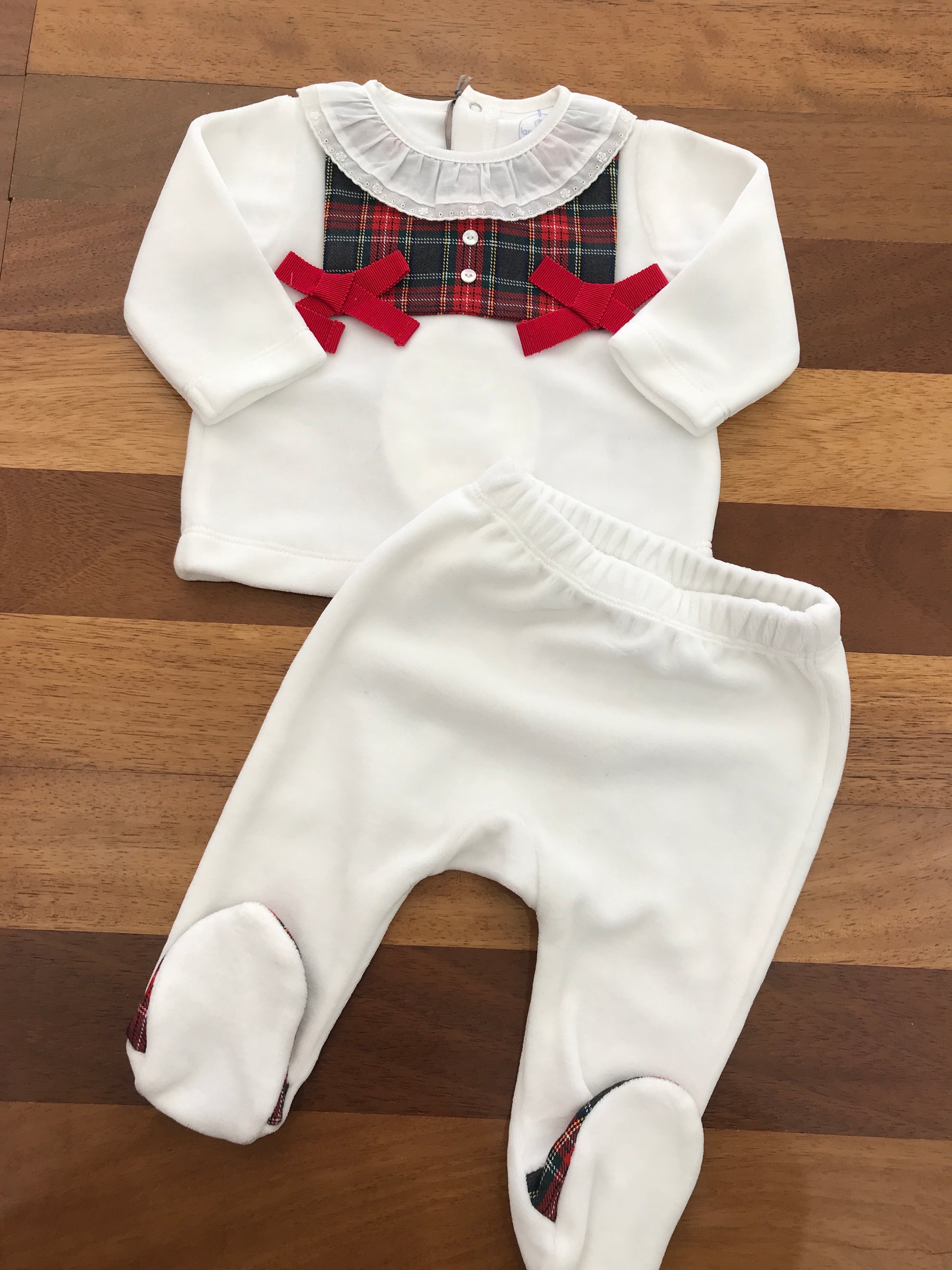 Completo in morbida ciniglia bianca composto da due pezzi, caratterizzato da piedini con motivi tartan e colletto arricchito da delicate ruches. Il capo presenta un elegante bavettone finto in tessuto scozzese, impreziosito da fiocchetti rossi applicati manualmente, per un dettaglio raffinato e ricercato.