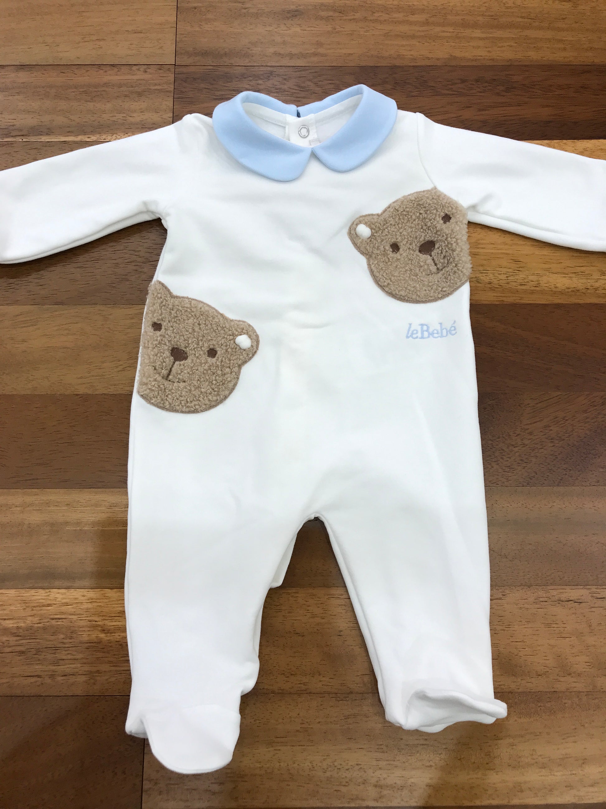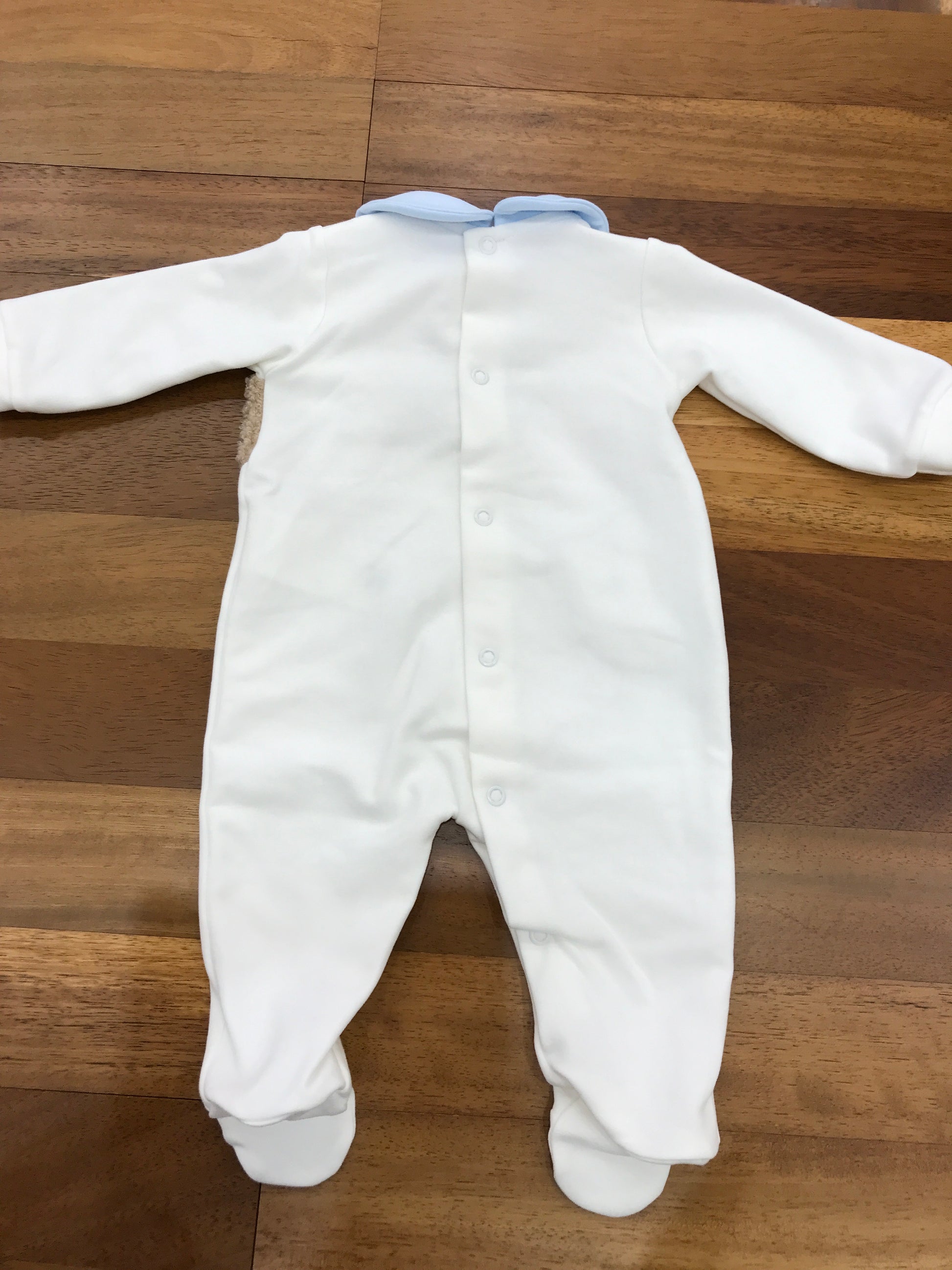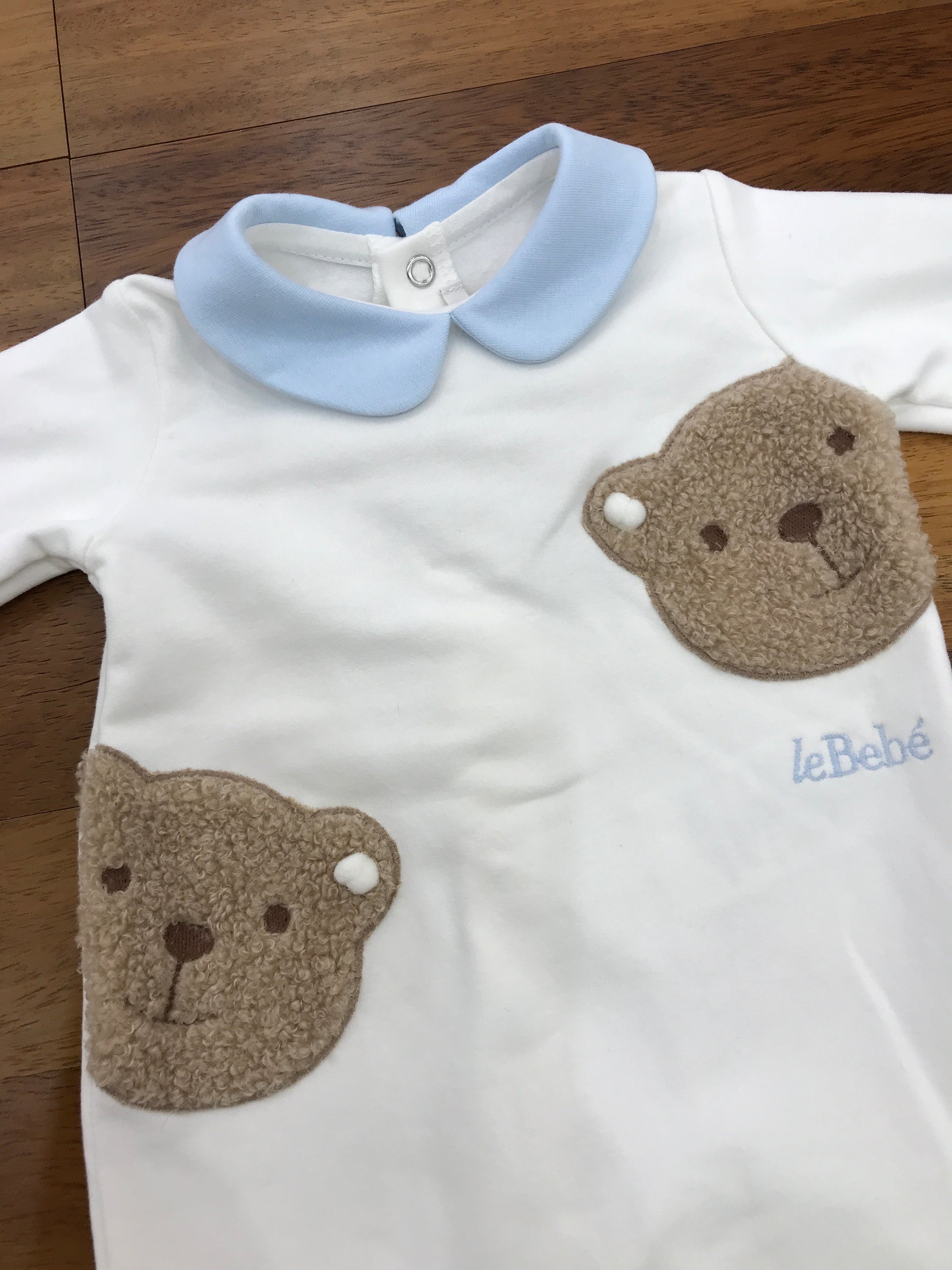 Intera tutina realizzata in caldo cotone, dotata di polsini e colletto celeste. Sul davanti presenta due orsetti di pelliccia e un piccolo logo ricamato in celeste, unendo comfort e dettagli raffinati per il neonato.