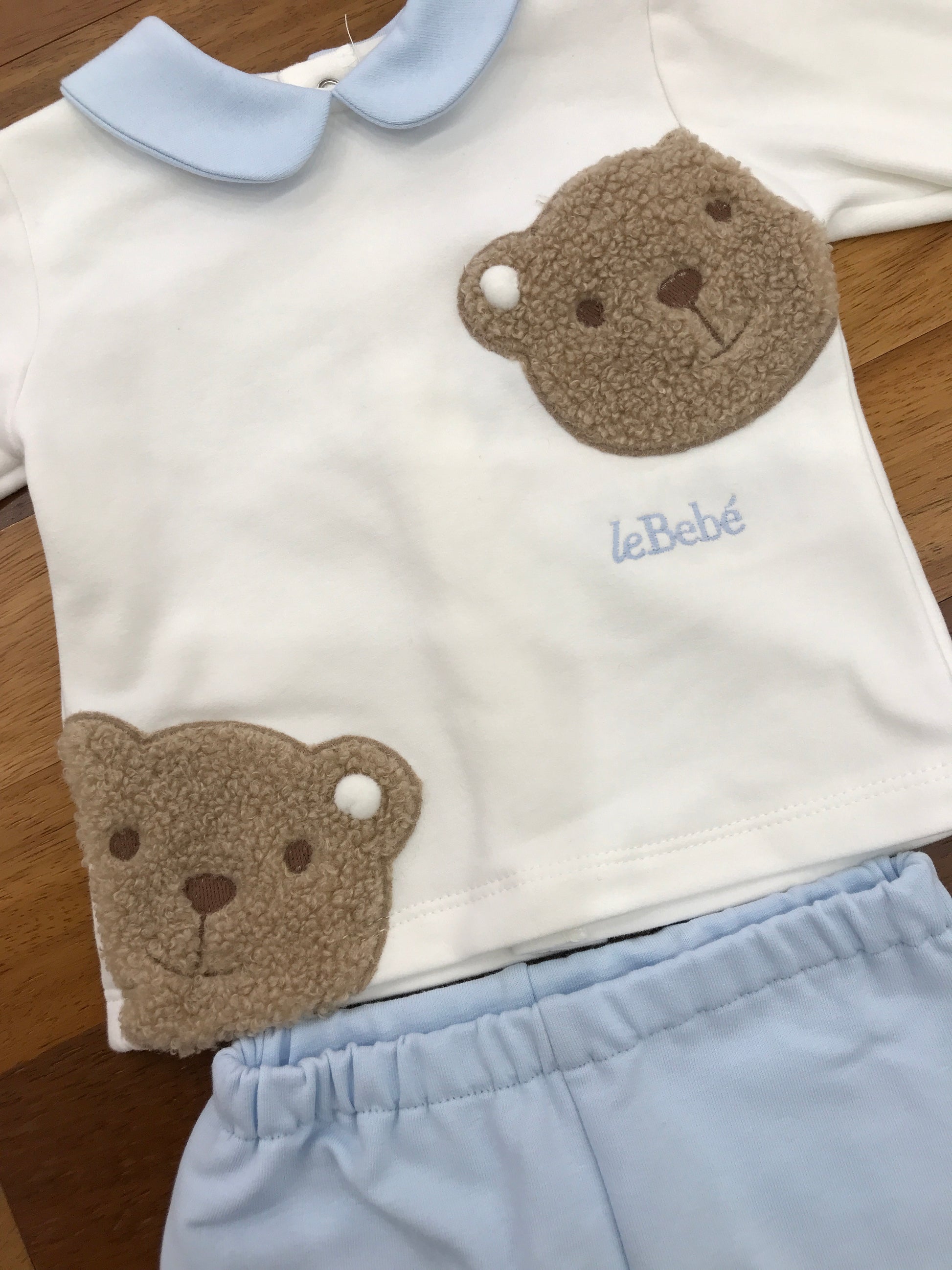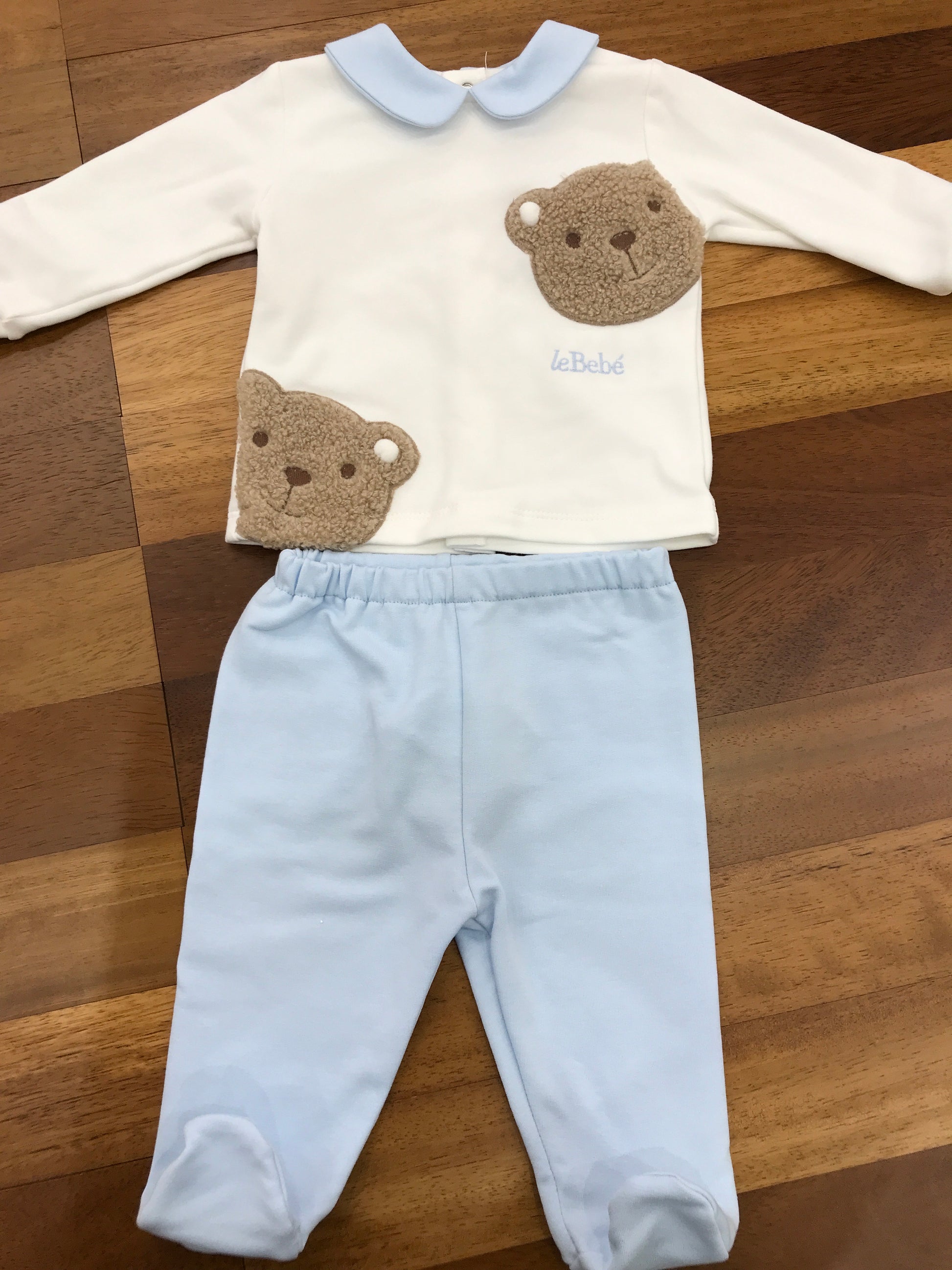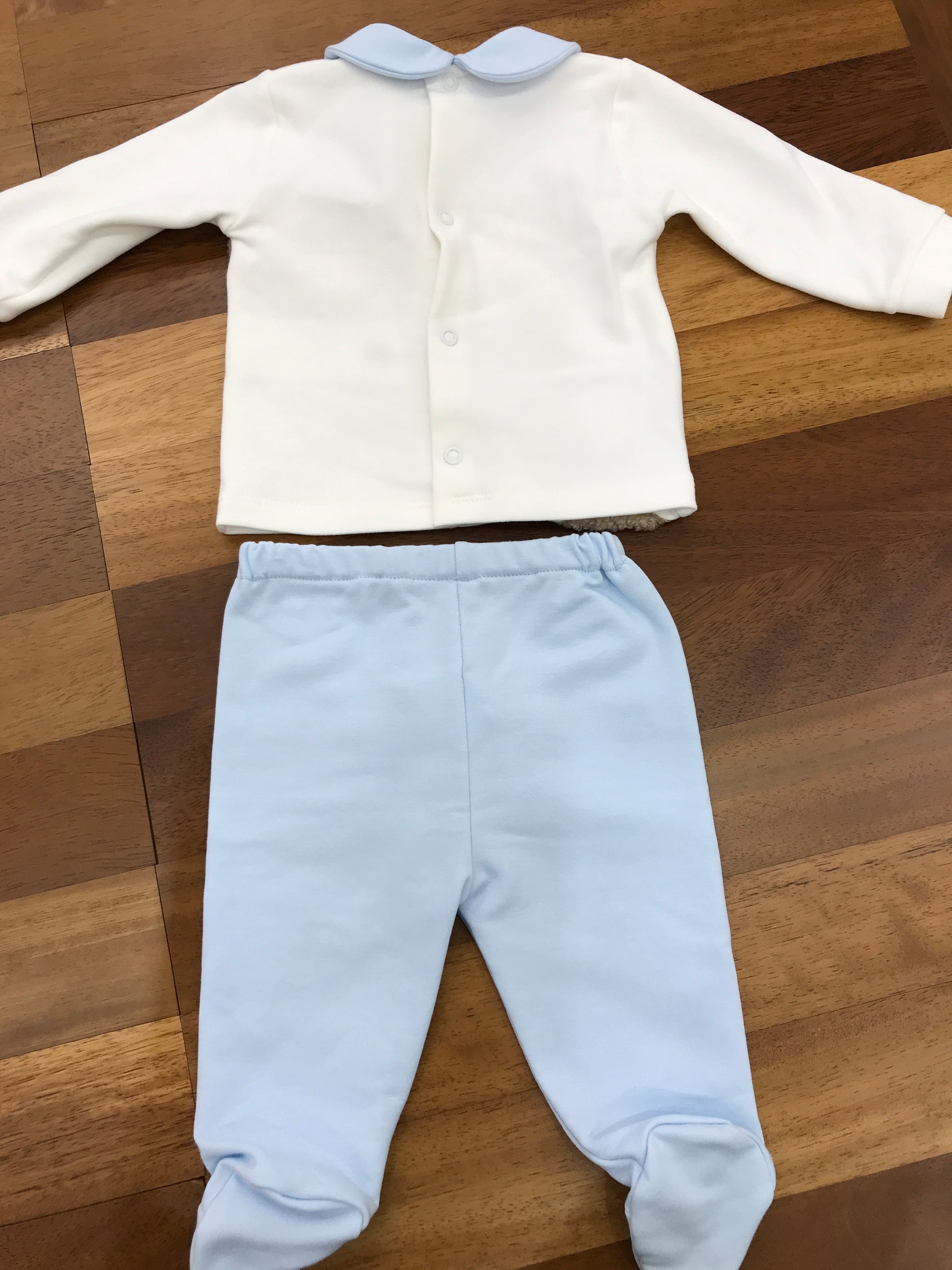 Completo due pezzi realizzato in morbido cotone caldo, ideale per mantenere il neonato avvolto nel comfort. La parte inferiore consiste in pantaloni celesti con piedini integrati, che garantiscono calore e protezione ai piedini delicati del bambino. La parte superiore è una magliettina bianca arricchita da un elegante colletto celeste e decorata con due orsetti di pelliccia, che aggiungono un tocco di dolcezza e stile al completo. Questo set unisce praticità e design raffinato, perfetto per i primi mesi di vita.