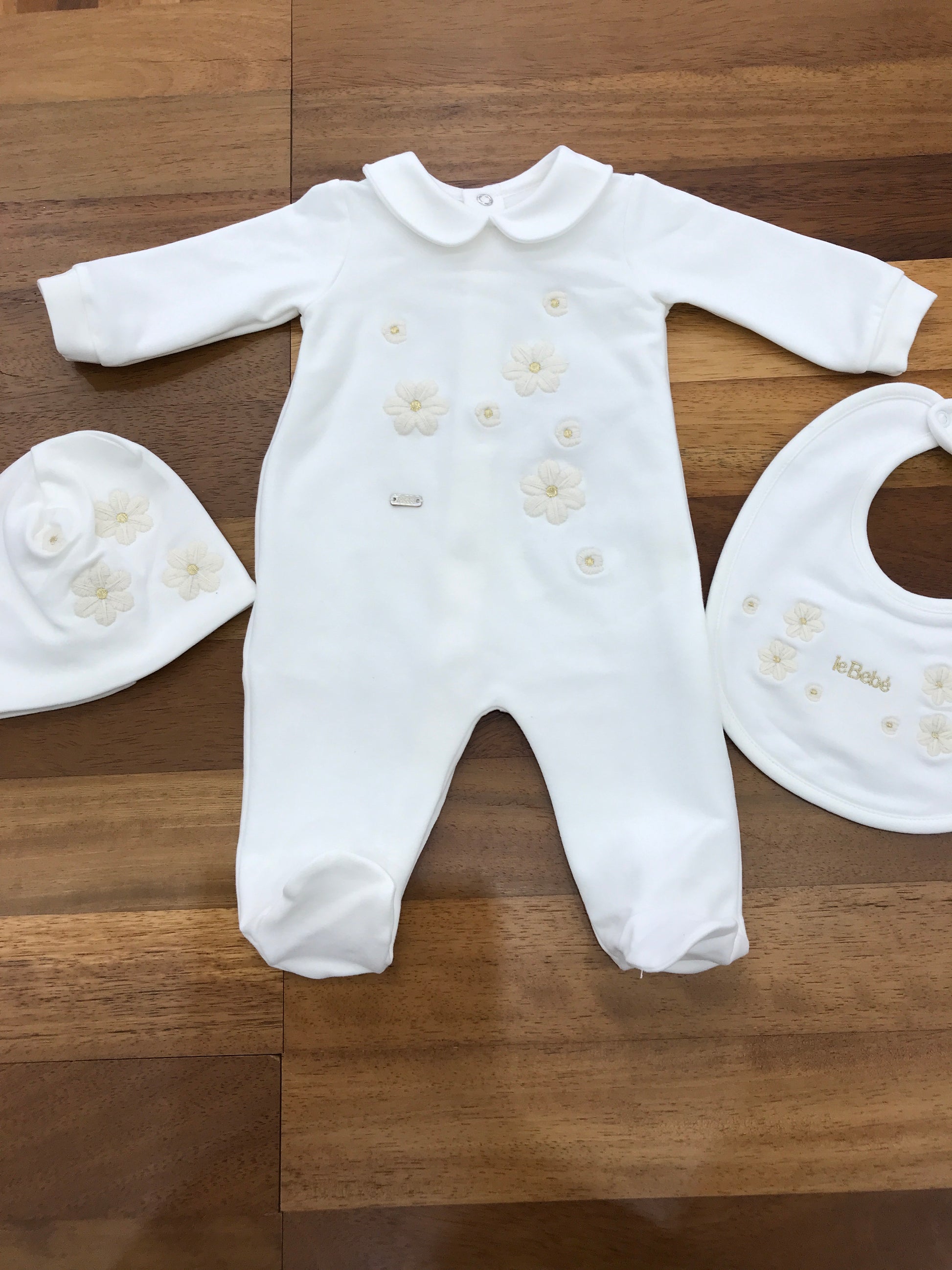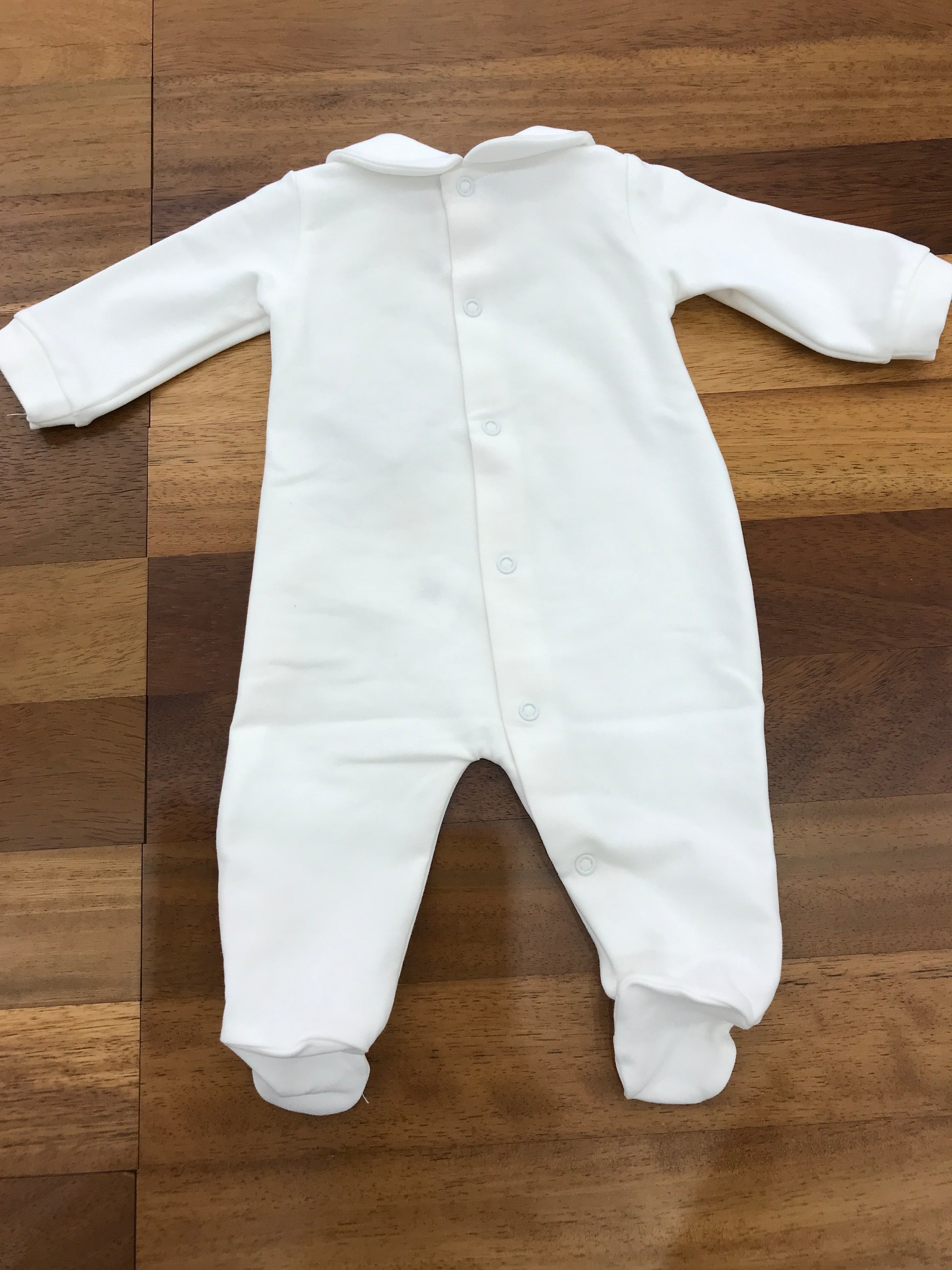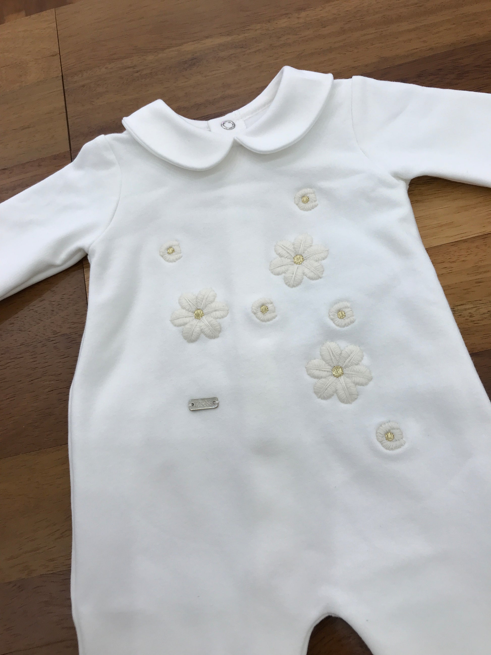 Questa tutina intera realizzata in morbido caldocotone garantisce comfort e calore per il neonato. È dotata di piedini integrati e un colletto raffinato, che aggiungono praticità e stile. Il capo è impreziosito da un ricamo di margherite, che conferisce un tocco delicato e sofisticato, rendendola ideale per le prime giornate del bambino. La combinazione di materiali di alta qualità e dettagli curati assicura una vestibilità confortevole e un aspetto elegante.
