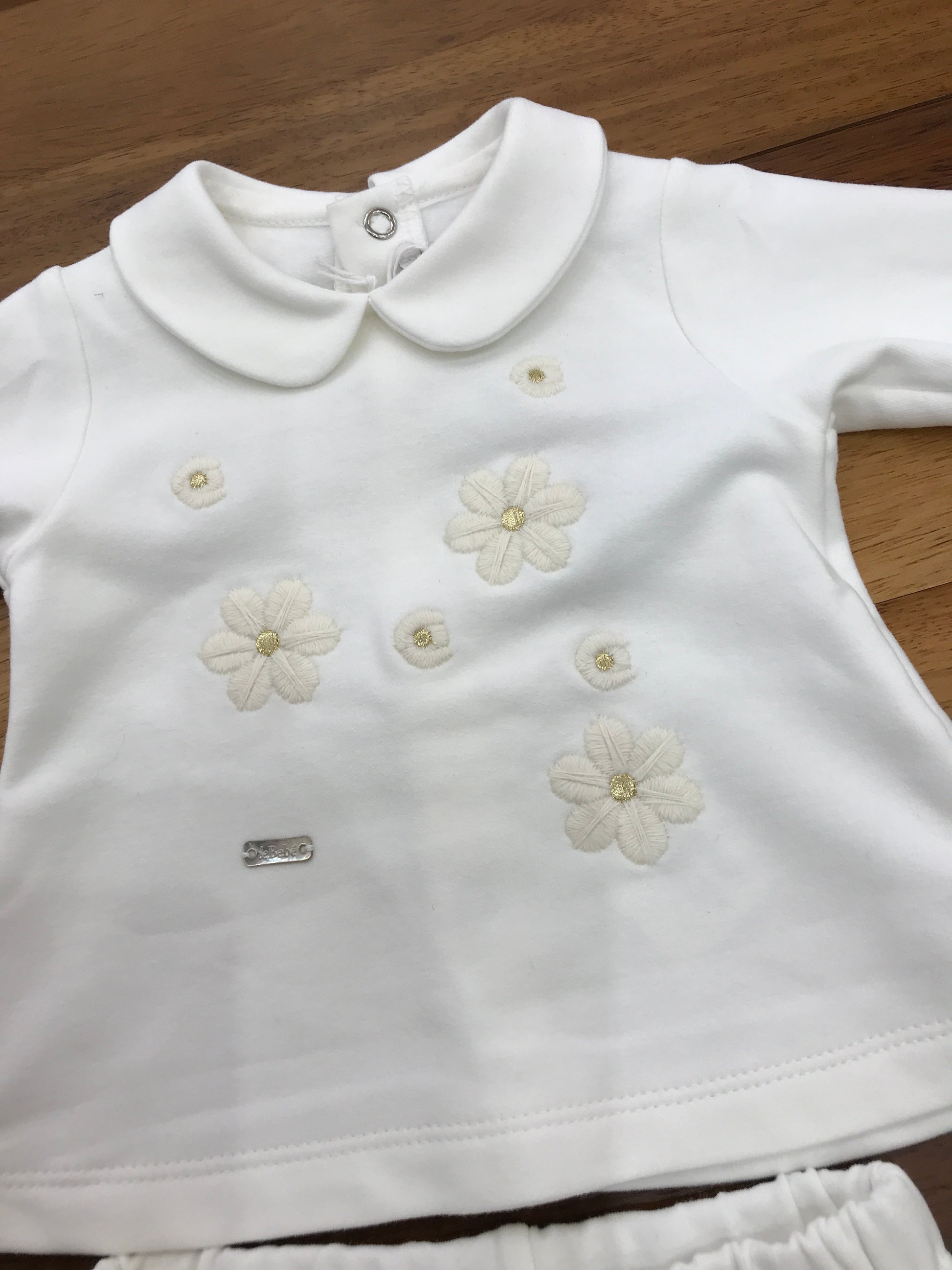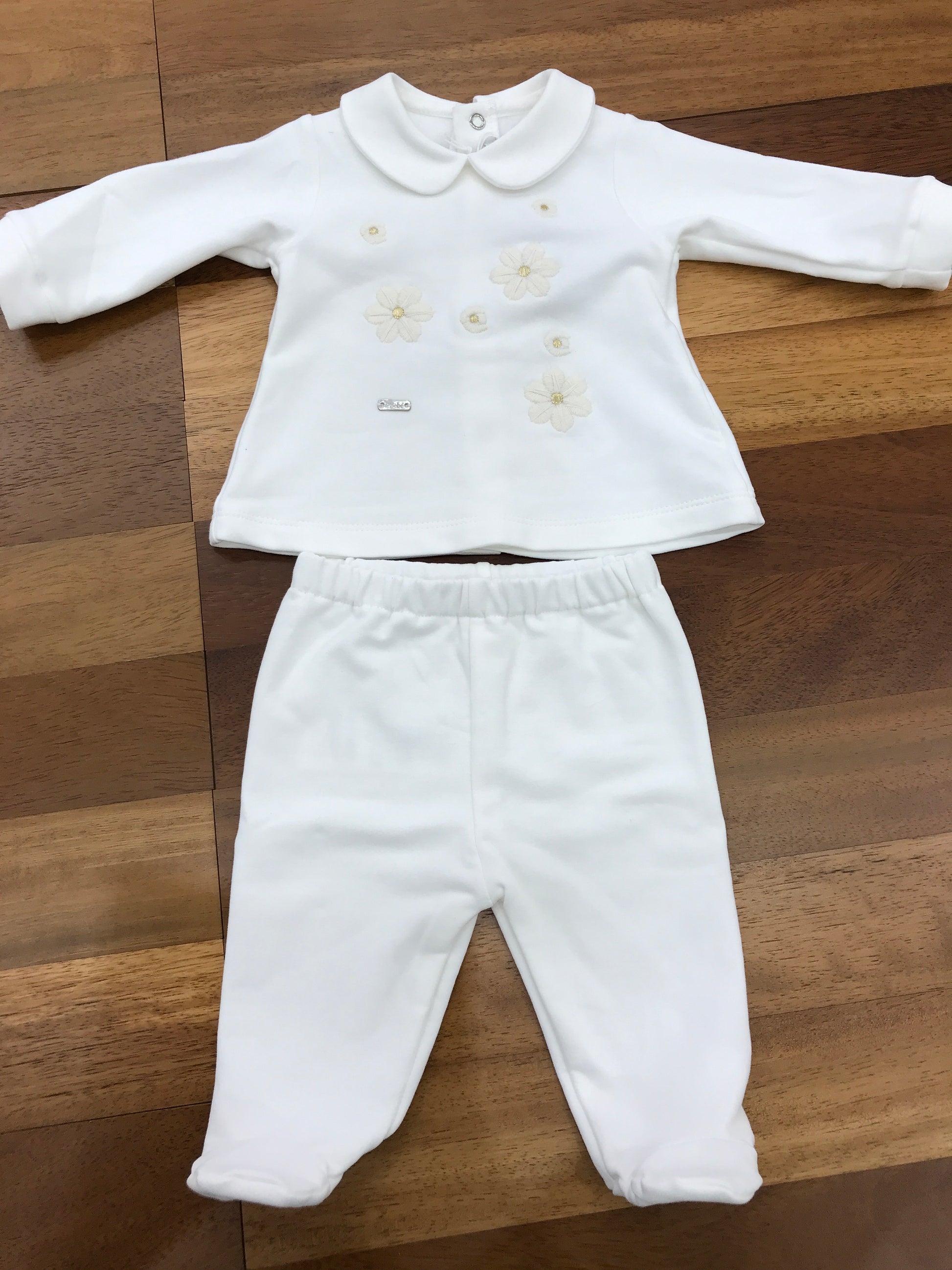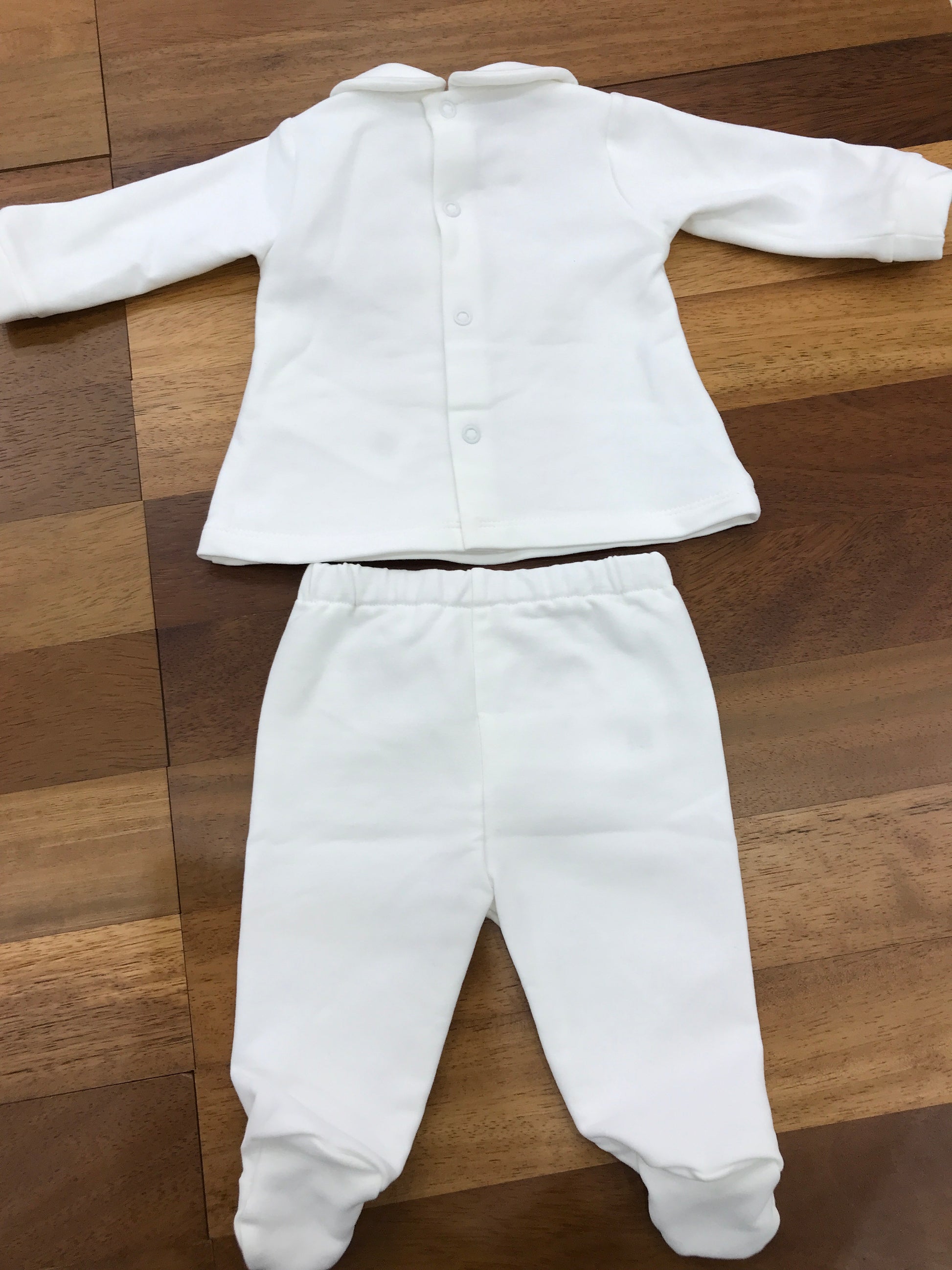 Completo due pezzi in caldo cotone, composto da pantaloni con piedini integrati e una fascia elastica in vita per garantire comfort e vestibilità ottimale. La parte superiore presenta un colletto elegante e dettagli di ricami floreali sul davanti, che aggiungono un tocco raffinato e delicato al capo, ideale per il benessere e lo stile del neonato.