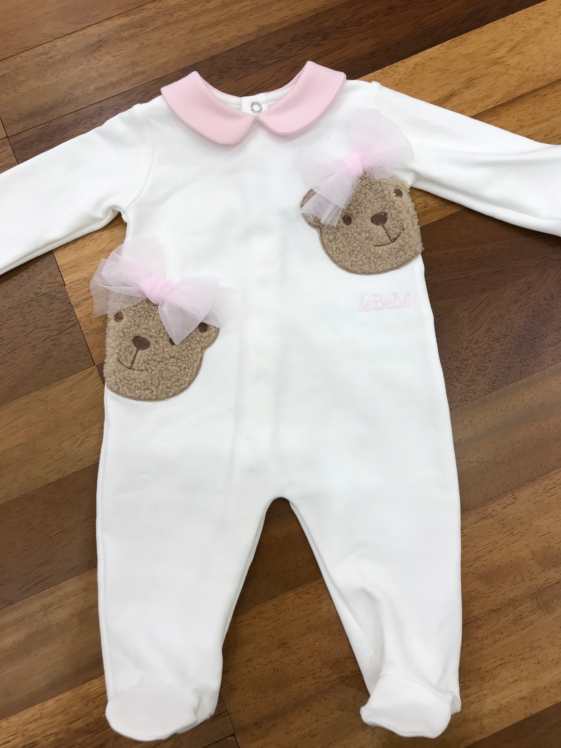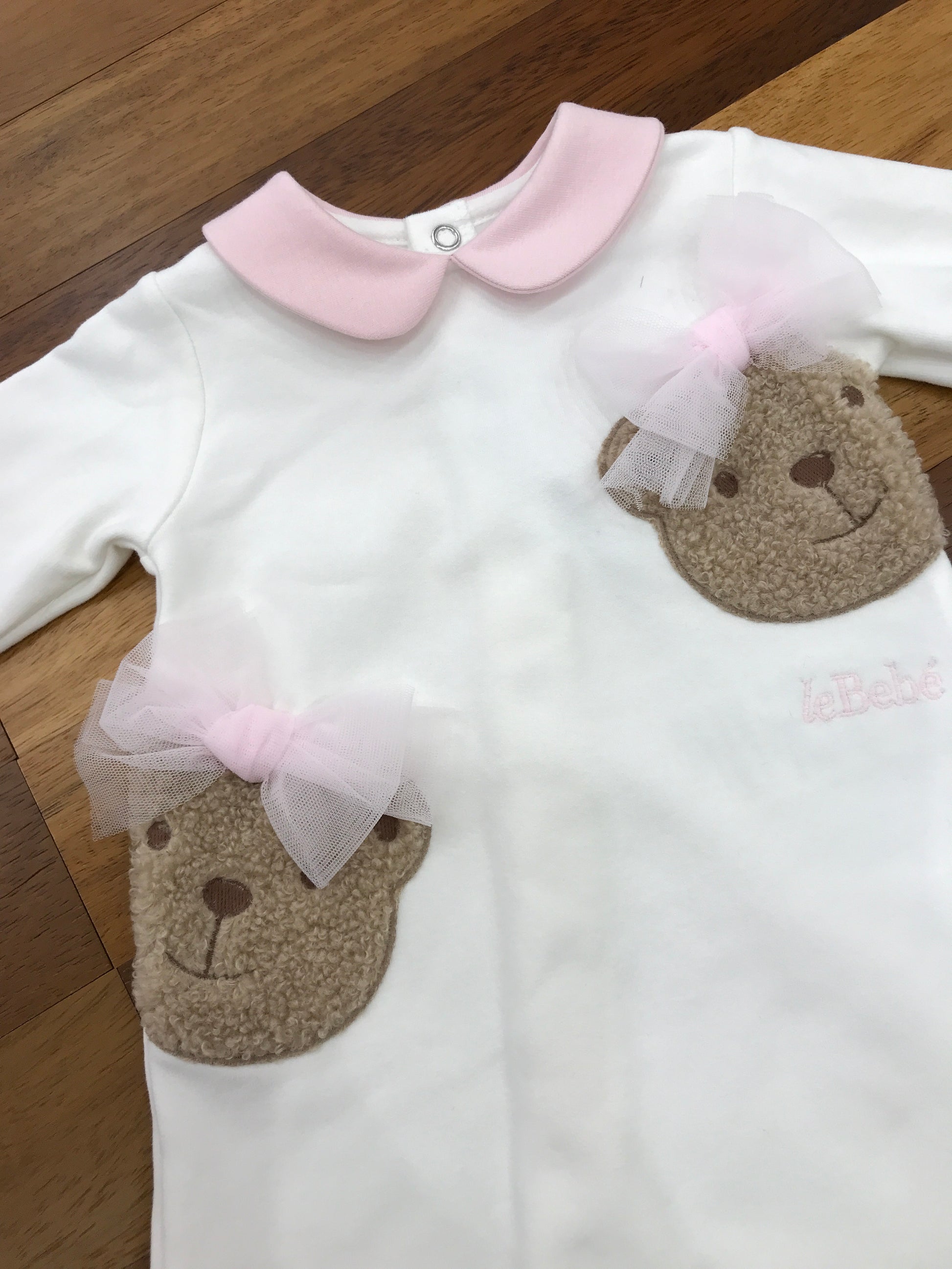 Questa tutina intera è realizzata in caldo cotone, ideale per mantenere il neonato avvolto in morbidezza e calore. Include piedini integrati per proteggere i piedini delicati senza bisogno di calzini aggiuntivi. Il colletto rosa aggiunge un tocco di dolcezza e raffinatezza al capo. Sul davanti, due orsetti di pelliccia impreziosiscono la tutina, ciascuno decorato con un fiocchetto di tulle, conferendo un dettaglio elegante e giocoso che rende questo capo perfetto per ogni occasione speciale.