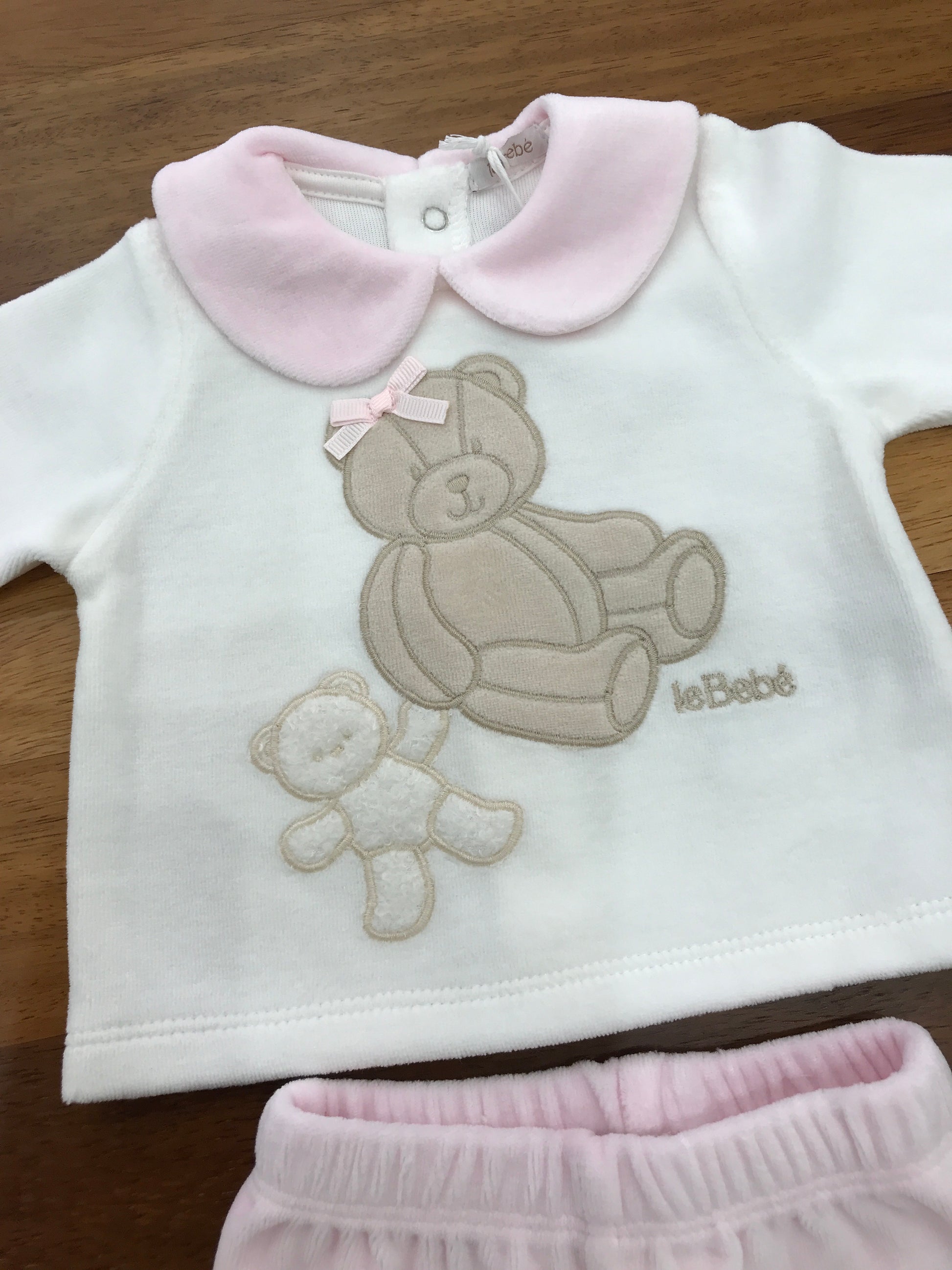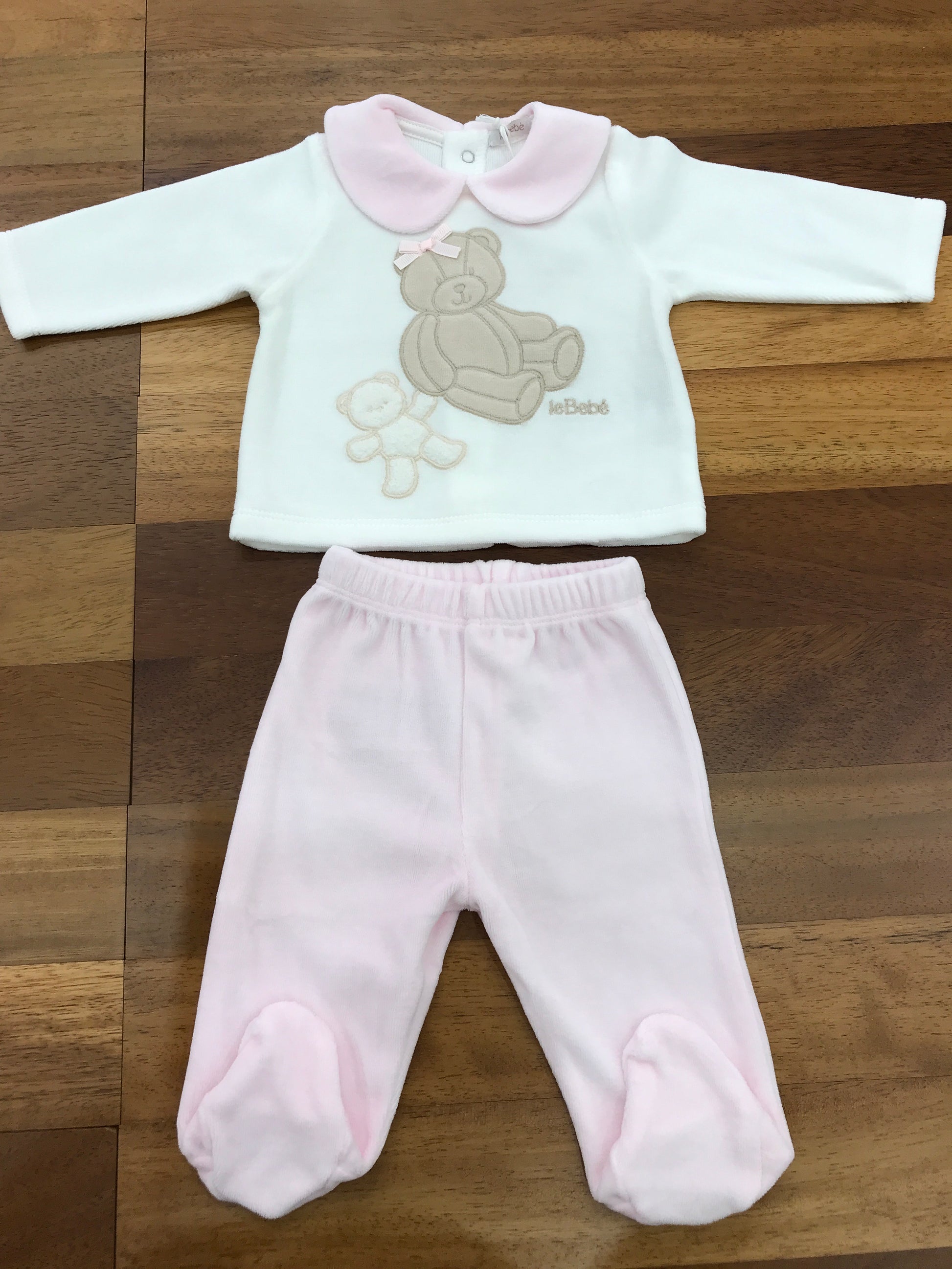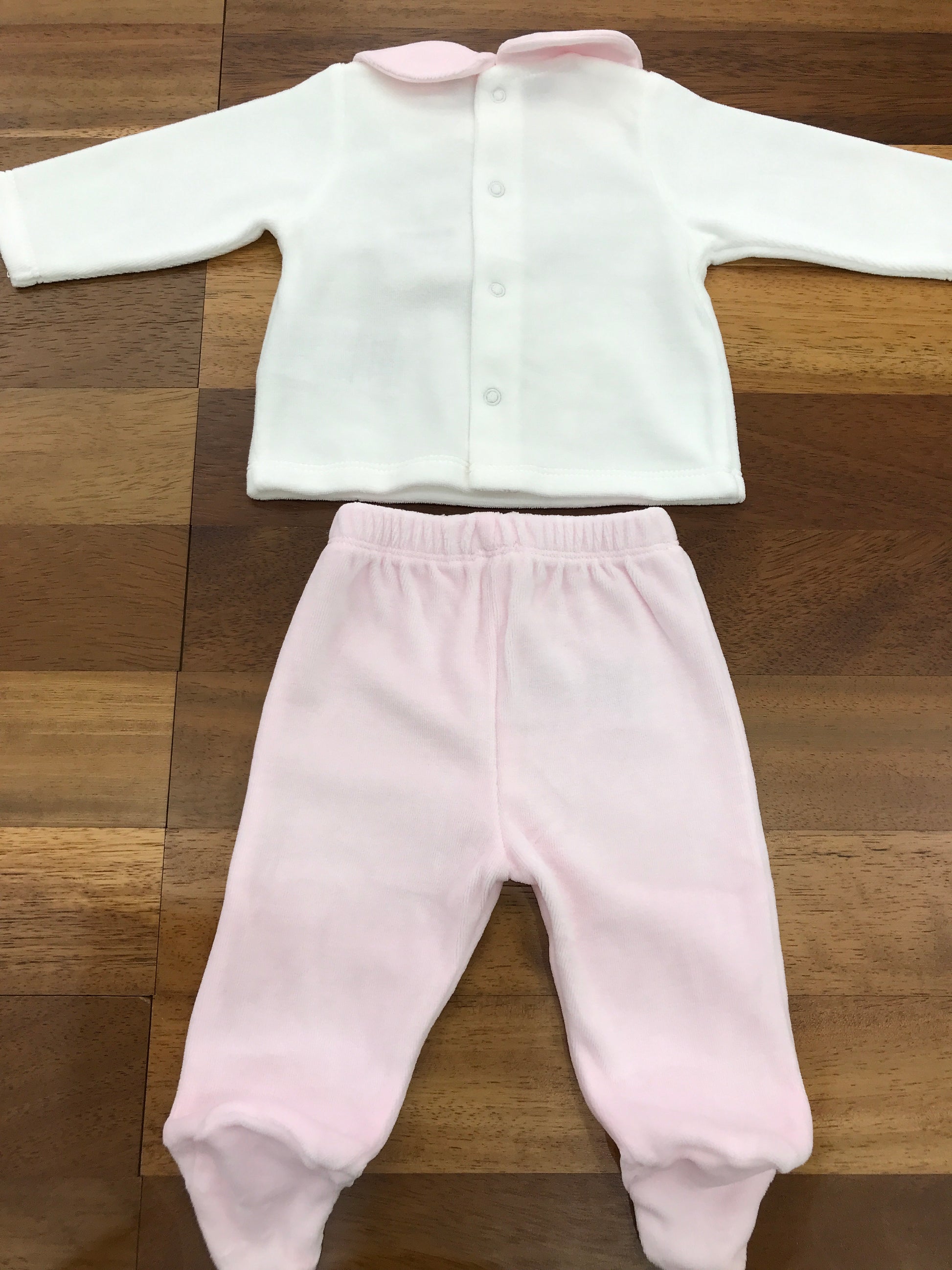 Questo completino in ciniglia è composto da due pezzi coordinati: il pantalone rosa, dotato di piedini per garantire comfort e calore, presenta una morbida molla in vita che assicura una vestibilità perfetta senza stringere. La maglia bianca, arricchita da un delicato colletto rosa, è decorata al centro con due orsetti ricamati con cura; uno di essi è impreziosito da un piccolo fiocco rosa che aggiunge un tocco di dolcezza e raffinatezza al capo. Ideale per i primi mesi, unisce praticità e stile in un unico completo.