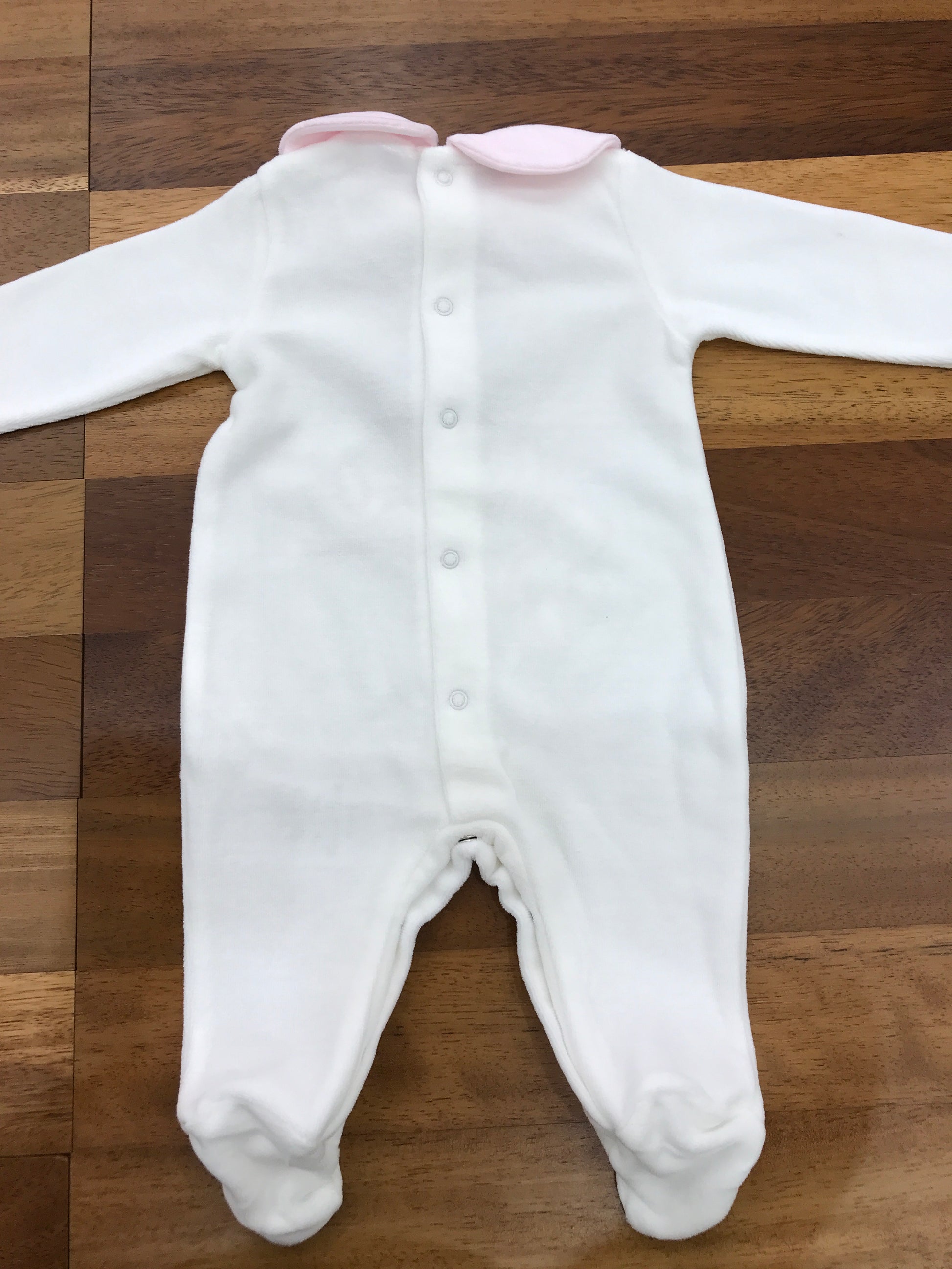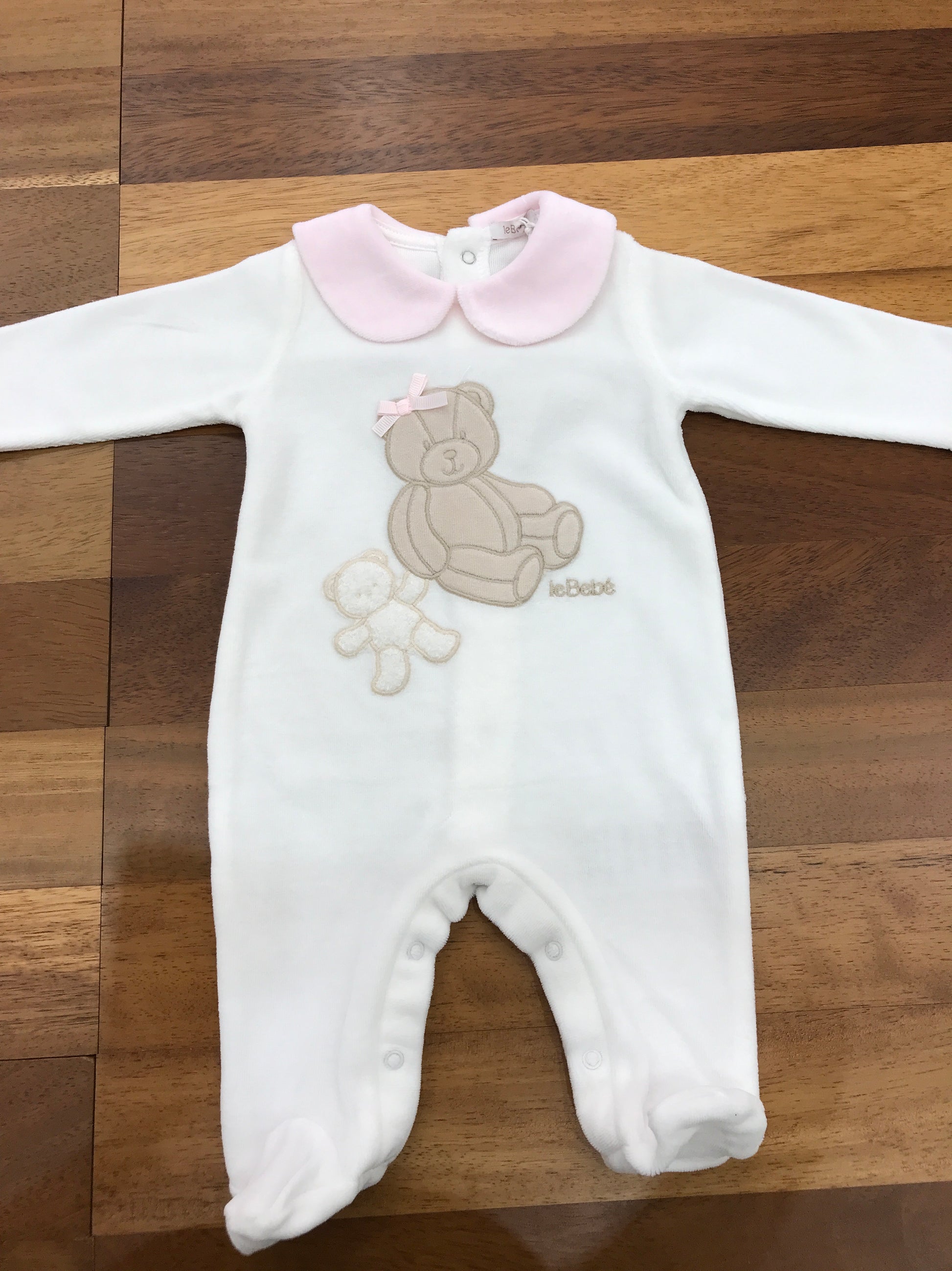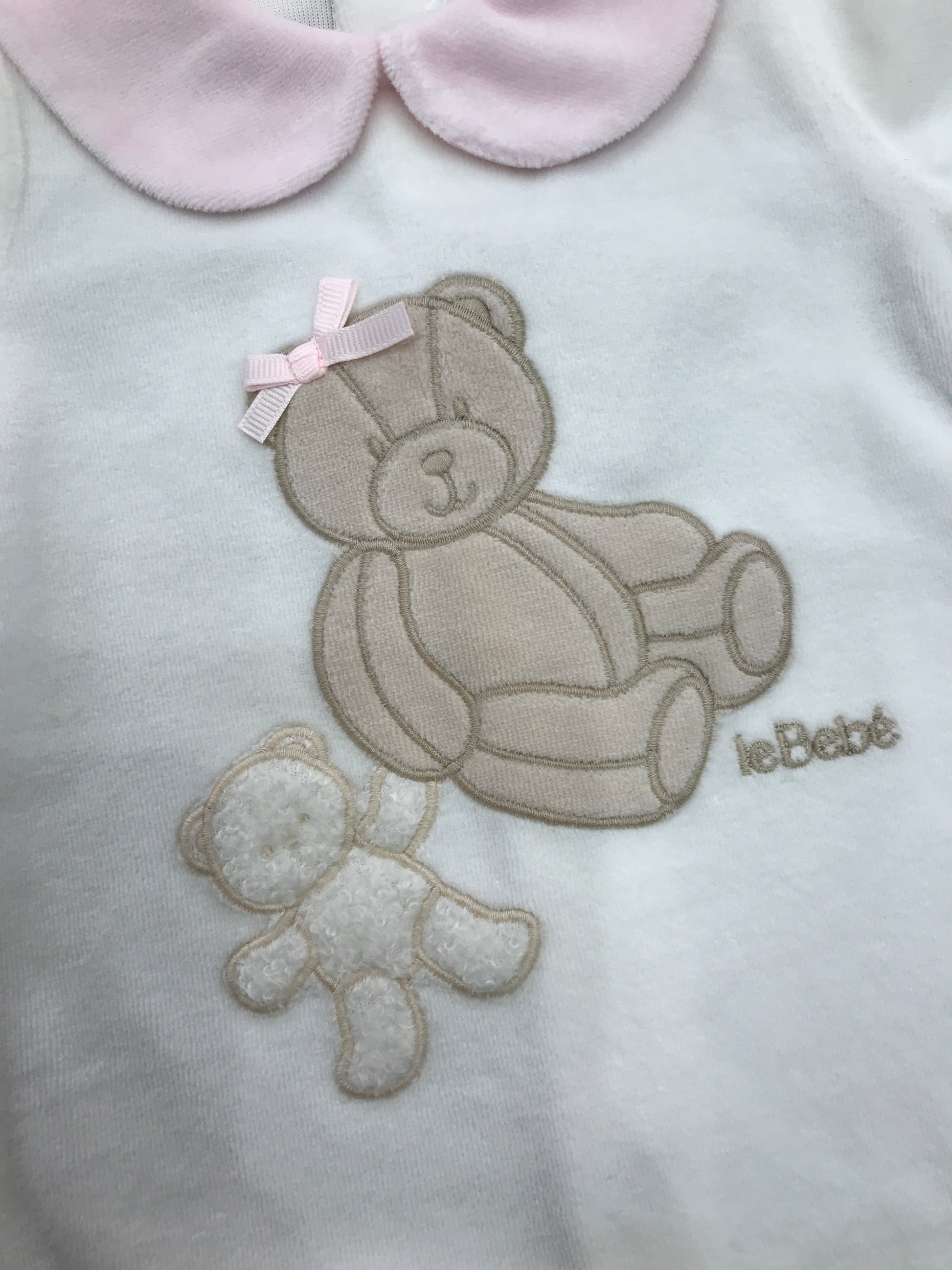 Questa tutina intera in morbida ciniglia è dotata di piedini integrati per garantire il massimo comfort e calore al neonato. Il delicato colletto rosa aggiunge un tocco di eleganza, mentre la parte frontale è arricchita da due orsetti ricamati con cura, uno dei quali impreziosito da un fiocchetto rosa, conferendo un dettaglio raffinato e dolcezza al capo. Ideale per mantenere il bambino avvolto in morbidezza durante tutto il giorno.