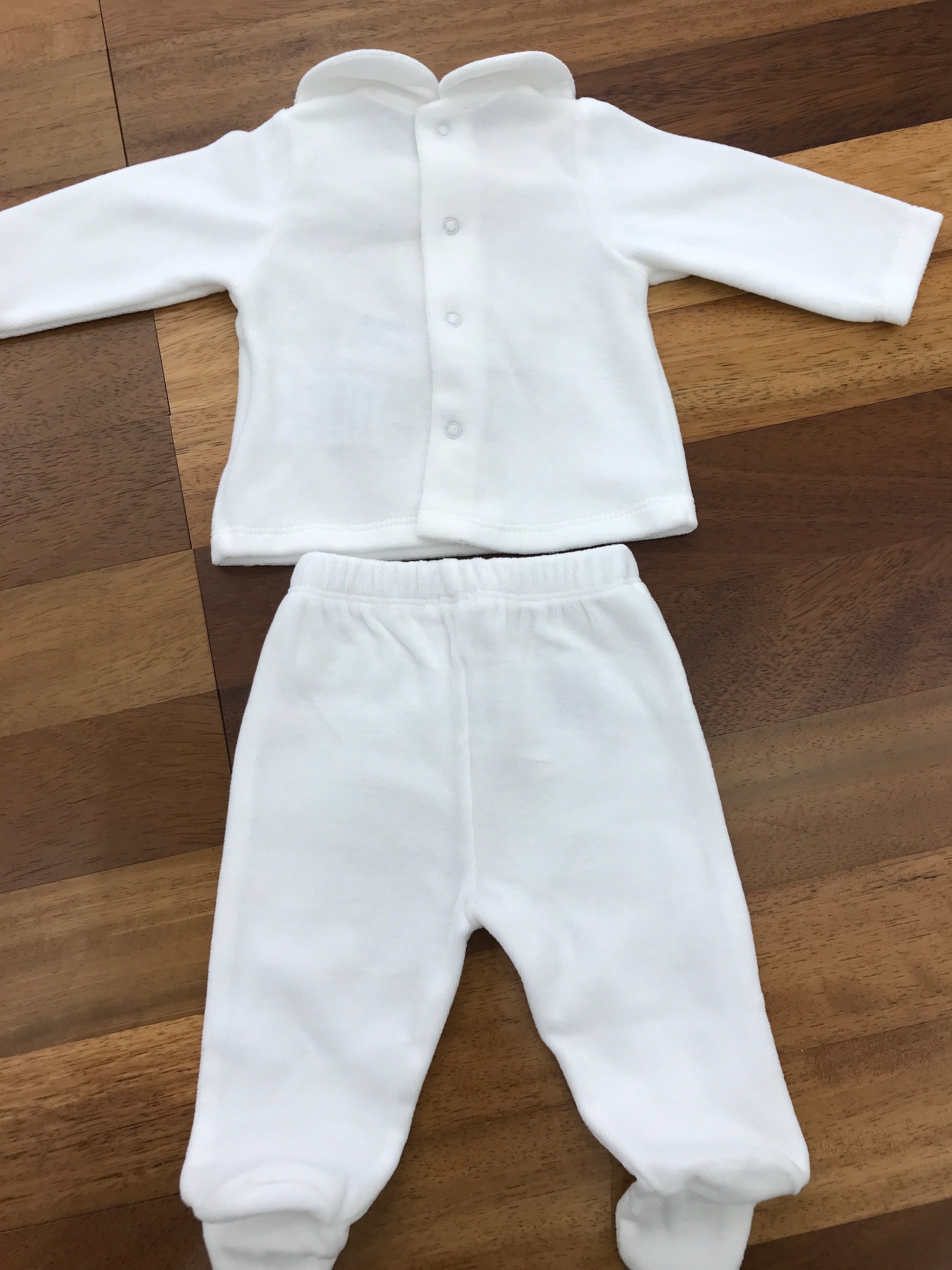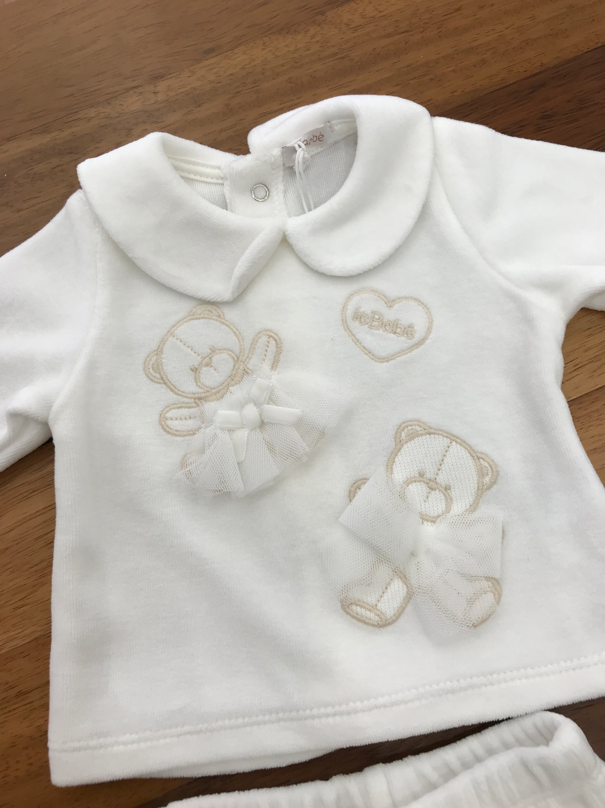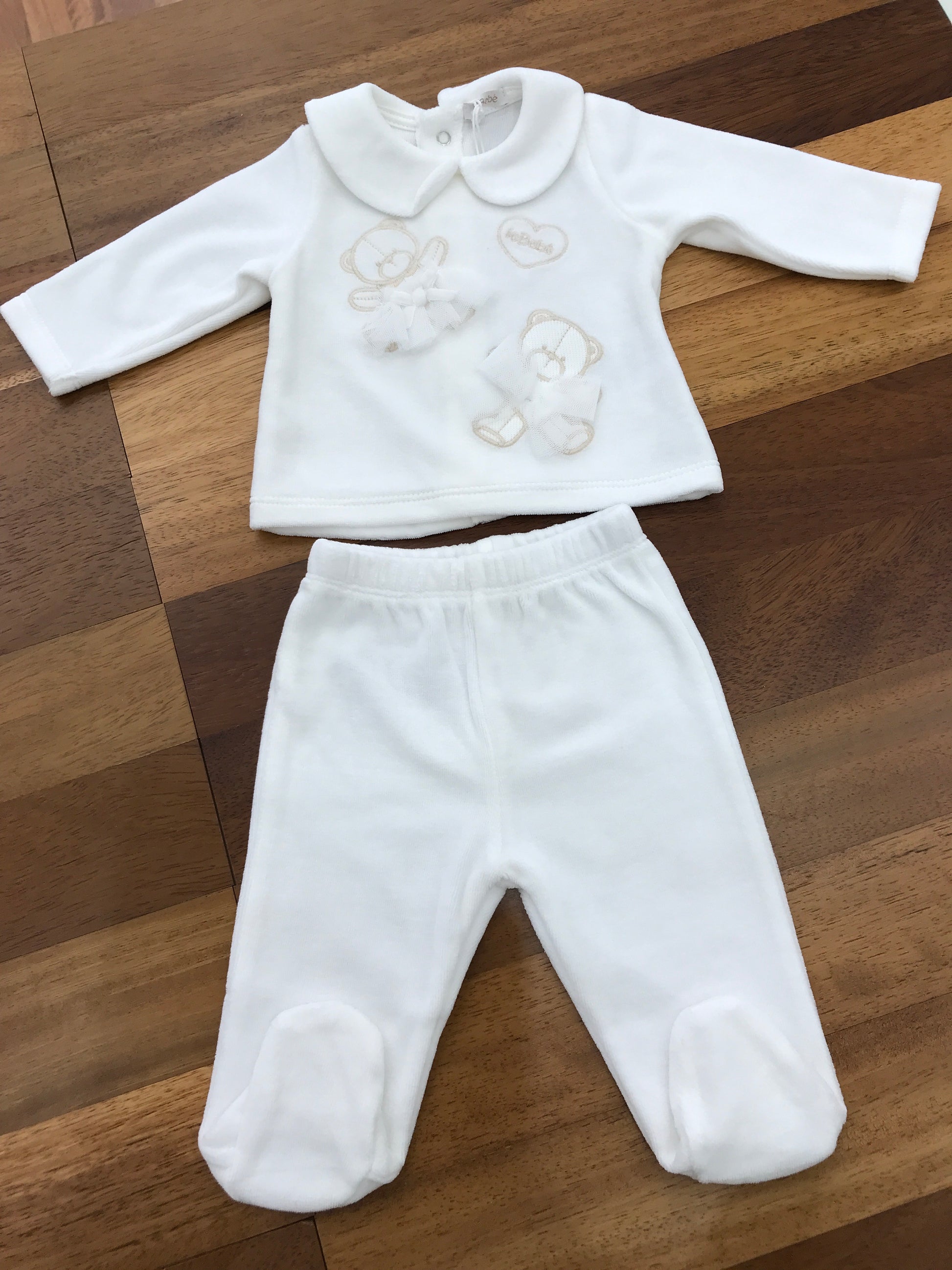 Completo due pezzi in morbida ciniglia, progettato per garantire comfort e praticità. La parte inferiore è dotata di copripiedi integrati e una vita elasticizzata che assicura una vestibilità perfetta senza stringere. La parte superiore si distingue per un elegante colletto panna e presenta due orsetti decorativi, arricchiti da un delicato ricamo in tulle che conferisce un tocco raffinato. Un piccolo cuoricino aggiunge un dettaglio dolce e discreto, rendendo questo completo ideale per i momenti di relax e gioco del tuo bebè.