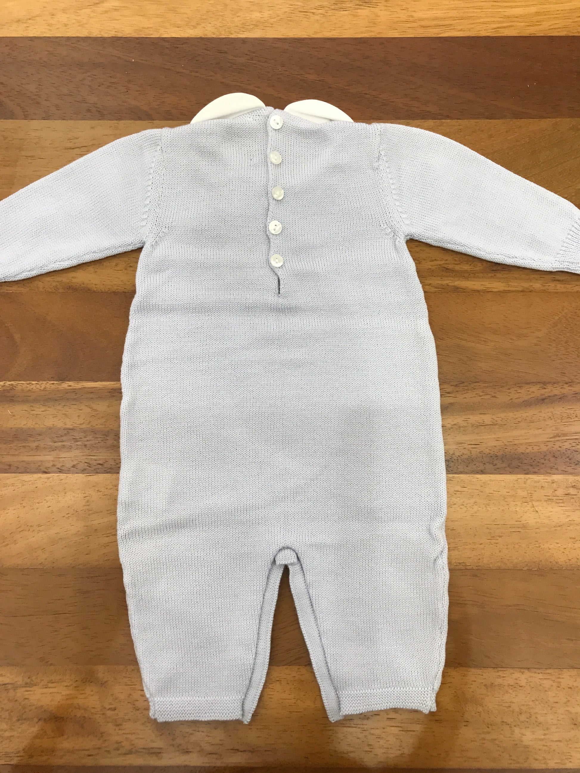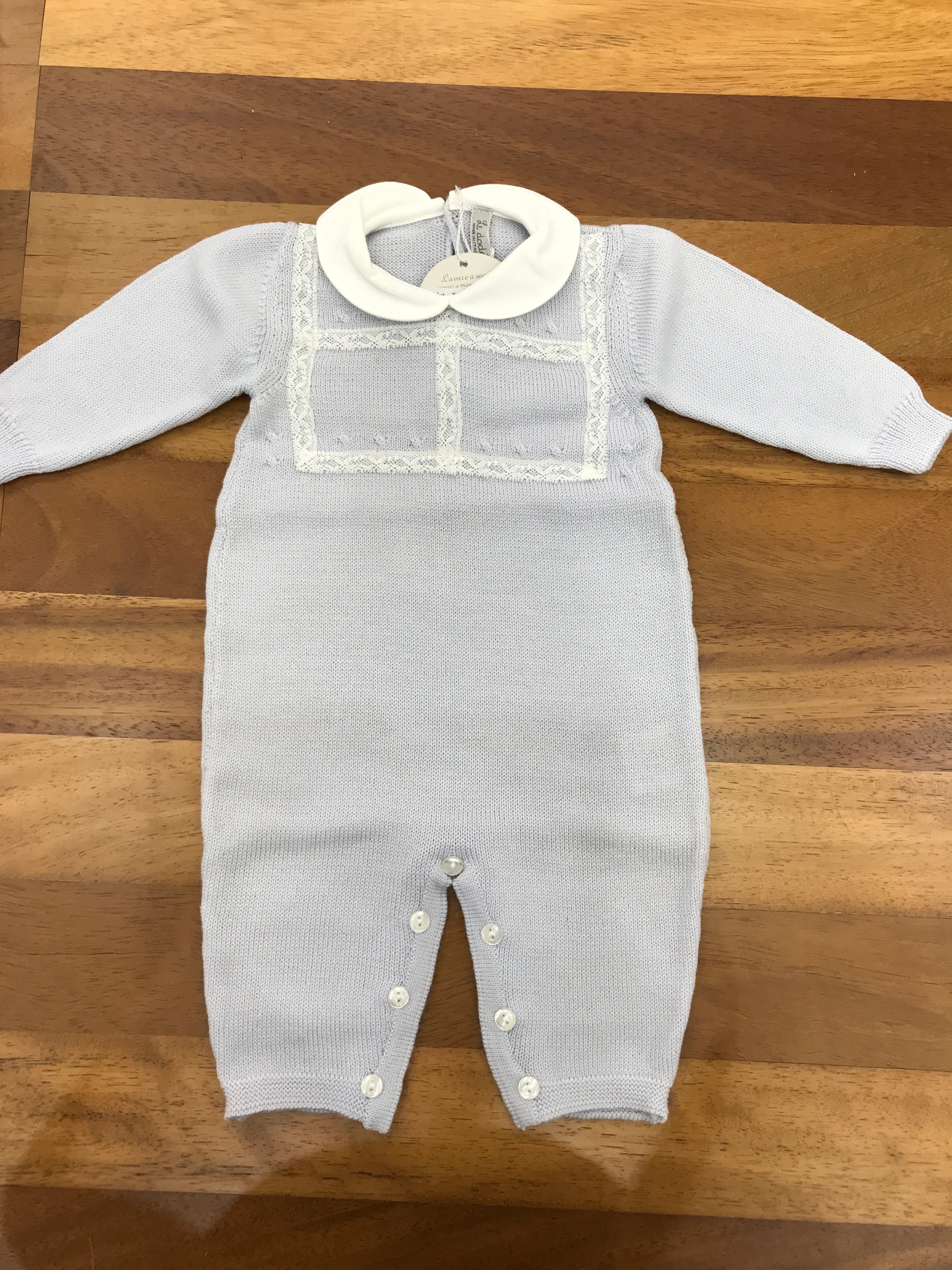 Questa tutina intera senza piedini presenta un collo tondo e un'applicazione in valacienne sul corpetto, disposta a formare diversi quadrati.