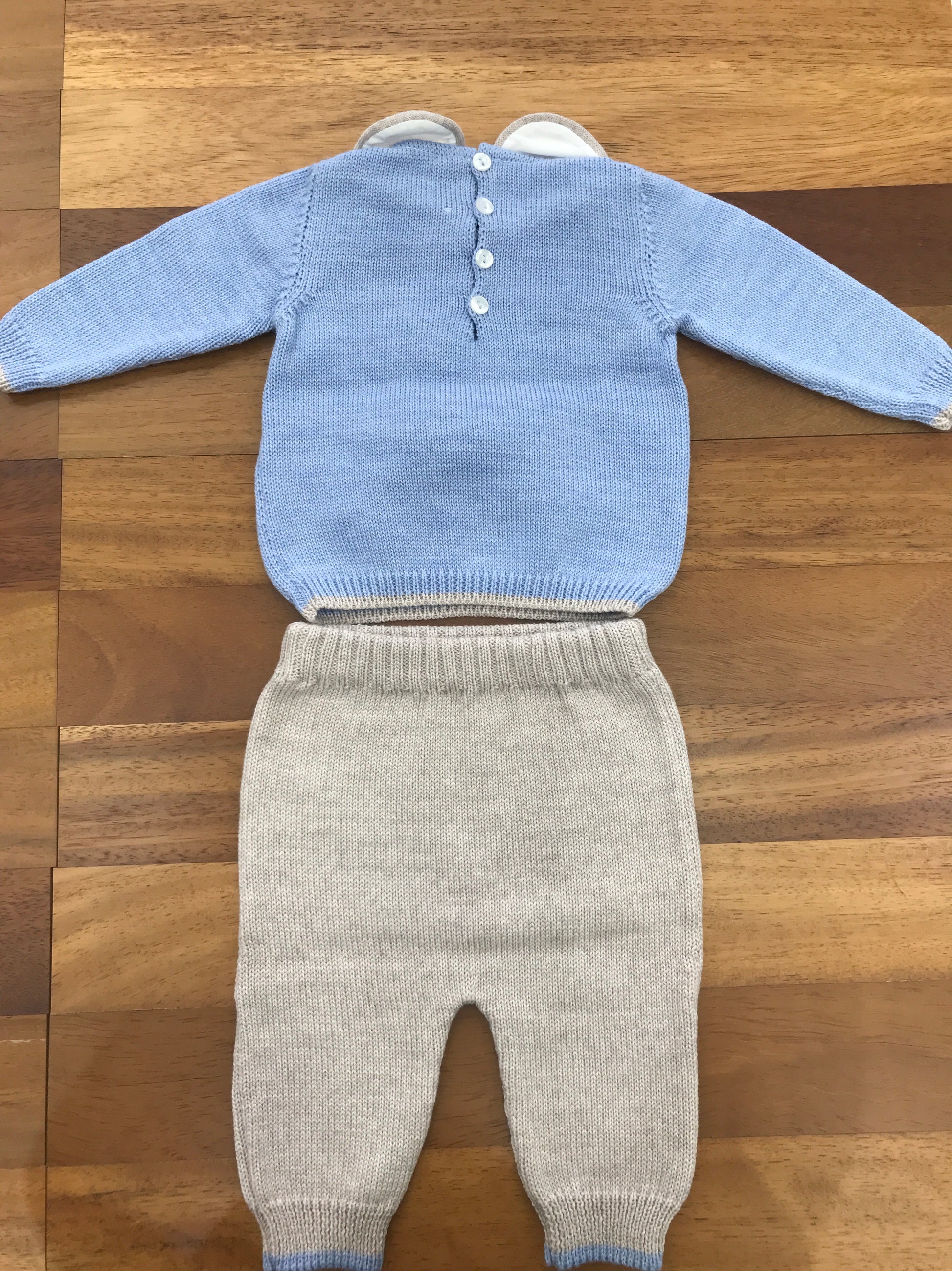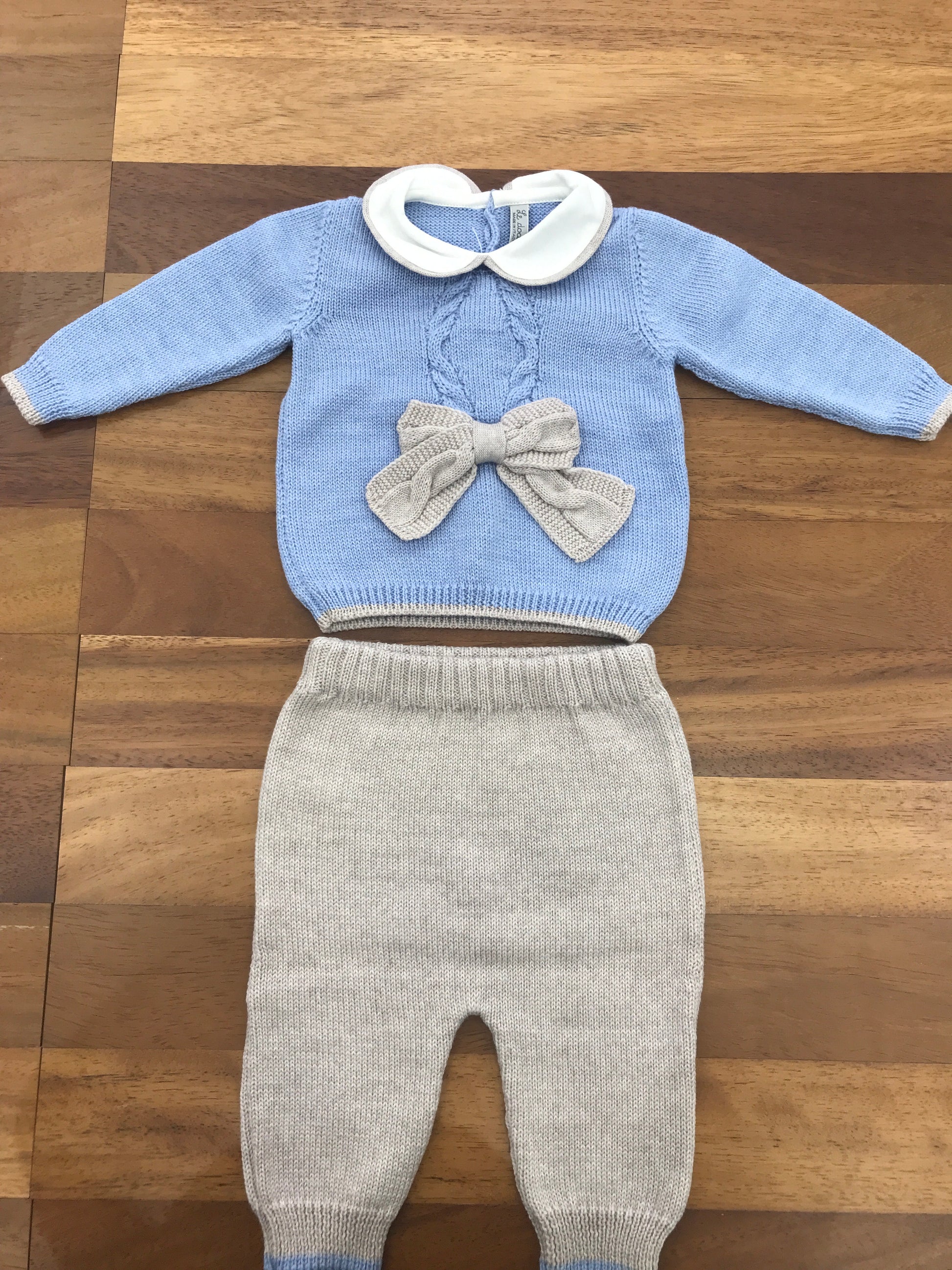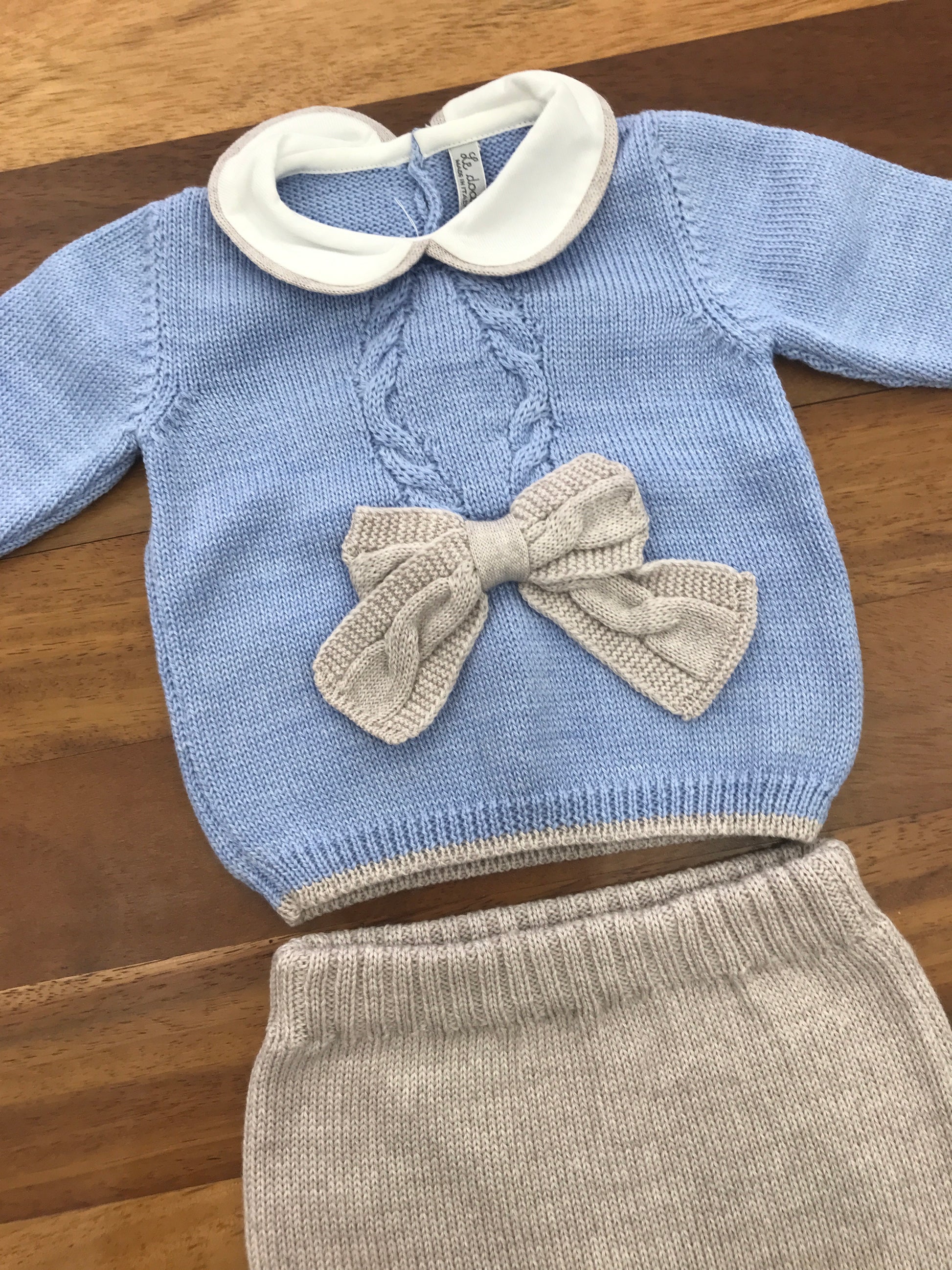 Completo due pezzi in lana senza piedini, con collo rifinito, decorato da una lavorazione a trecce e un fiocco centrale sul davanti.