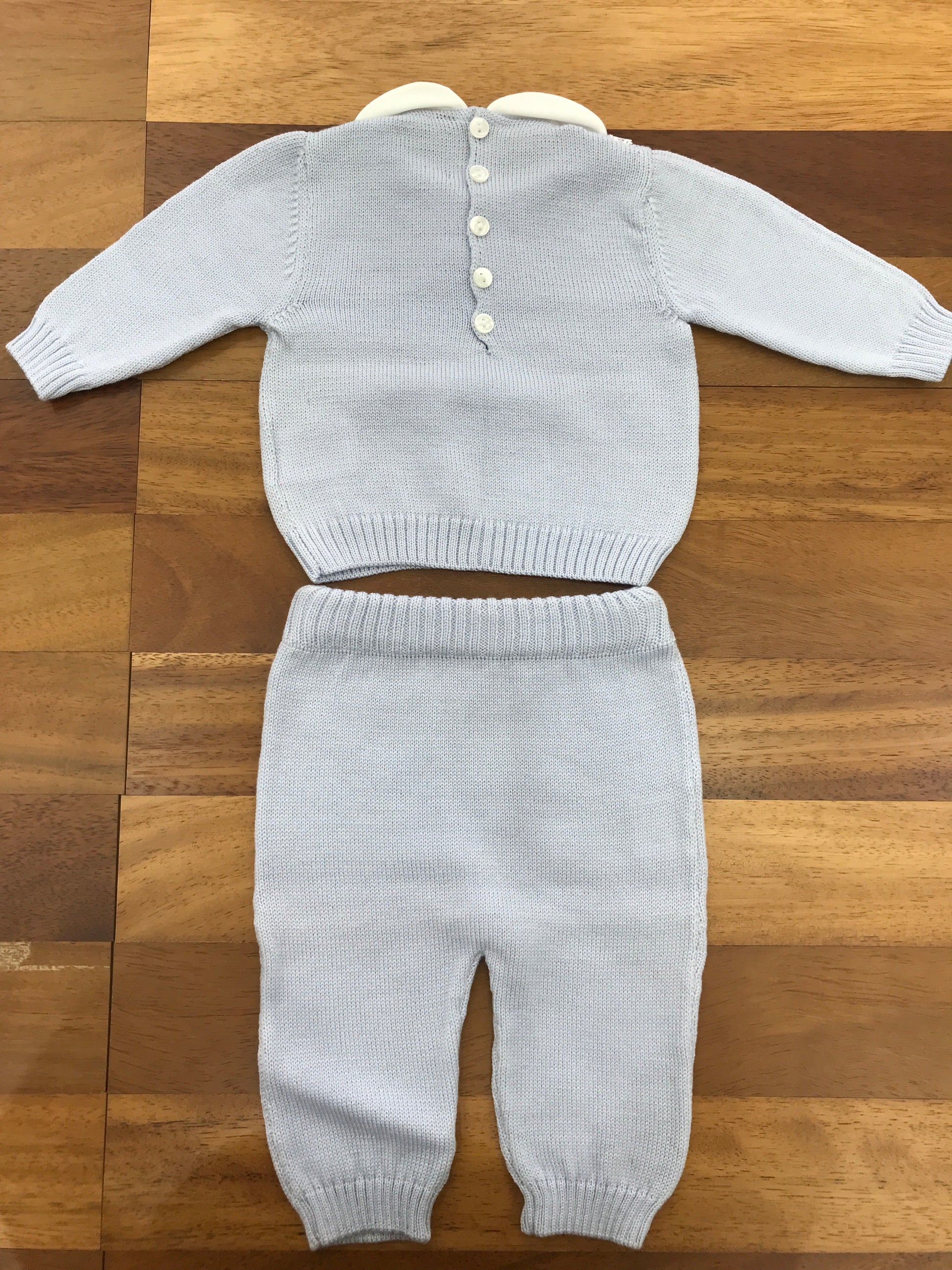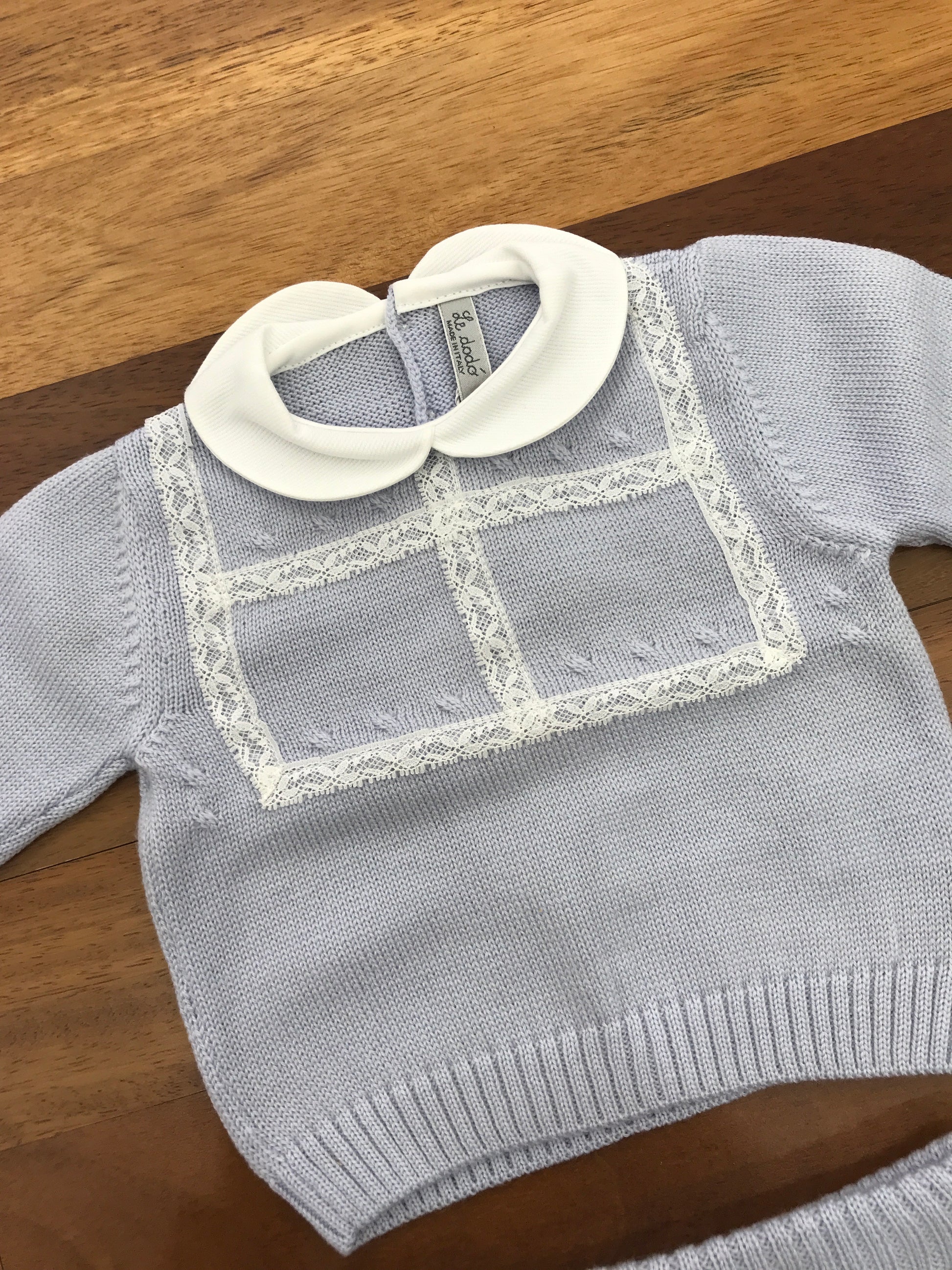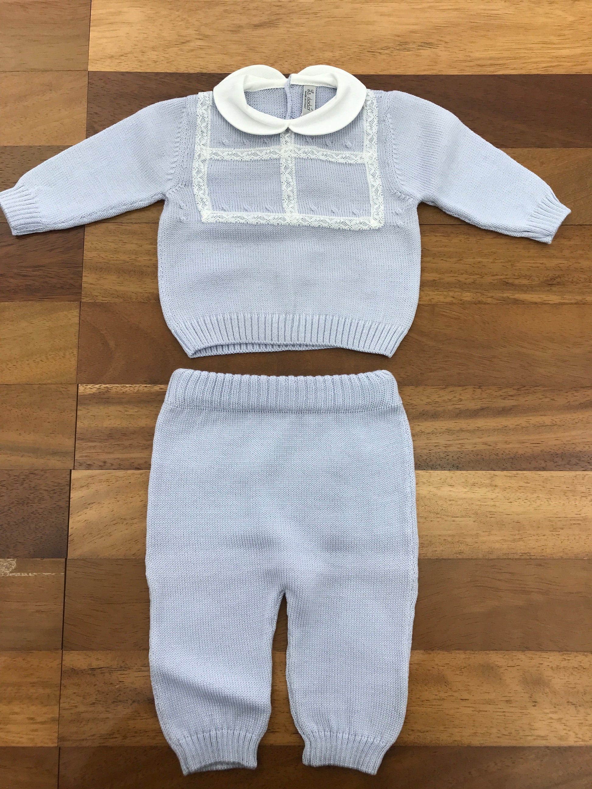 Completo due pezzi in lana senza piedini, caratterizzato da un collo elegante e una raffinata lavorazione Valancienne sul davanti.