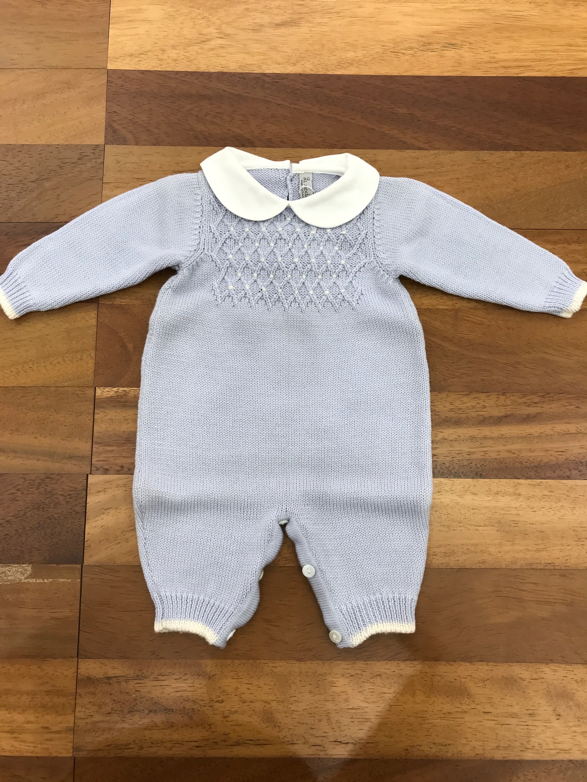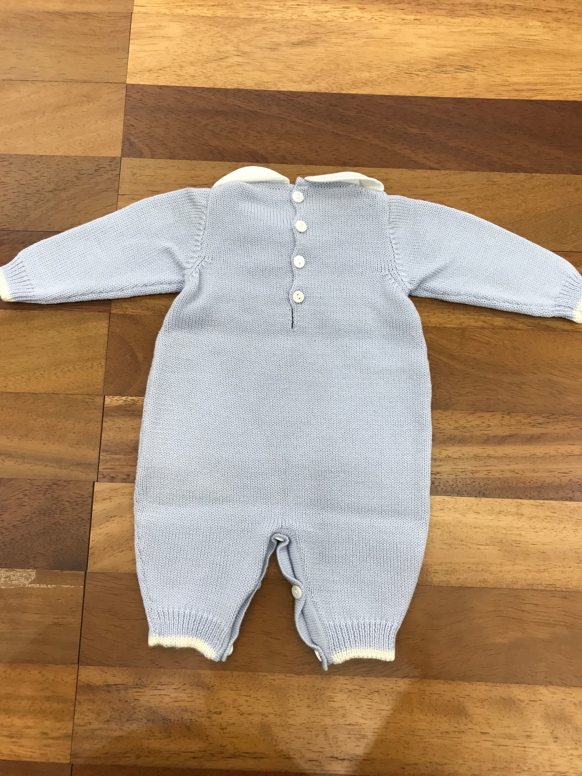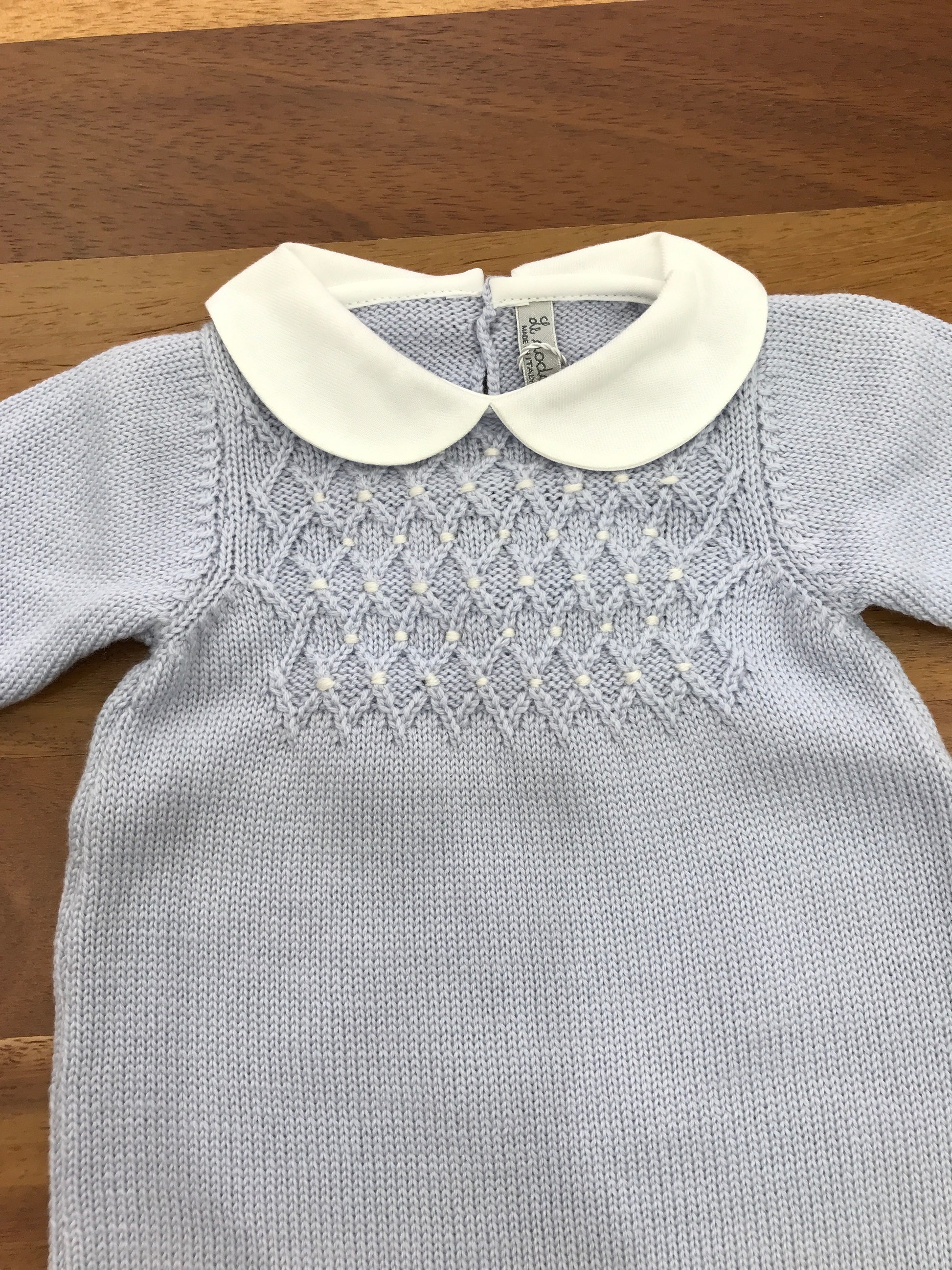 Questa tutina intera in lana presenta un collo rifinito e manca dei piedini, con un delicato ricamo a punto smok sul davanti.