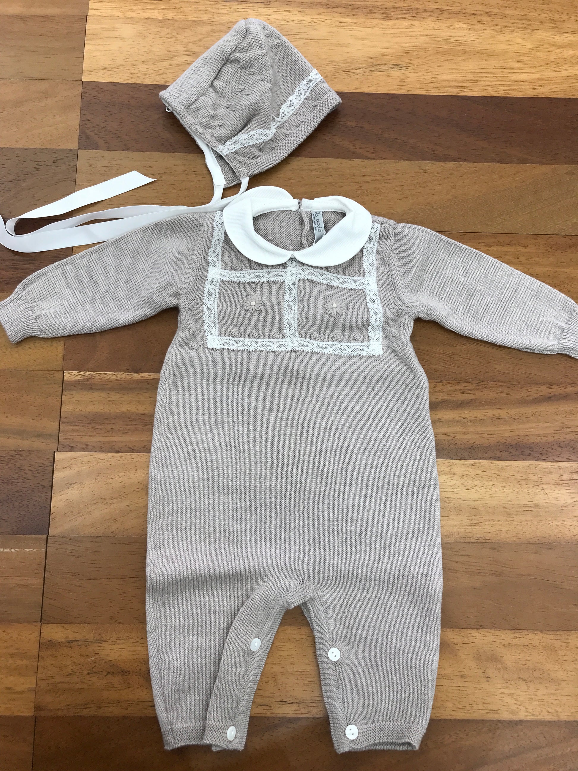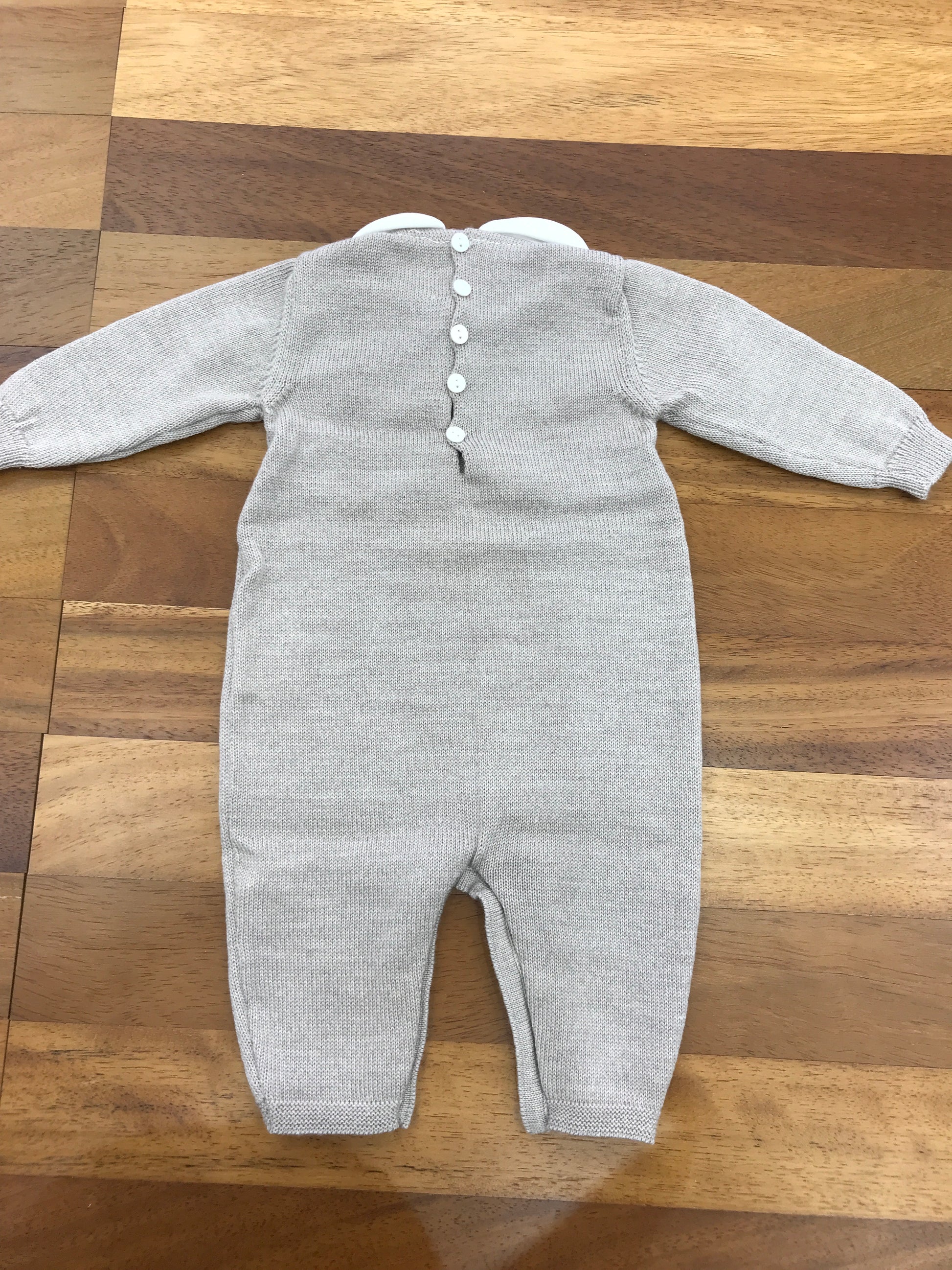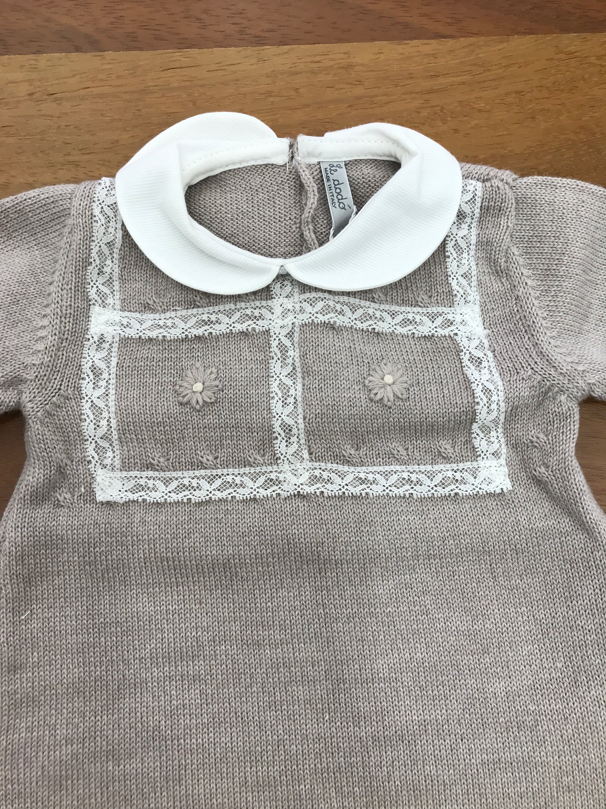 Questa tutina intera in lana, priva di piedini ma dotata di collo, è decorata con margherite ricamate sul davanti e rifinita con un delicato ricamo valencienne.