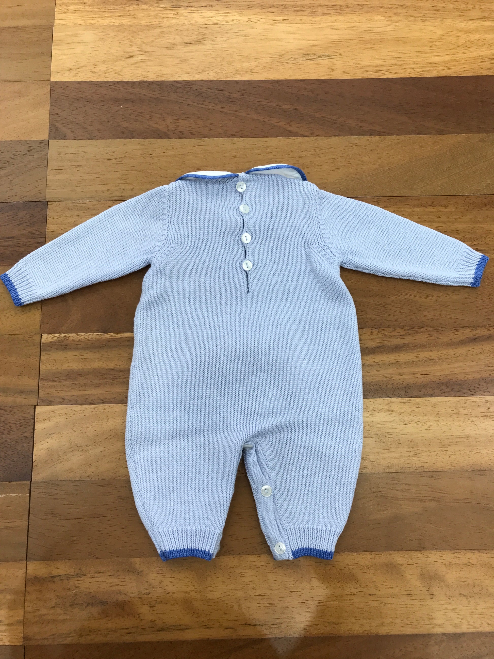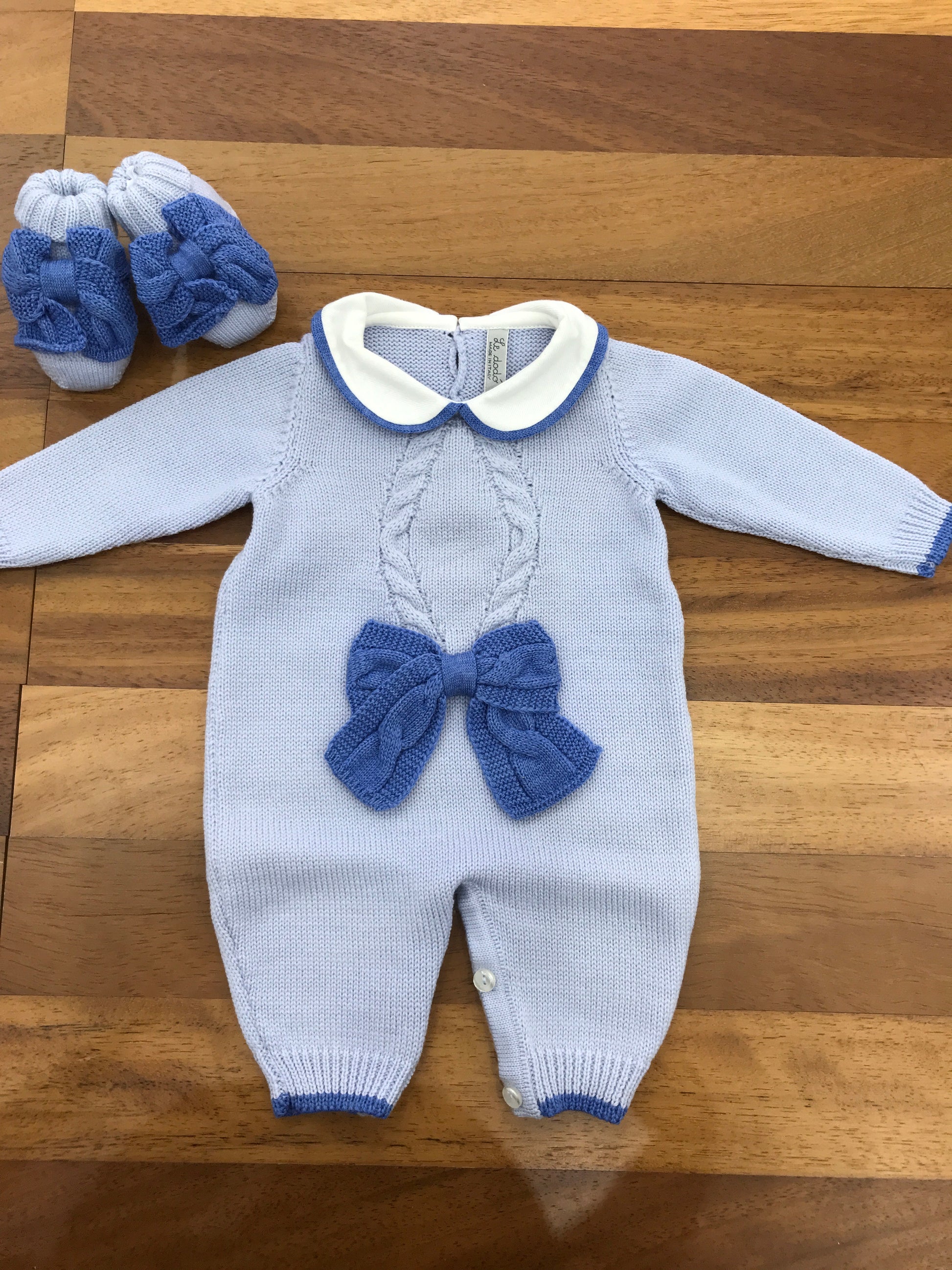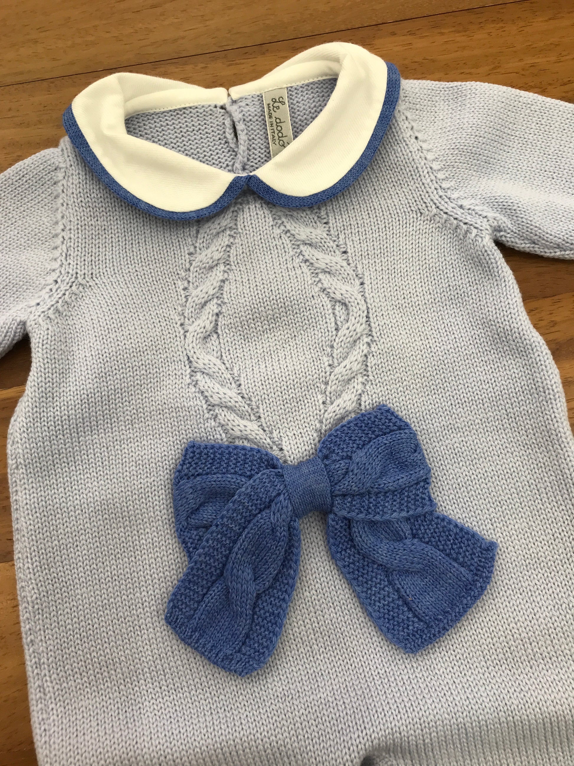 Questa tutina in lana, senza piedini e con collo, è caratterizzata da una raffinata lavorazione a trecce sul davanti, impreziosita da un elegante fiocco.