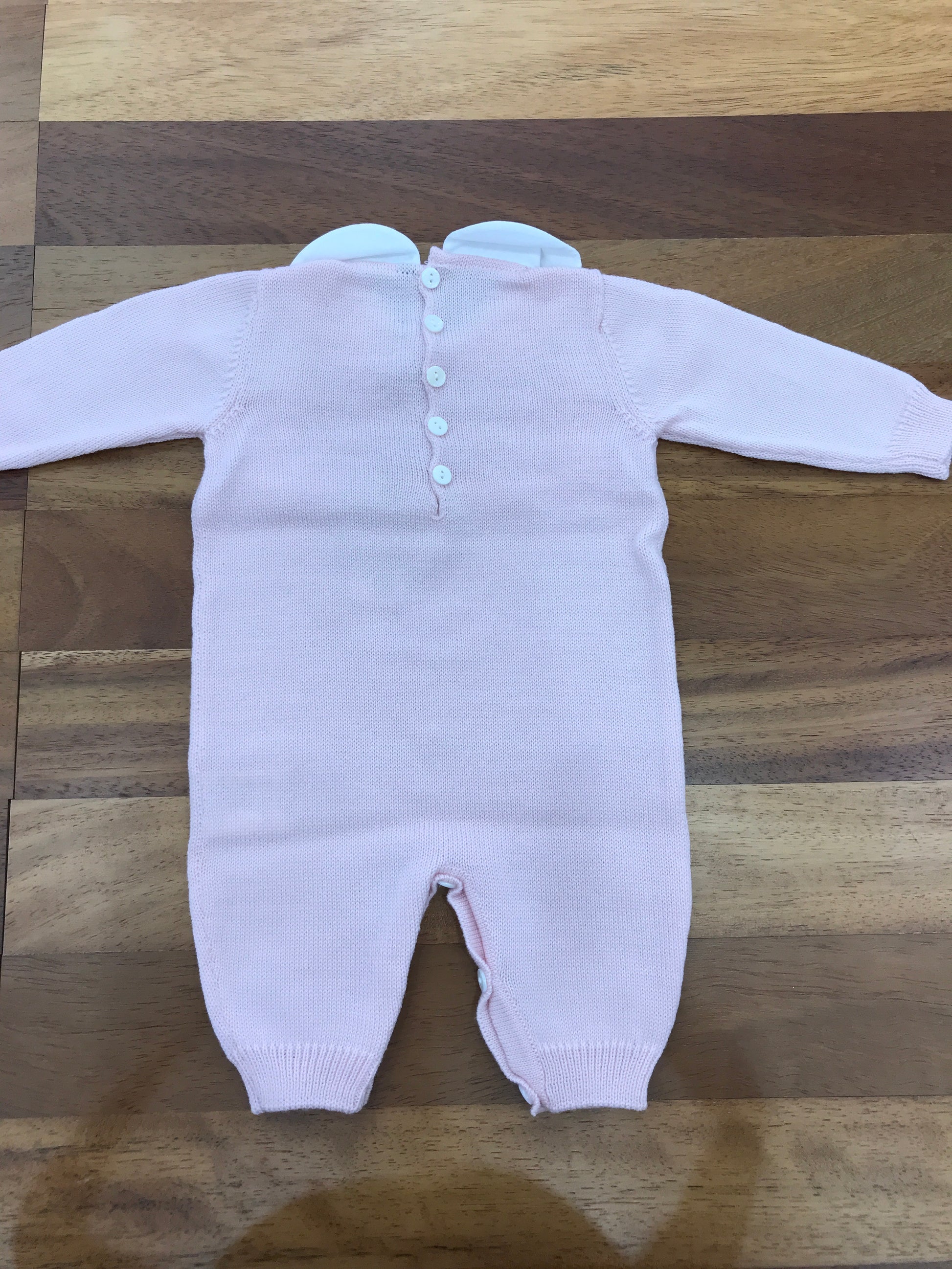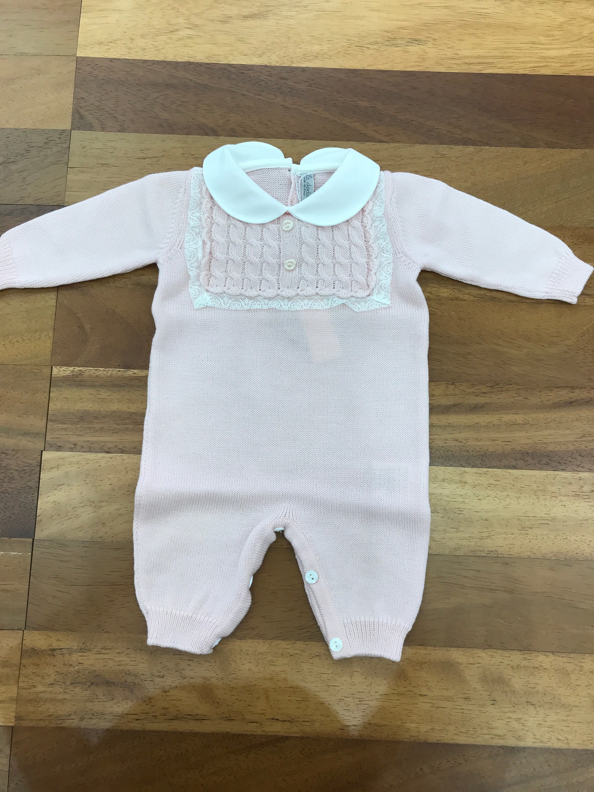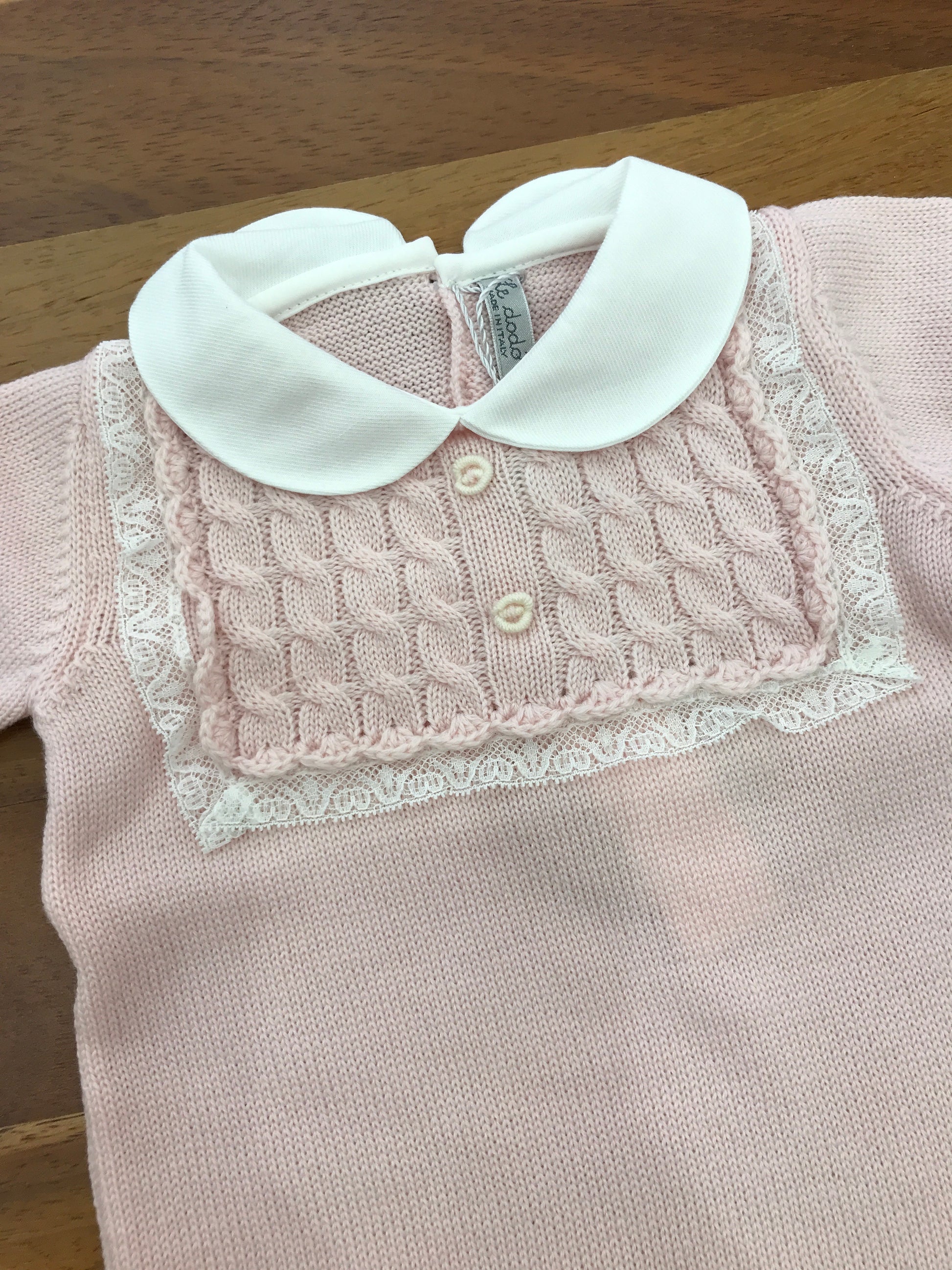 Questa tutina in lana, priva di piedini ma dotata di collo, è arricchita da un delicato ricamo in valancienne e da trecce decorative sul davanti.