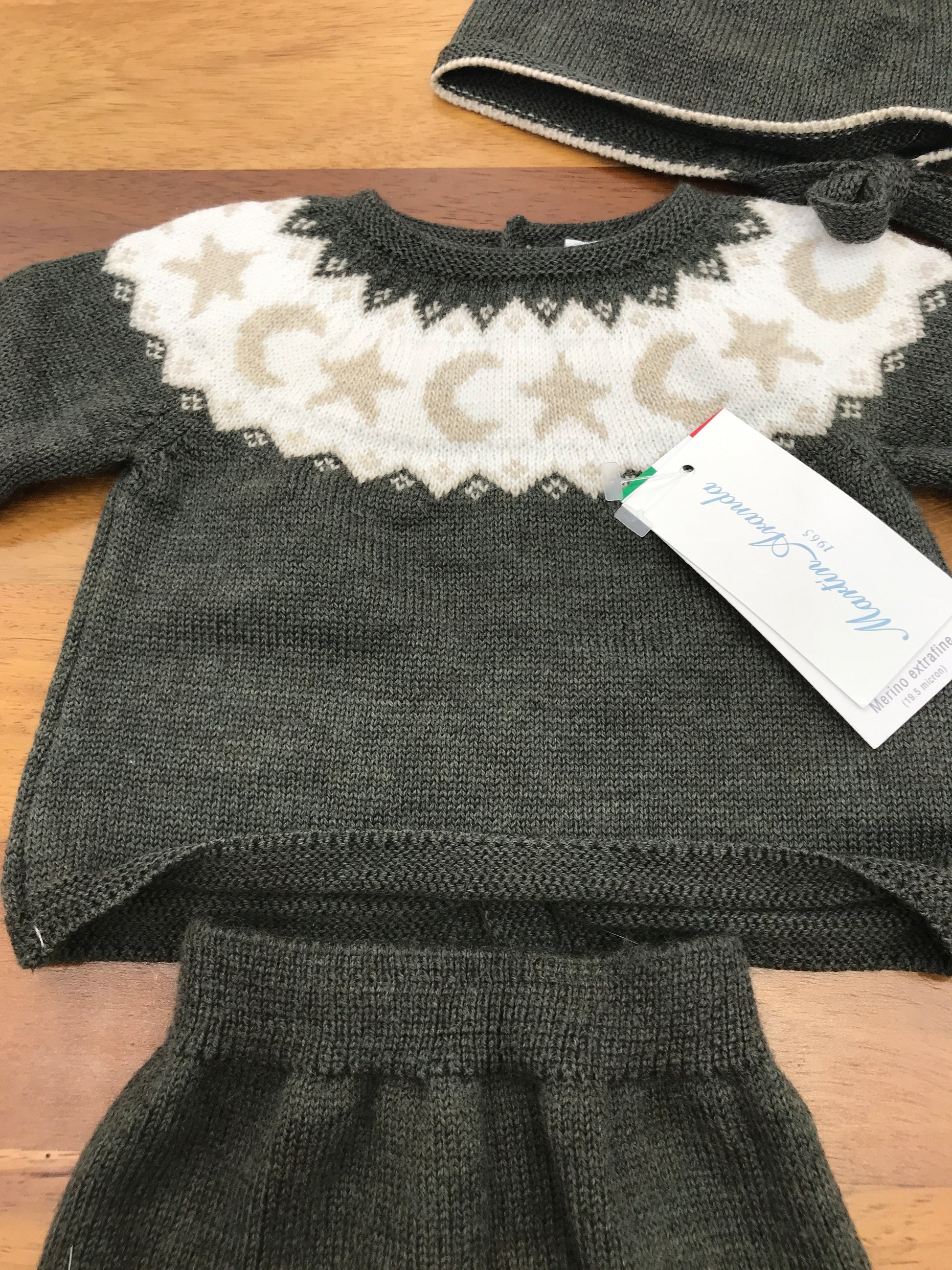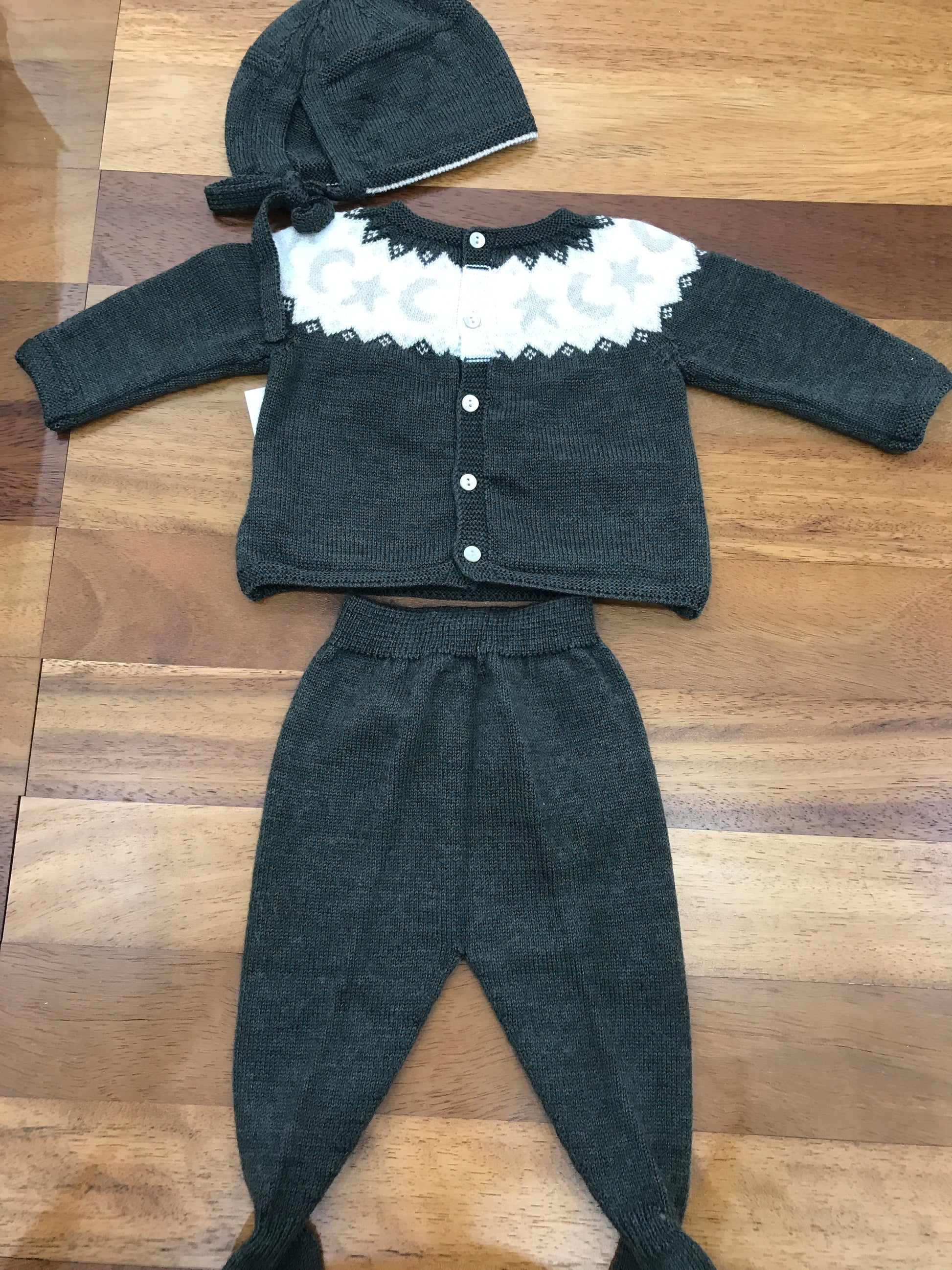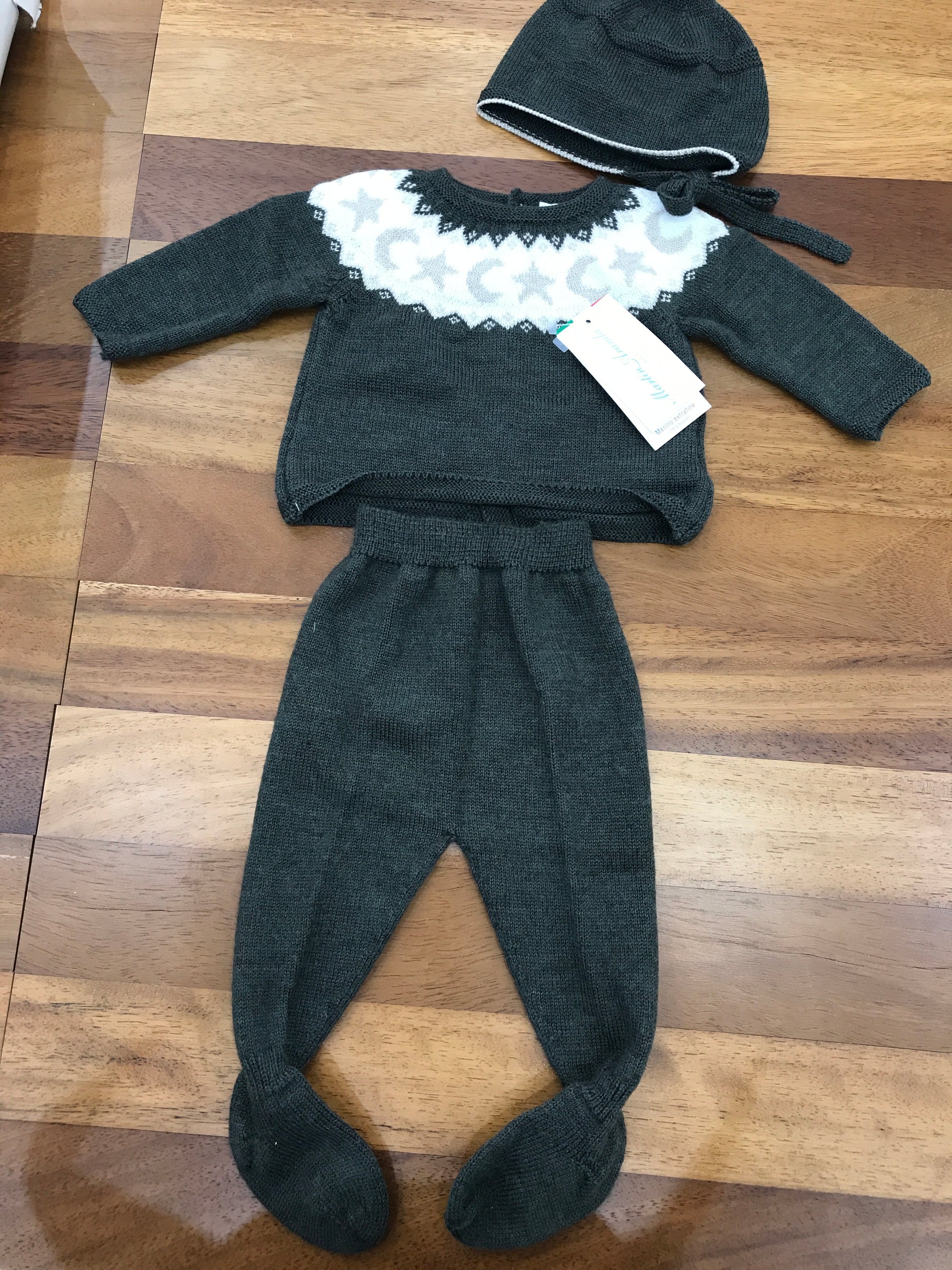 Completo composto da tre pezzi: maglietta senza collo decorata con una greca di stelle e mezze lune sul girocollo, pantaloncino con piedini e cuffia basica inclusa.