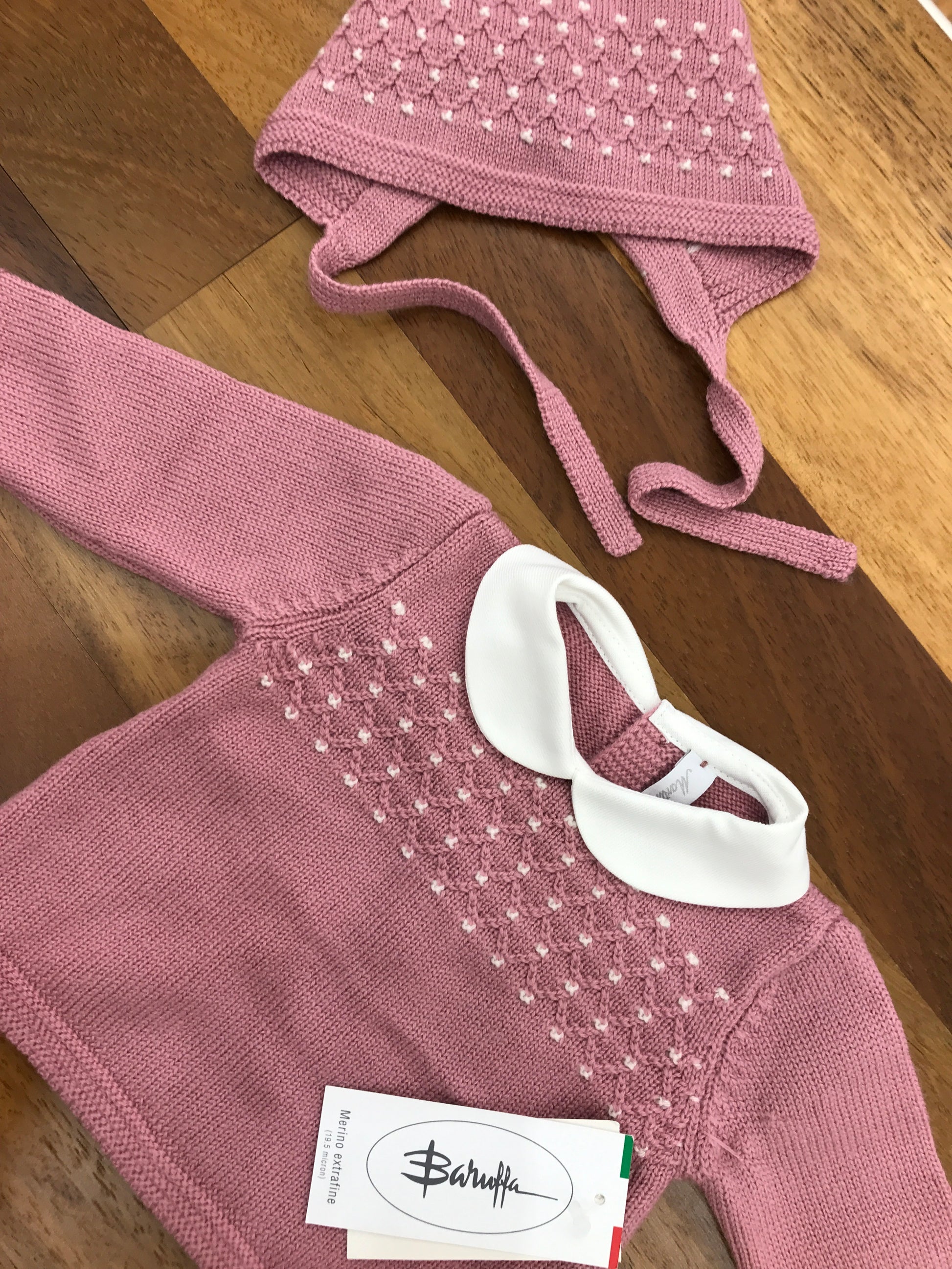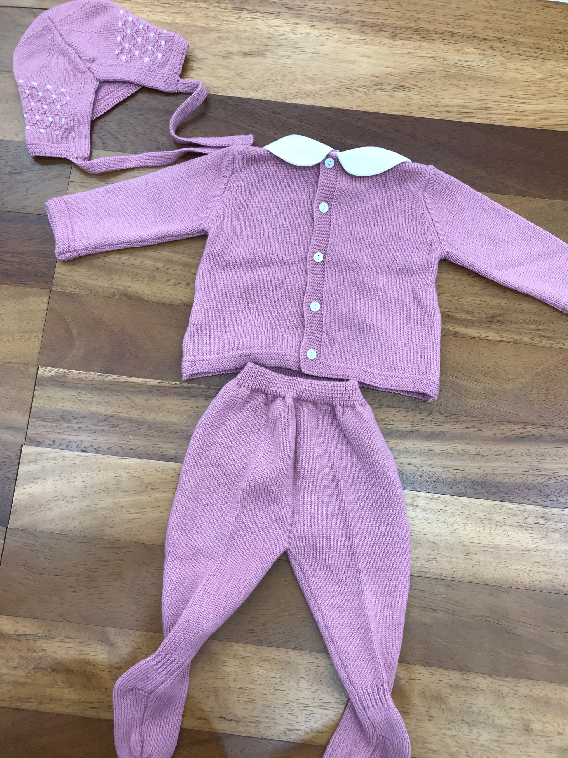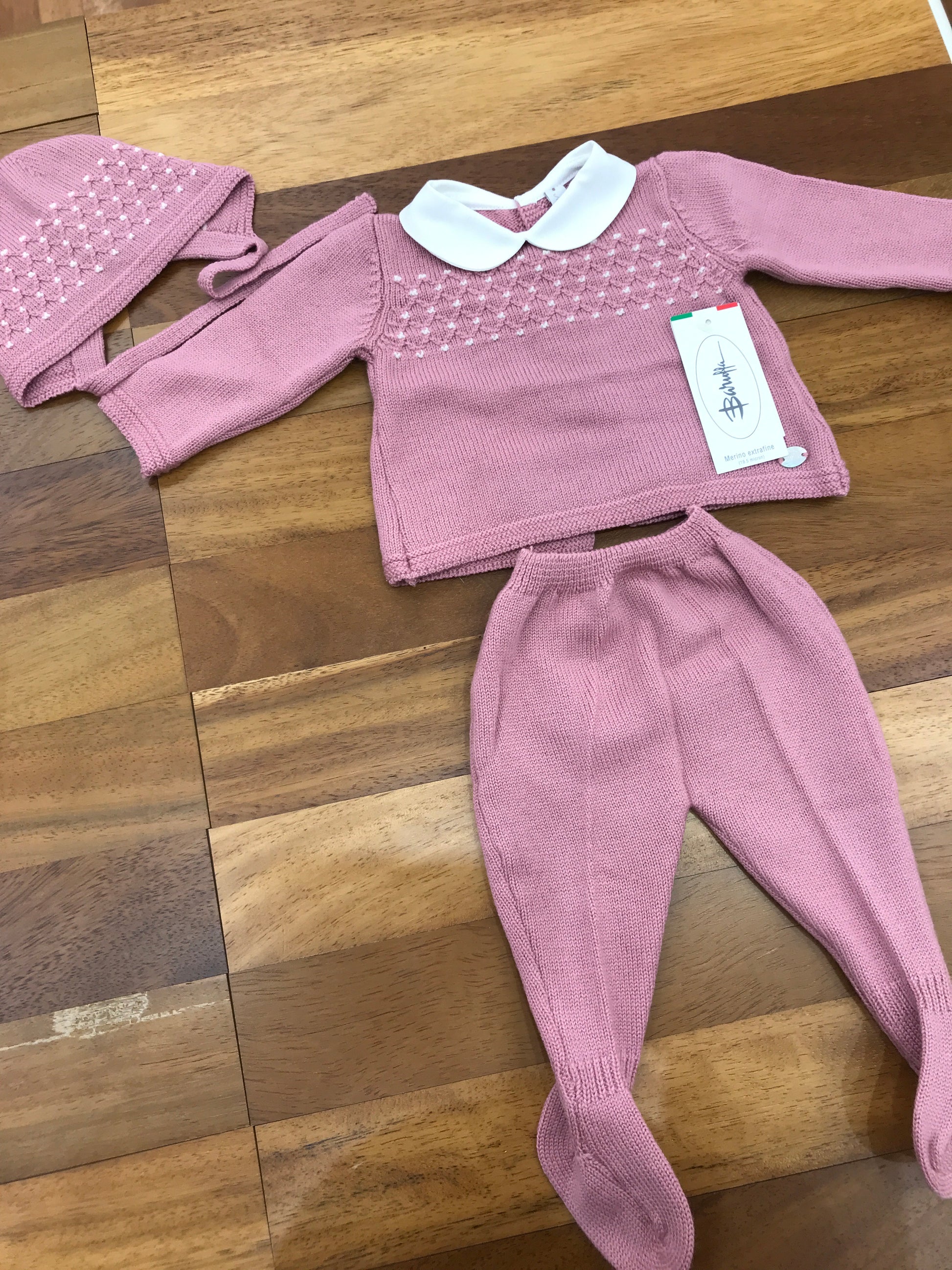 La tutina Martin Aranda, realizzata in lana, presenta piedini e colletto, con un elegante ricamo a punto smock posizionato al centro.