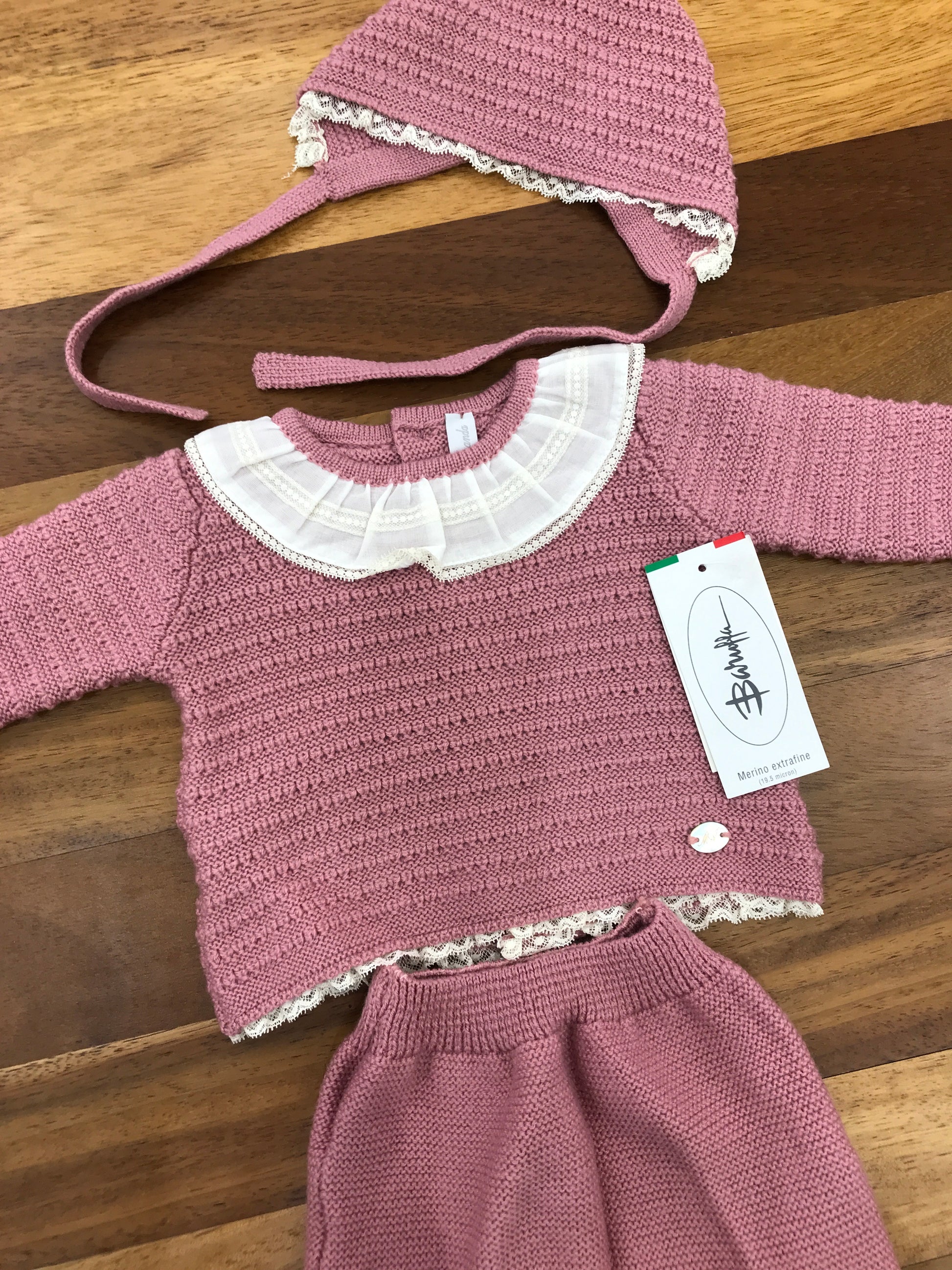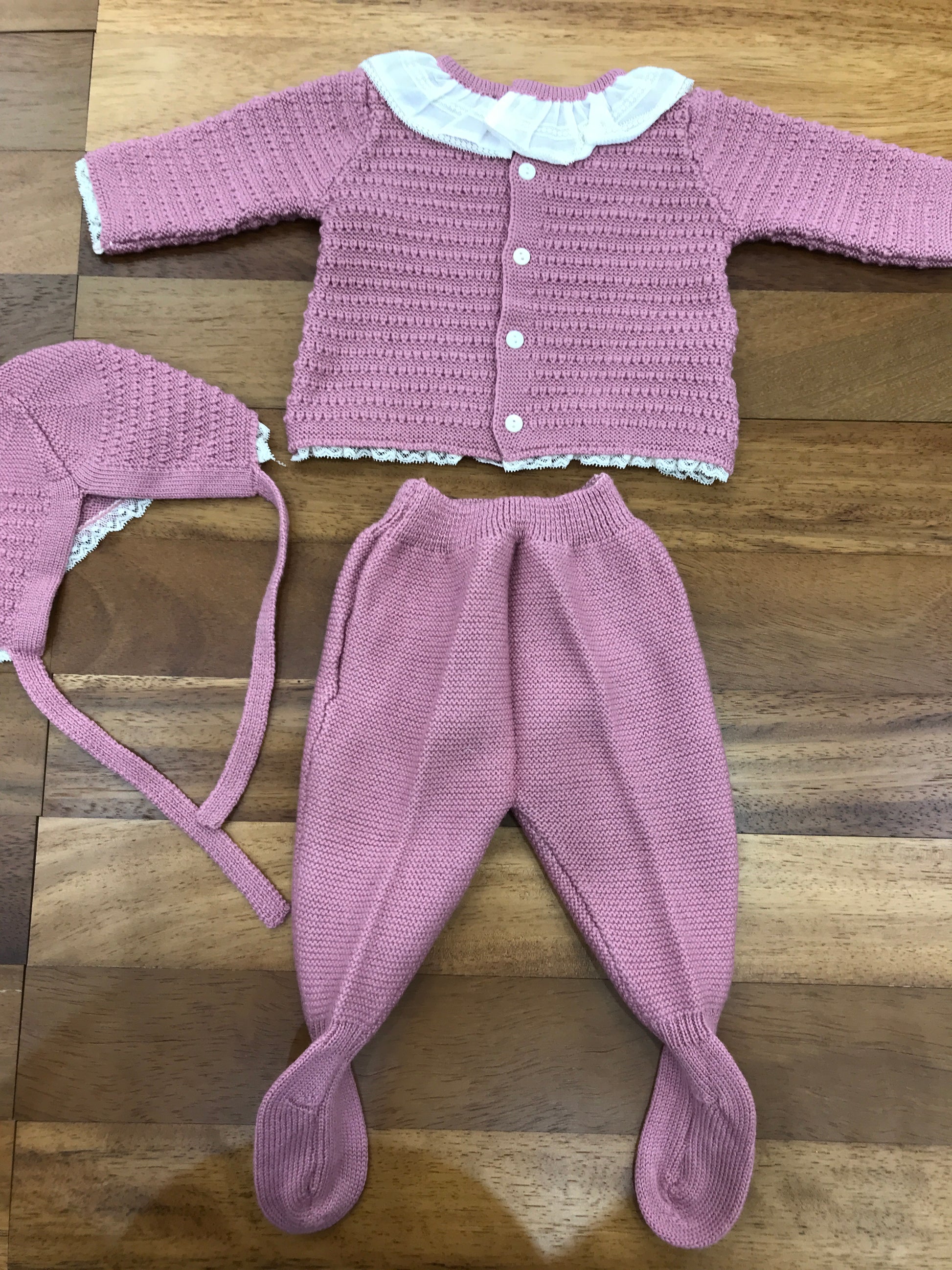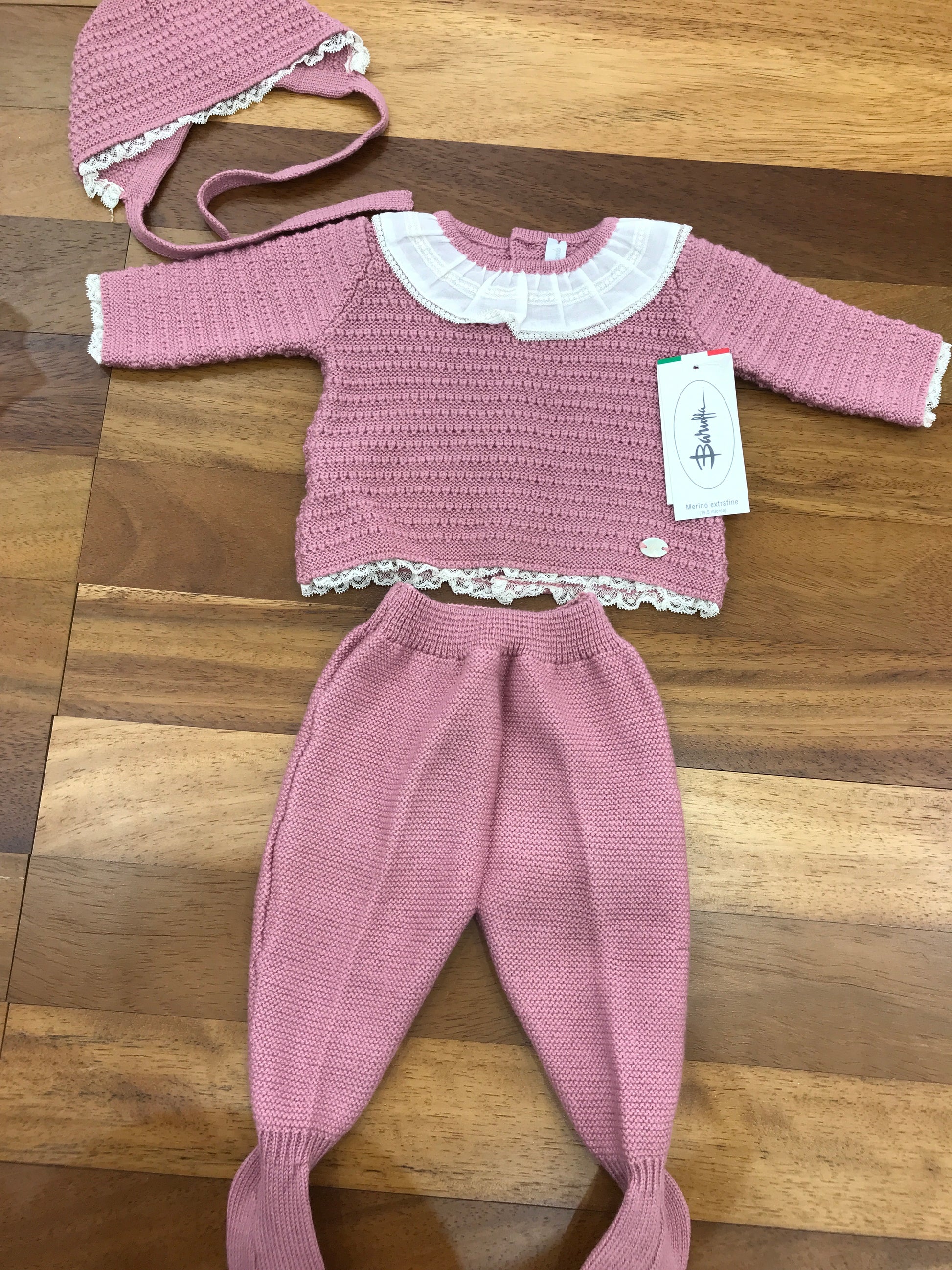 Questo completo in lana, dotato di piedini e collo finemente ricamato, è arricchito da dettagli ricamati sulla parte superiore, conferendo un tocco di eleganza e cura artigianale.