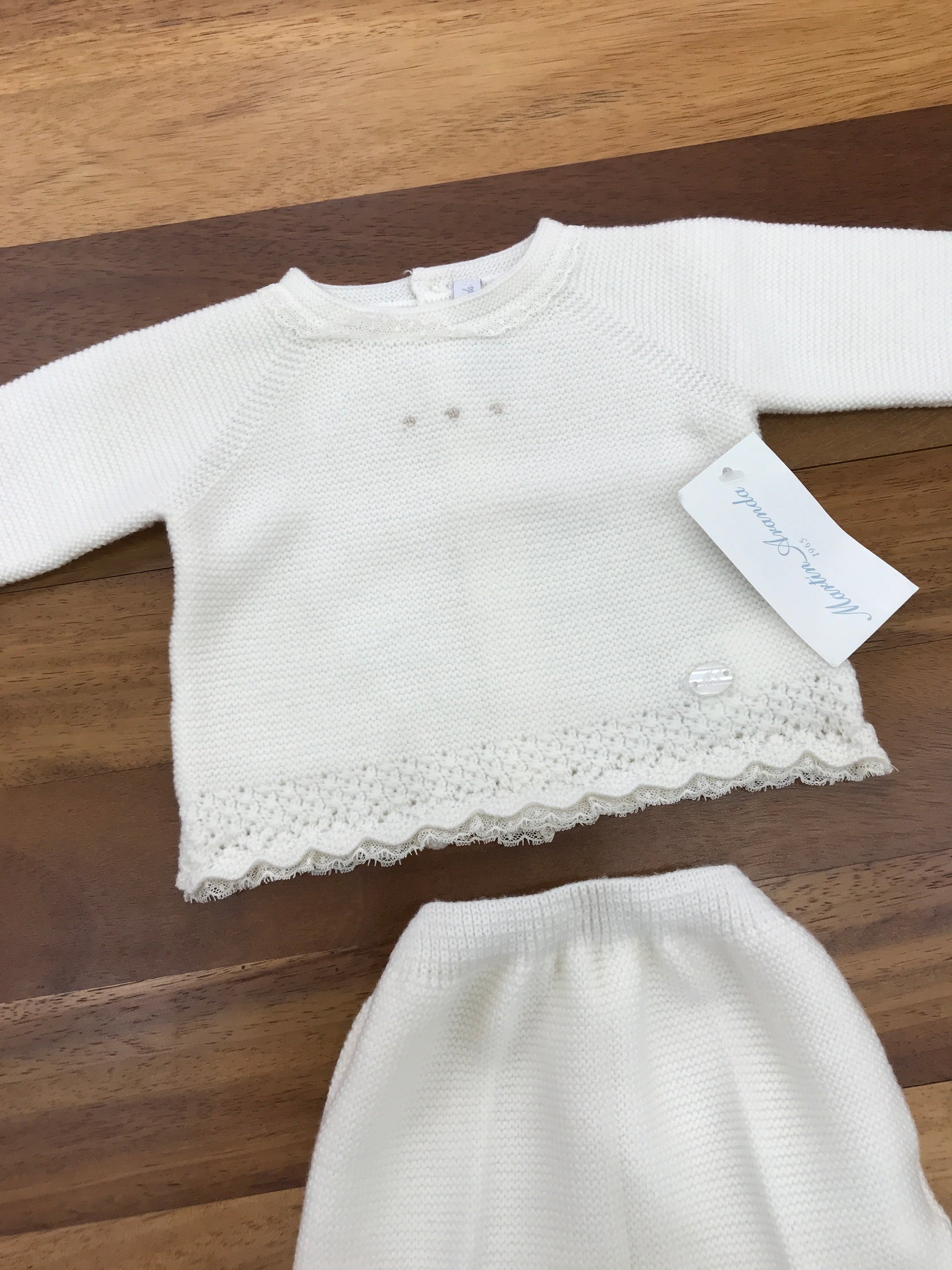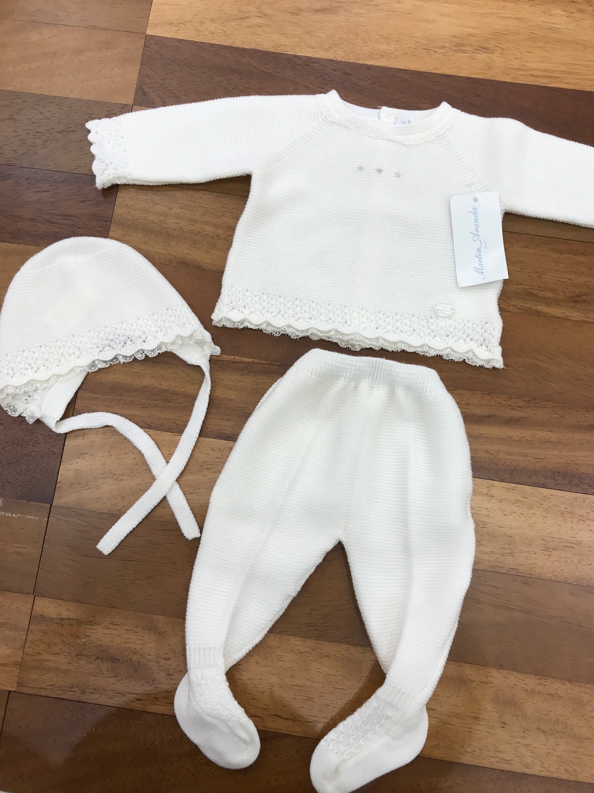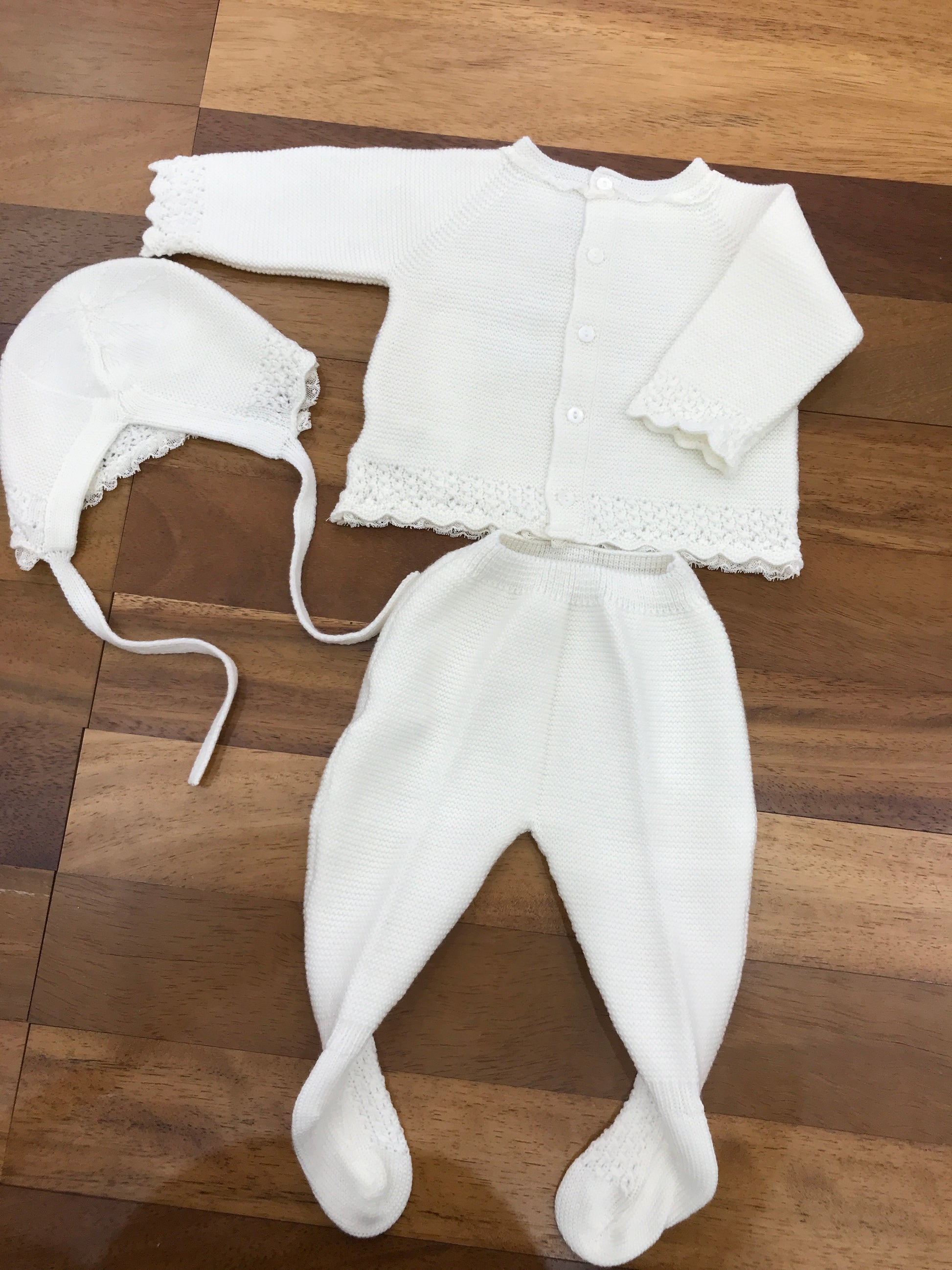Completo in lana caratterizzato da un dettaglio centrale raffinato, comprende piedini e collo. Presenta ricami eleganti e una cuffietta con chiusura a fiocco impreziosita da ricami.