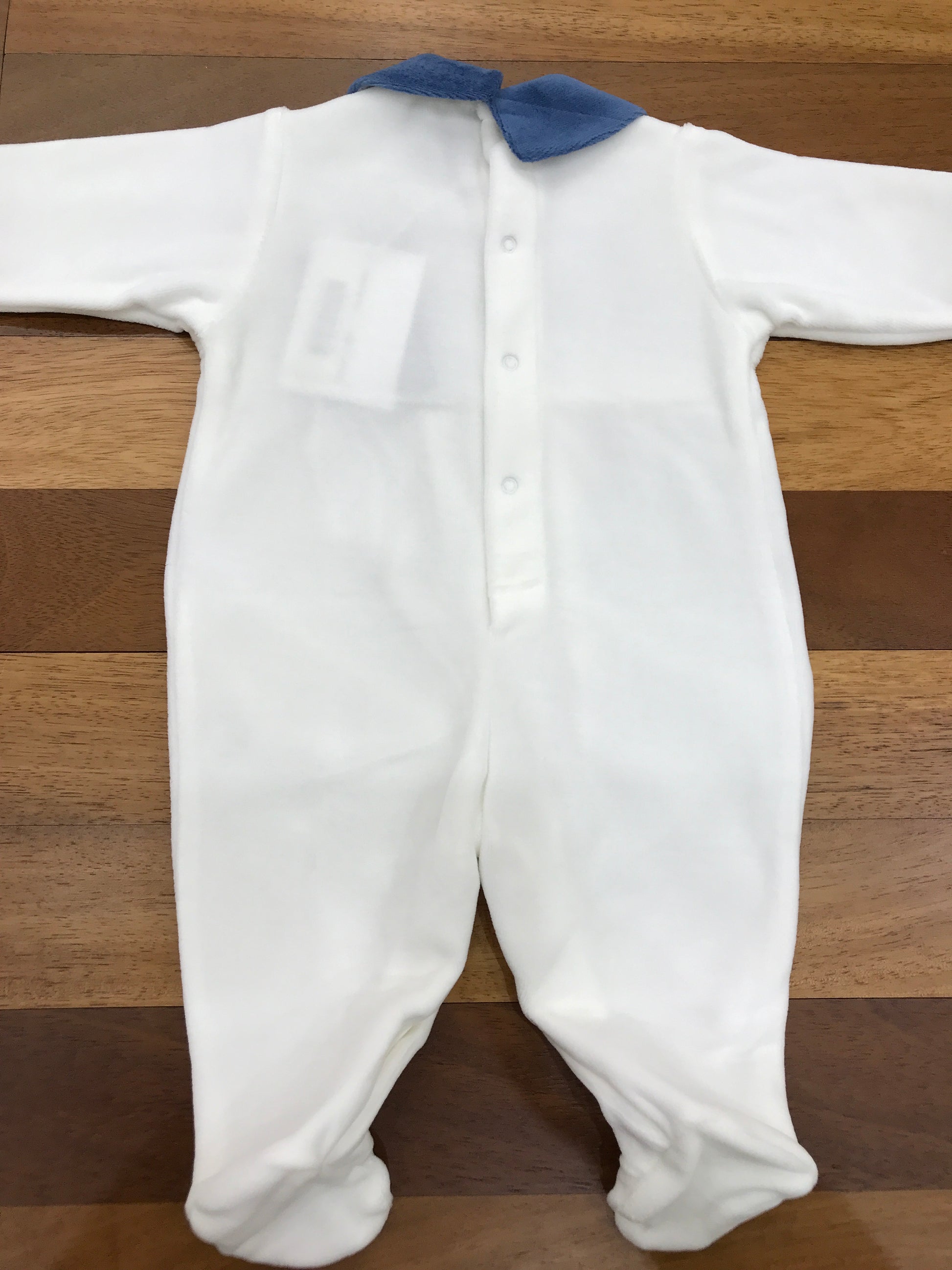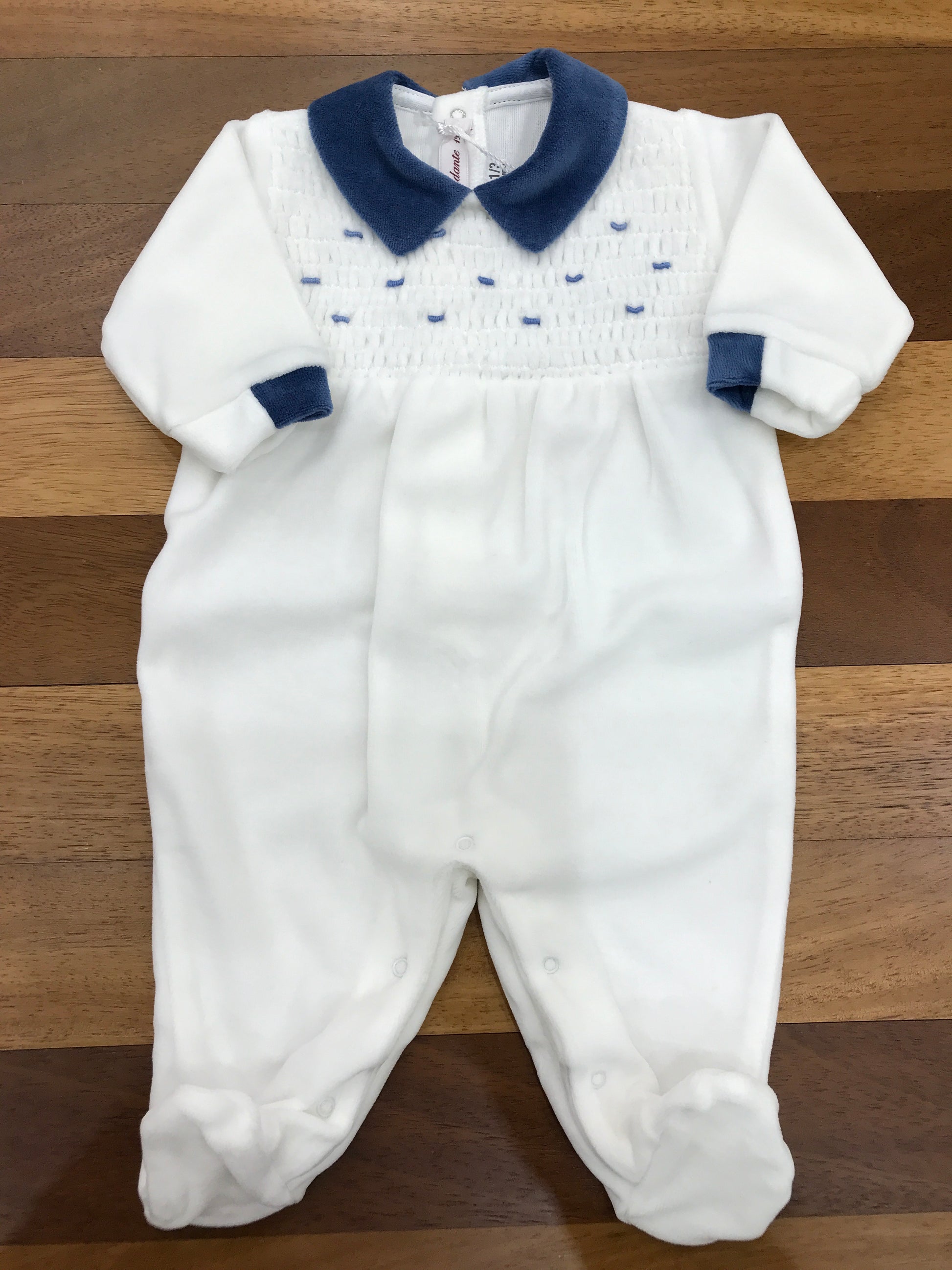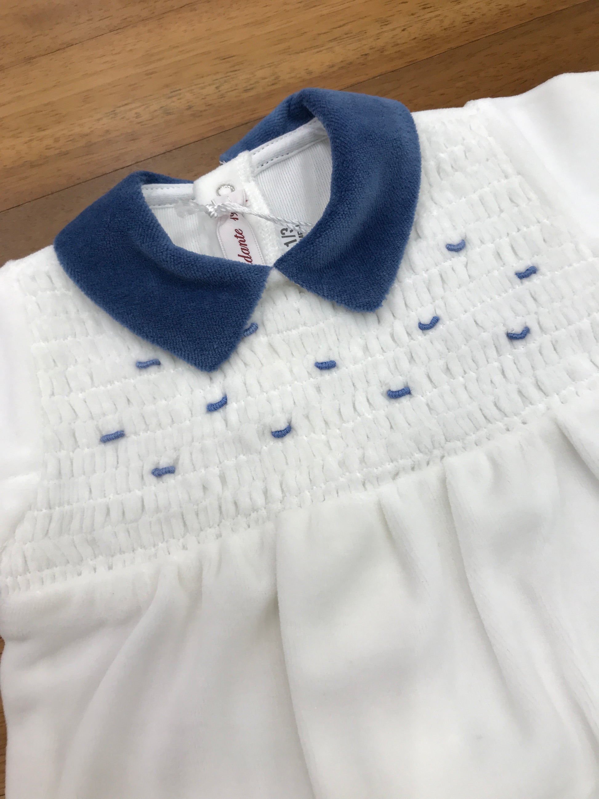 Elegante tutina intera realizzata in morbida ciniglia bianca, arricchita da dettagli in blu che ne esaltano la raffinatezza. Il colletto tono su tono e i piedini integrati garantiscono praticità e comfort. Il corpetto presenta una pregiata lavorazione a punto smock con ricami blu, mentre le maniche completano il design con accenti coordinati che conferiscono carattere e personalità al capo.